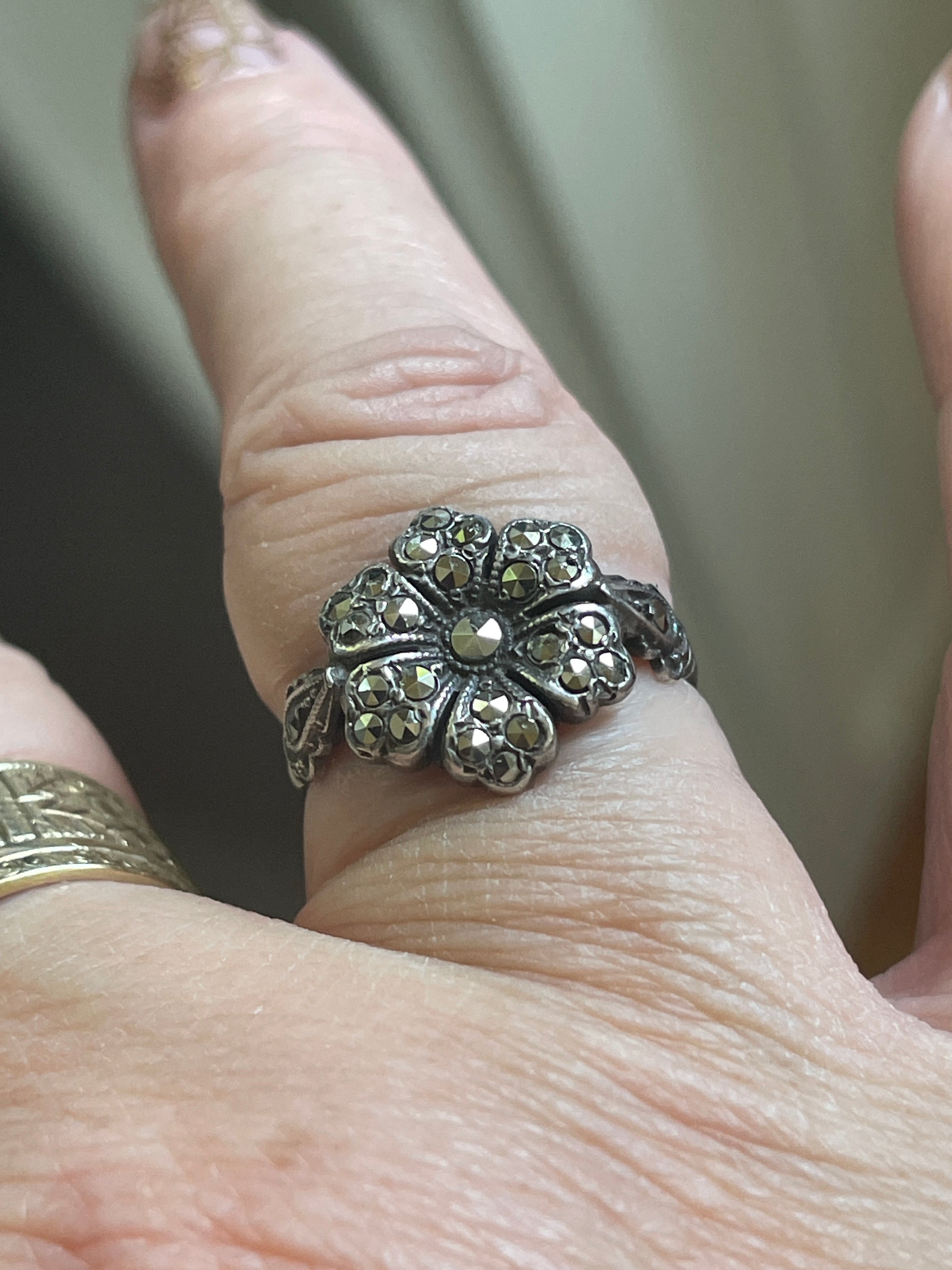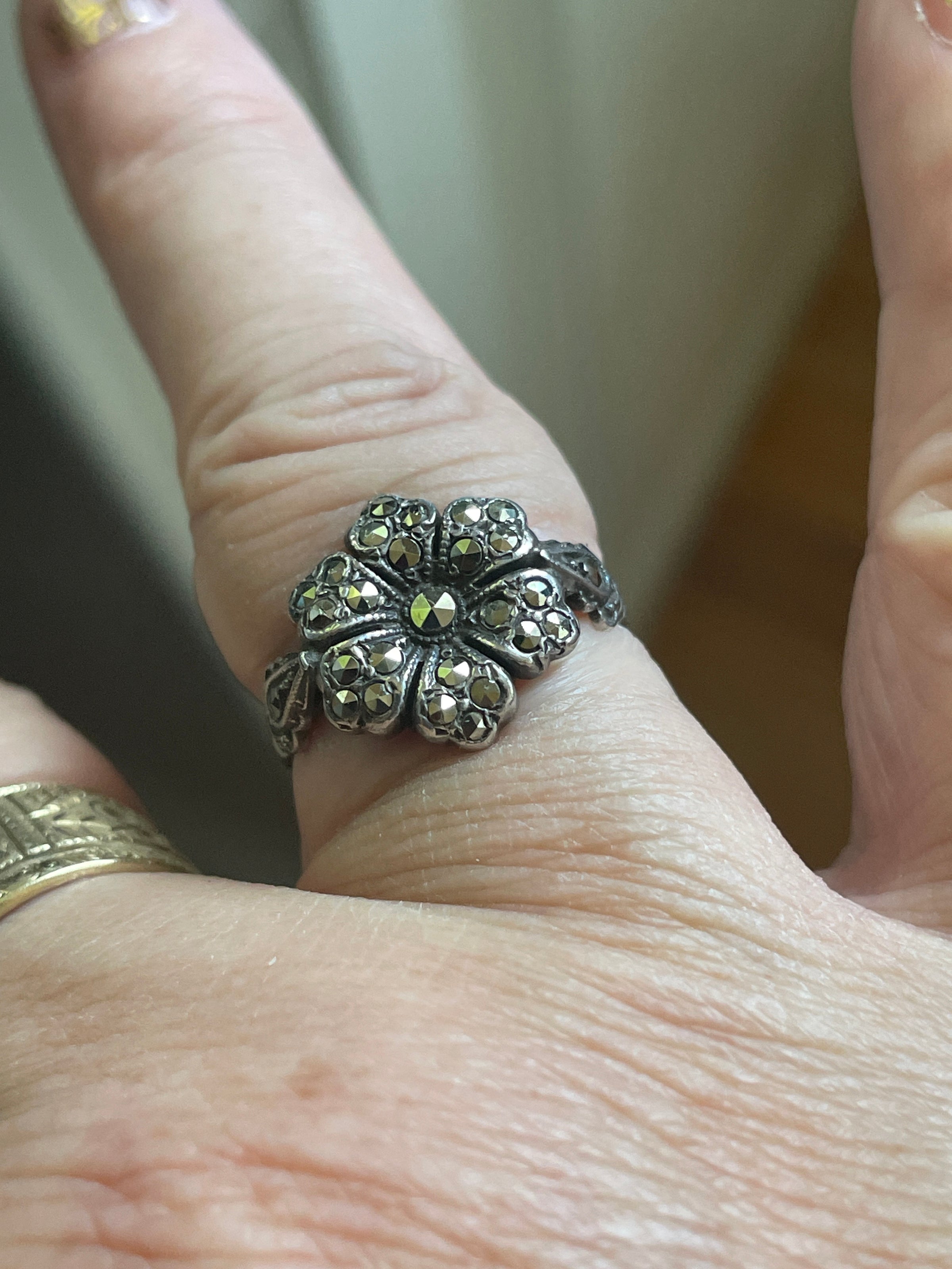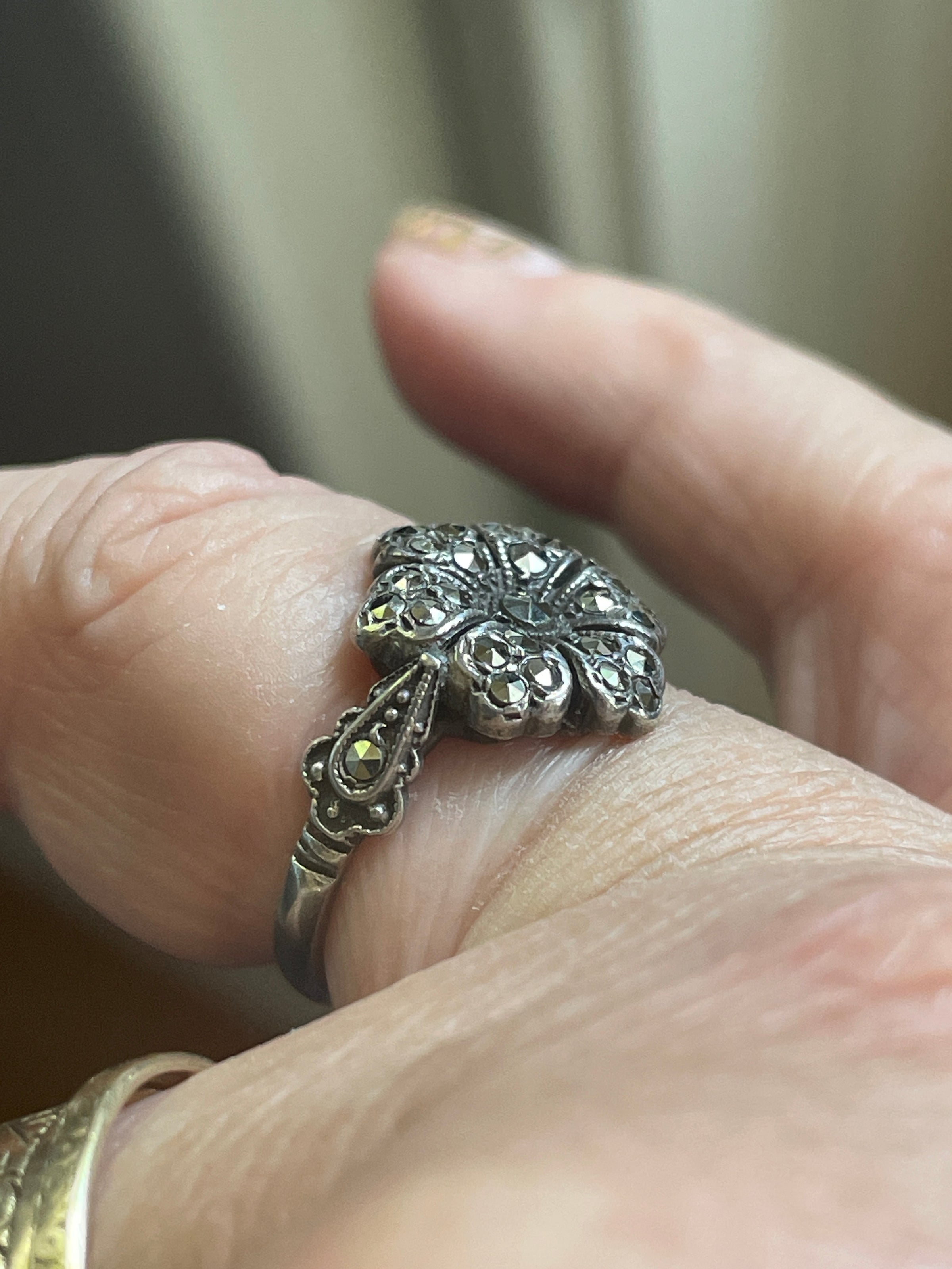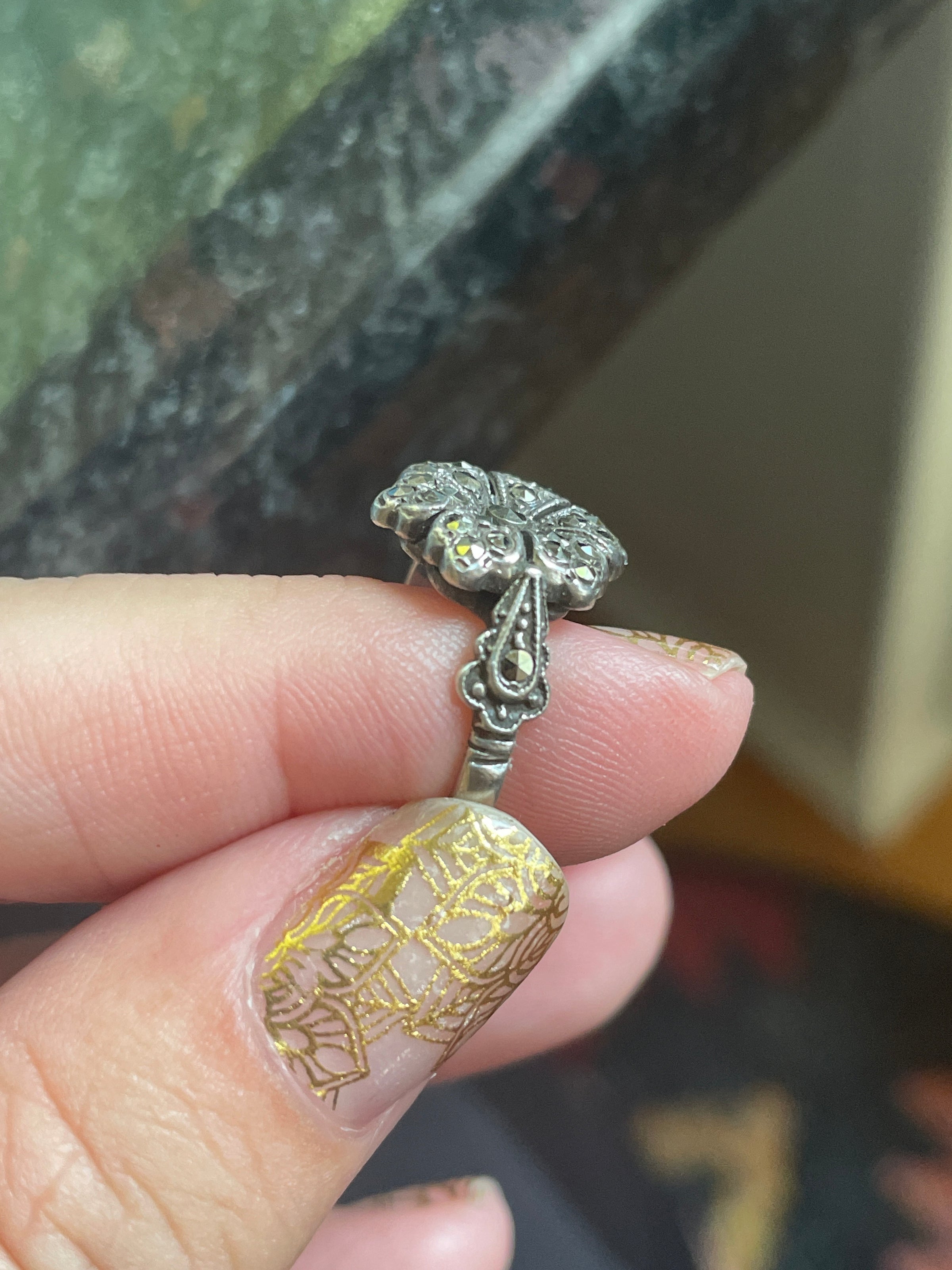 Stunning rare flower ring with sparkling Marcasites and ornate sides. Size = 5.25. Stamped “925 Fine.” All Marcasites present.