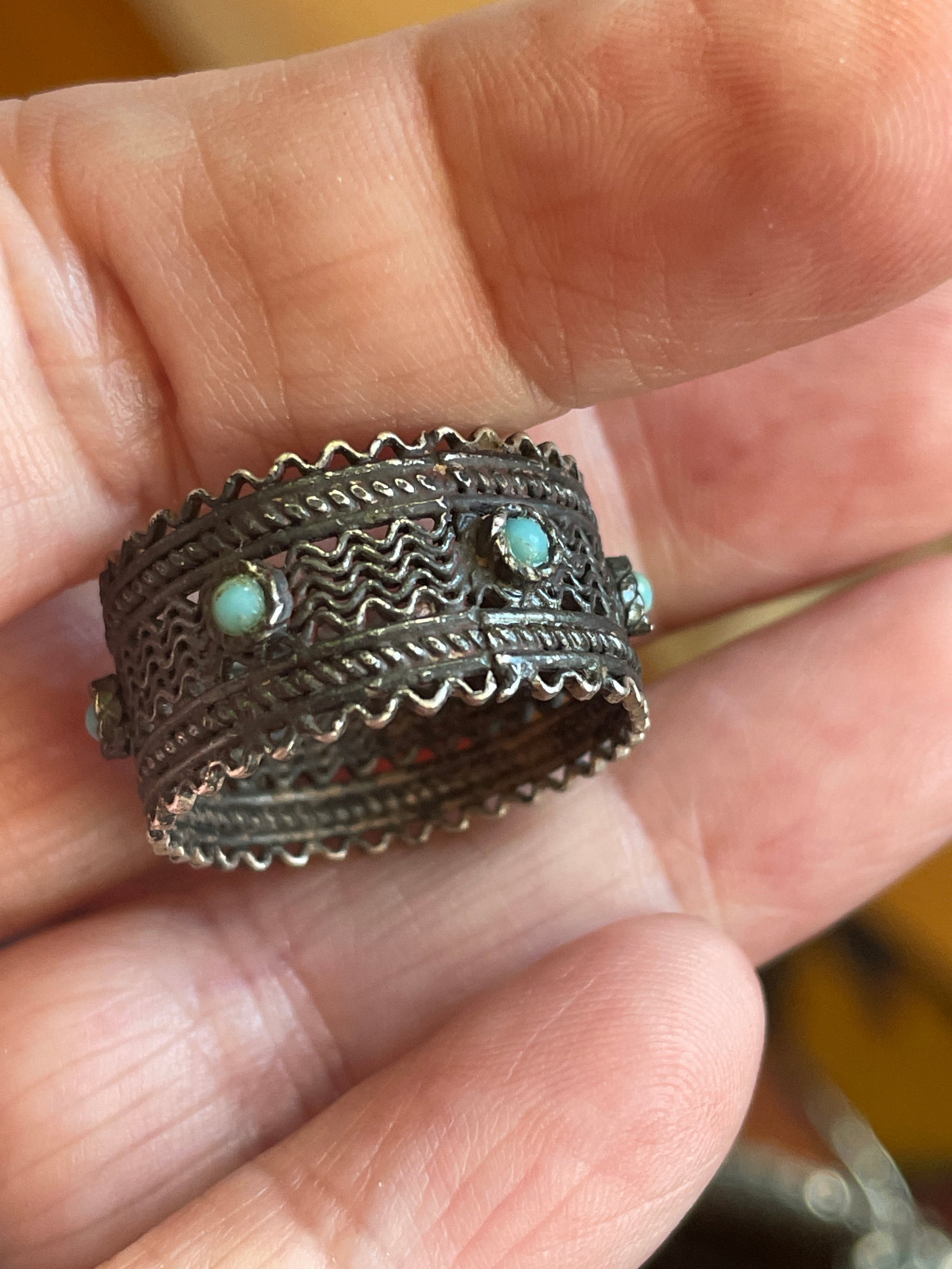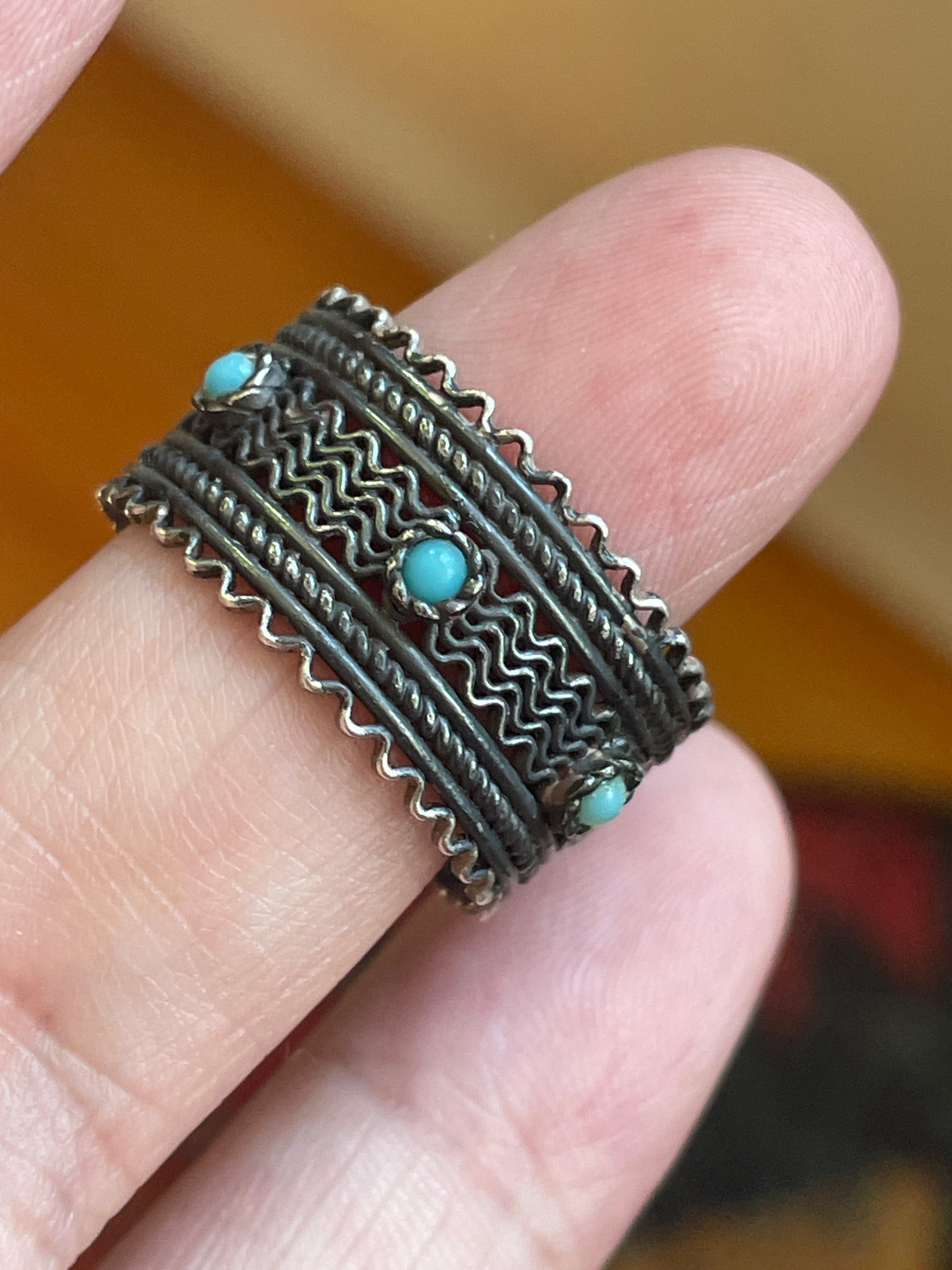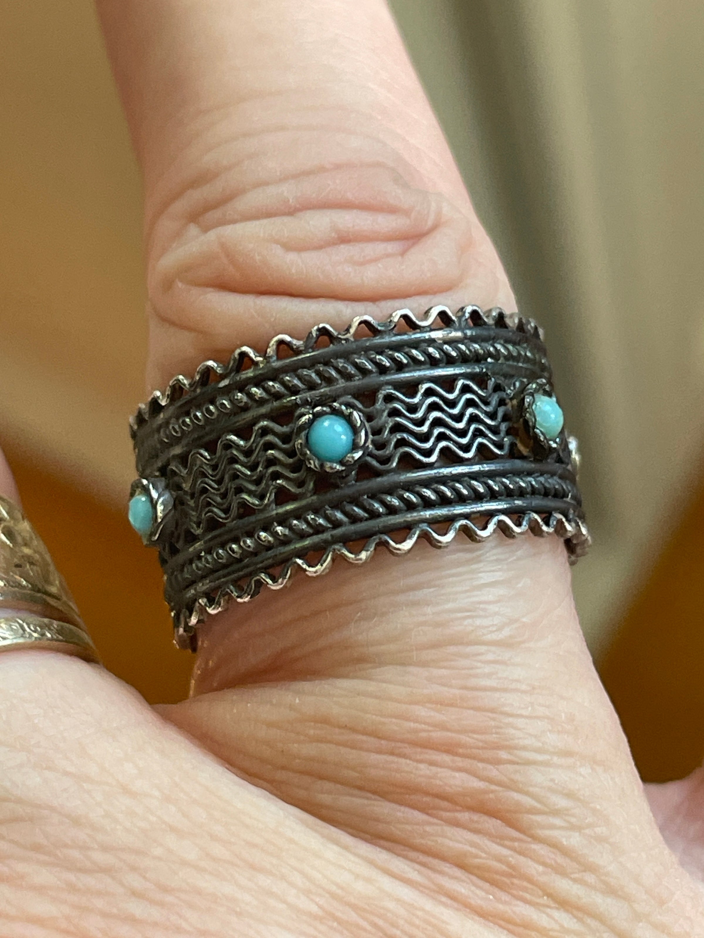 Gorgeous filigree ring with Turquoise stone accents. Looks to be handmade. Darkened with age really makes the contrast of the stones lovely. Tested sterling. Ring size = 8.5.