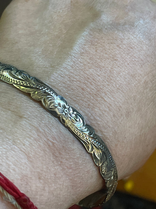 Engraved Floral Bangle Bracelet - Sterling Silver - Vintage
