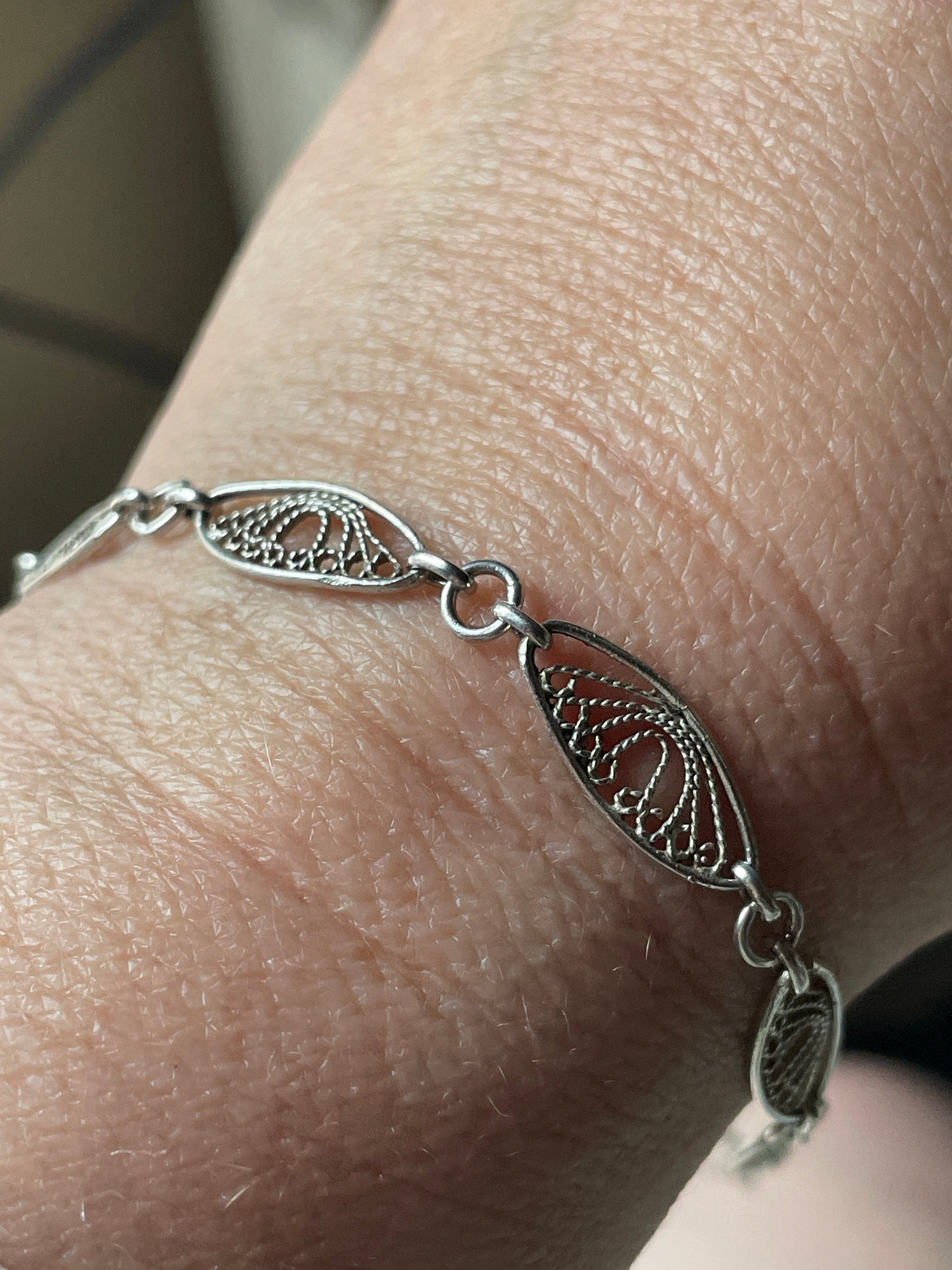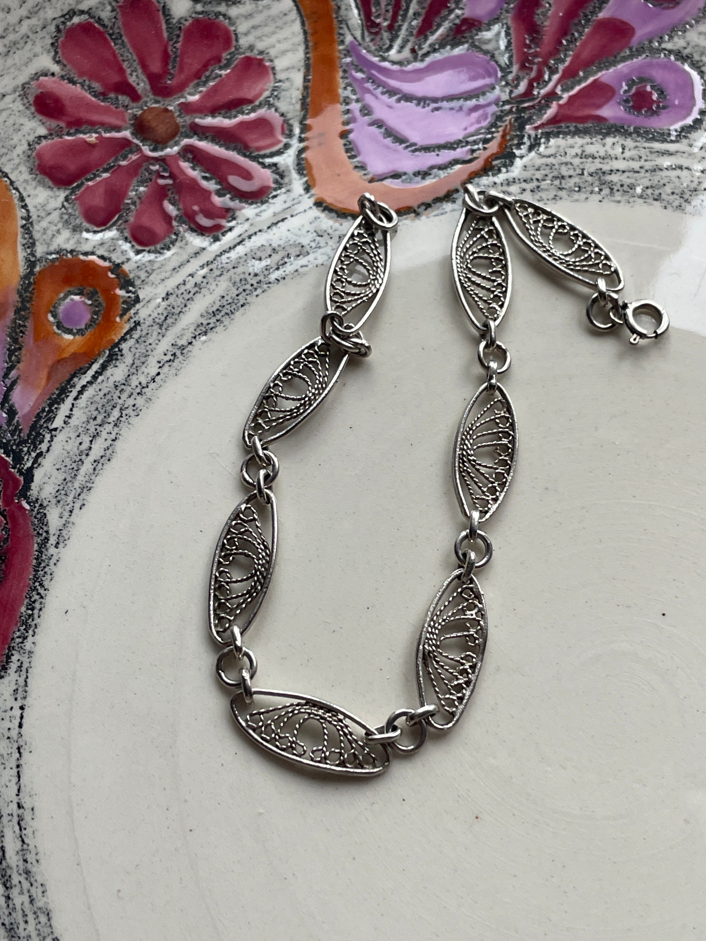Fabulous ornate link filigree bracelet in sterling silver.  Links have beautiful design.  Bracelet measures 7 inches.  Stamped 925 on clasp for sterling silver.