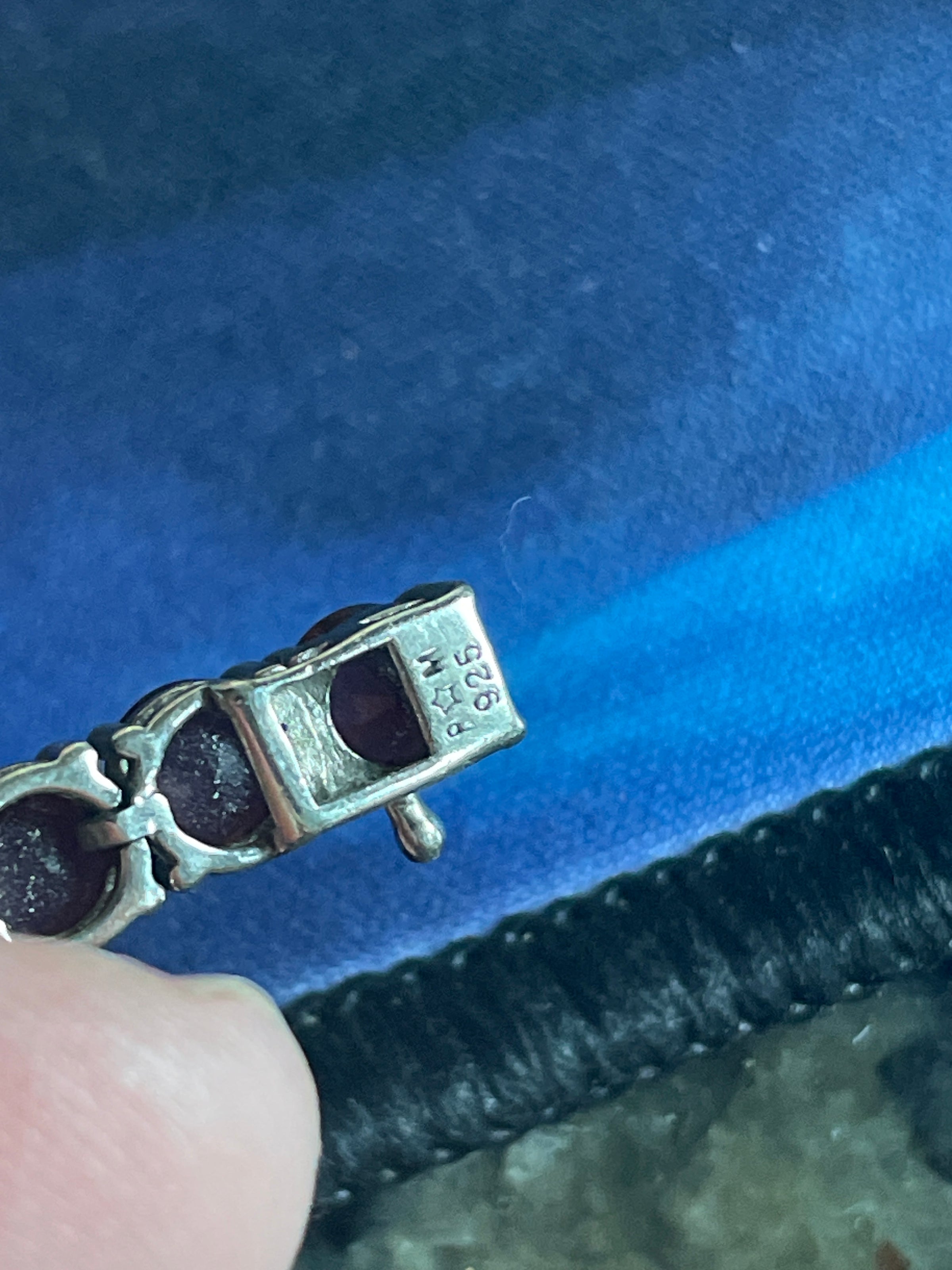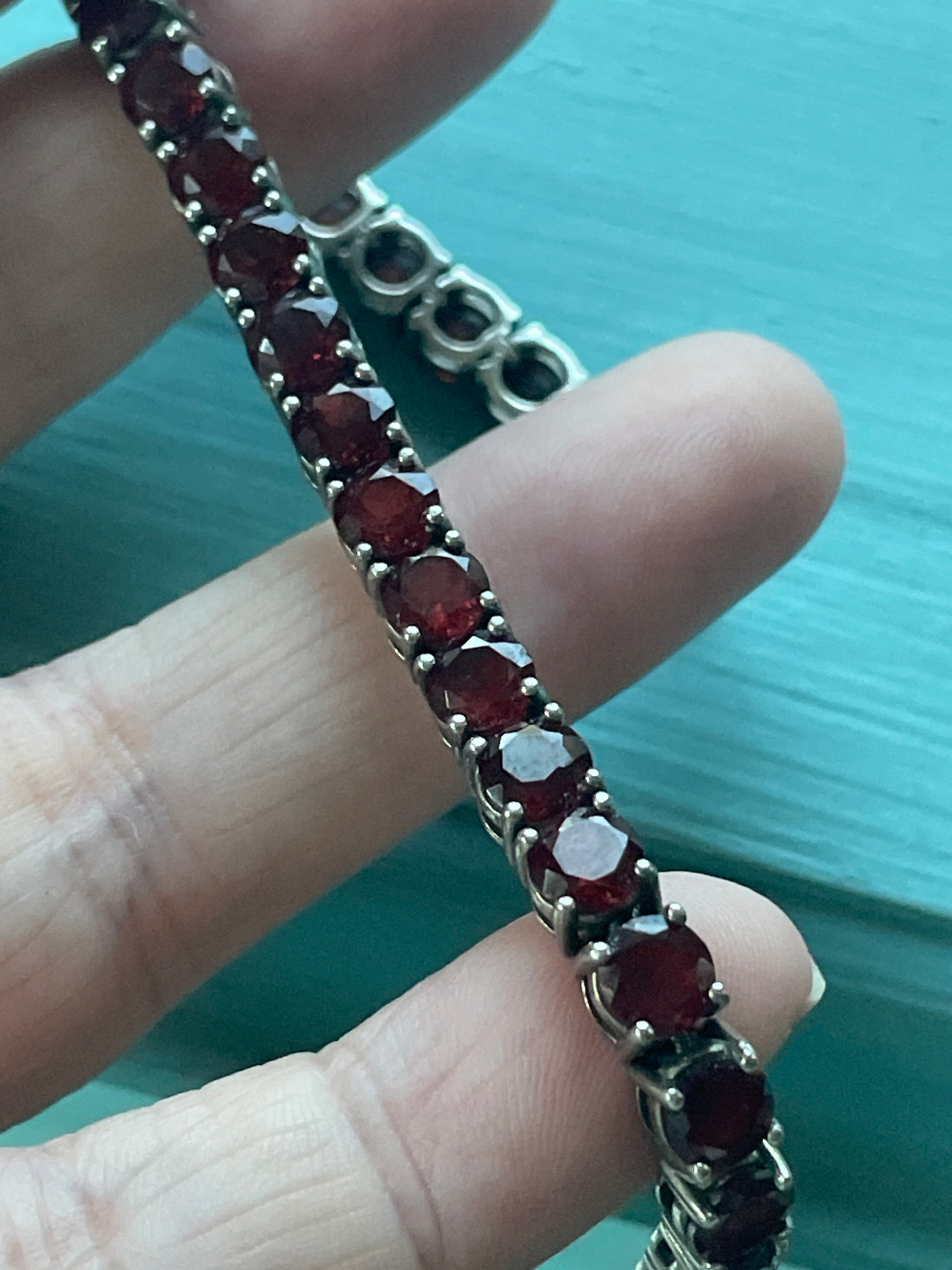Stunning vintage Garnet bracelet in sterling silver.  Beautiful wine colored stones.  Measures approx 7 inches.  Stamped 925 for sterling.