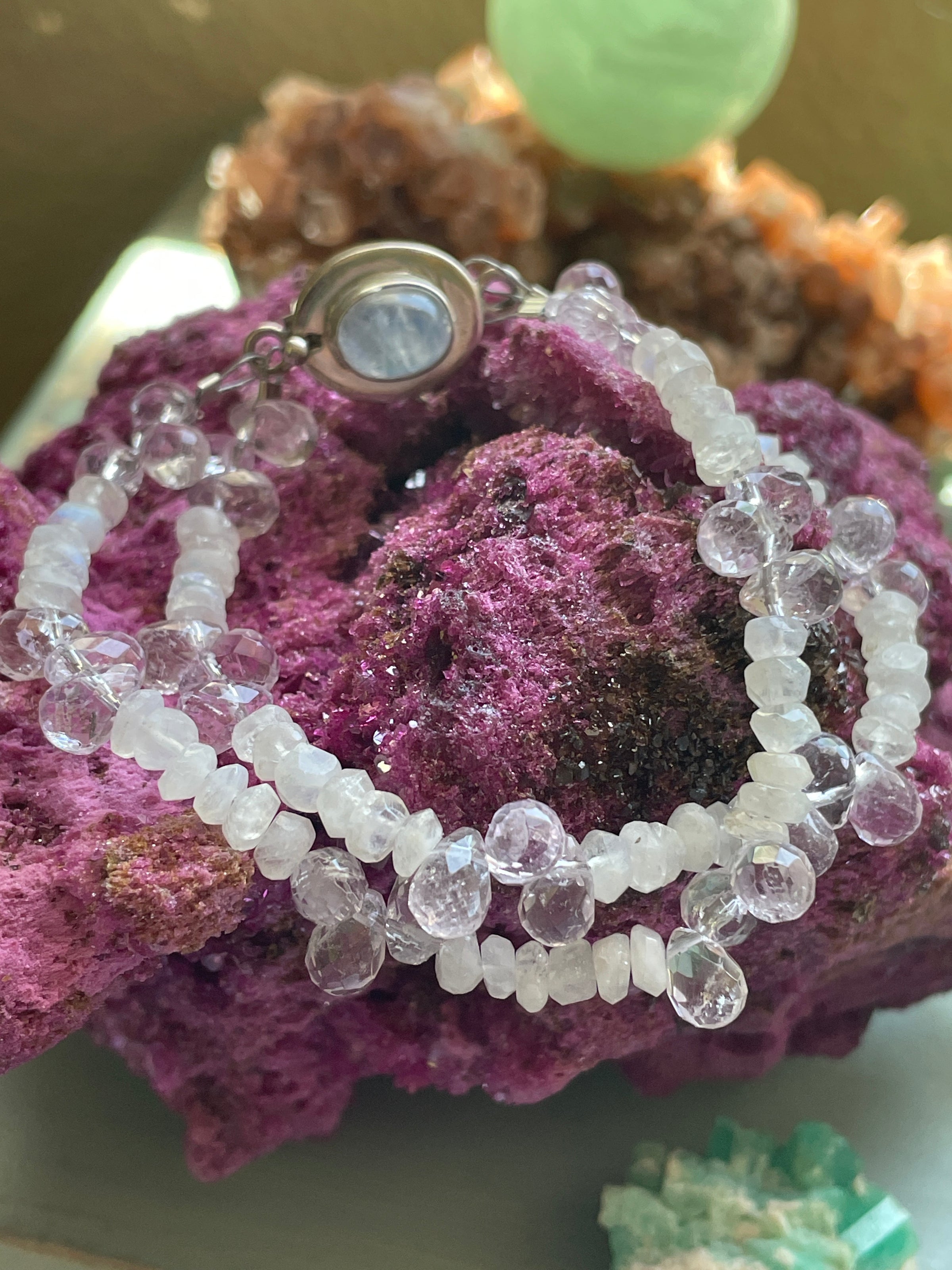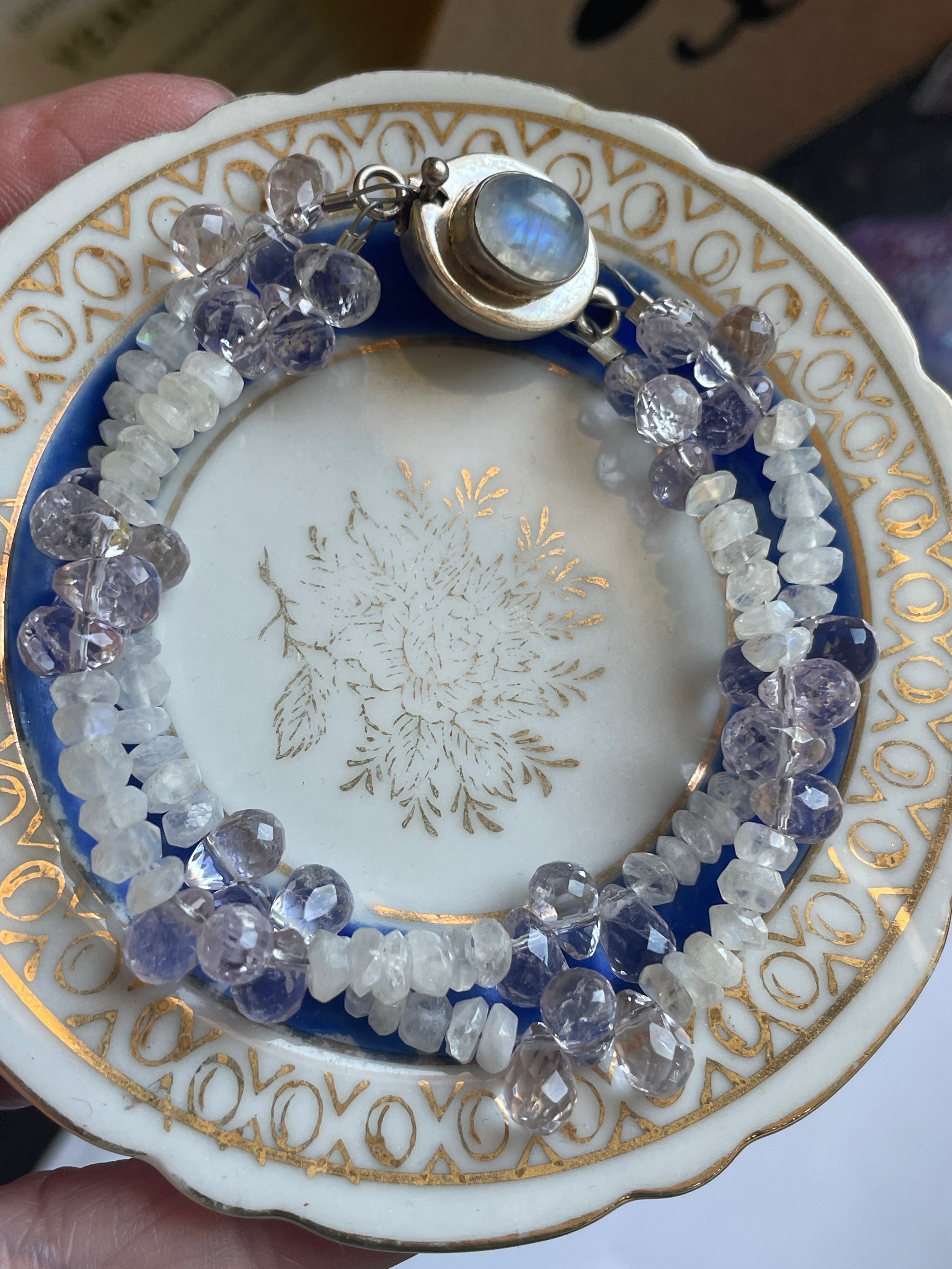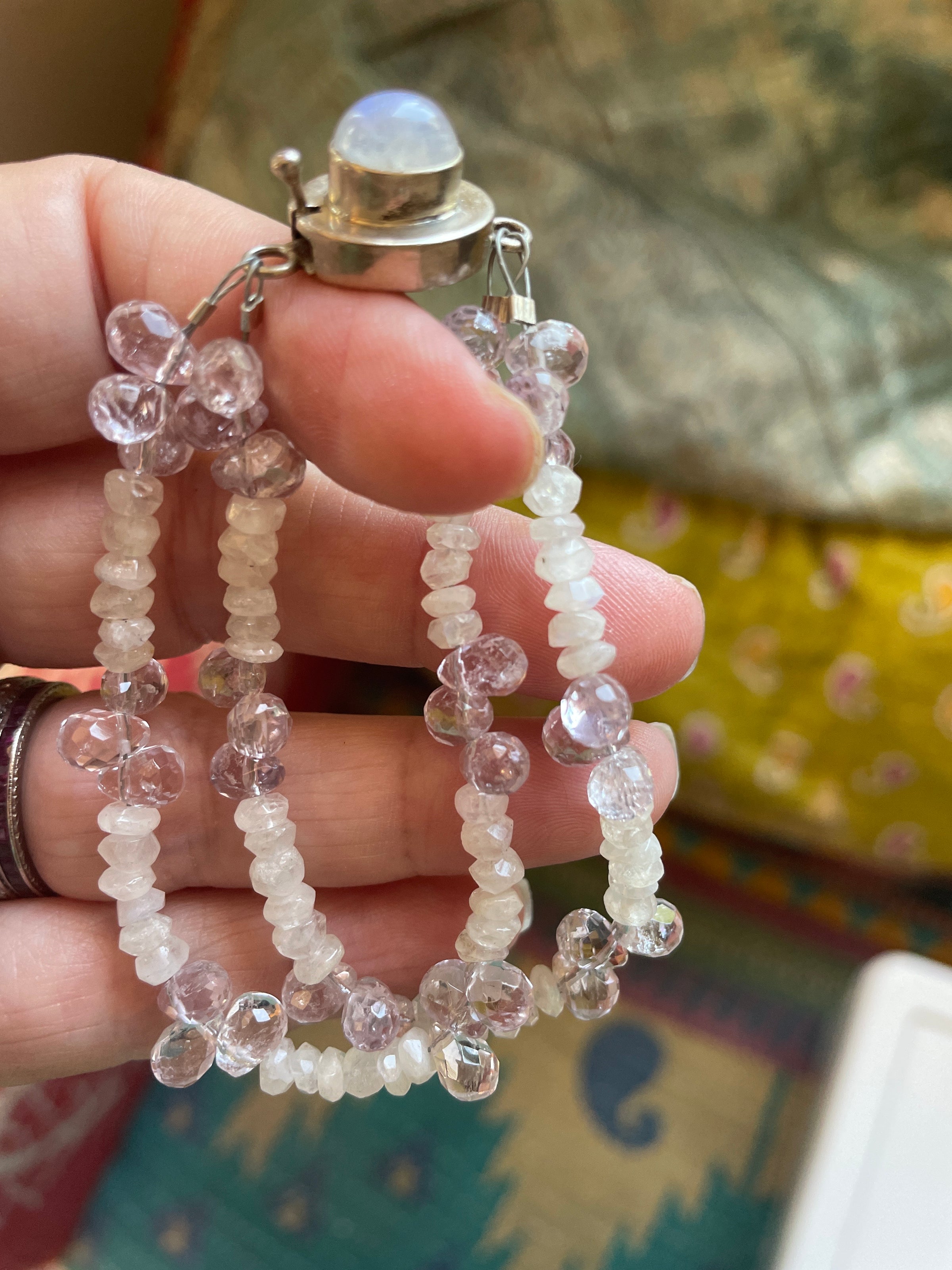 Fabulous handmade Moonstone and Amethyst bracelet with sterling silver Moonstone clasp. Bracelet measures approx 6.5 inches so fits smaller wrists. Clasp is stamped for sterling.