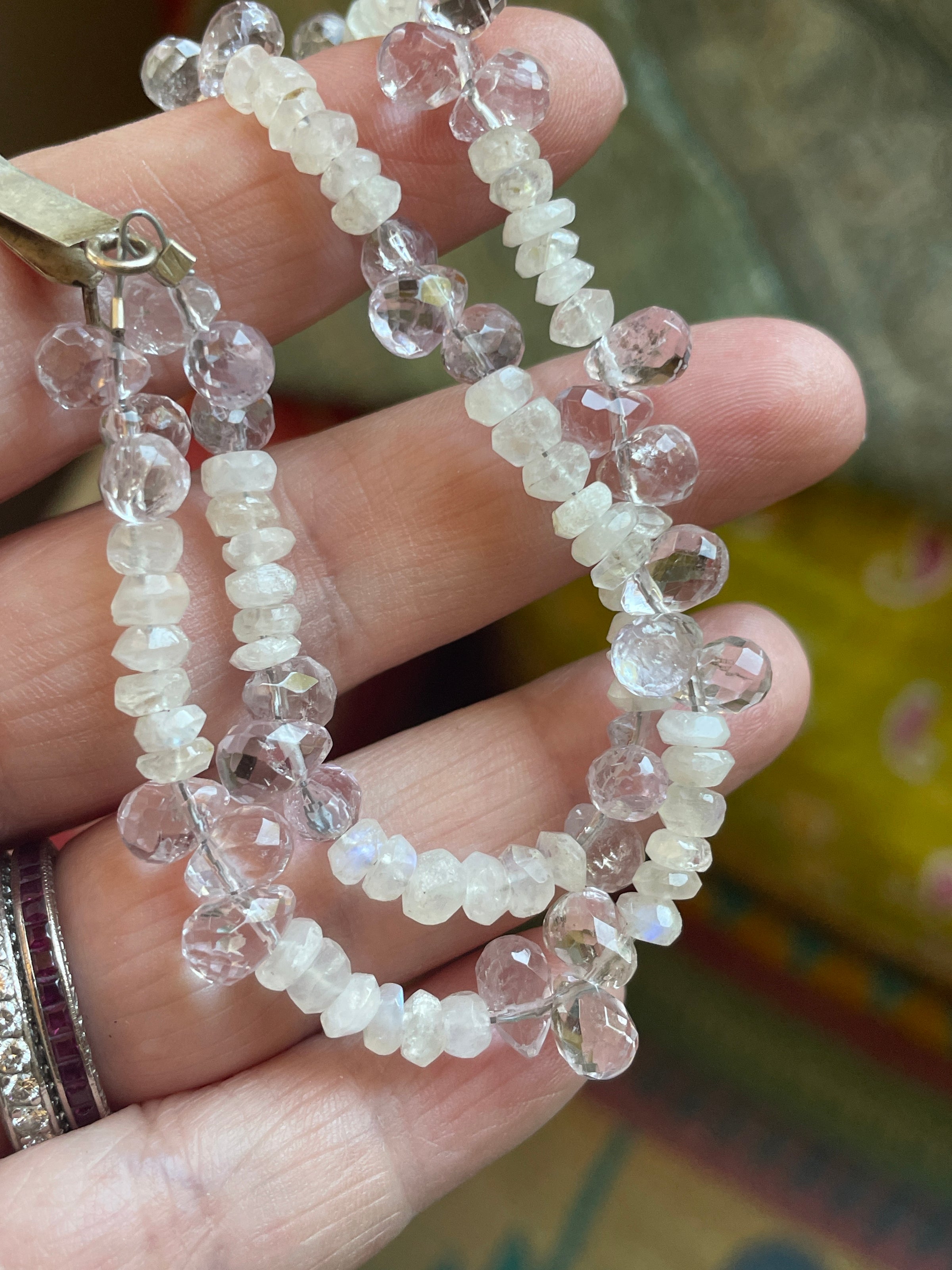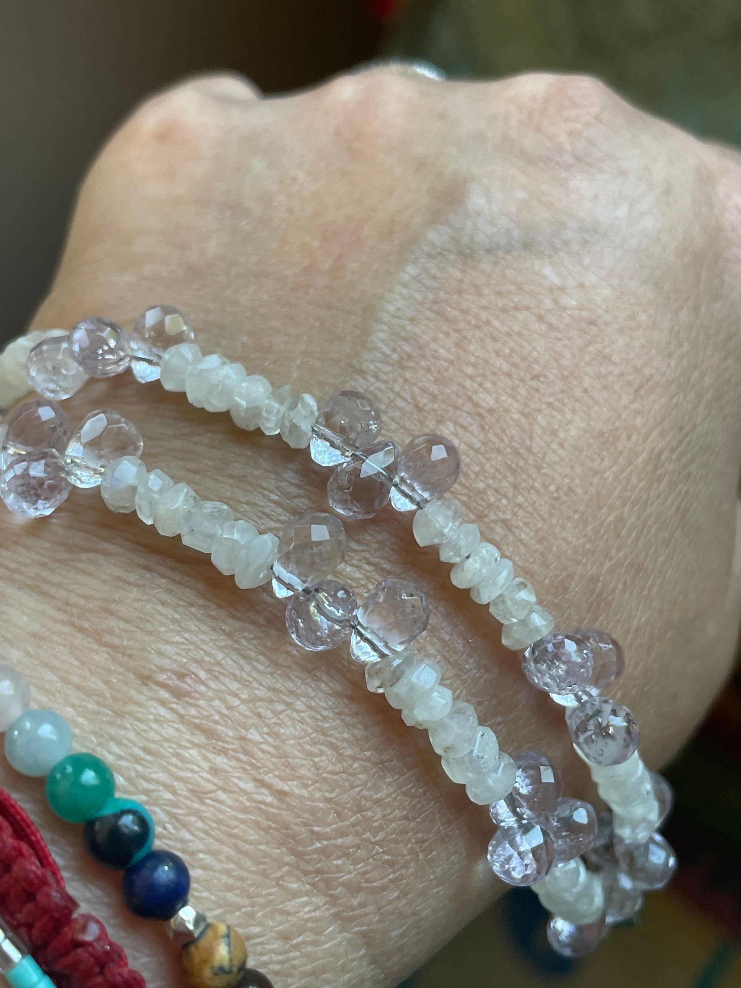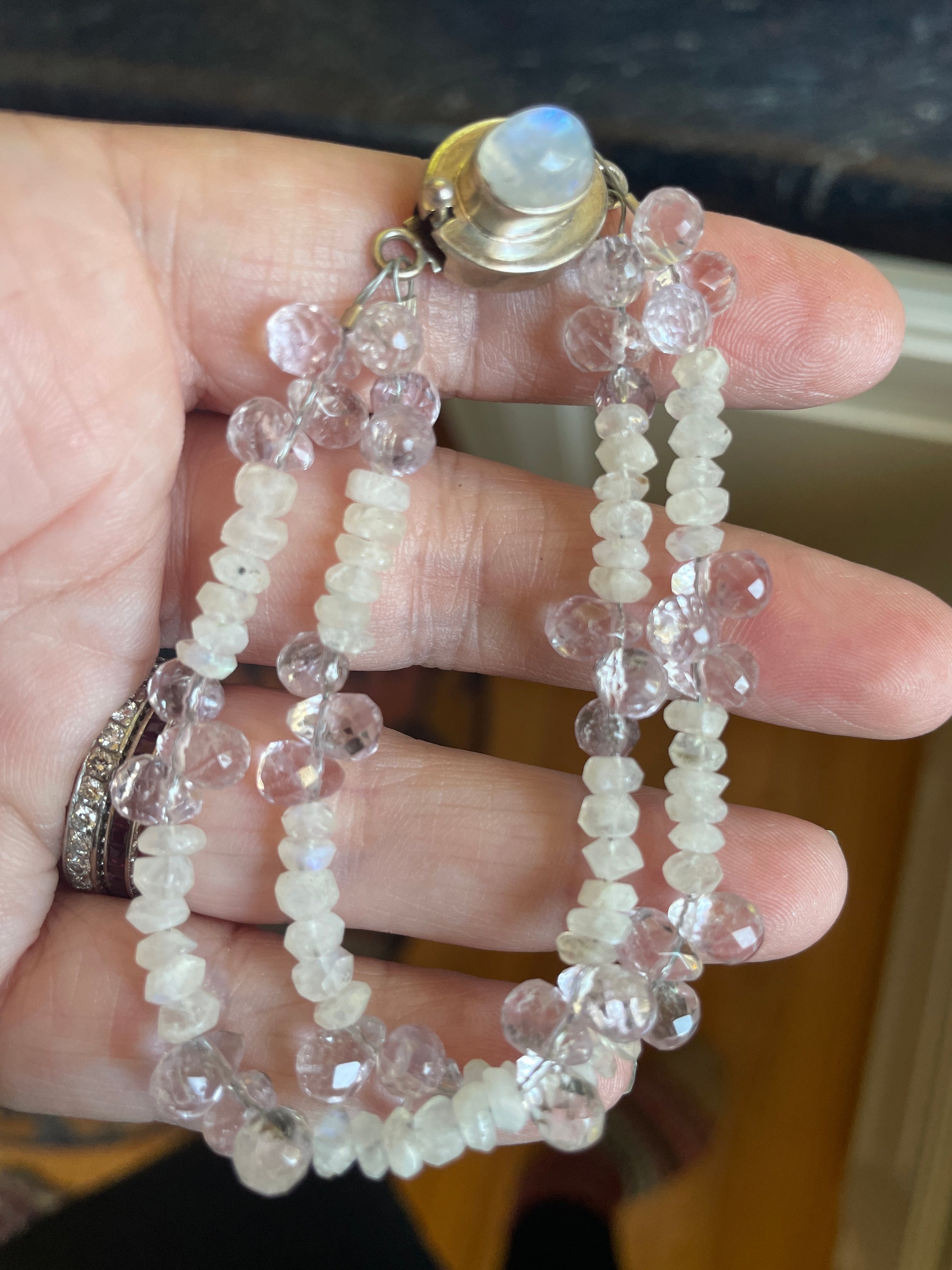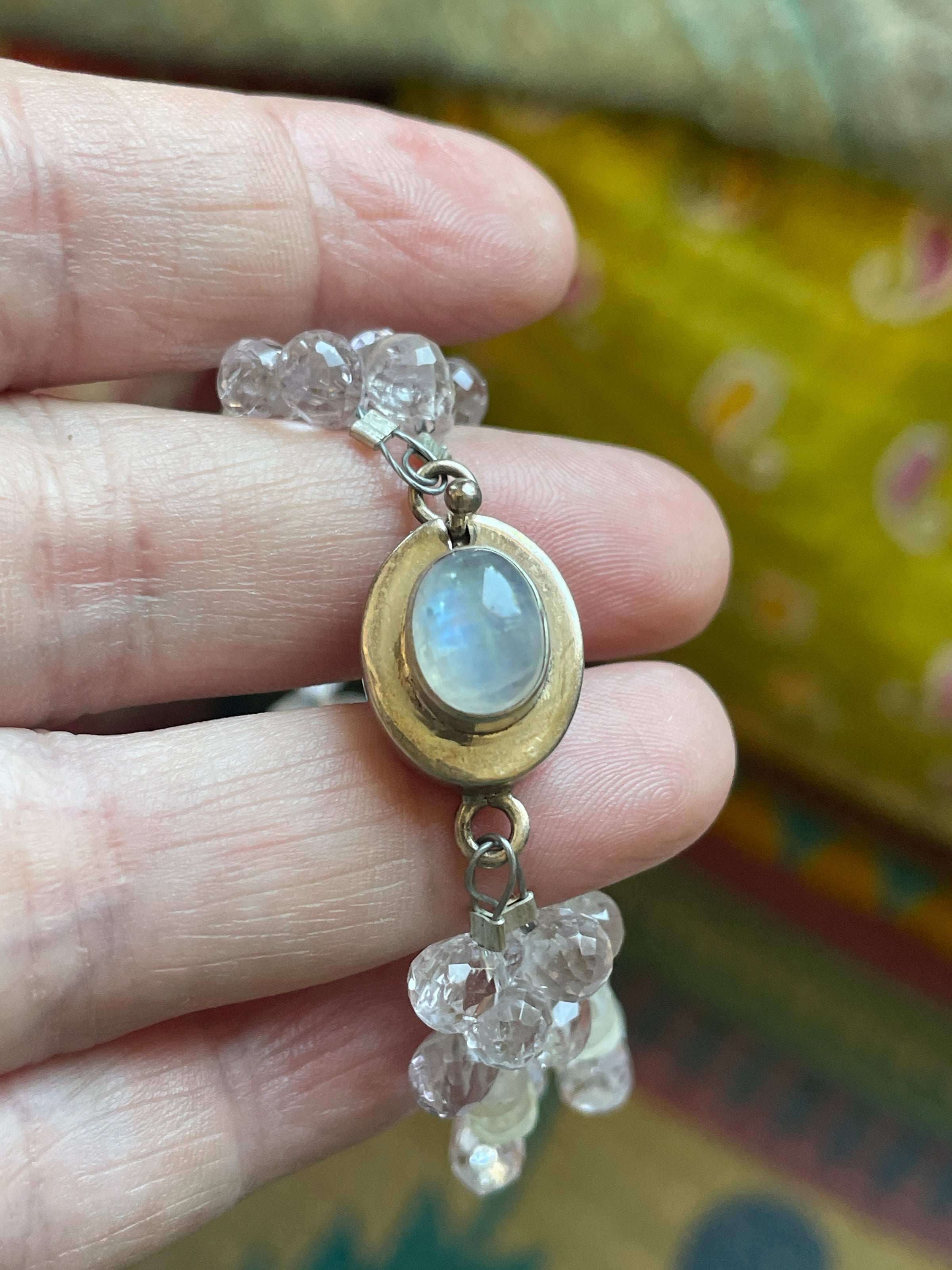 Fabulous handmade Moonstone and Amethyst bracelet with sterling silver Moonstone clasp. Bracelet measures approx 6.5 inches so fits smaller wrists. Clasp is stamped for sterling.