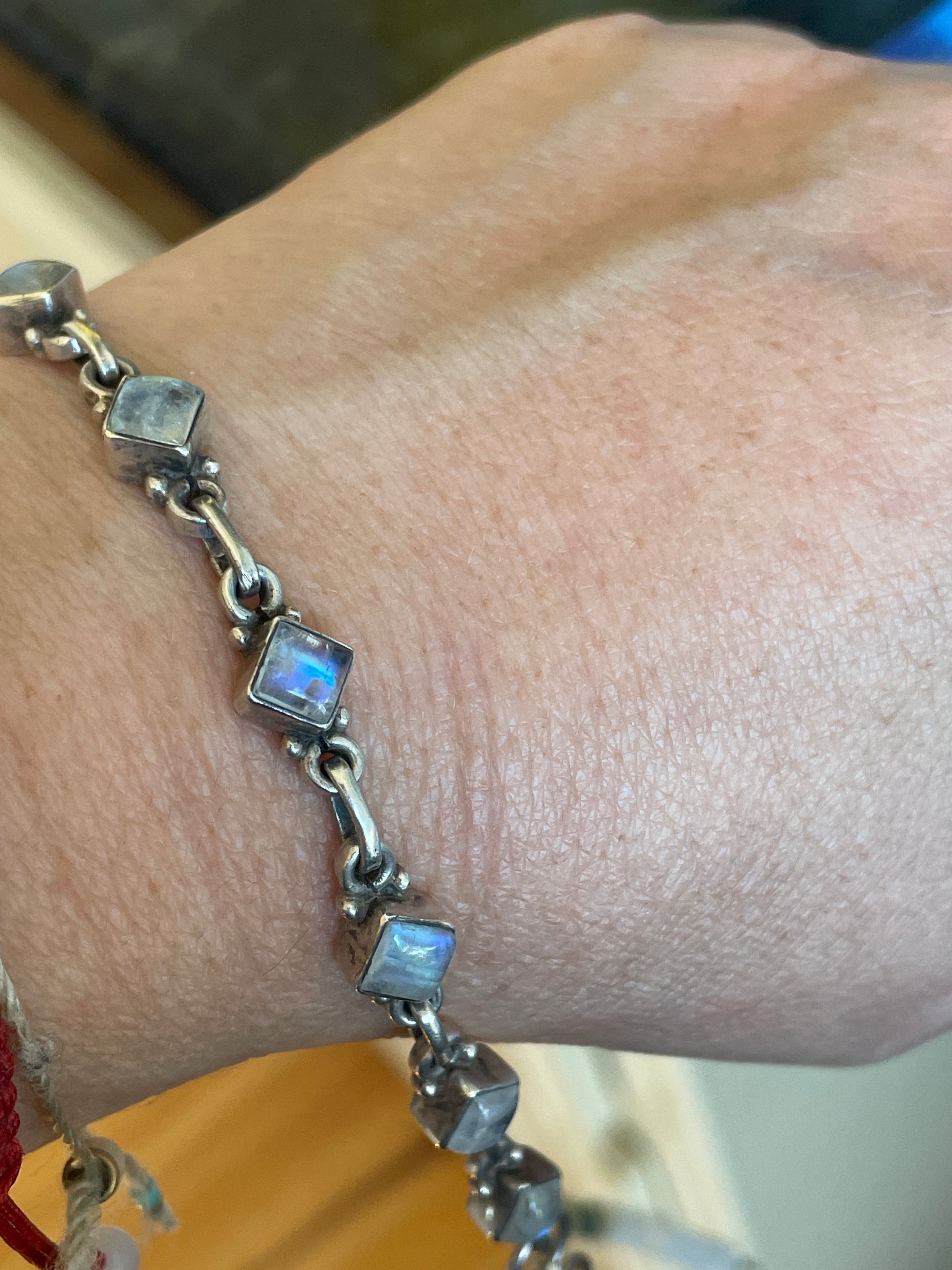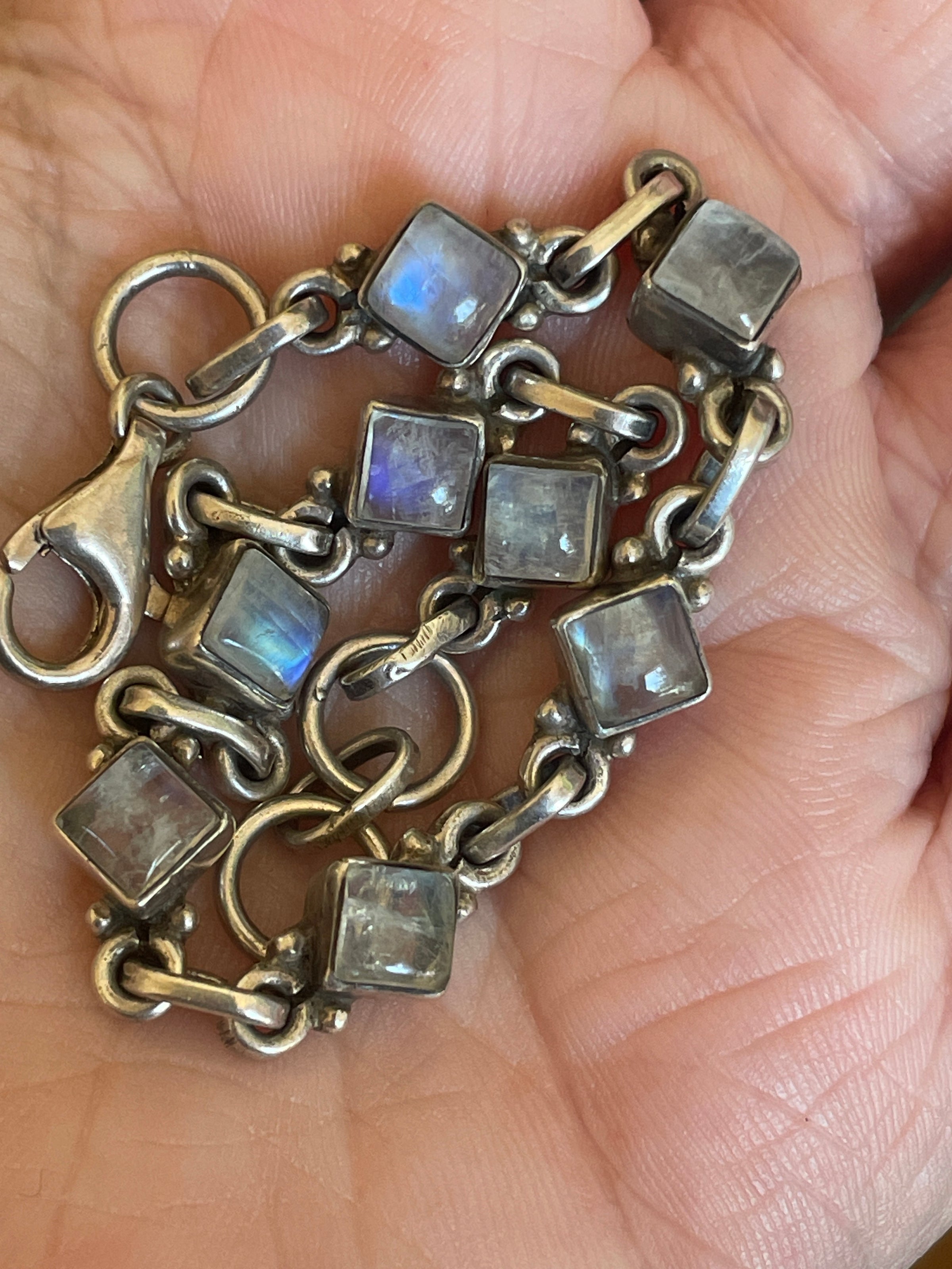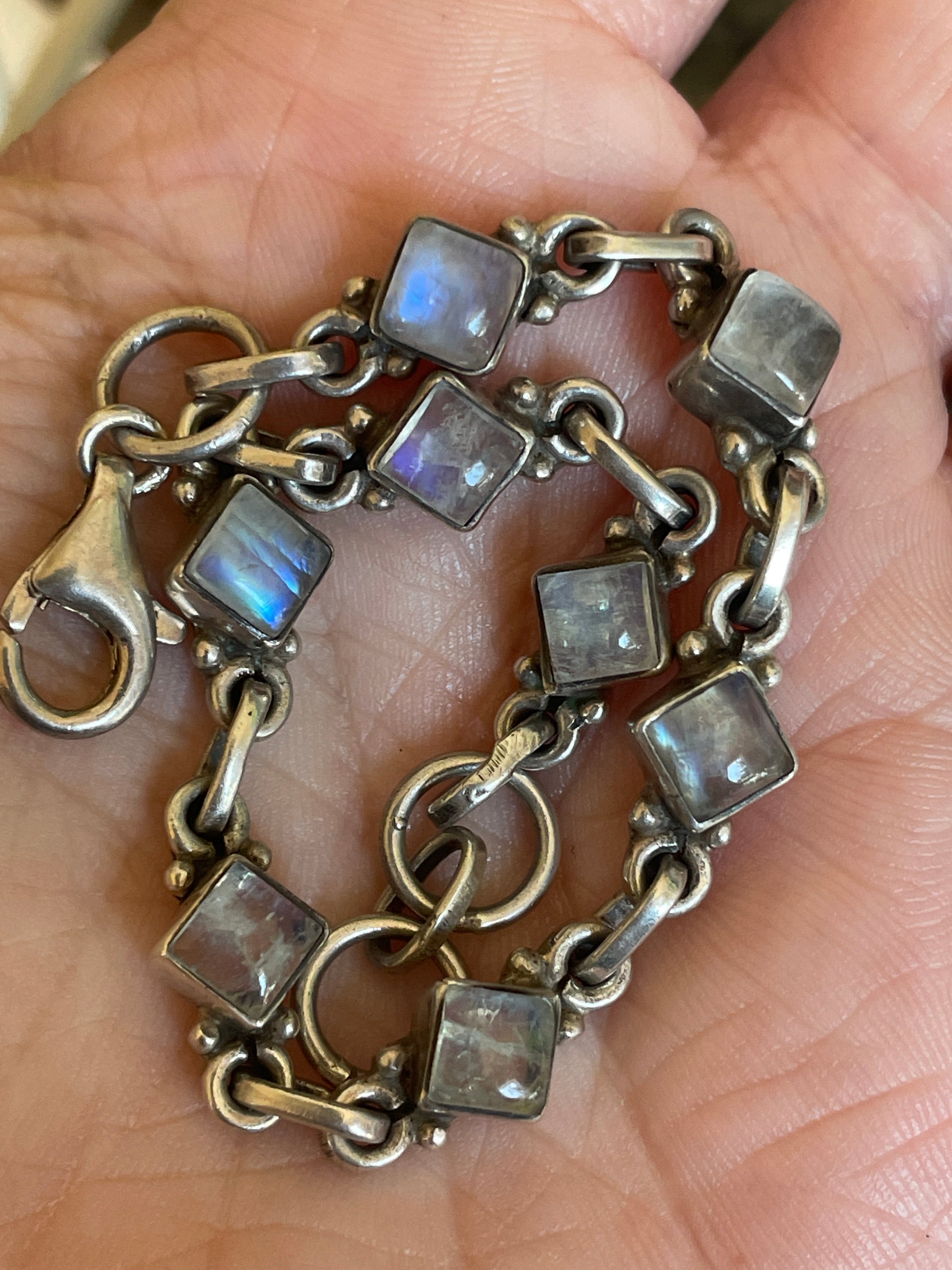 Fabulous Moonstone bracelet in sterling silver. Bracelet measures approx 7.5 inches. Can be worn slightly shorter at around 7 inches as it has extra rings on the end. Clasp is stamped 925 for sterling.
