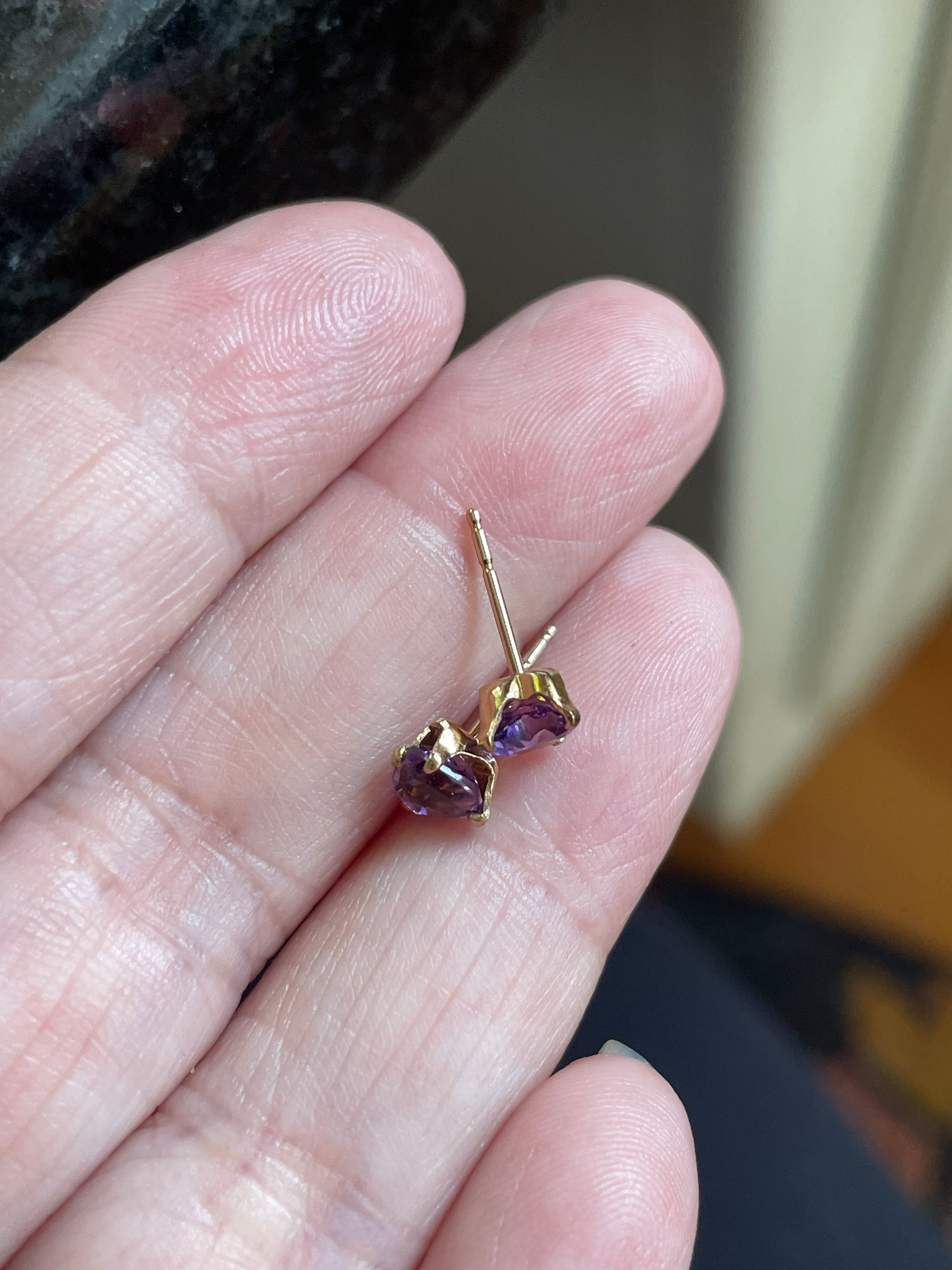 Adorable Amethyst earrings in 14k gold.  Stones approx 4mm tall..  They come with plastic backs.  Stamped 14k.