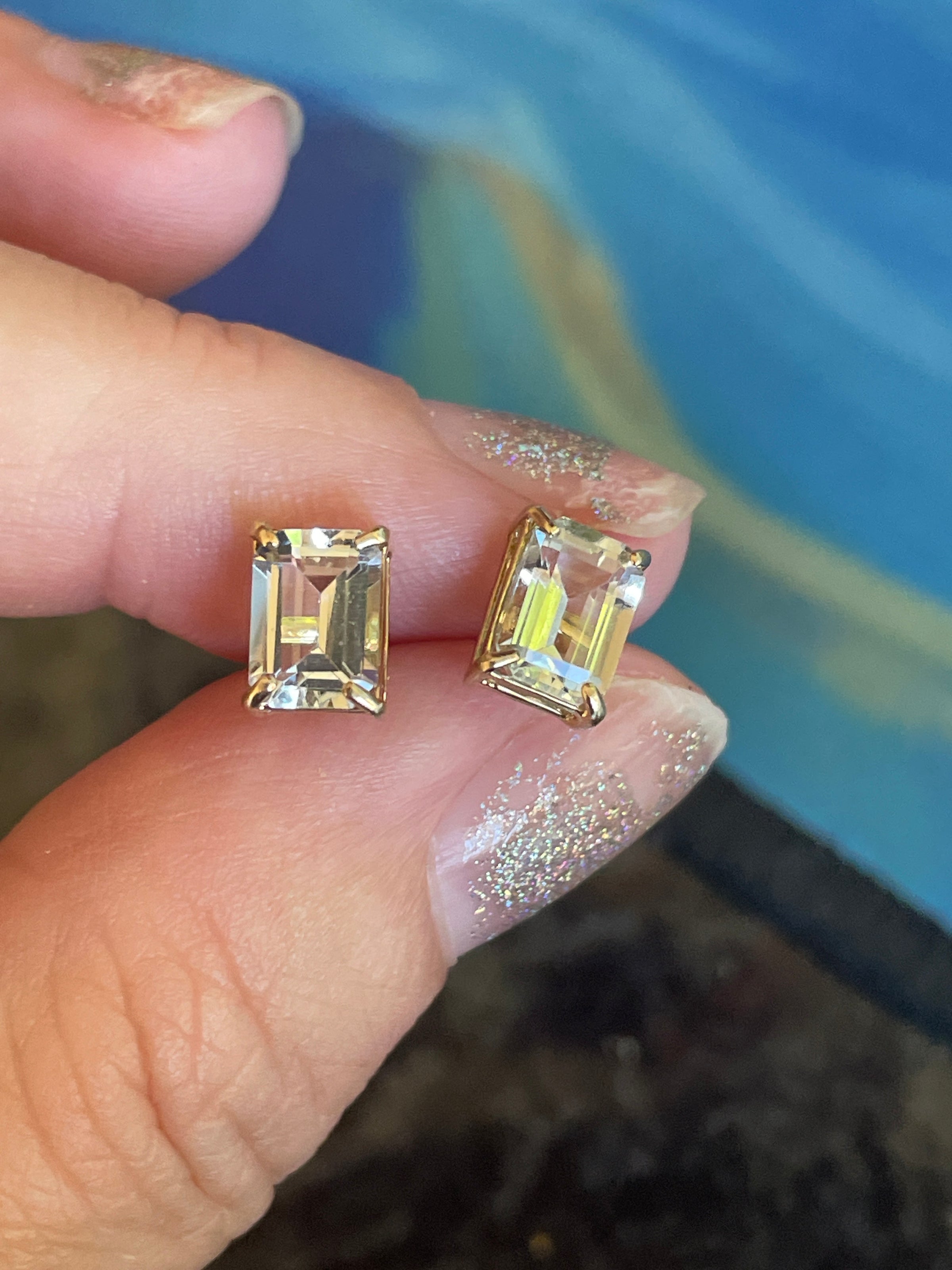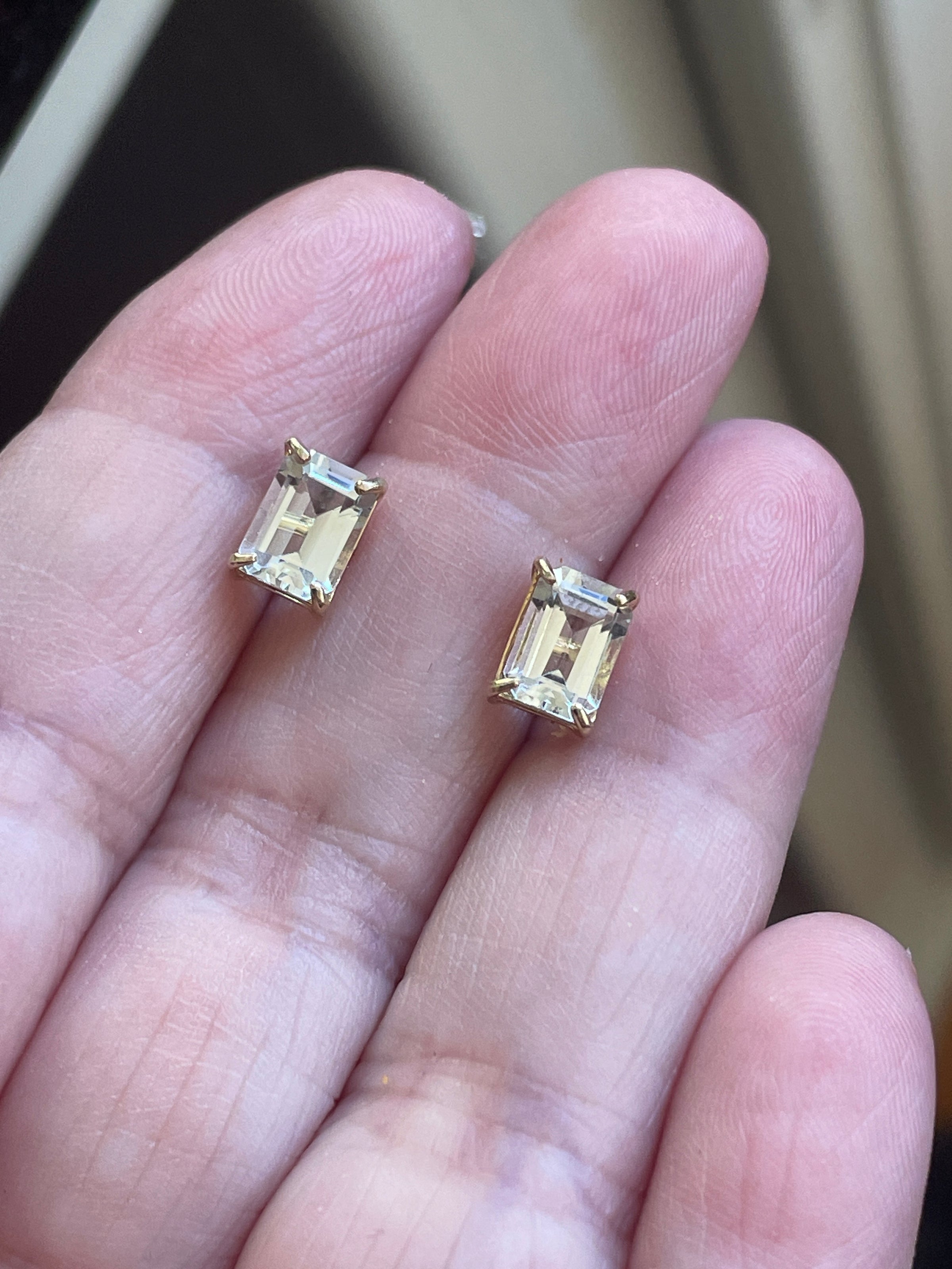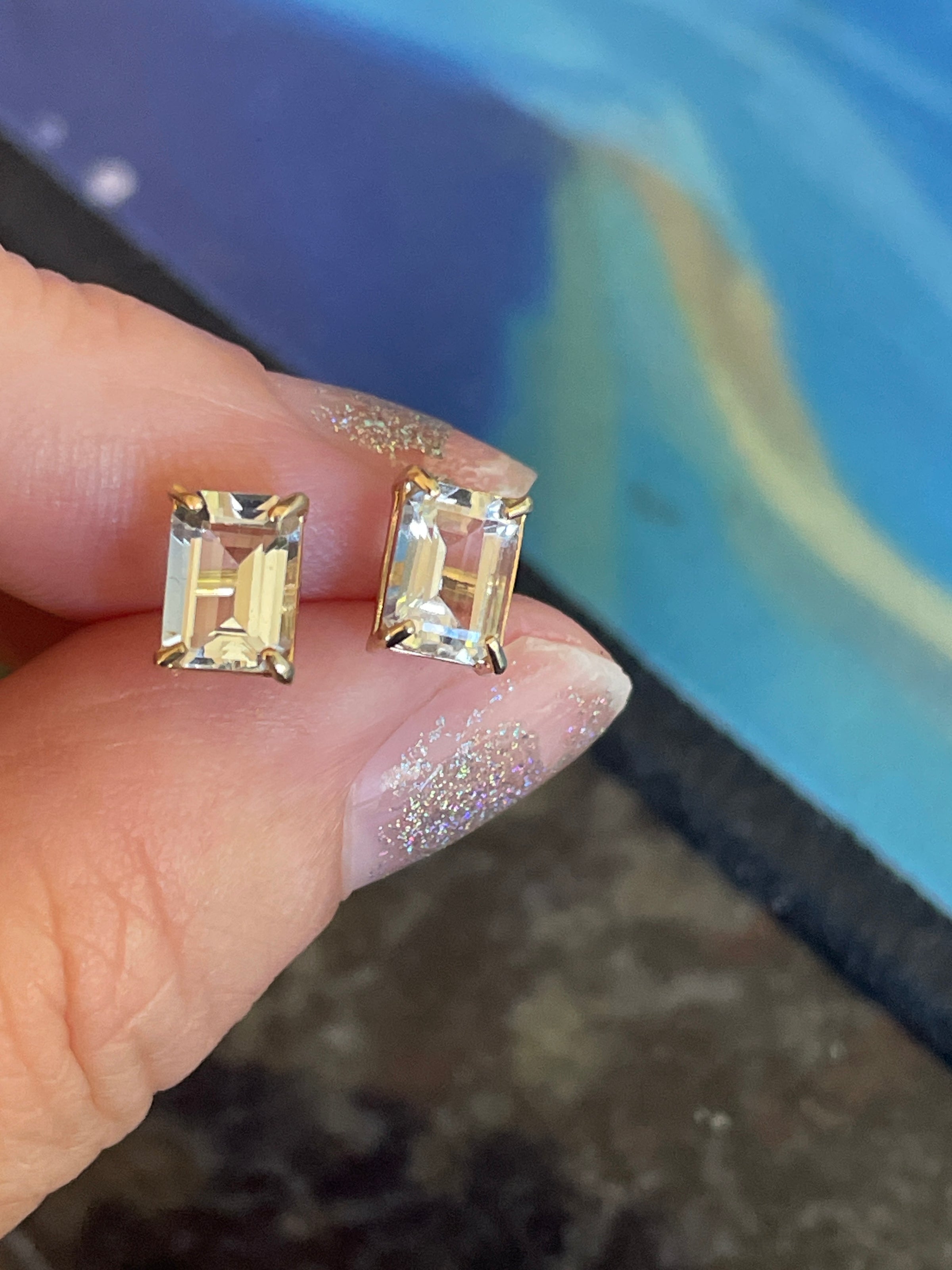 Gorgeous vintage Aquamarine earrings in 14k gold which have an emerald cut. They measure approx 7mm x 5mm Stamped 14k on posts.
