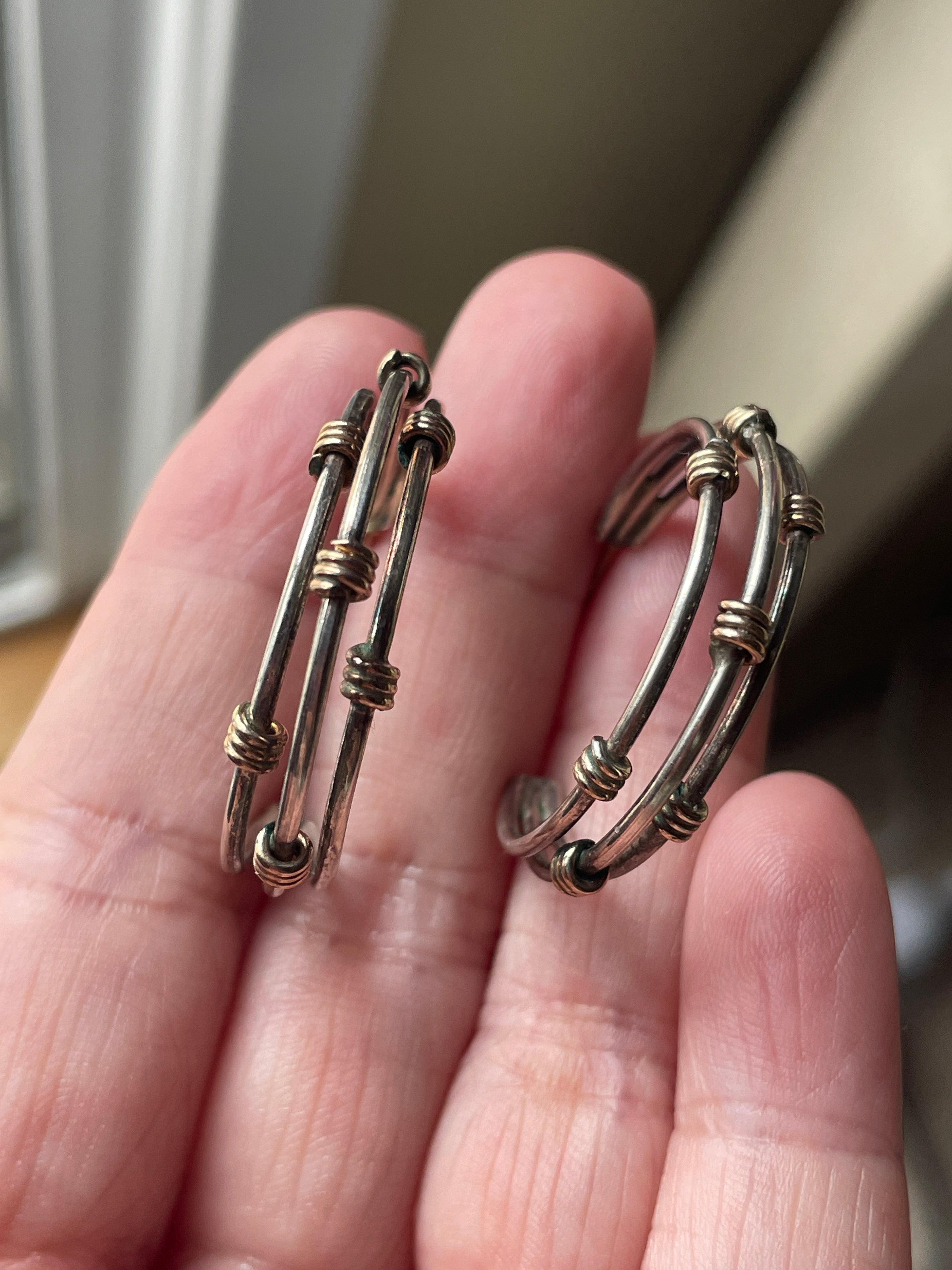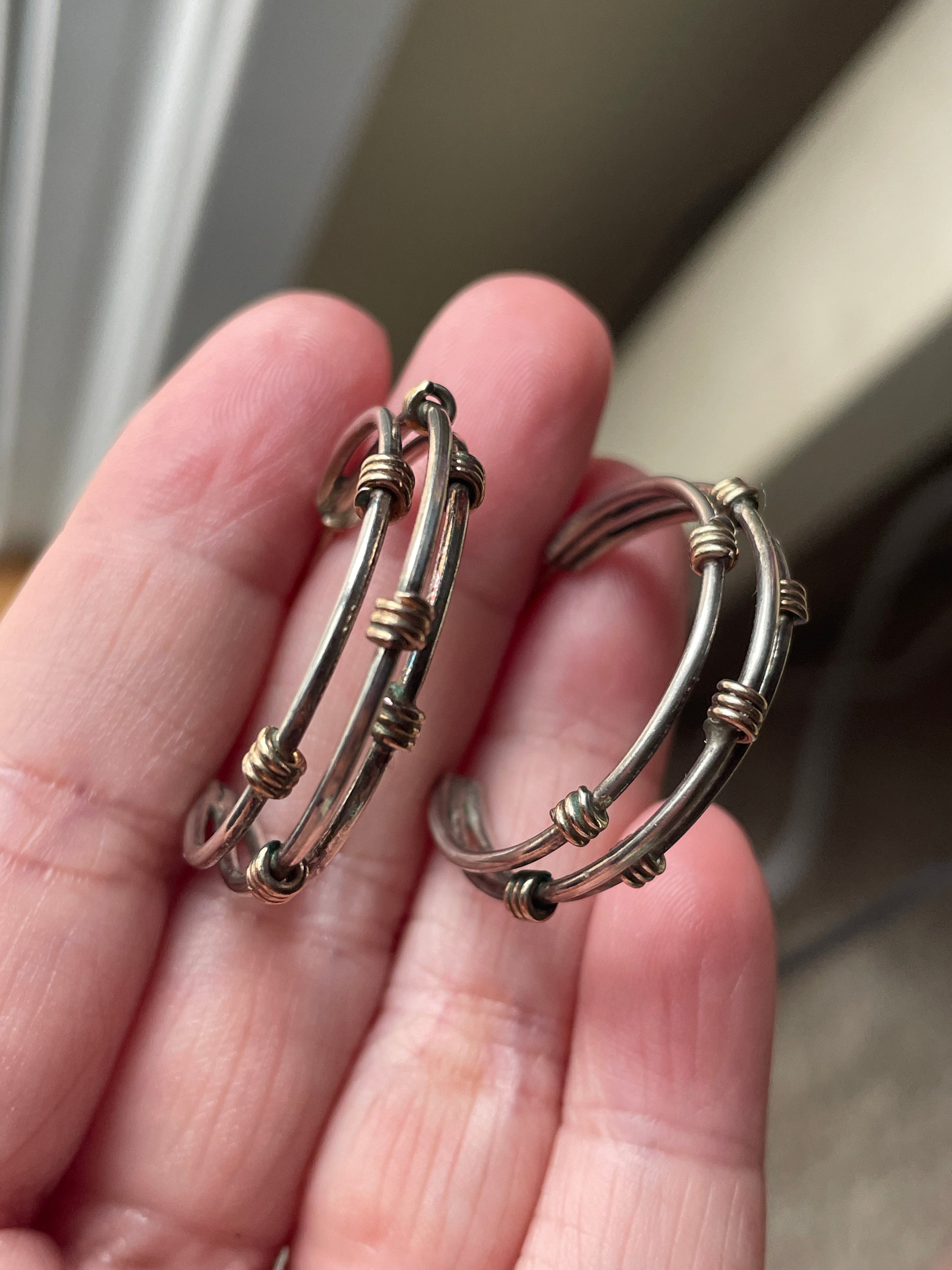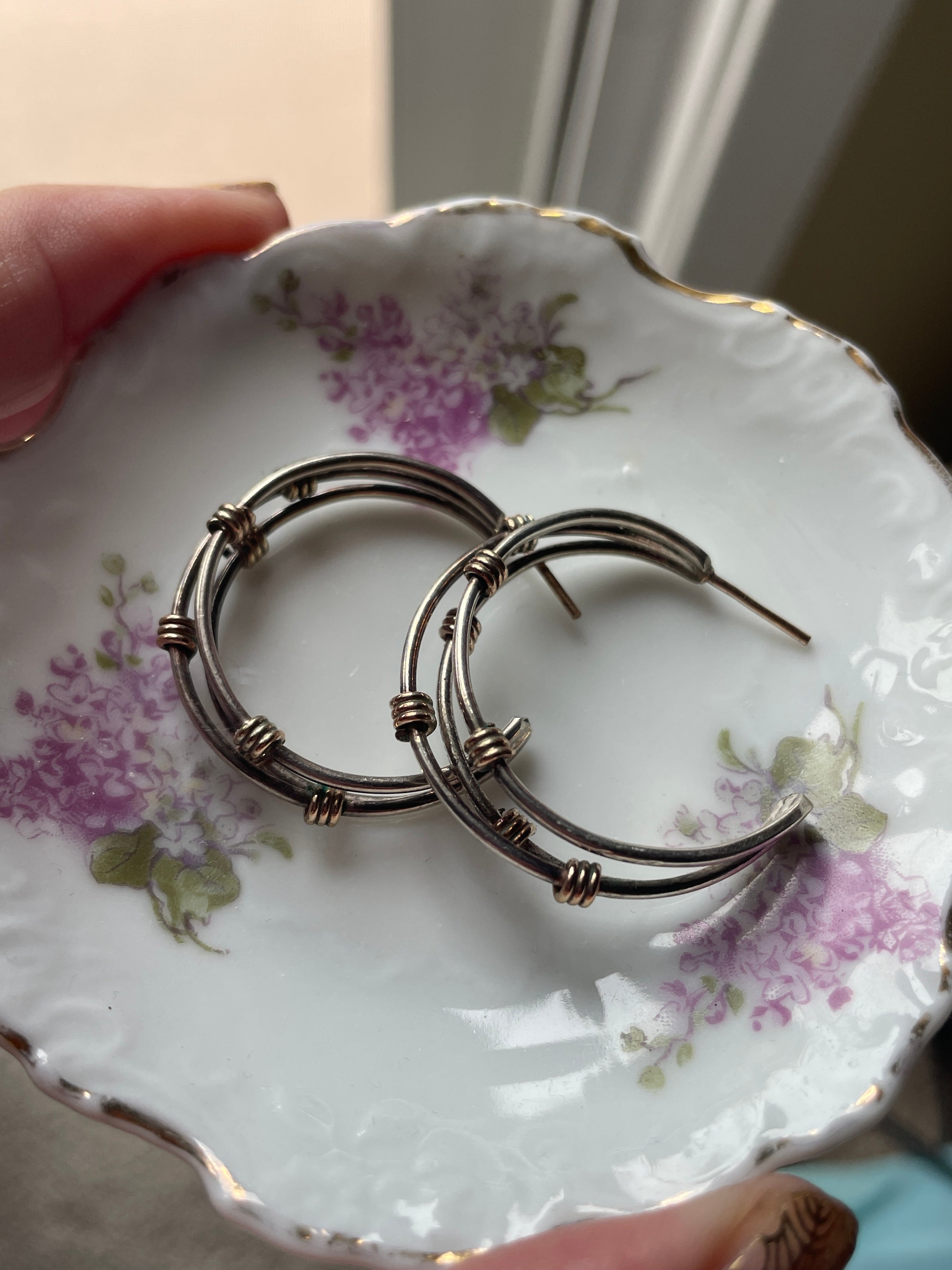 Fabulous vintage banded hoop earrings in sterling silver with Rose gold bands around earrings. Likely Rose gold wash. Posts also appear rosy. Earrings measure just under 1.25 inches. Post back. Unmarked but tested sterling. Backs stamped 925.