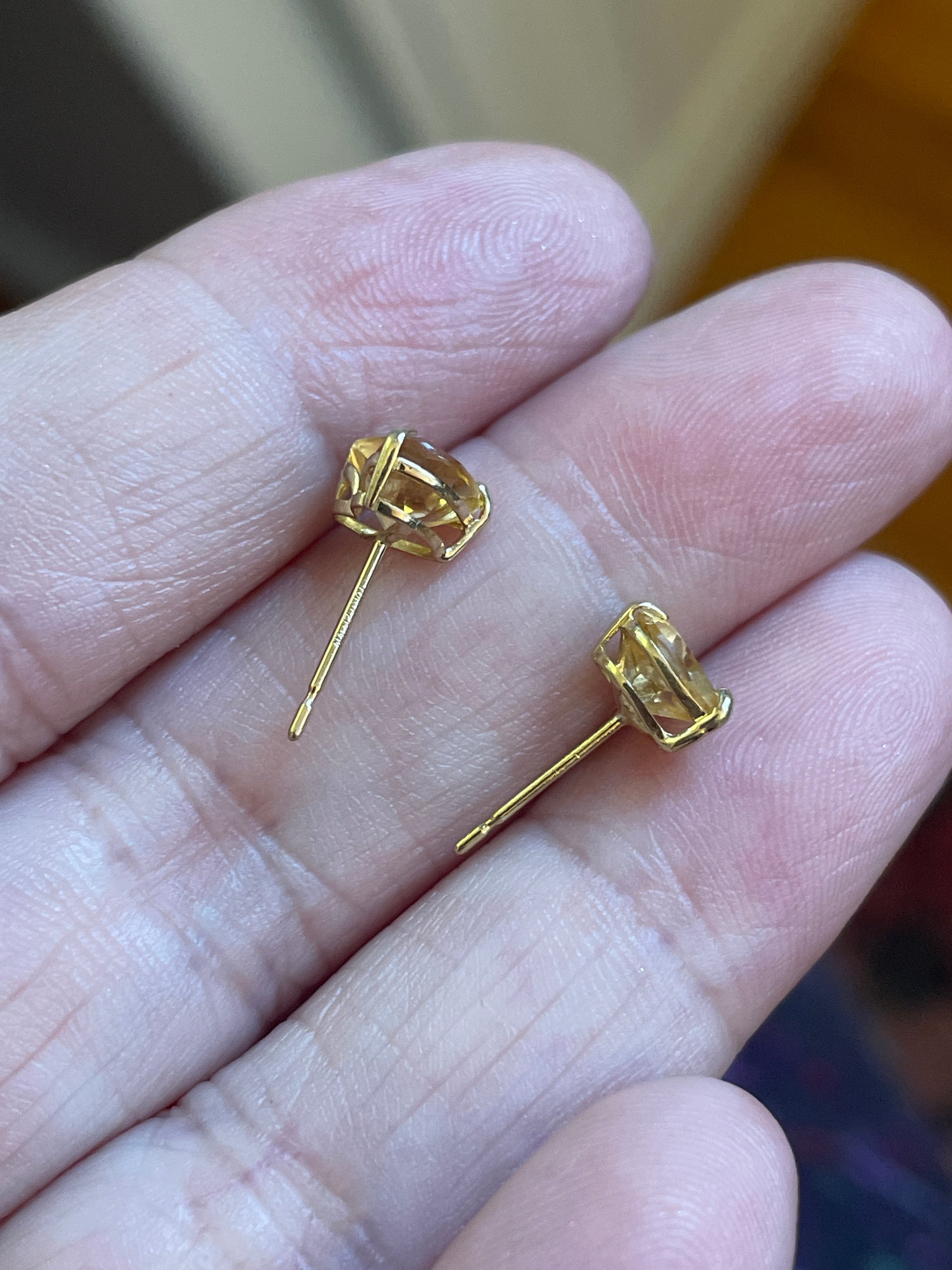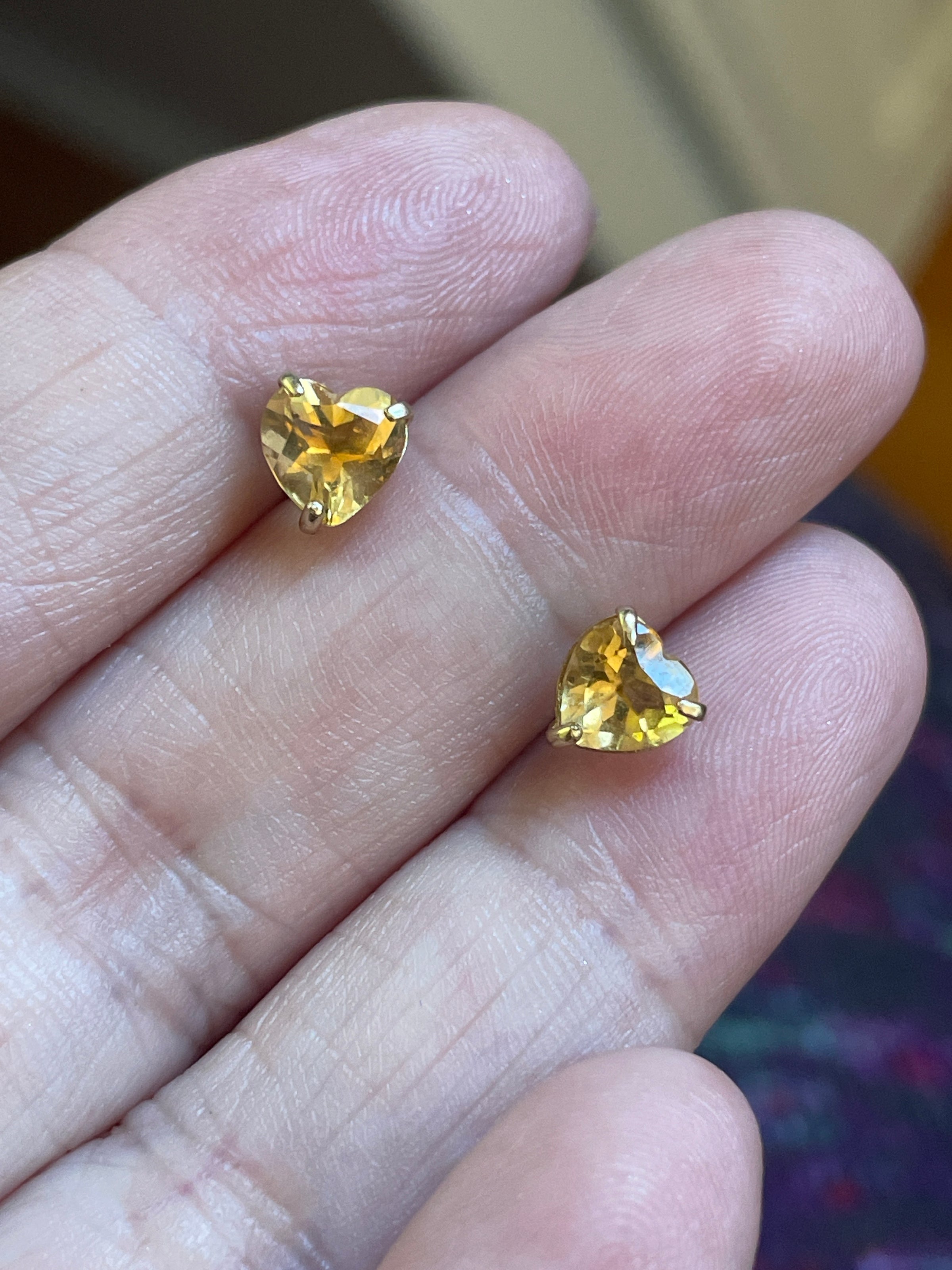 Beautiful sunny Citrine heart stud earrings in 10k gold. Earrings measure 5mm across. Stamped 10k on posts. These come with plastic backs.