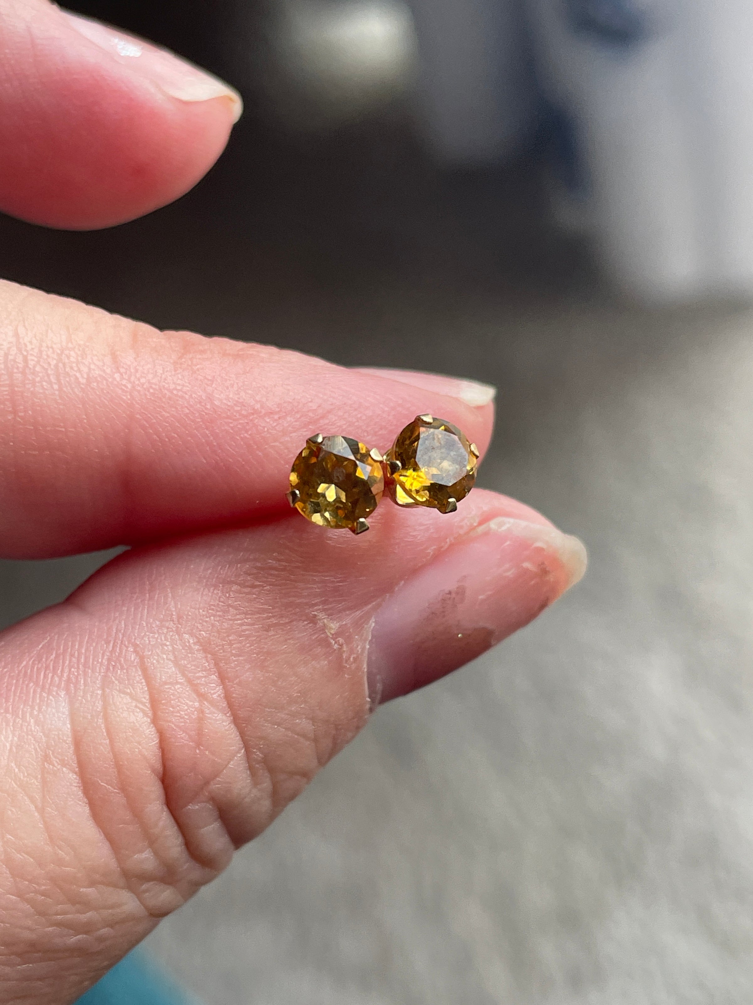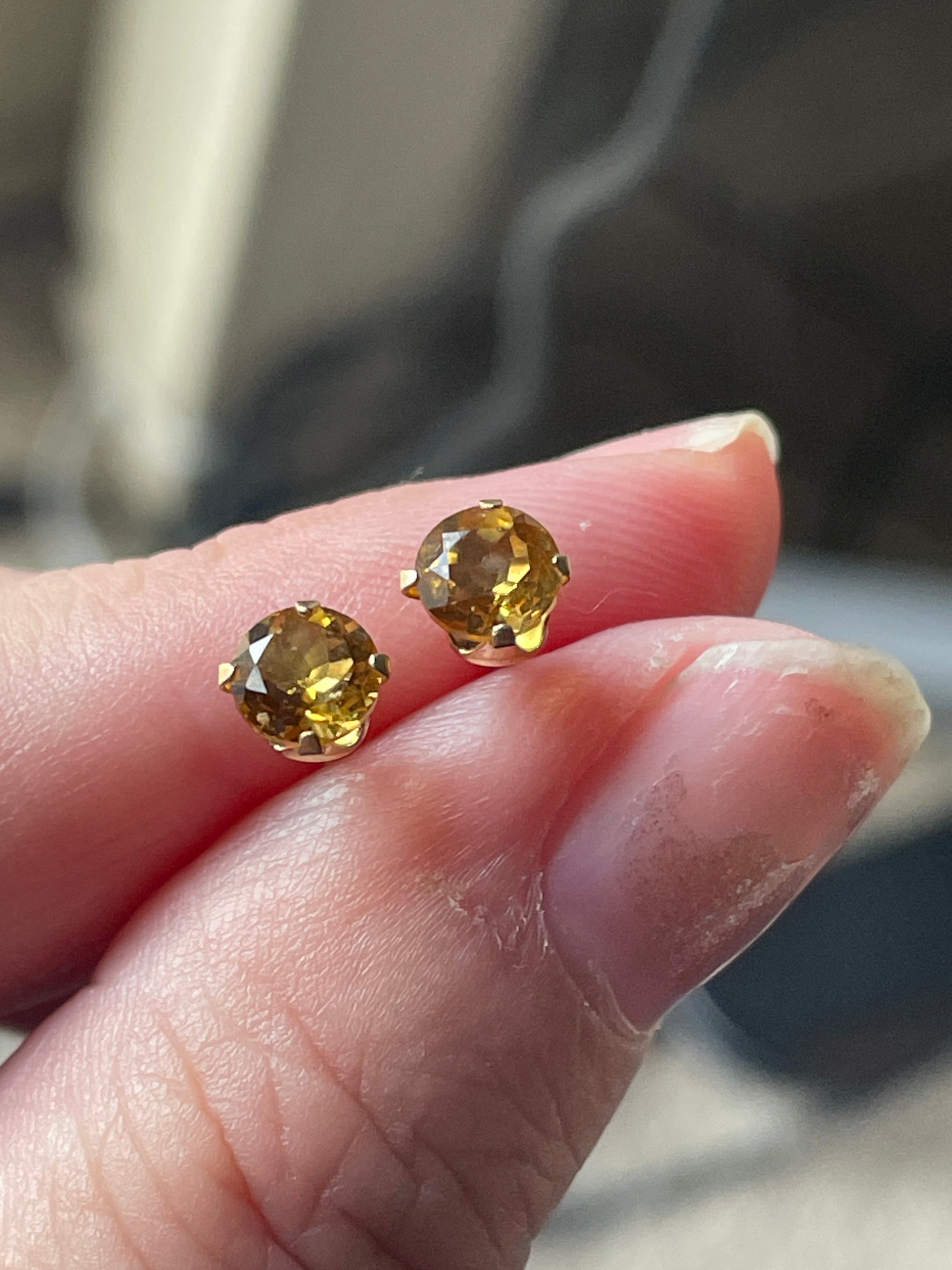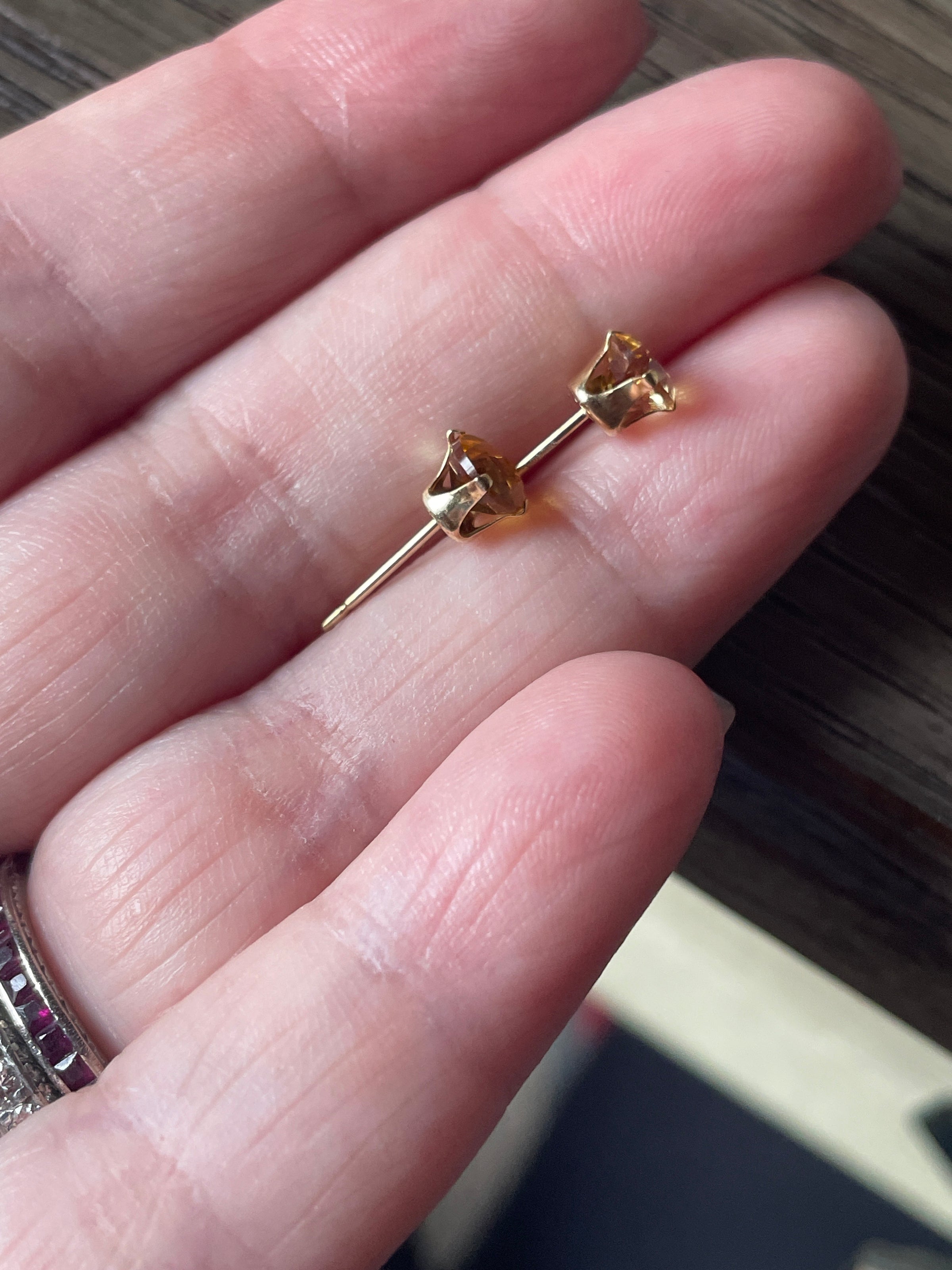 Gorgeous vintage Citrine stud earrings in 14k gold.  Little balls of sunshine.  These measure approx 5mm across. Posts are marked for 14k.  They come with plastic backs.