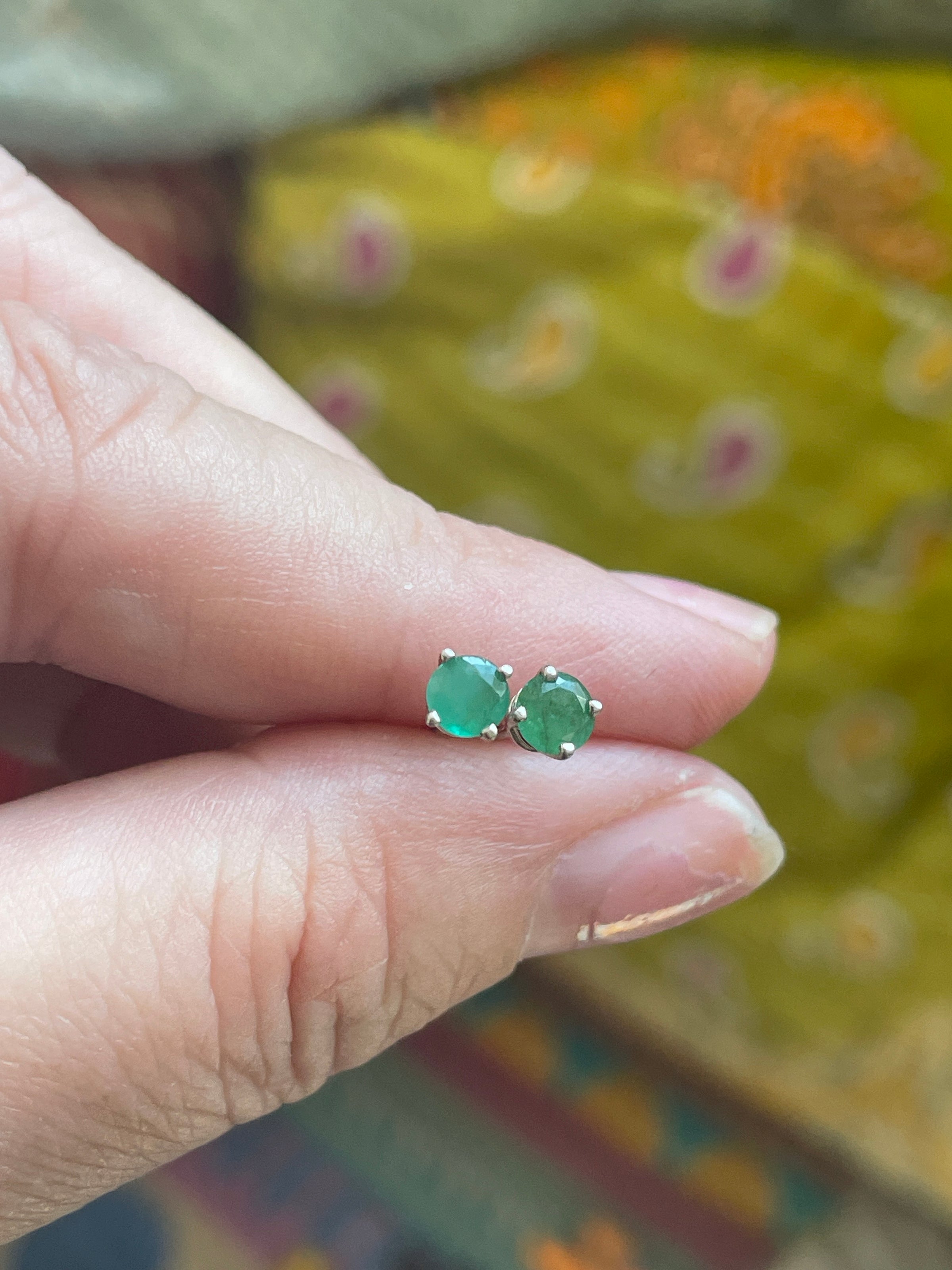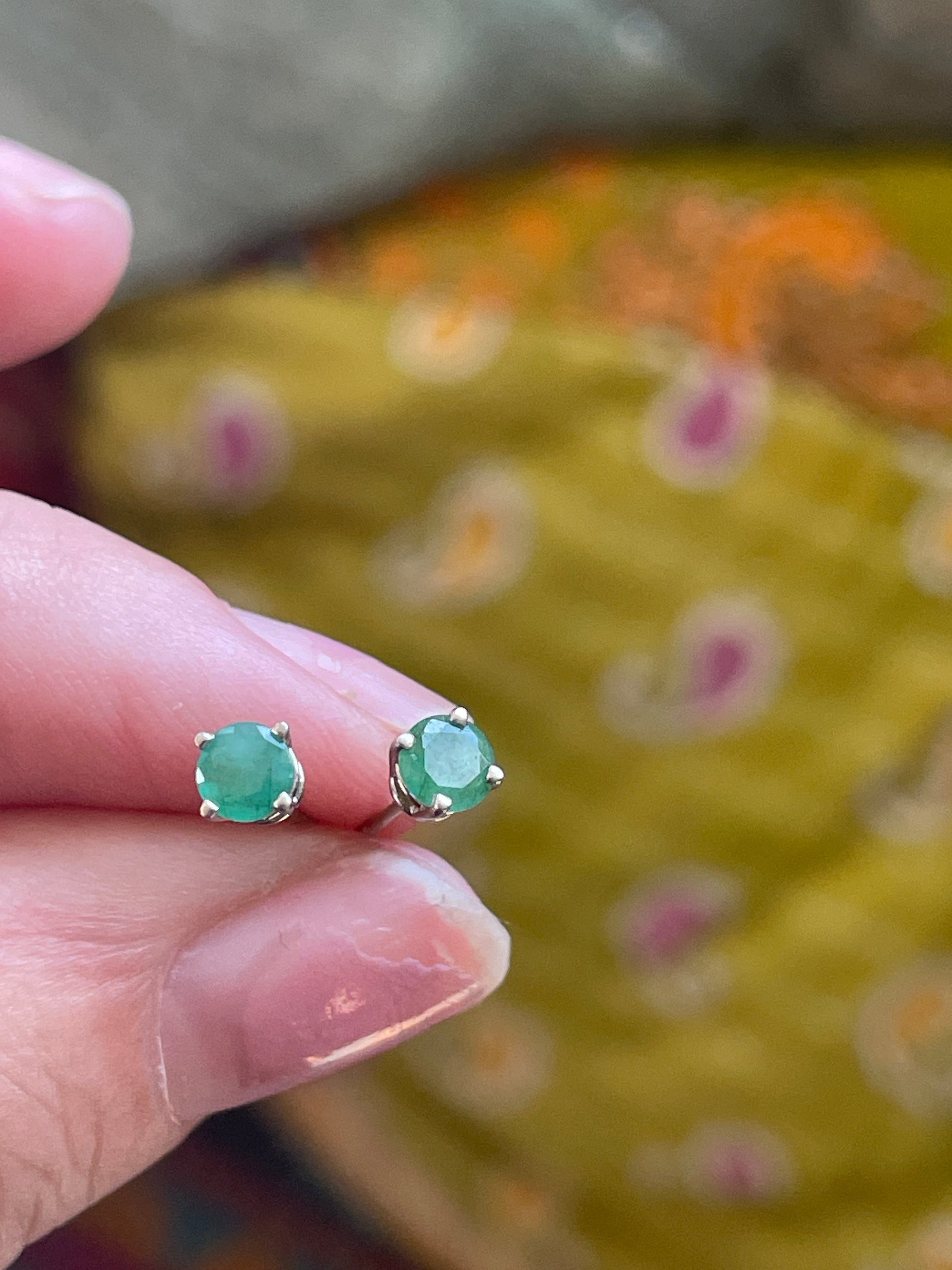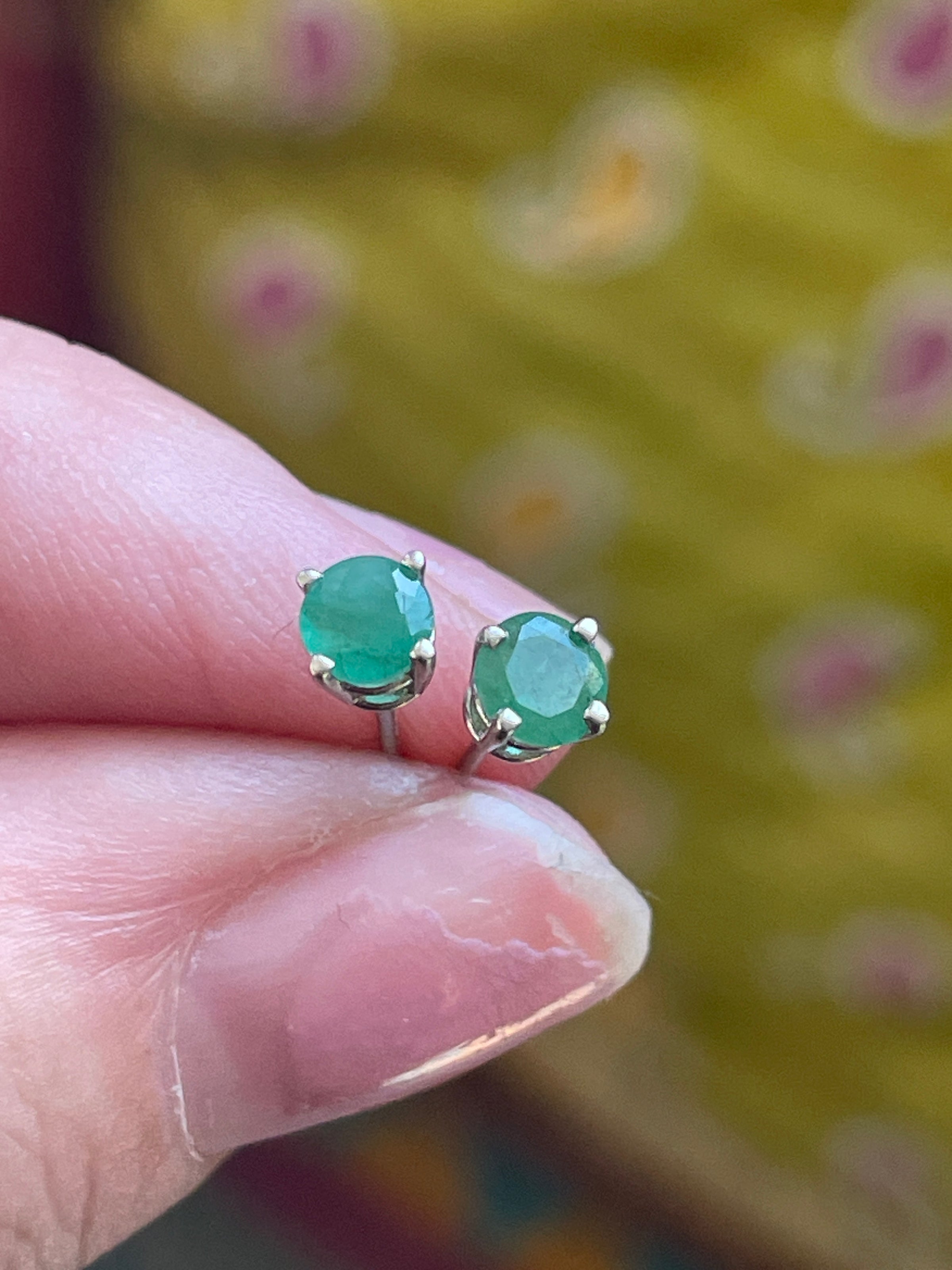 Gorgeous vintage Emerald stud earrings in 14k white gold. Stones measure approx 4mm. Posts stamped 14k. Note one is slightly bent but functional (see photos). They come with plastic backs.
