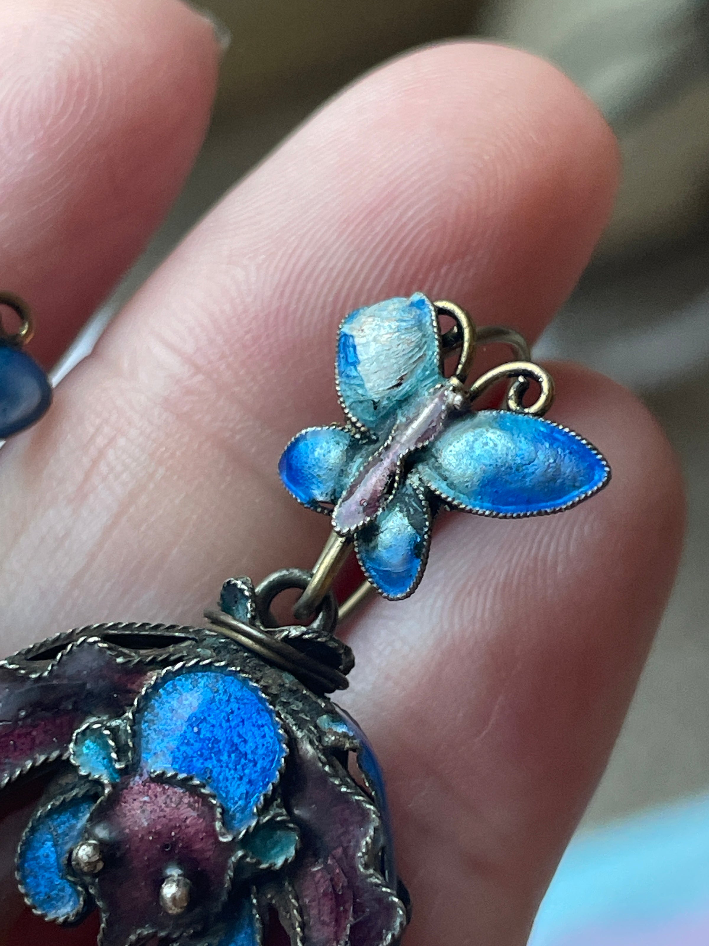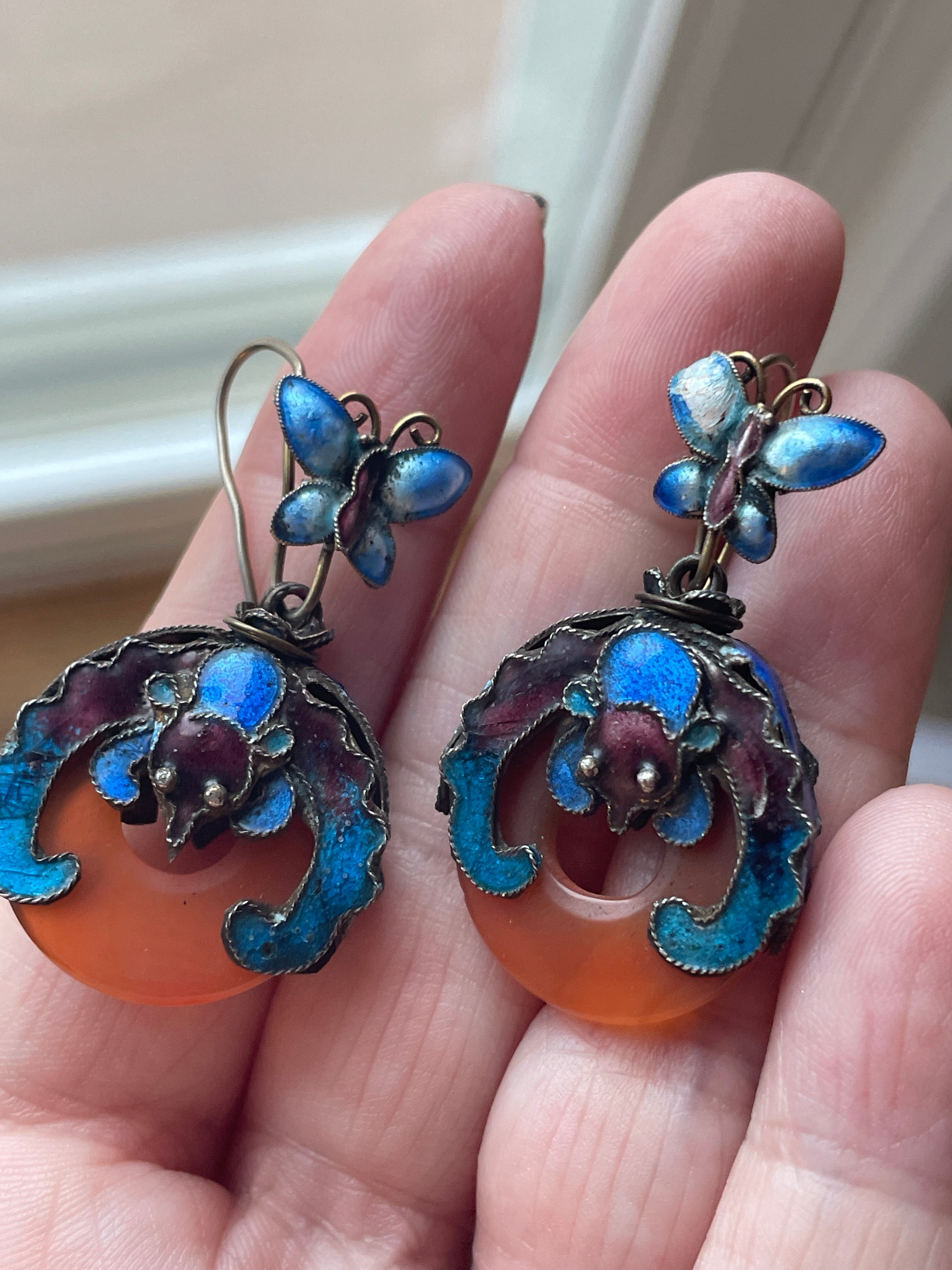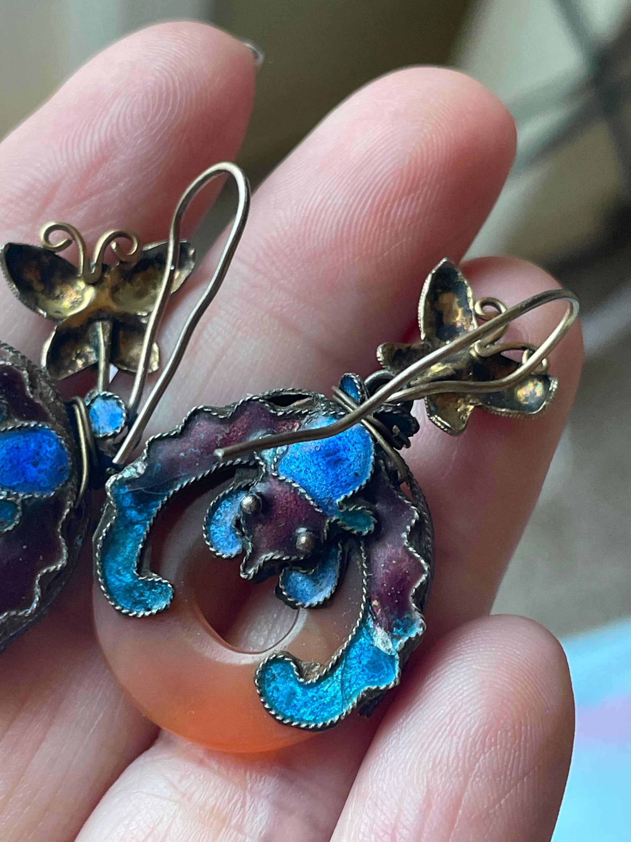 Fabulous rare vintage (close to Antique) butterfly bat enameled drop earrings in sterling with gold wash. The stone is likely Carnelian or Red Jade. These are circa 1930s. Some enamel loss on one of the Butterflies. These measure just under 1.5 inches. Enameled Bats are on both sides. Unmarked but sold to me as sterling. These are Chinese imports from early in the 20th century.