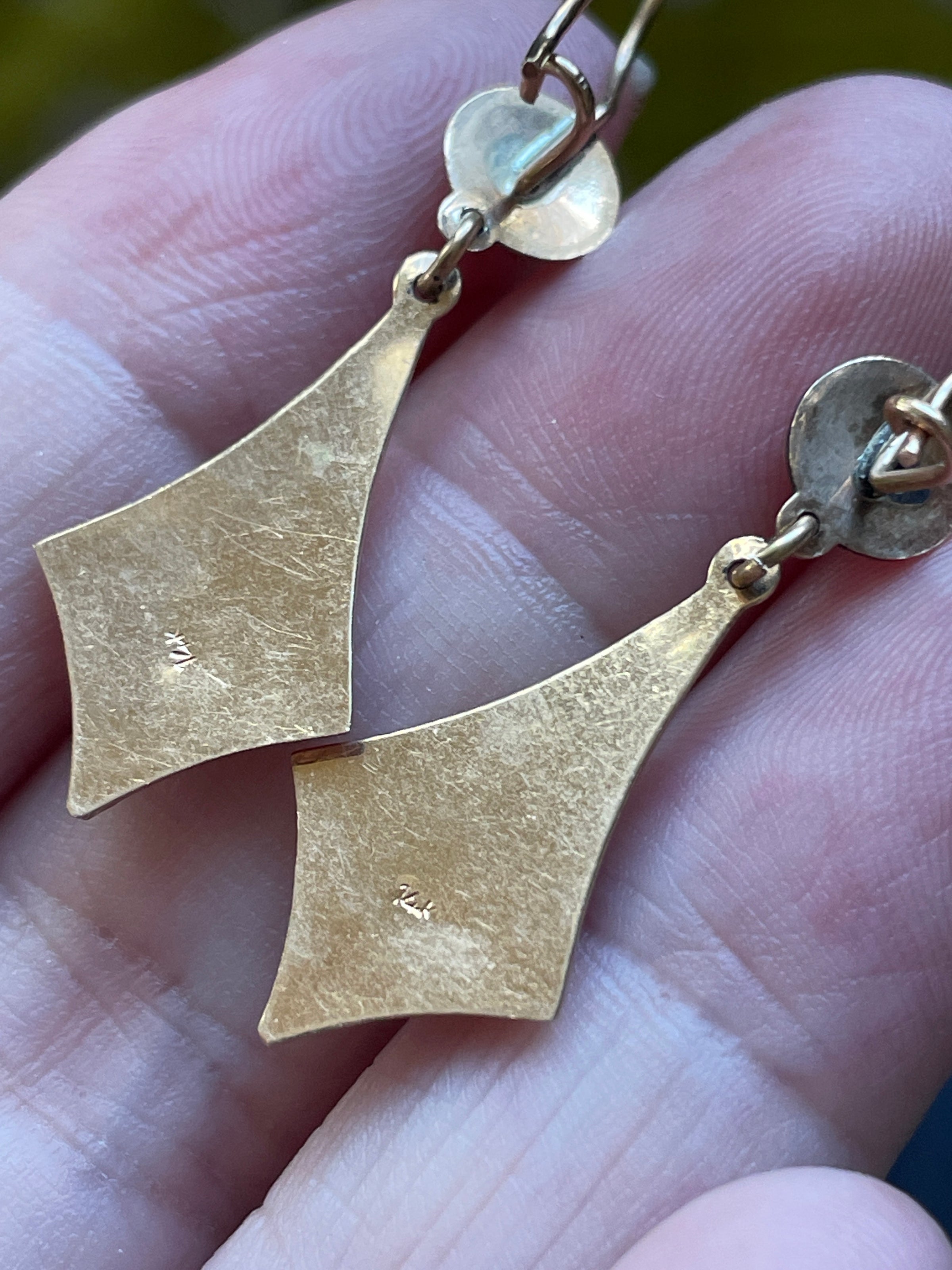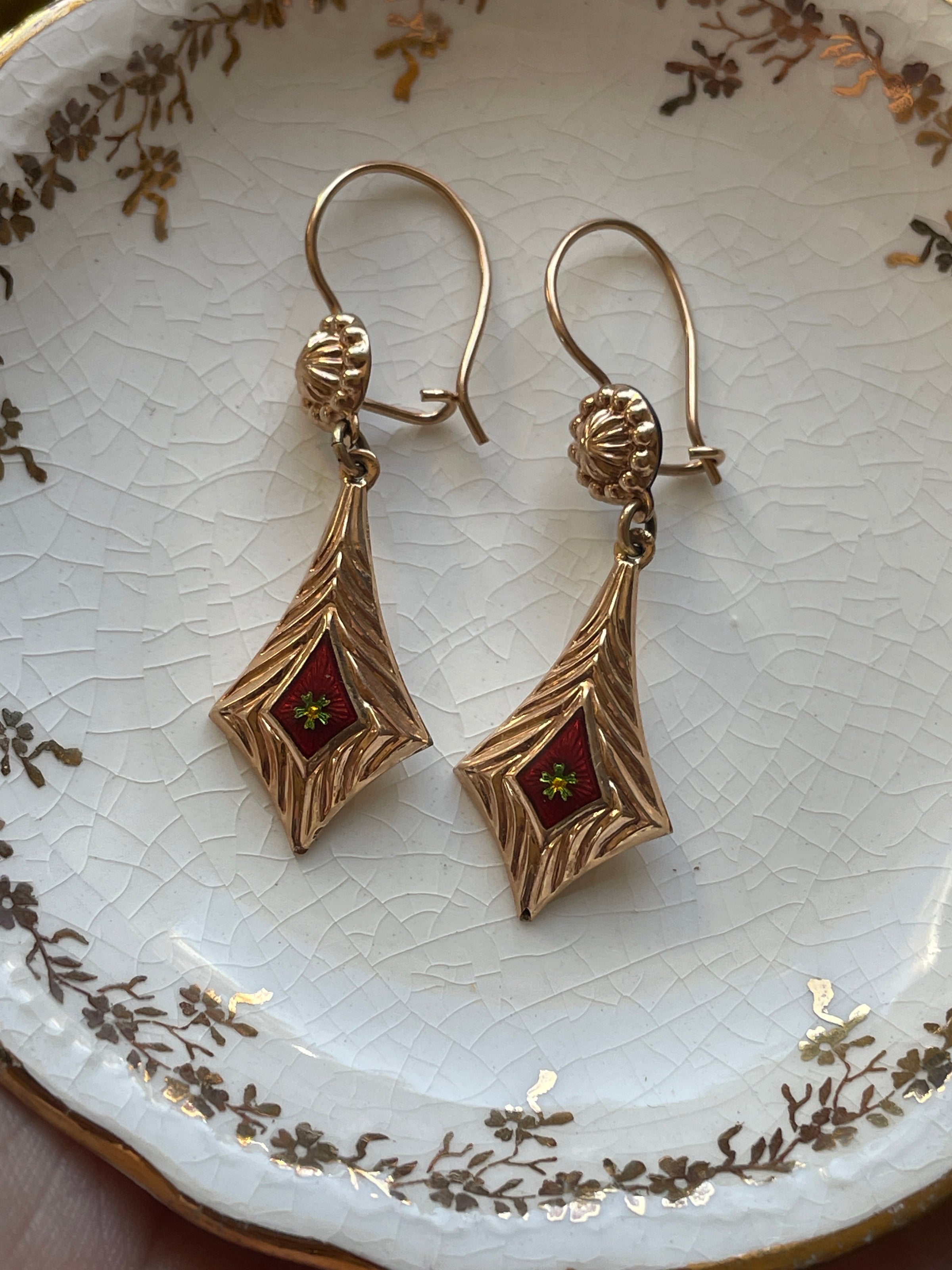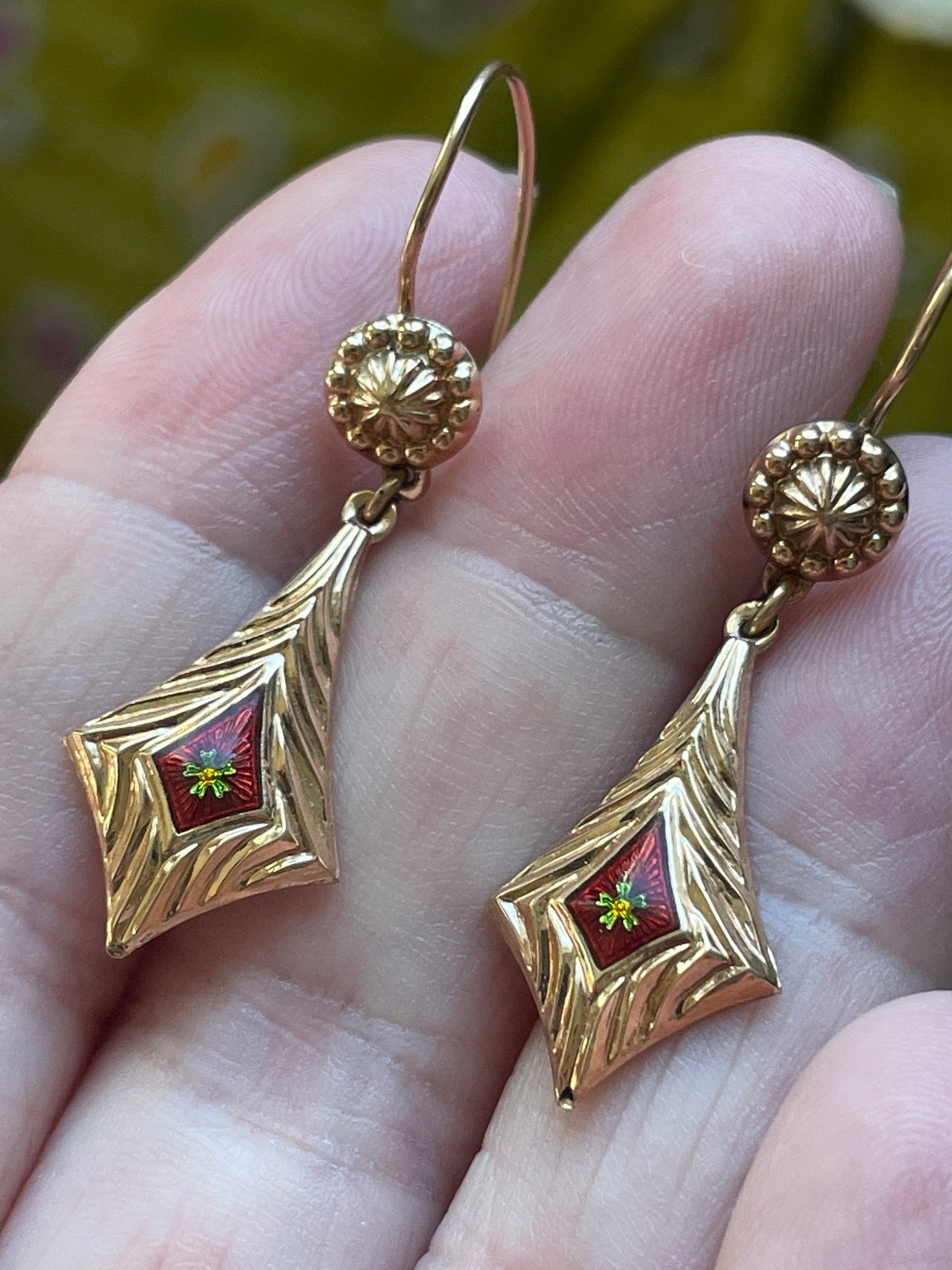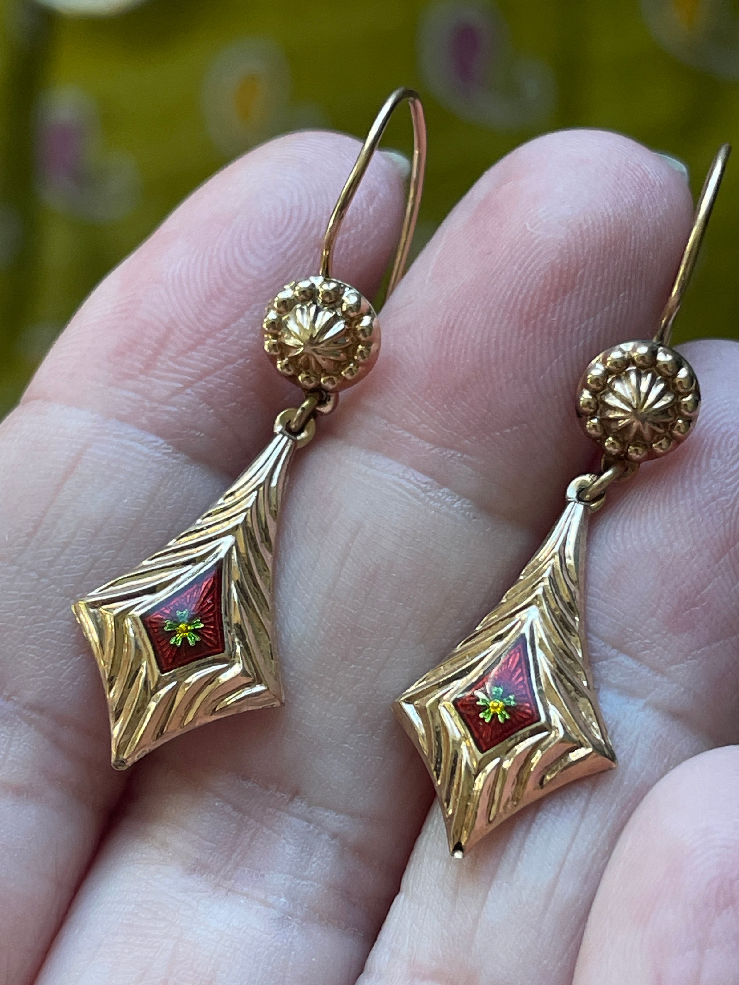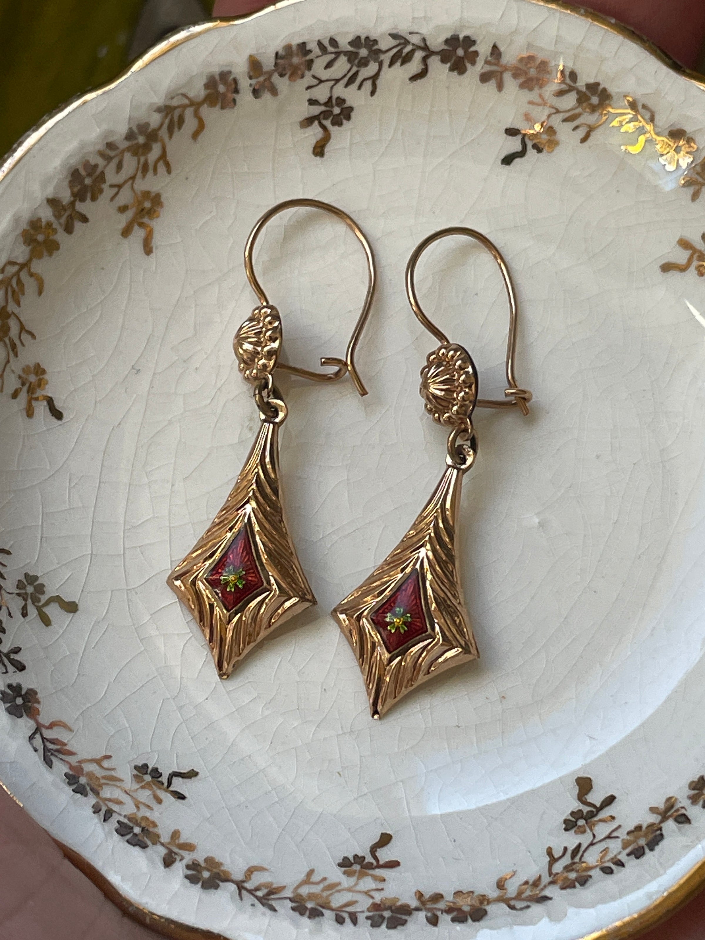 Stunning vintage 14k gold drop earrings with red enamel and green enamel flowers. Lovely ridged effect on drop. Top has an Etruscan like round design. All parts tested 14k. Drops are stamped. Measures 1.5 inches.