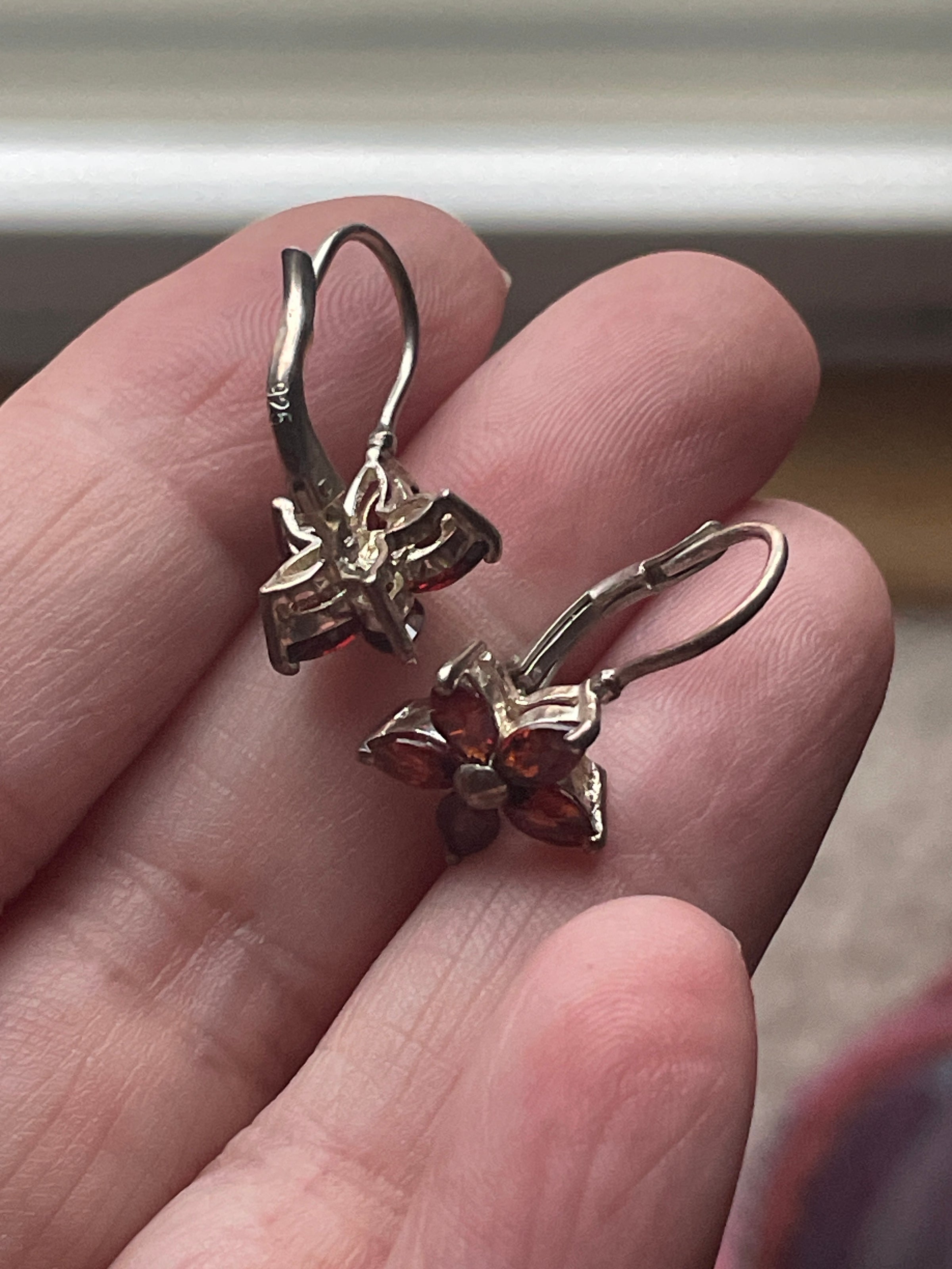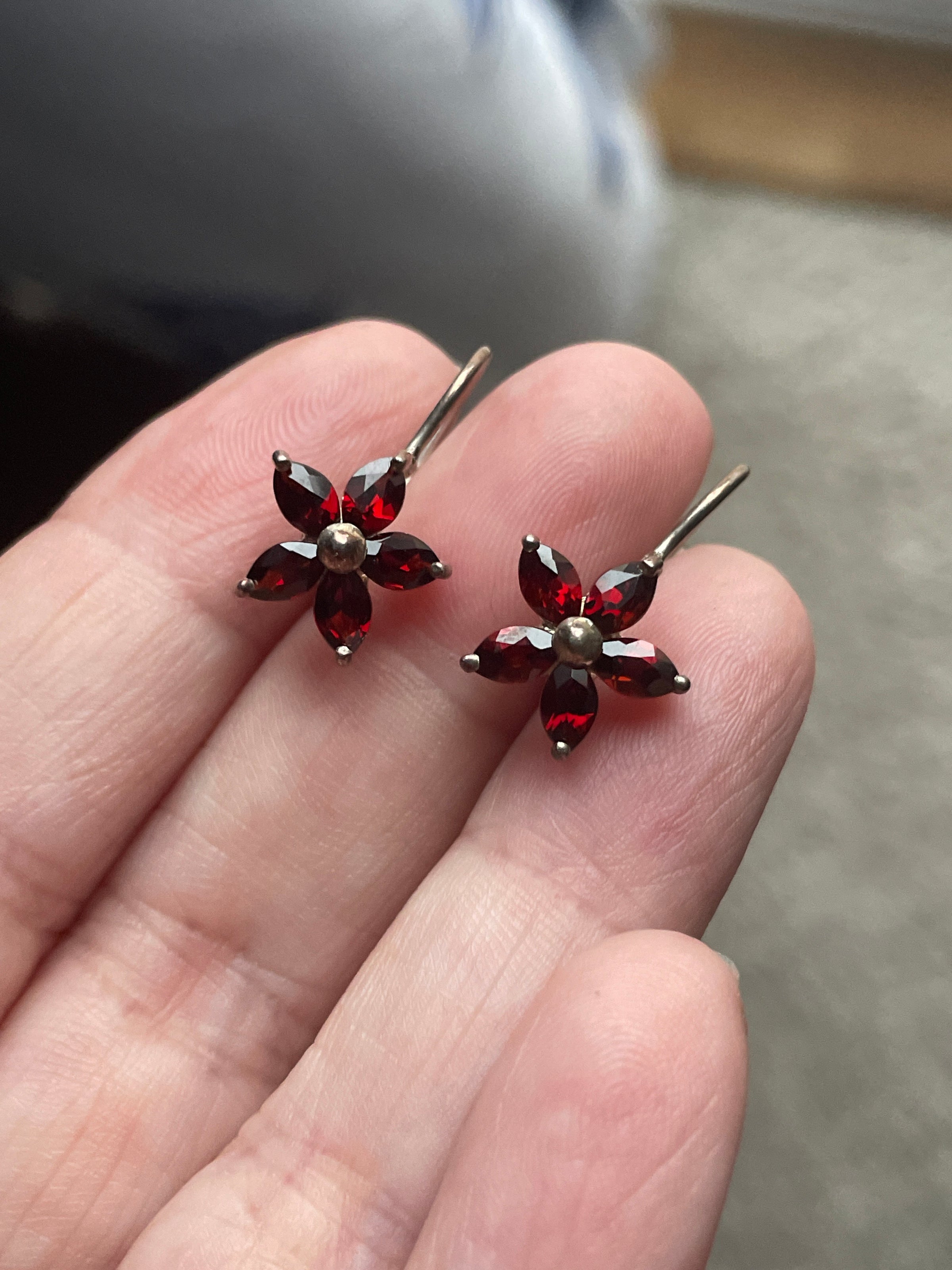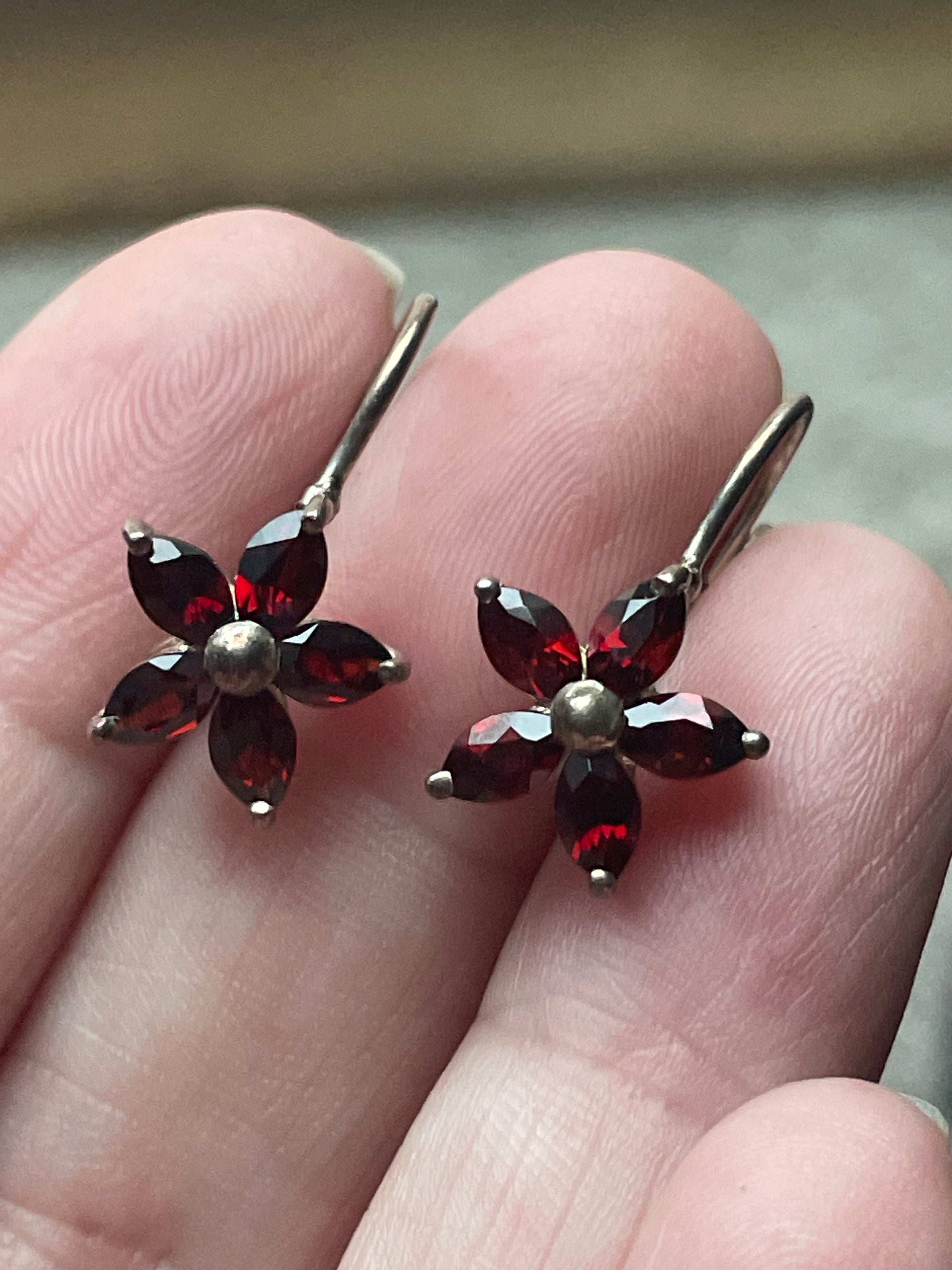Beautiful vintage Garnet Flower earrings in sterling silver. These measure approx 0.75 inches. They have leverback earwires. Stamped 925 on leverbacks.