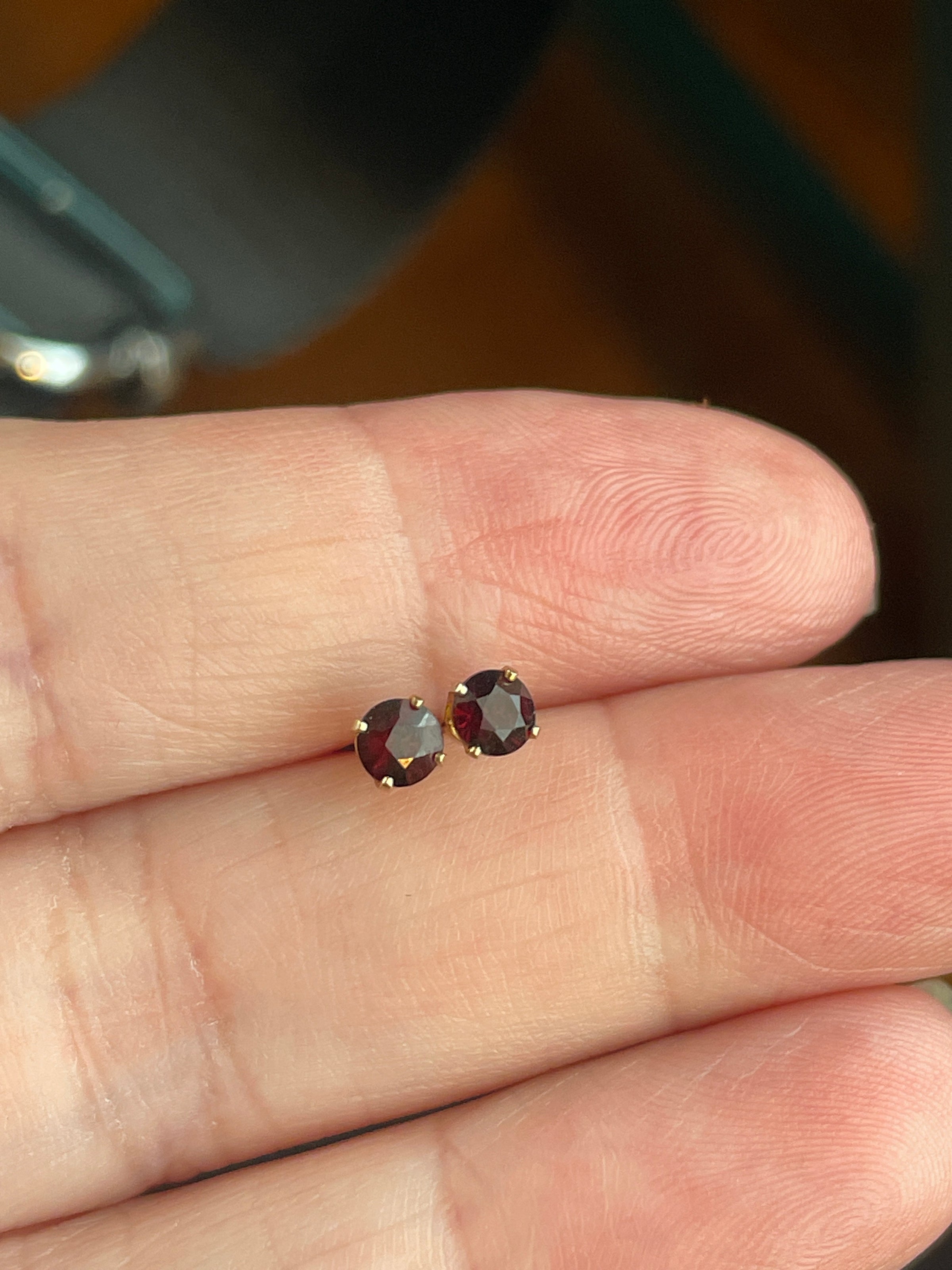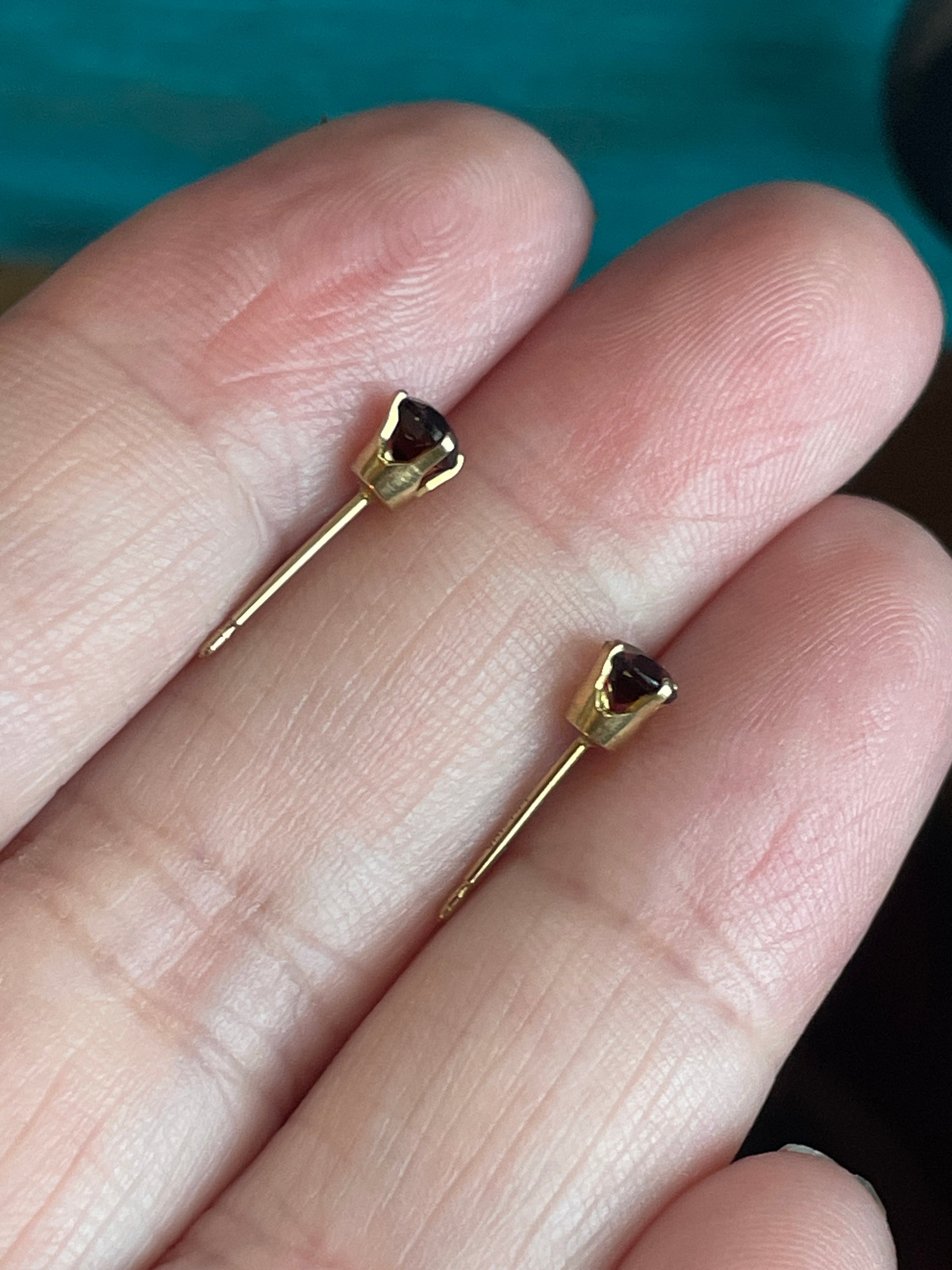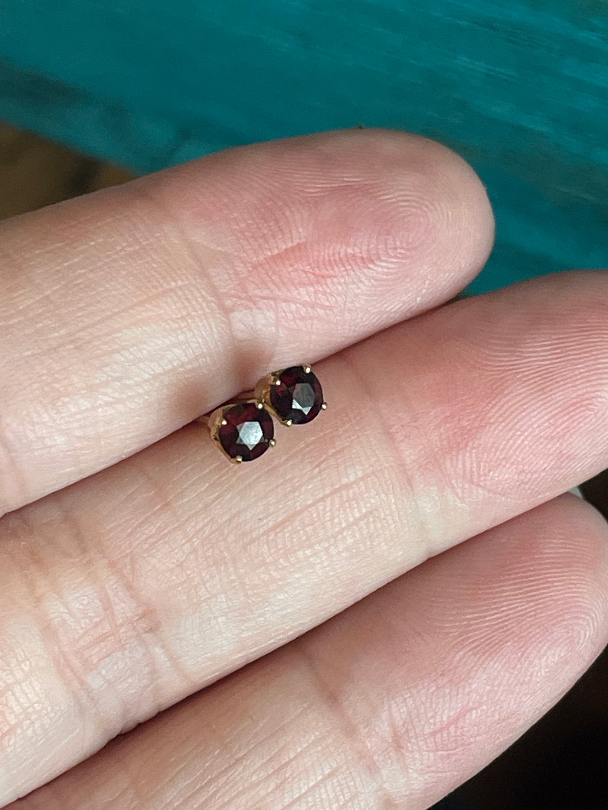 Gorgeous deep wine colored Garnet stud earrings in 10k gold. These are approx 3mm. Posts and backs stamped 10k.