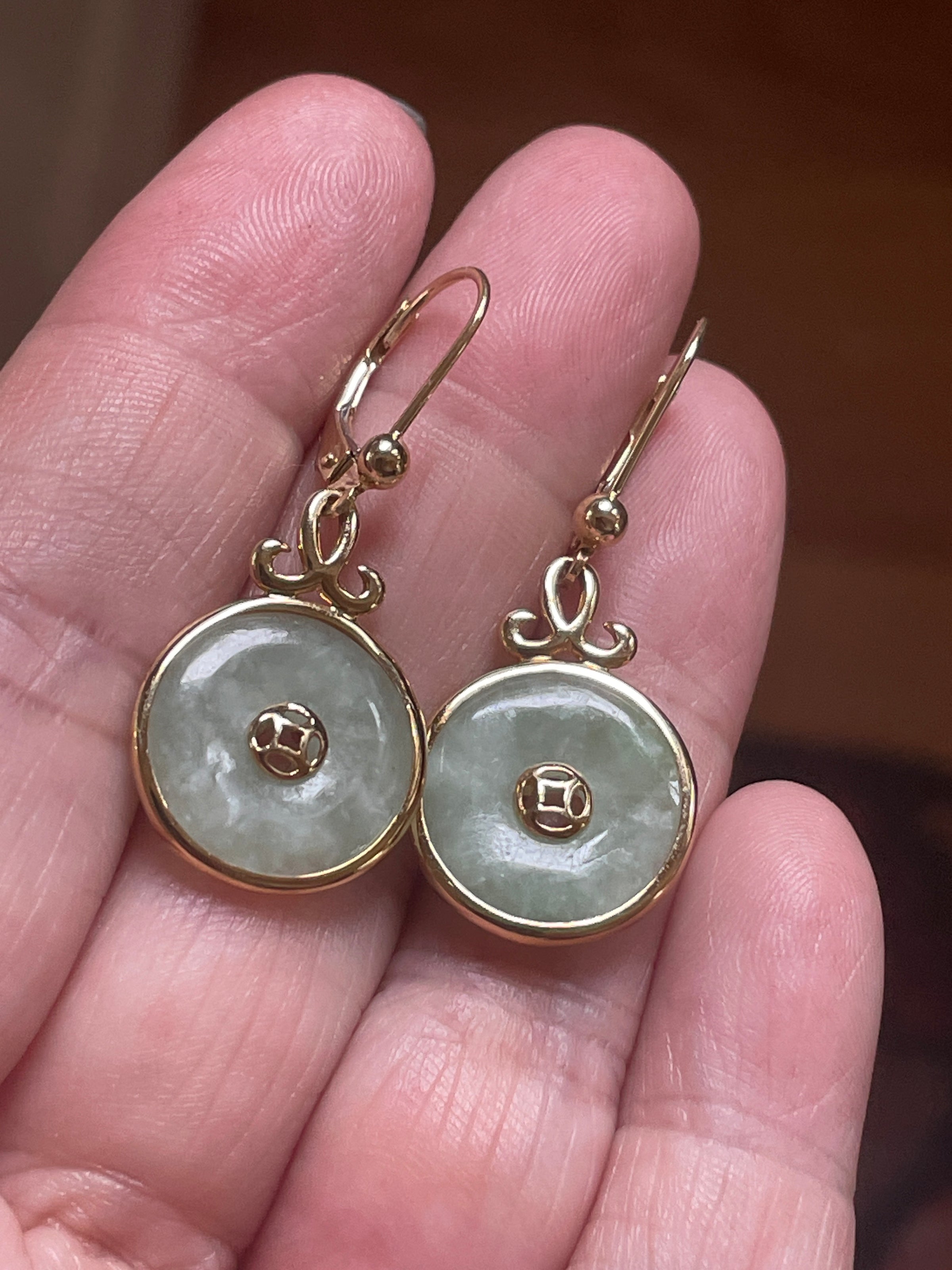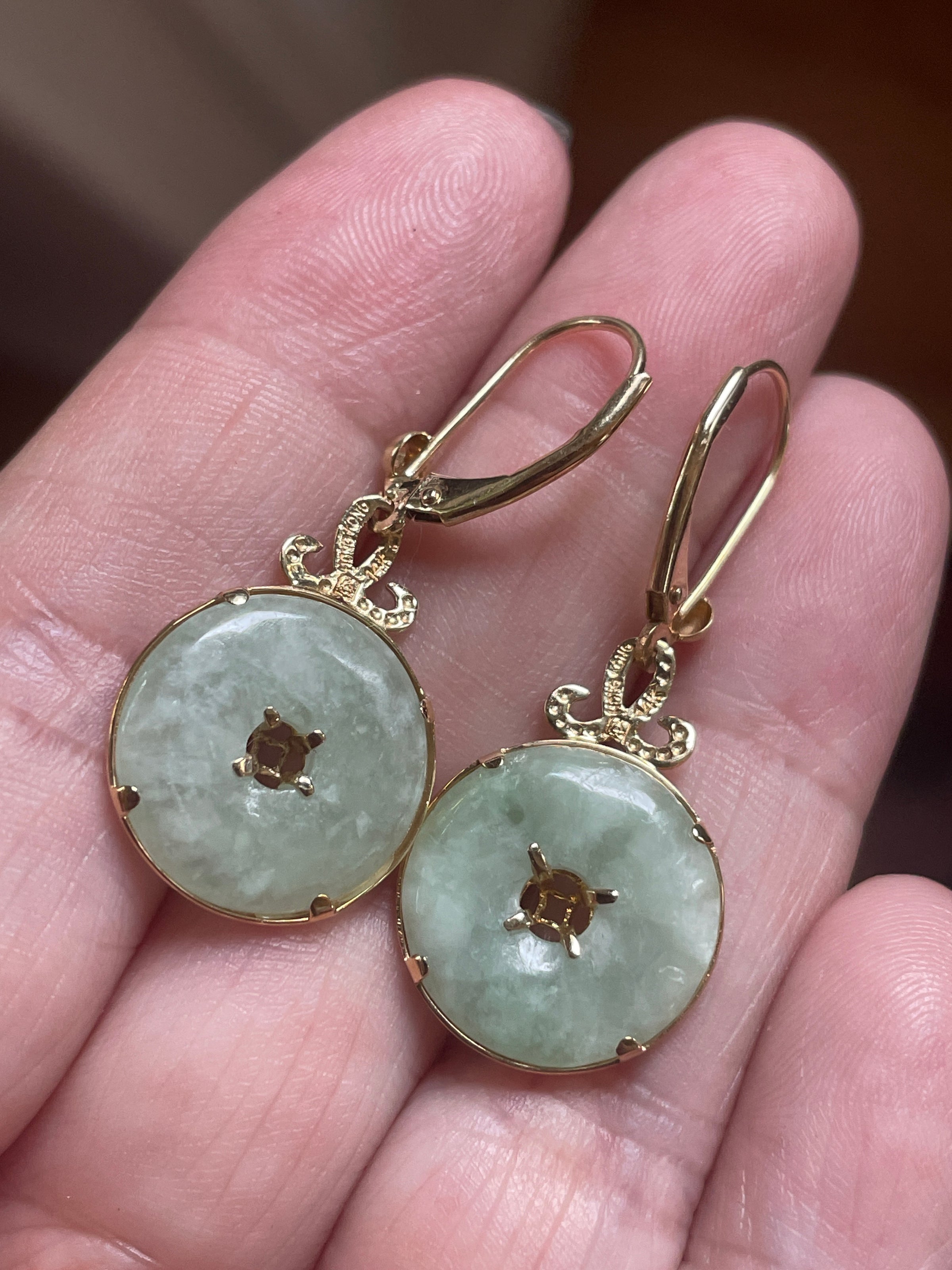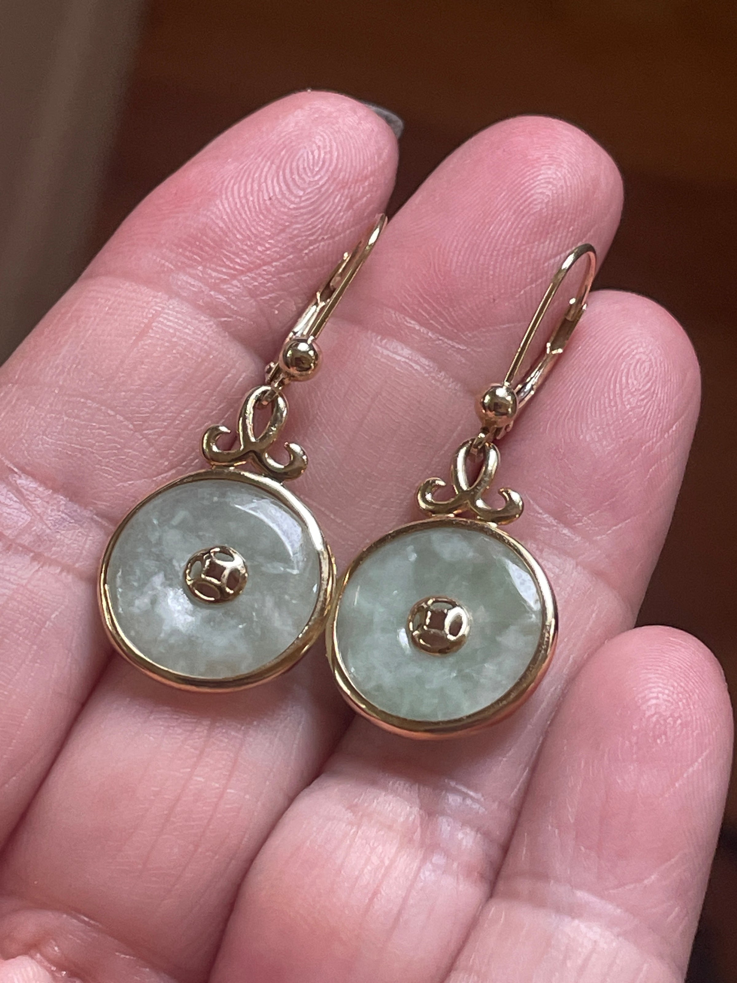 Fabulous vintage Jade drop earrings in 14k gold.  These measure approx 1.25 inches.  Stamped 14k.  Luminous and lovely for daily wear.