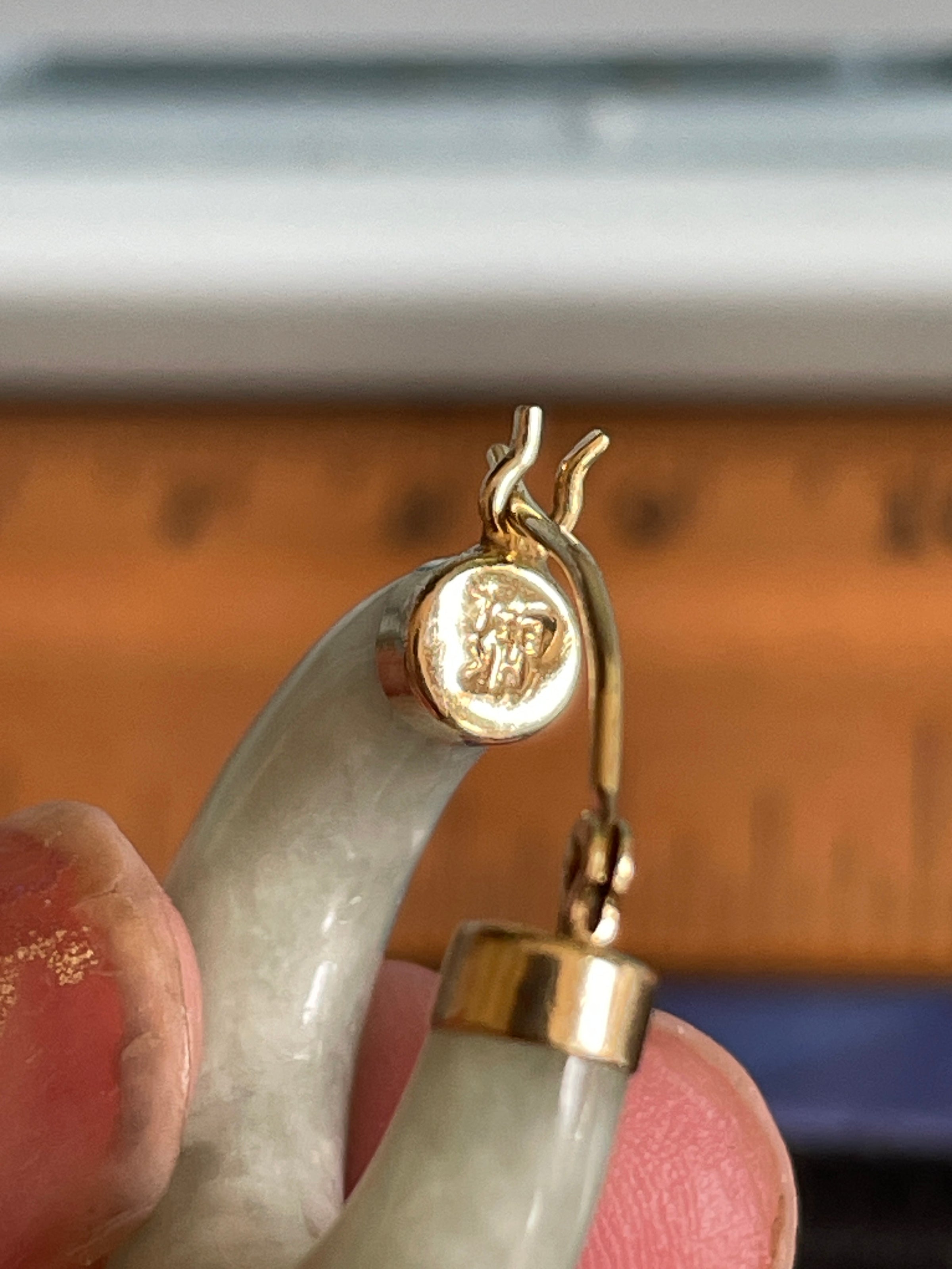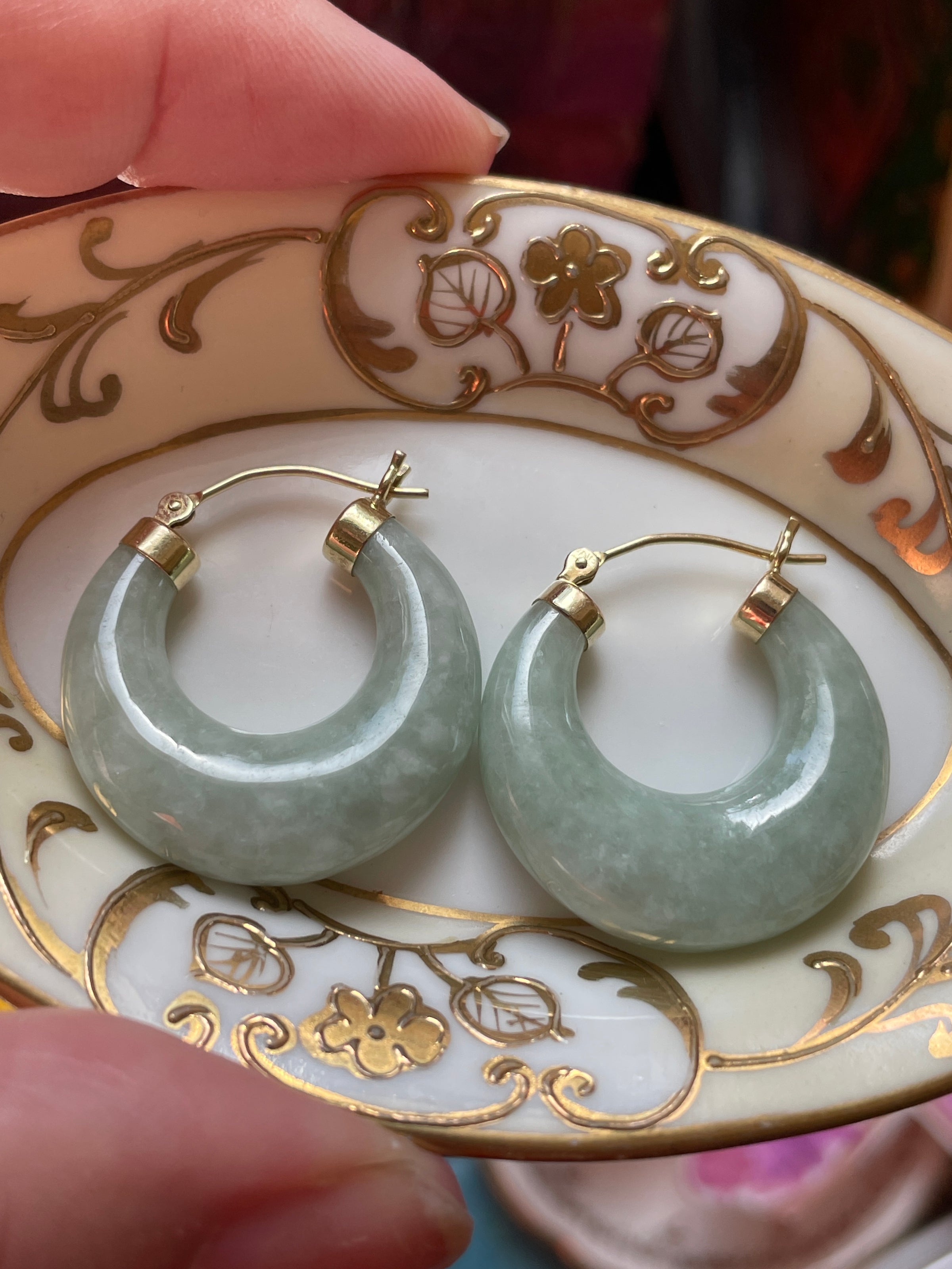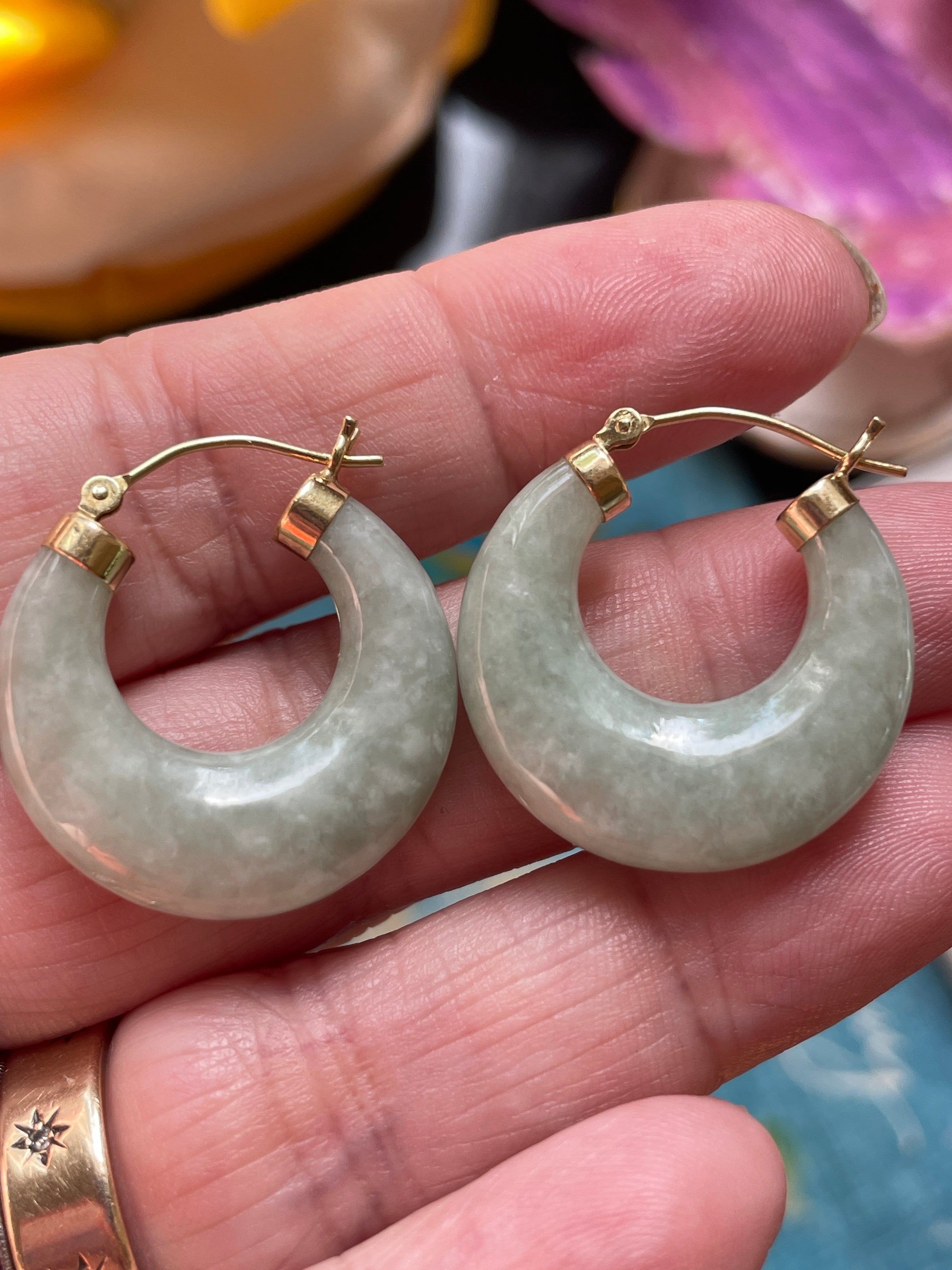 Fabulous large natural Jade earrings set in 14k gold. These measure just under 1 inch. Stamped 14k on earring end caps.
