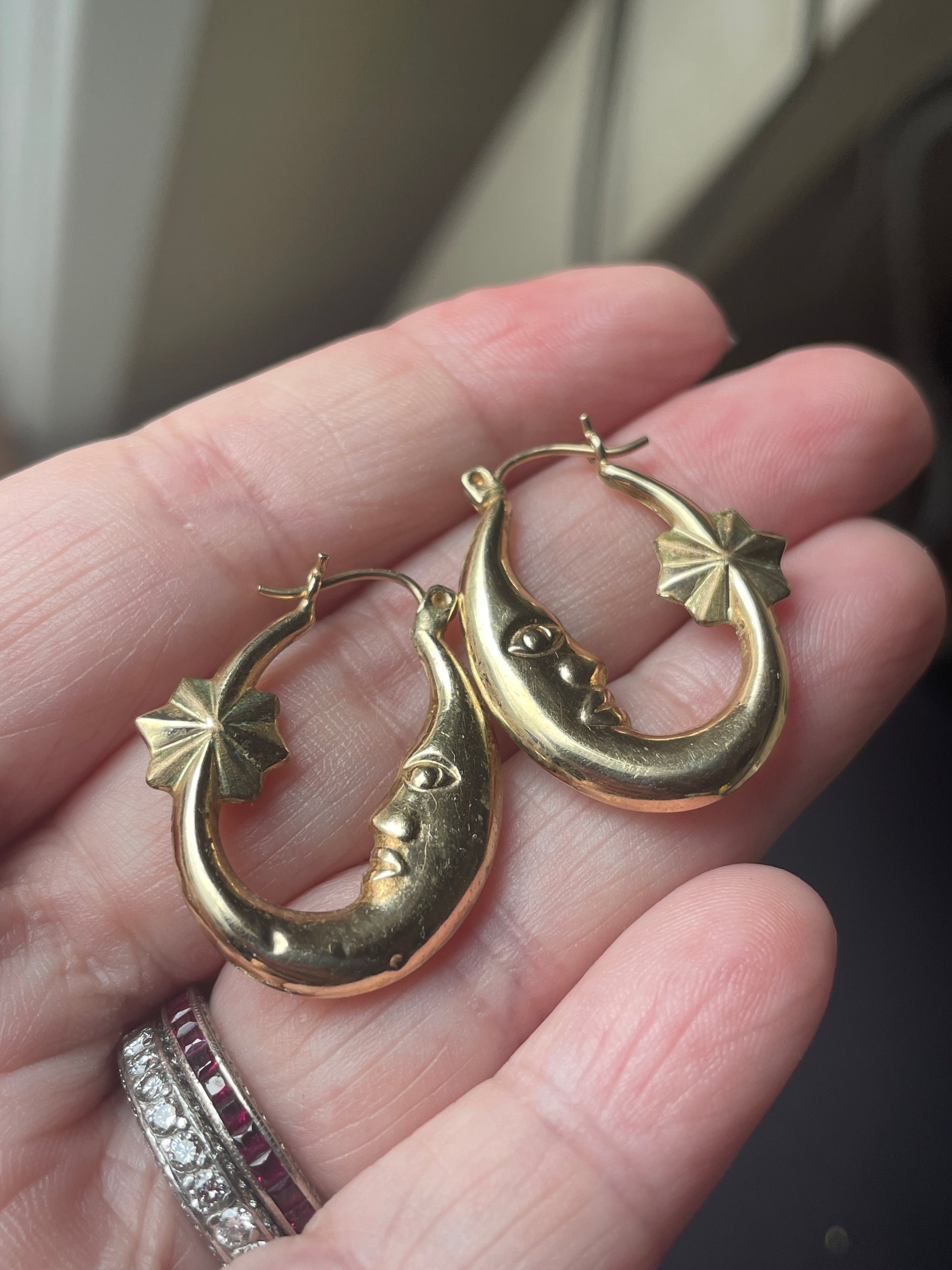 Fabulous large Moon Star hoop earrings in 10k gold. They do have some wear so price reflects (one has a few dings on one side). The other has a bit of wear but patterned on both sides so can flip it. They measure just over 1 inch x 0.75 inches. Stamped 10k on earwires.