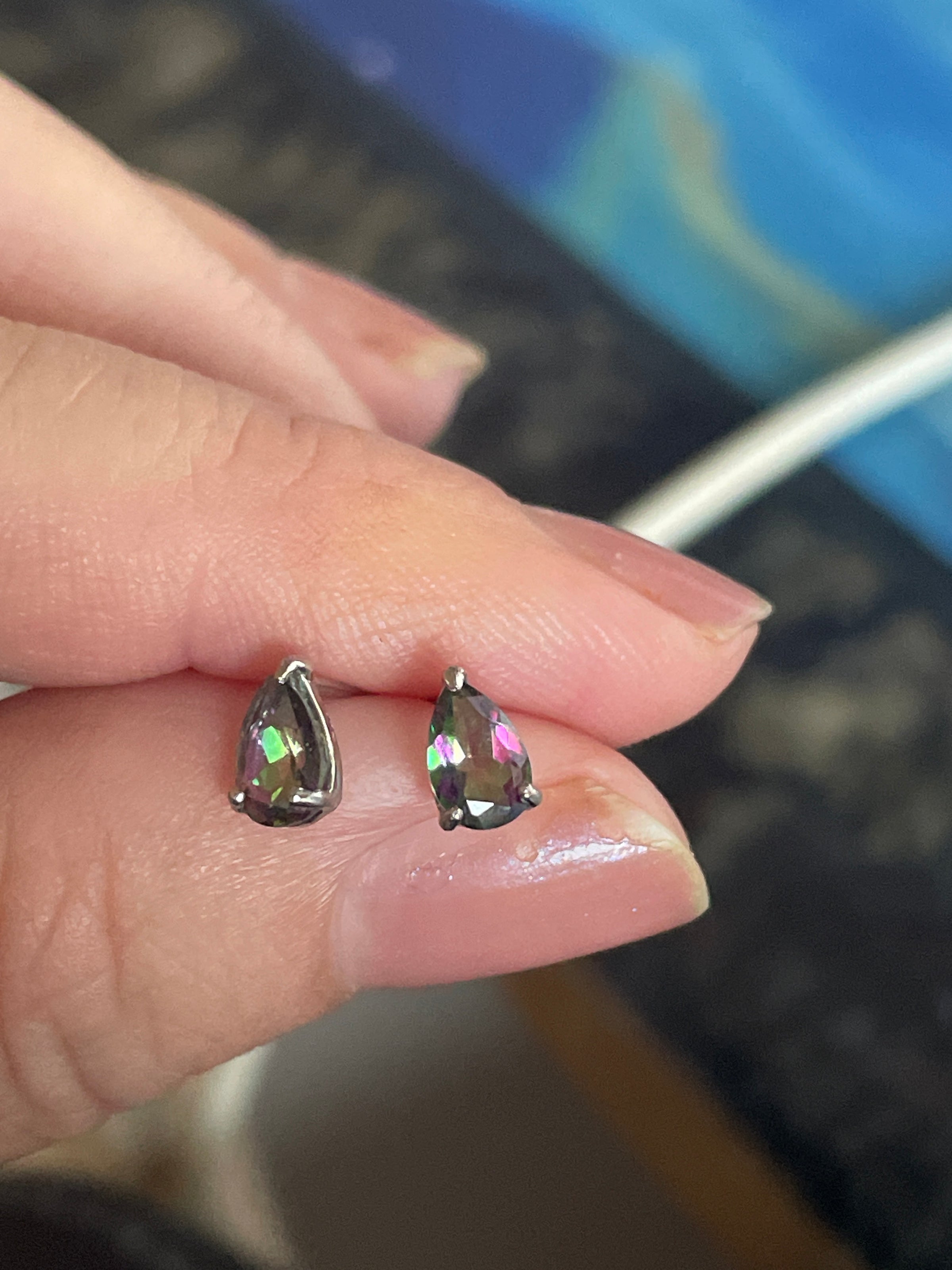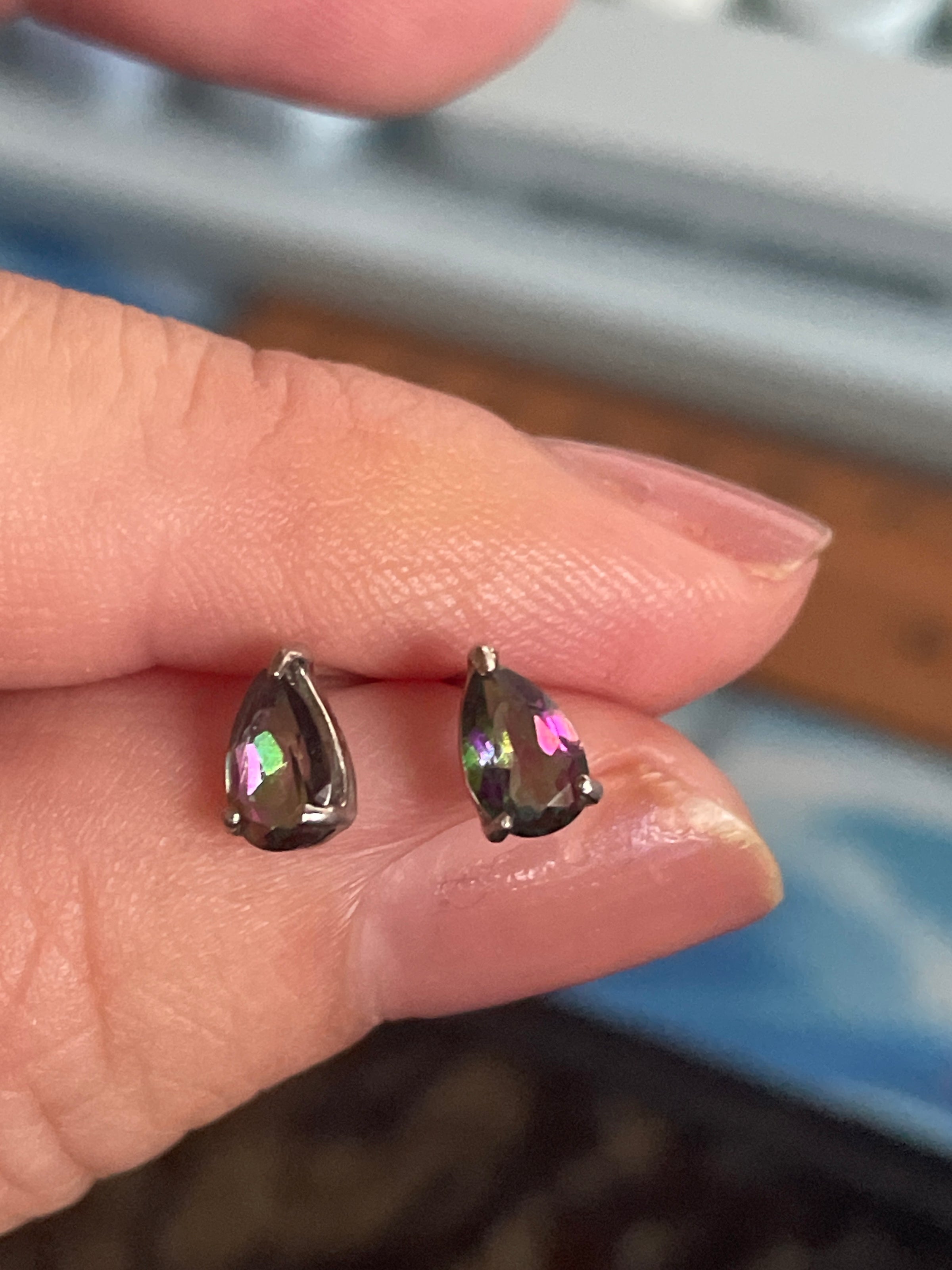 Gorgeous firey Mystic Topaz teardrop stud earrings in 10k white gold. These measure approx 6mm x 4mm. Tested 10k.