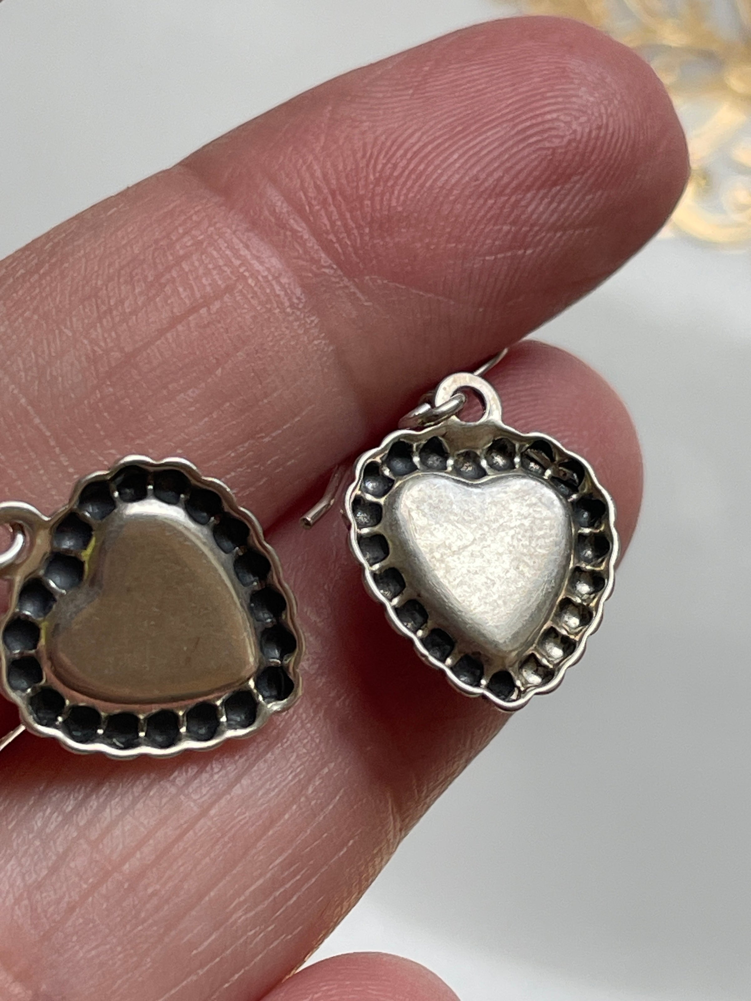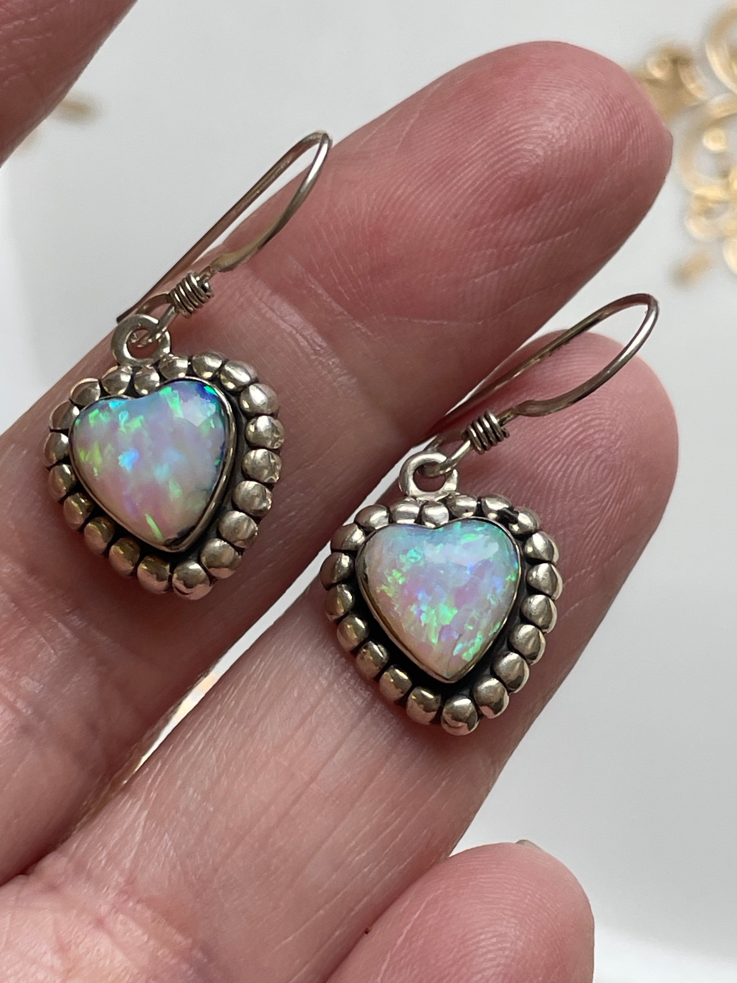 Gorgeous vintage Opal heart earrings in sterling silver. Opal likely manmade. Lovely detailed edges. These measure just over 1 inch with earwires. Stamped 925 on earwires.