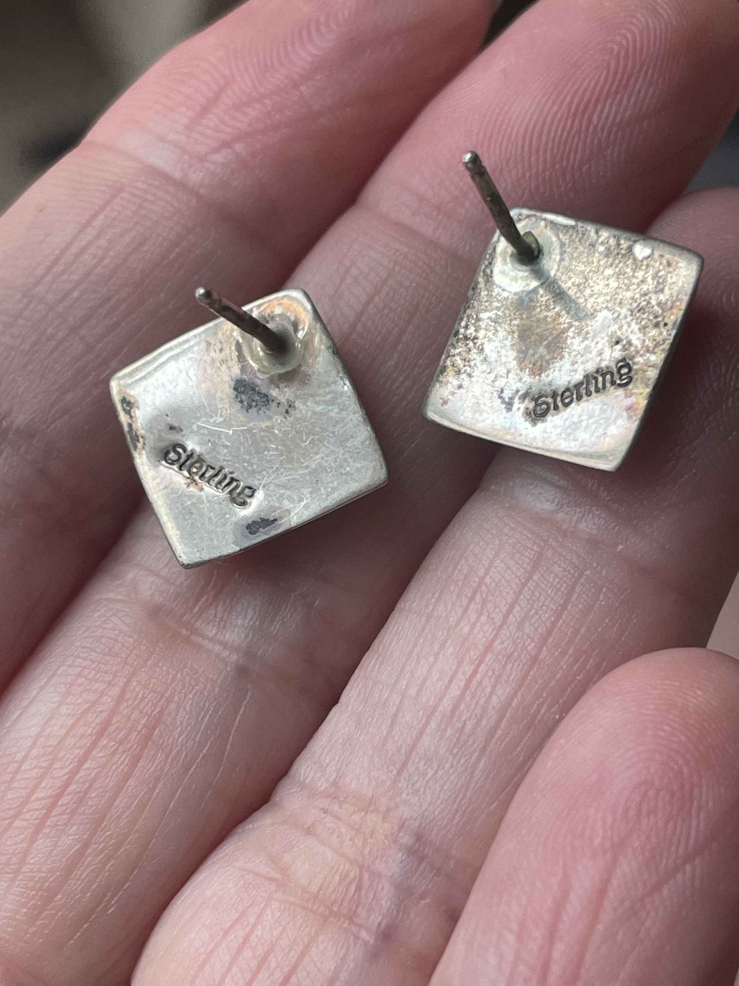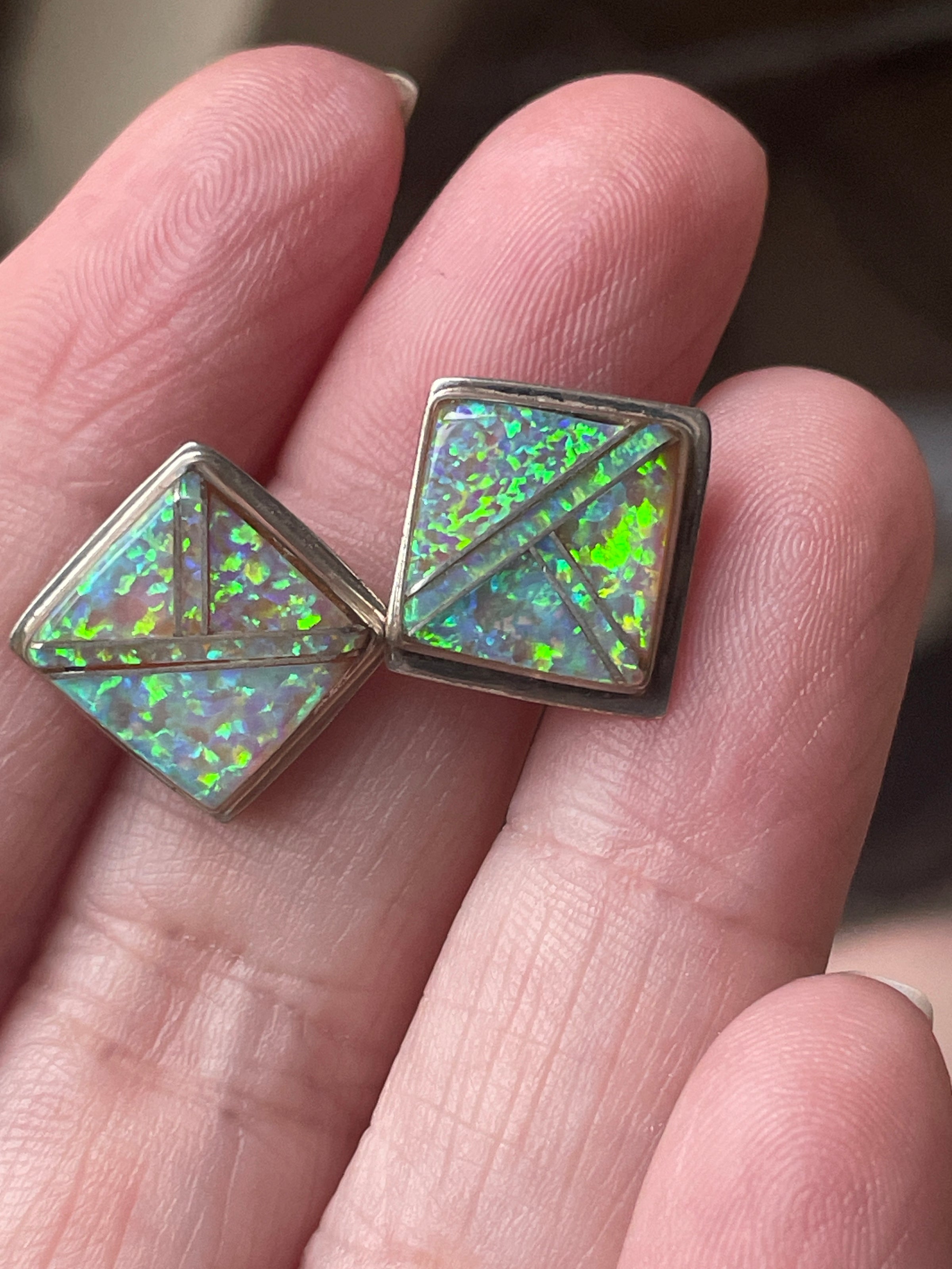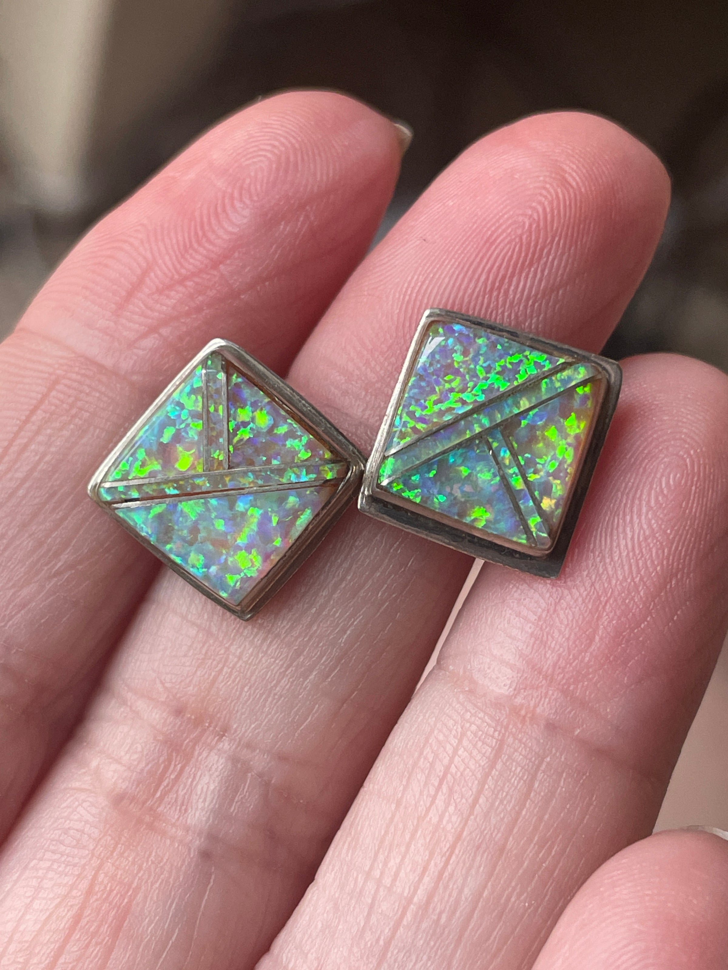 Fabulous Opal inlay stud earrings in sterling silver. Opal likely manmade. Beautiful shimmer. They measure just over 0.5 inches. They sit on a diagonal. Stamped “Sterling “ on backs.