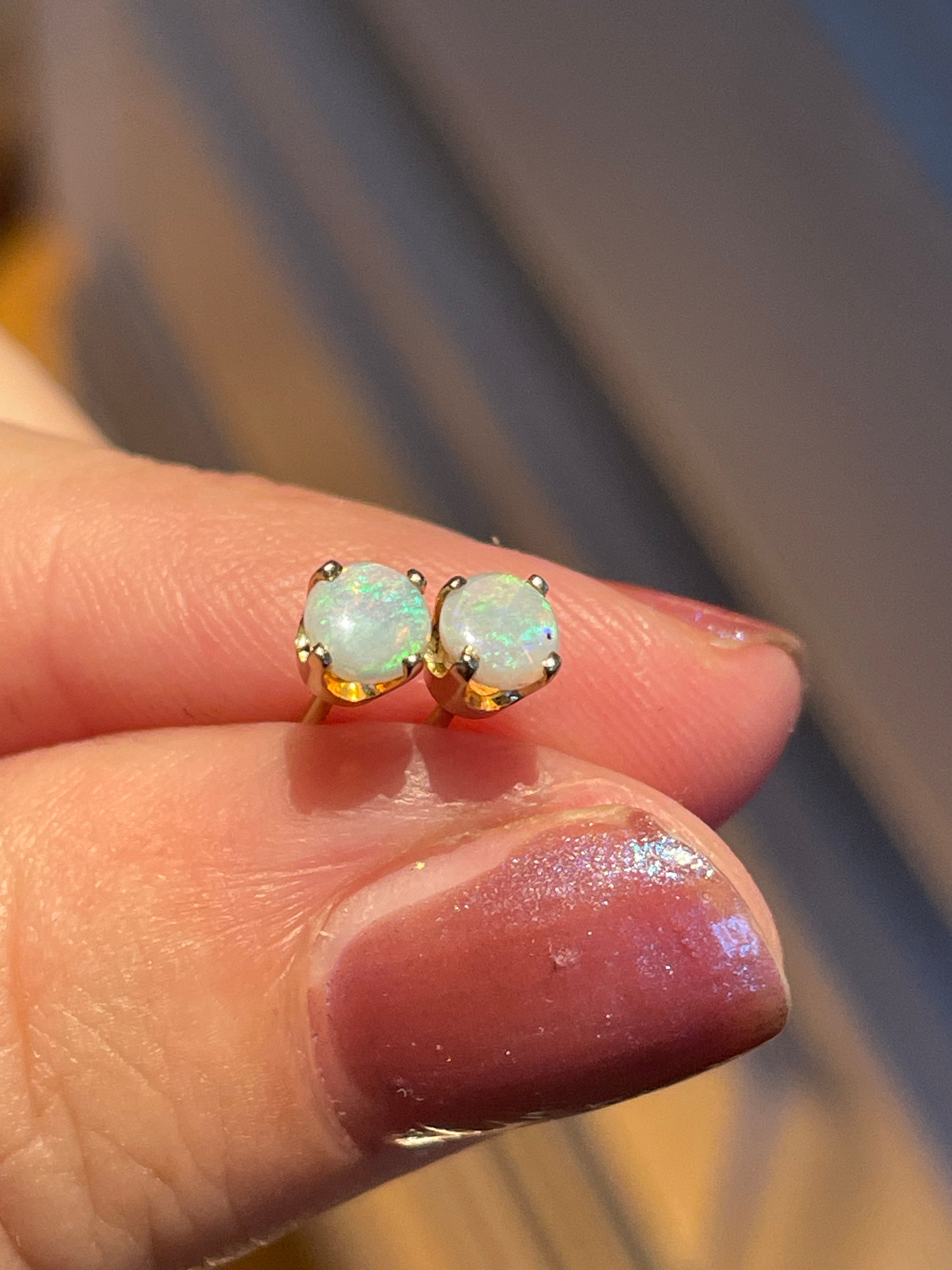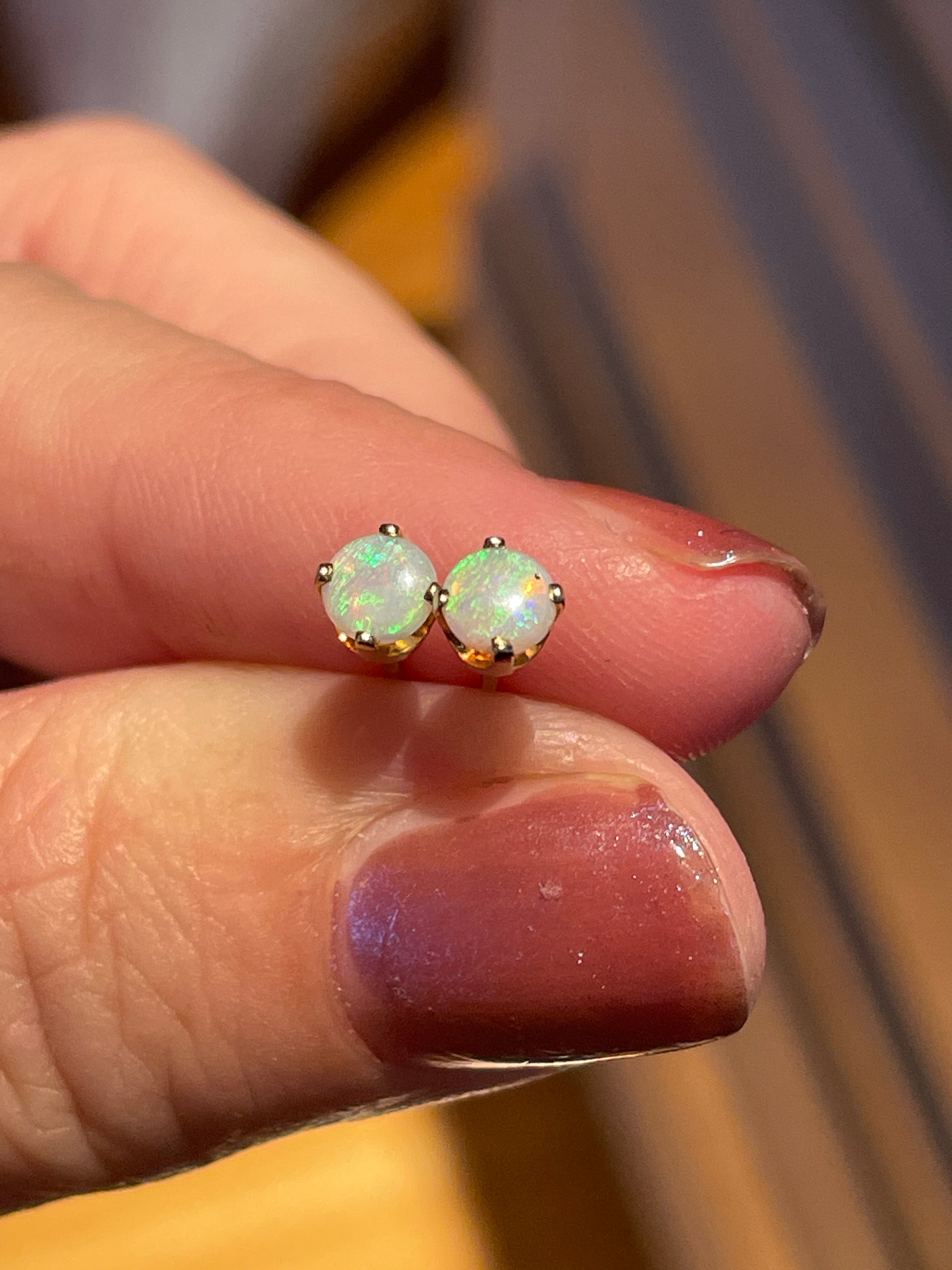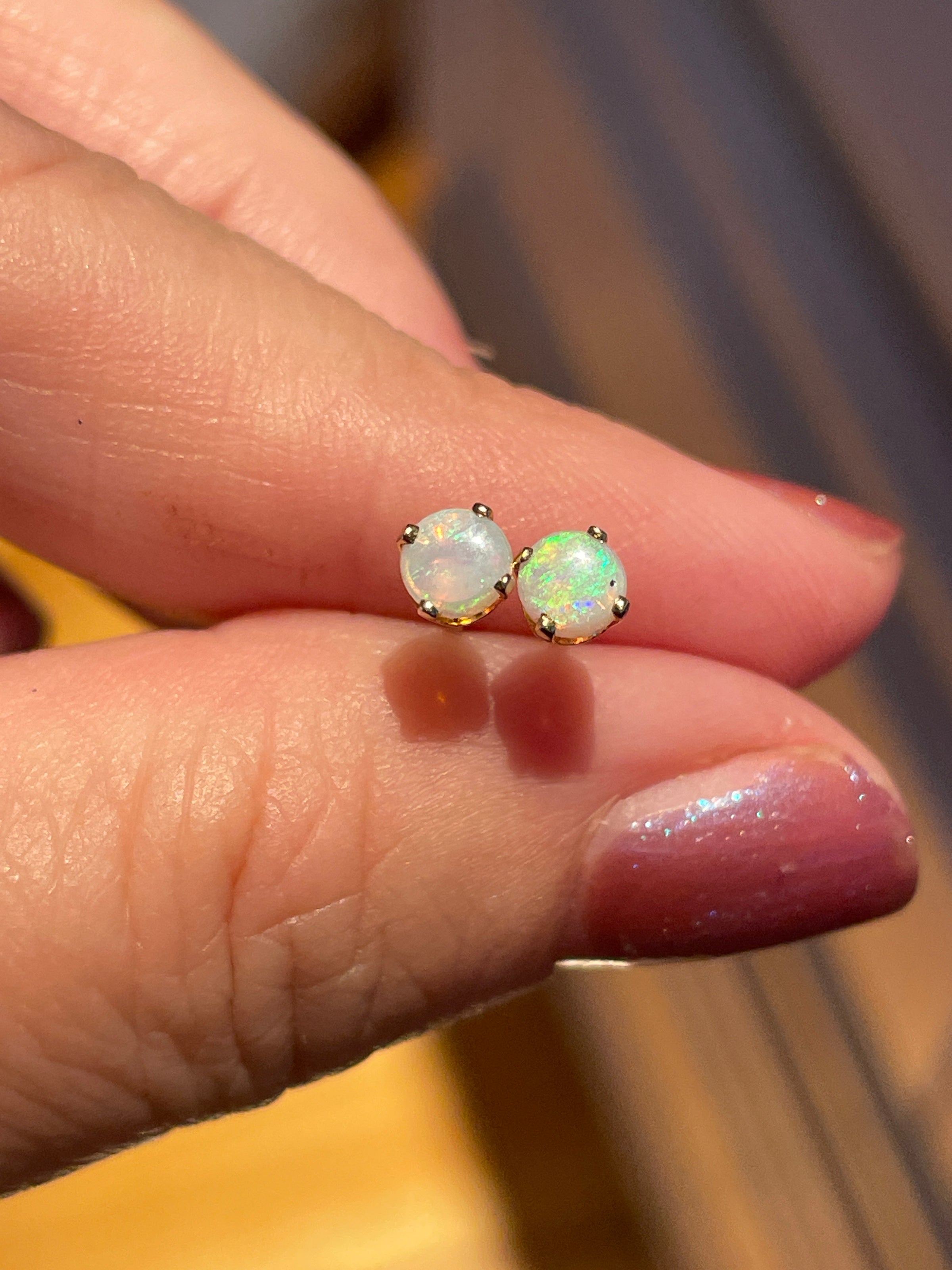 Gorgeous Opal stud earrings in 14k gold.  The Opals measure 4mm.  Very vibrant and colorful.  Stamped 14k on posts and backs.
