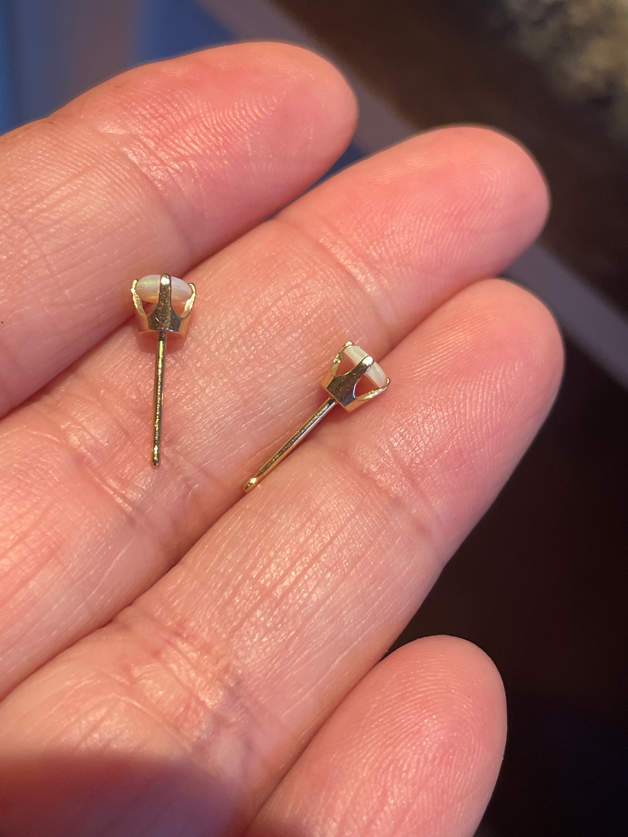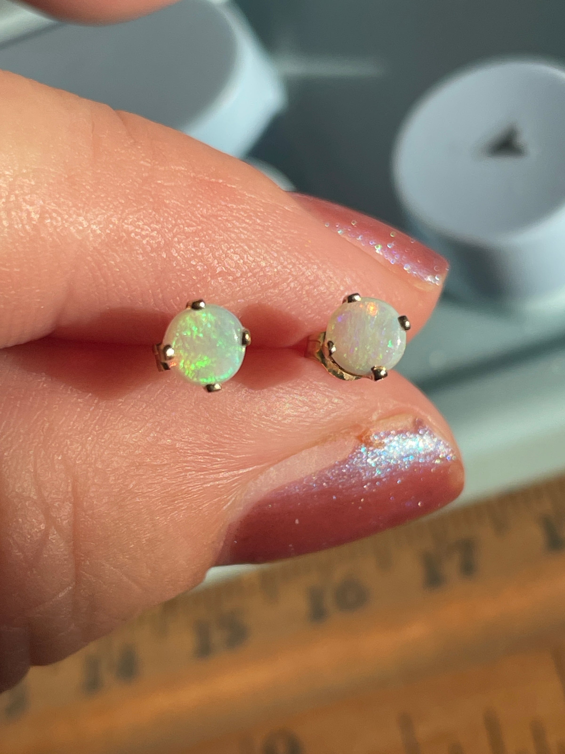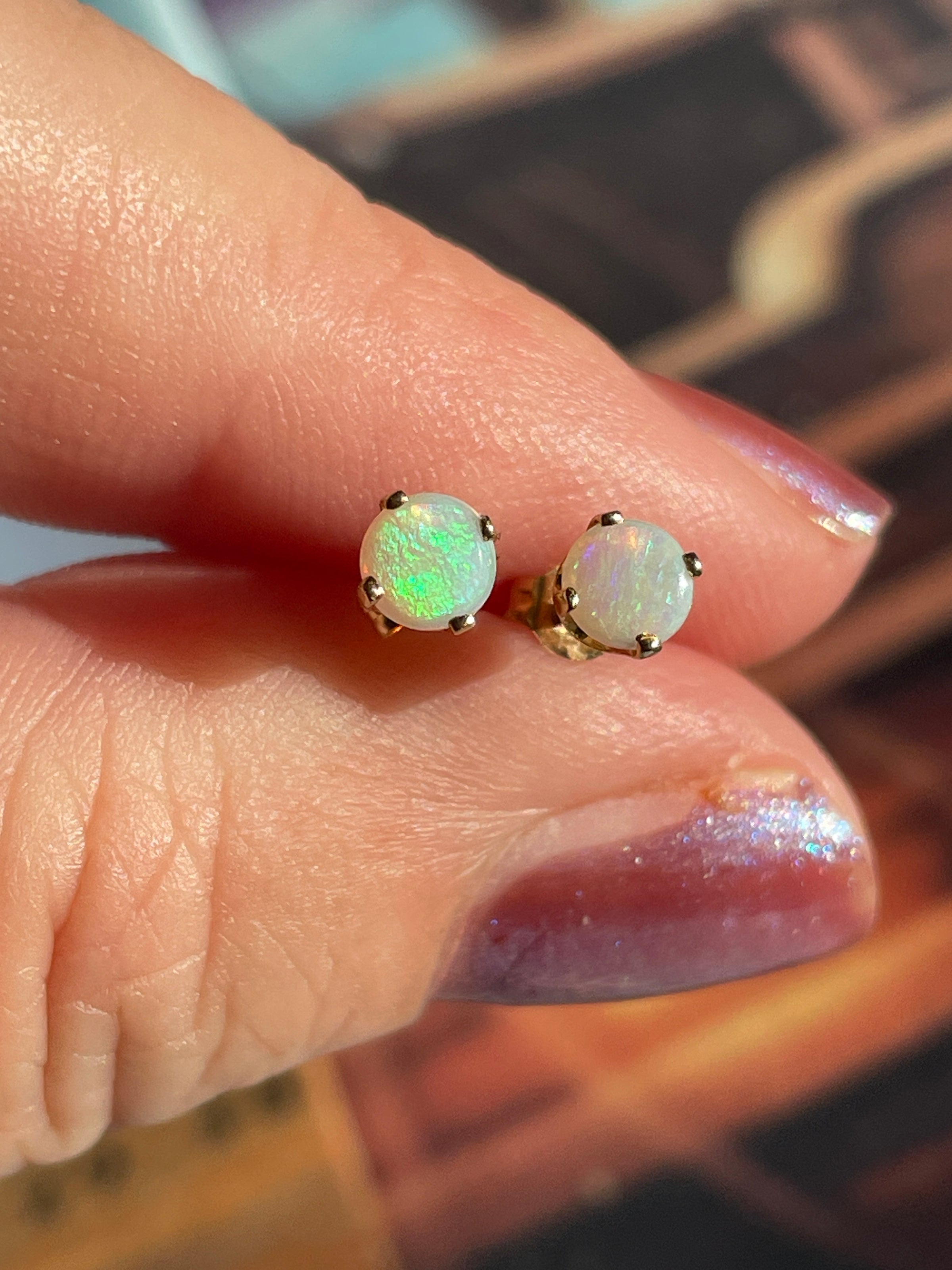 Gorgeous Opal stud earrings in 14k gold.  The Opals measure 4mm.  Very vibrant and colorful.  Stamped 14k on posts and backs.