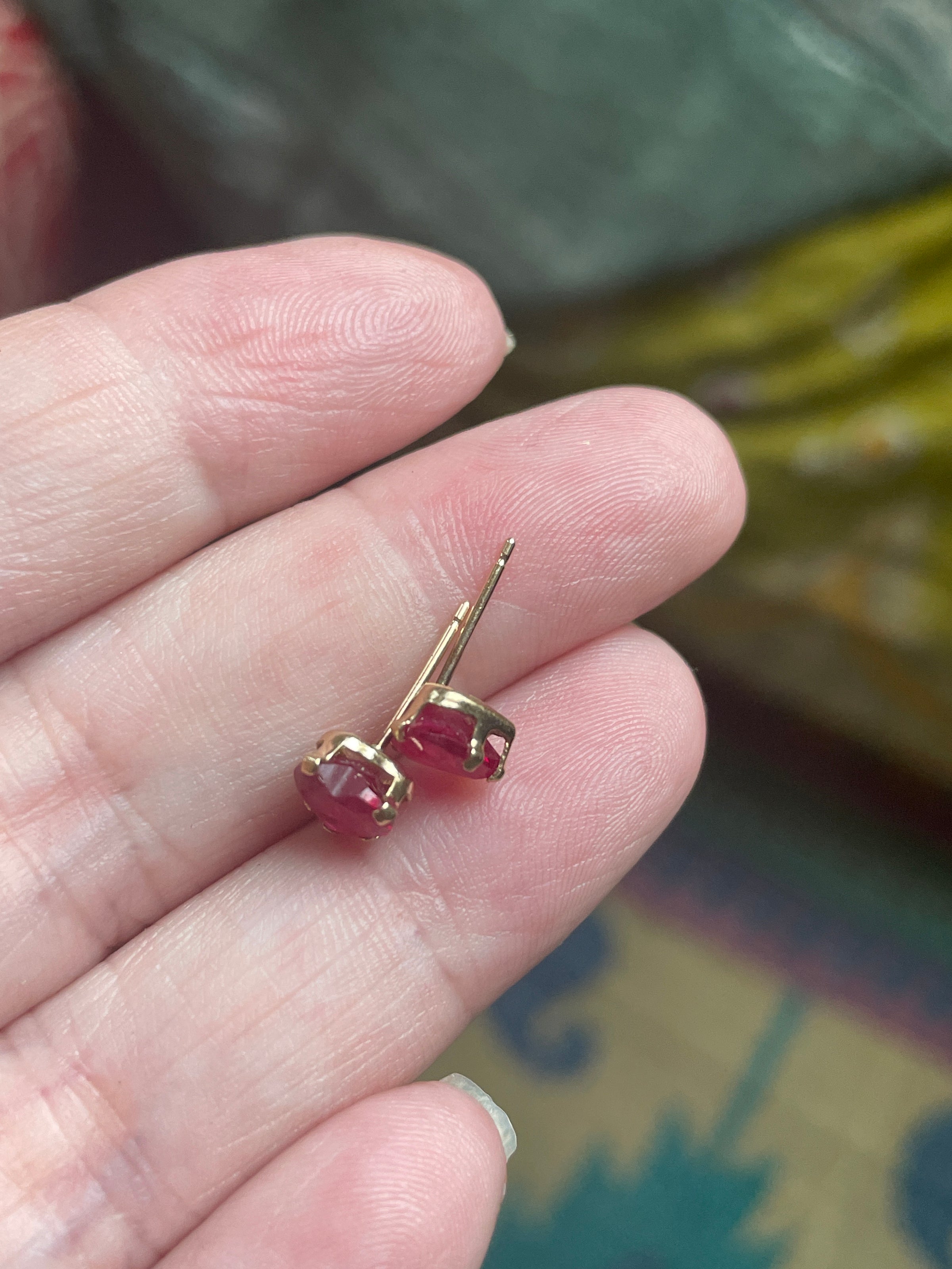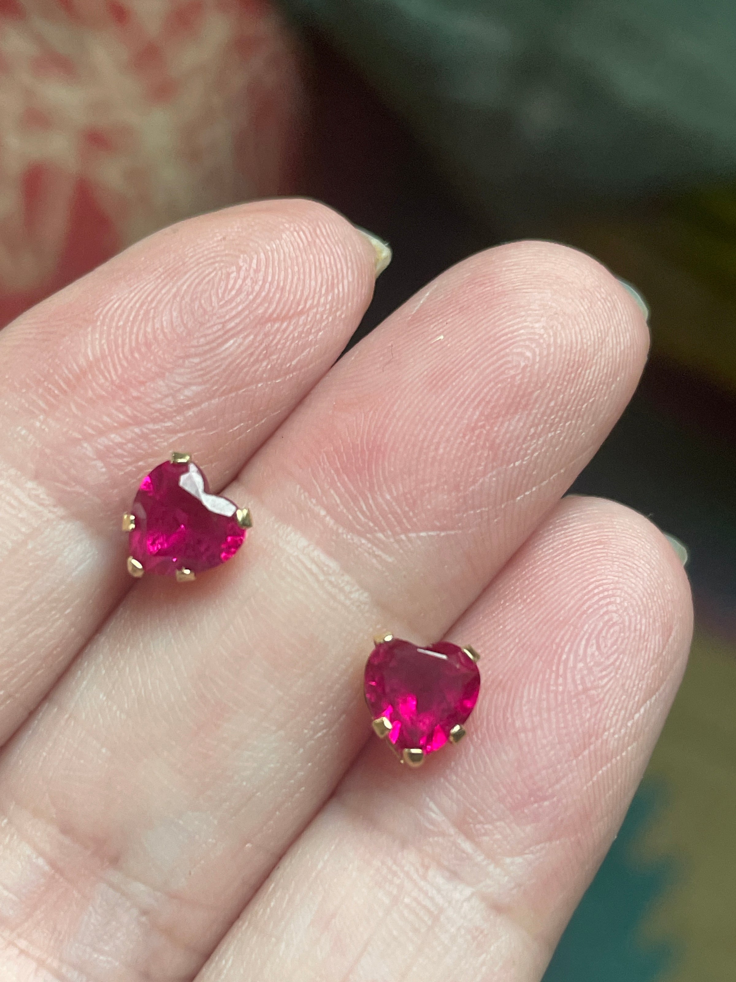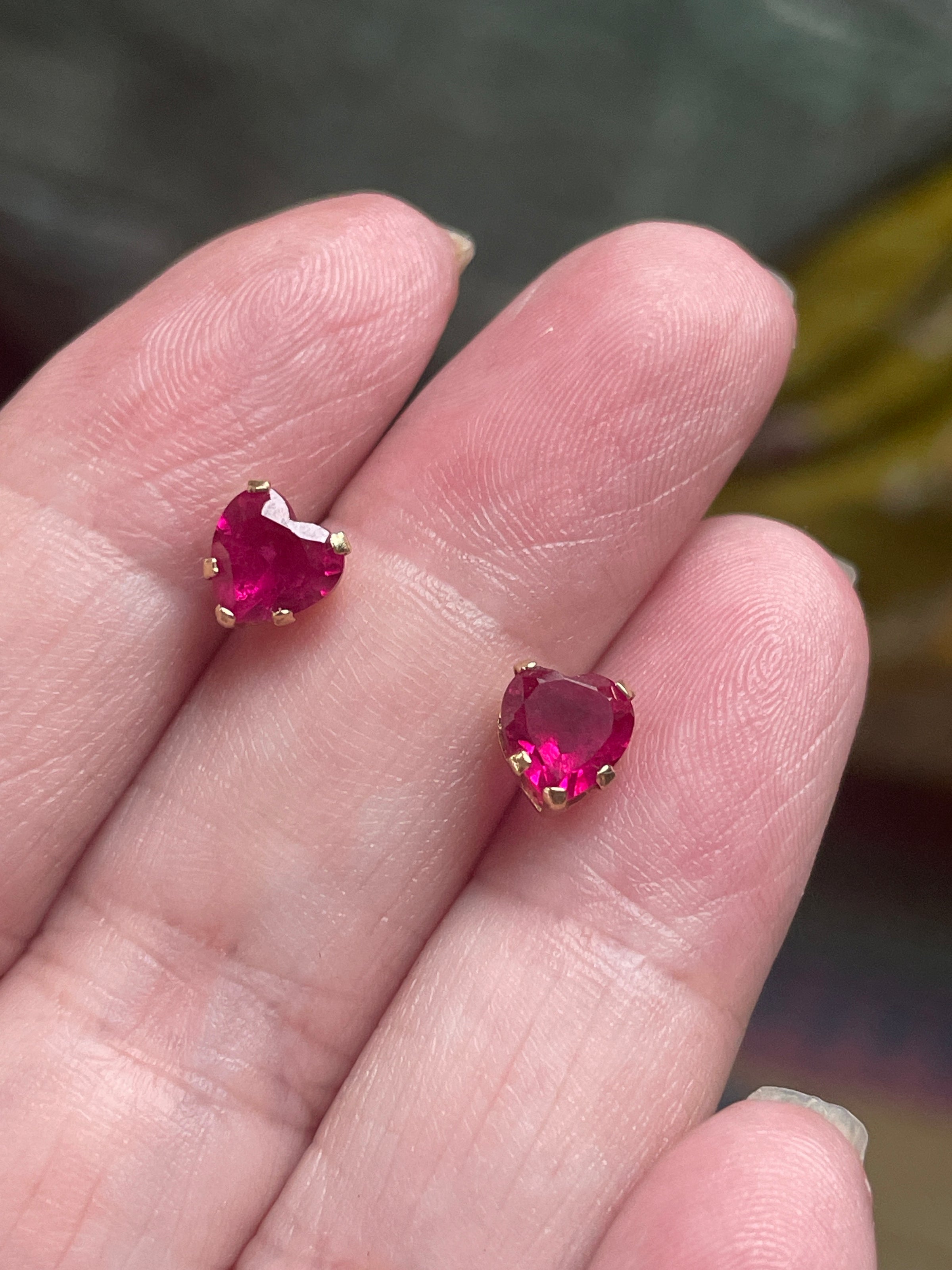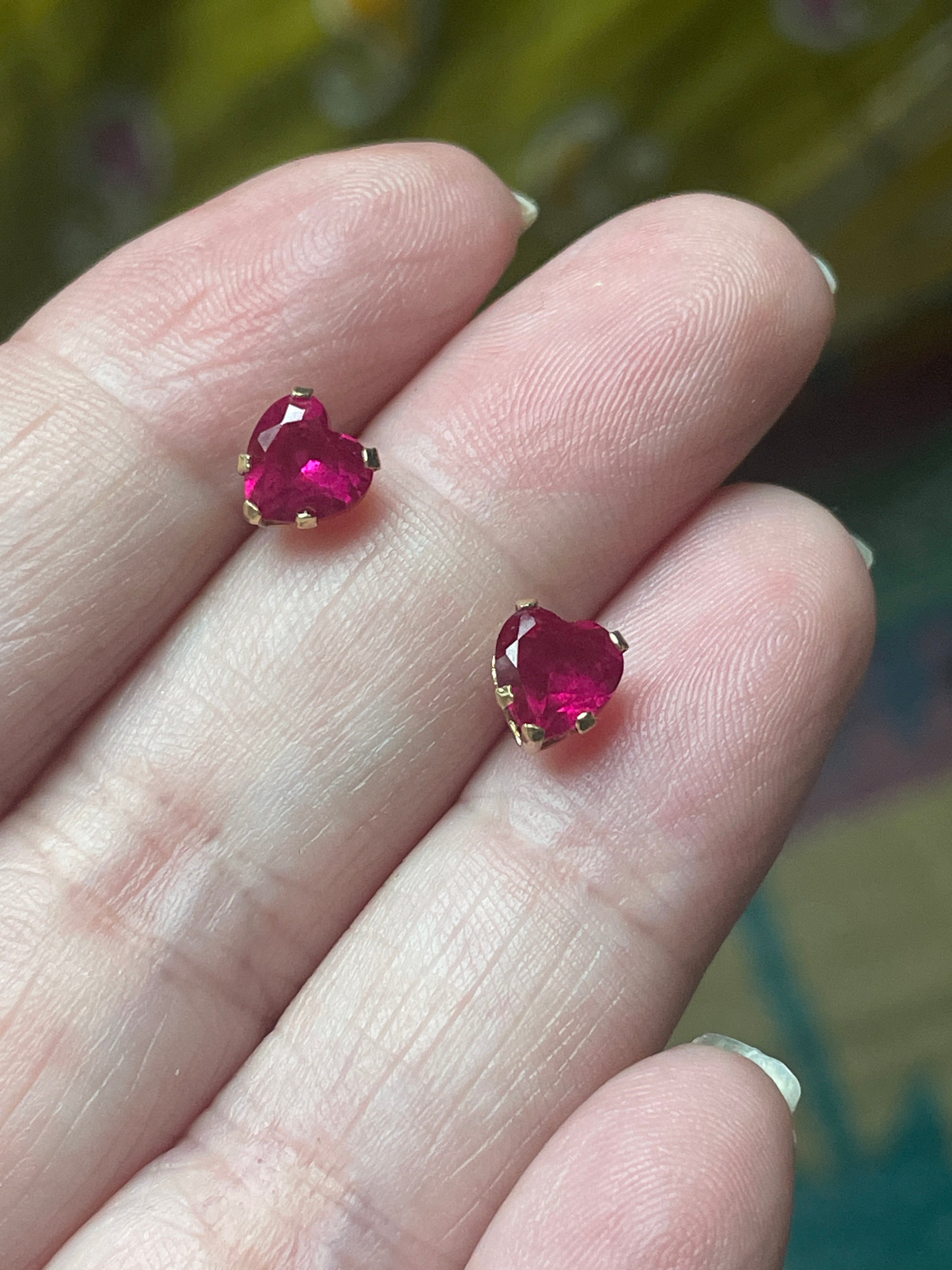 Stunning vintage Ruby heart earrings in 10k yellow gold. Hearts measure approx 6mm x 4mm. Rubies test as Rubies on gem tester but vibrance of color makes me think they are likely lab grown. Posts stamped 10k and backs stamped 14k.