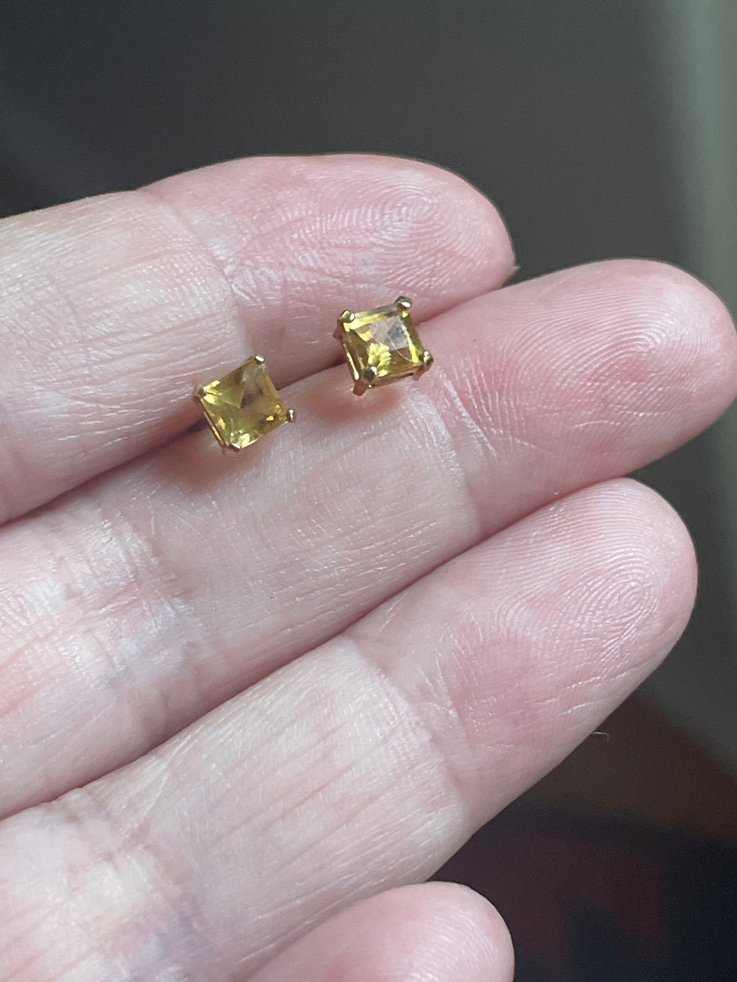 Gorgeous square cut Citrine earrings in 14k gold. These measure approx 4mm. Posts and backs stamped 14k.