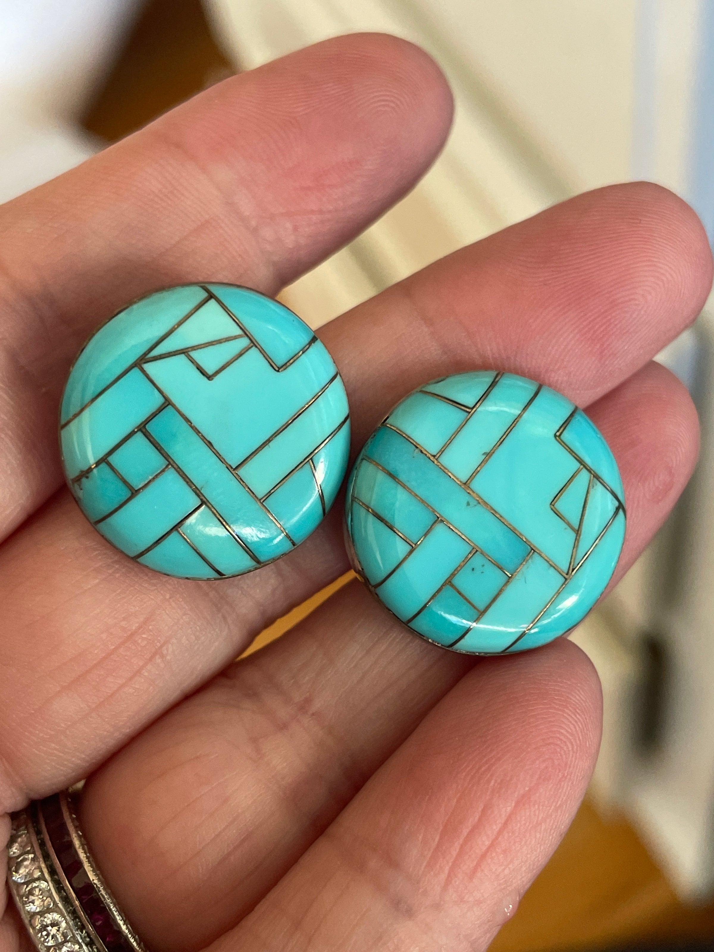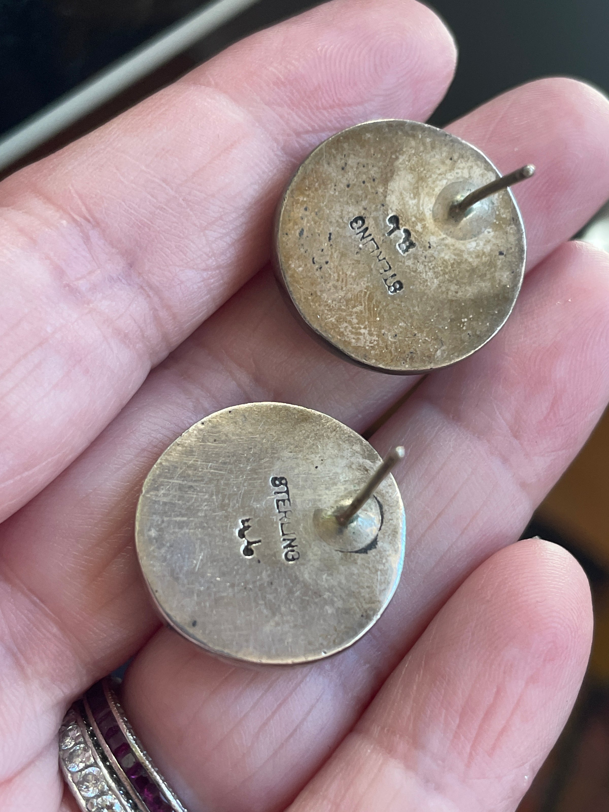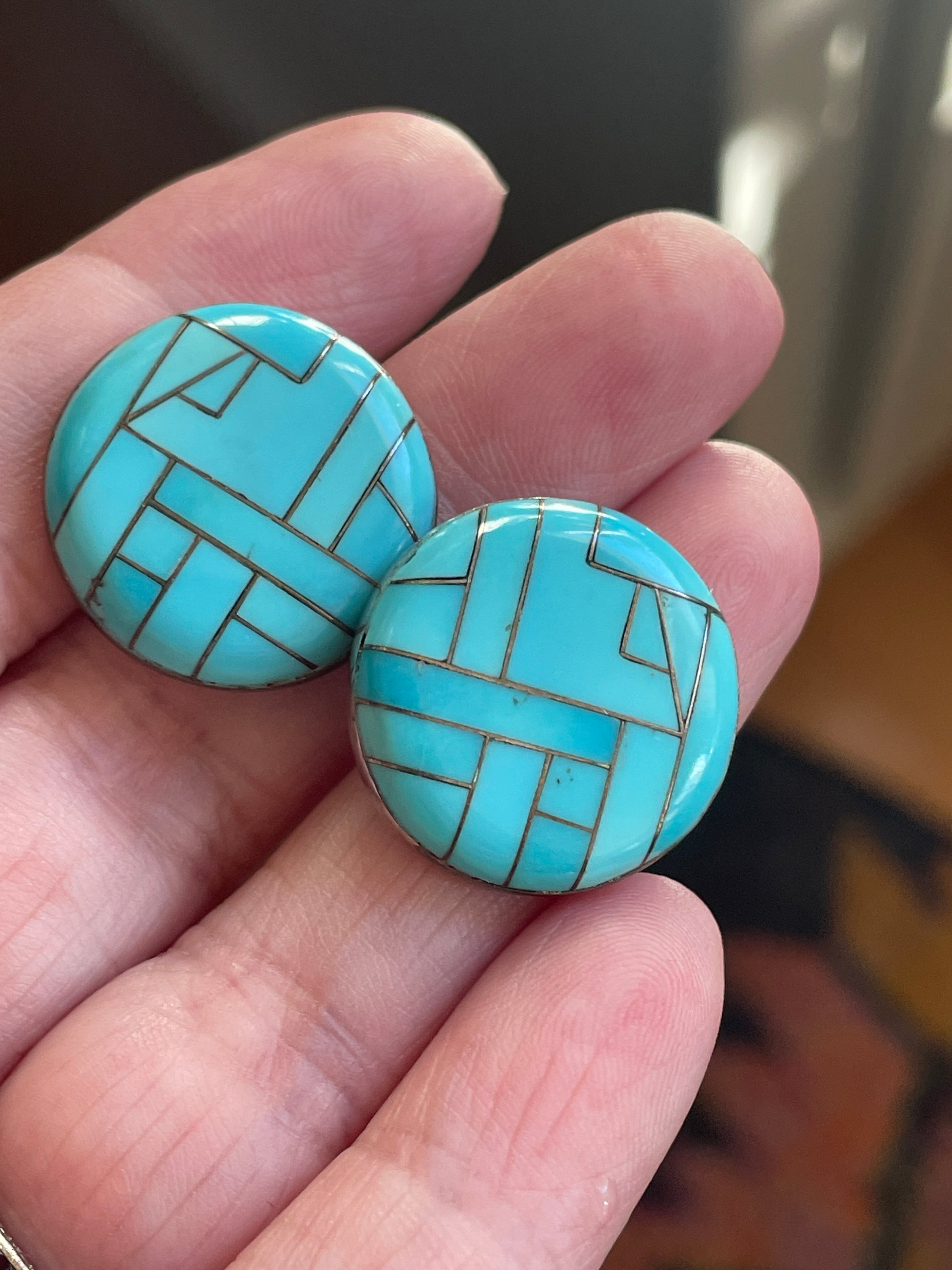 Fabulous vintage Turquoise inlay earrings in sterling silver. These measure just over 0.75 inches. Stamped “Sterling” on earrings.
