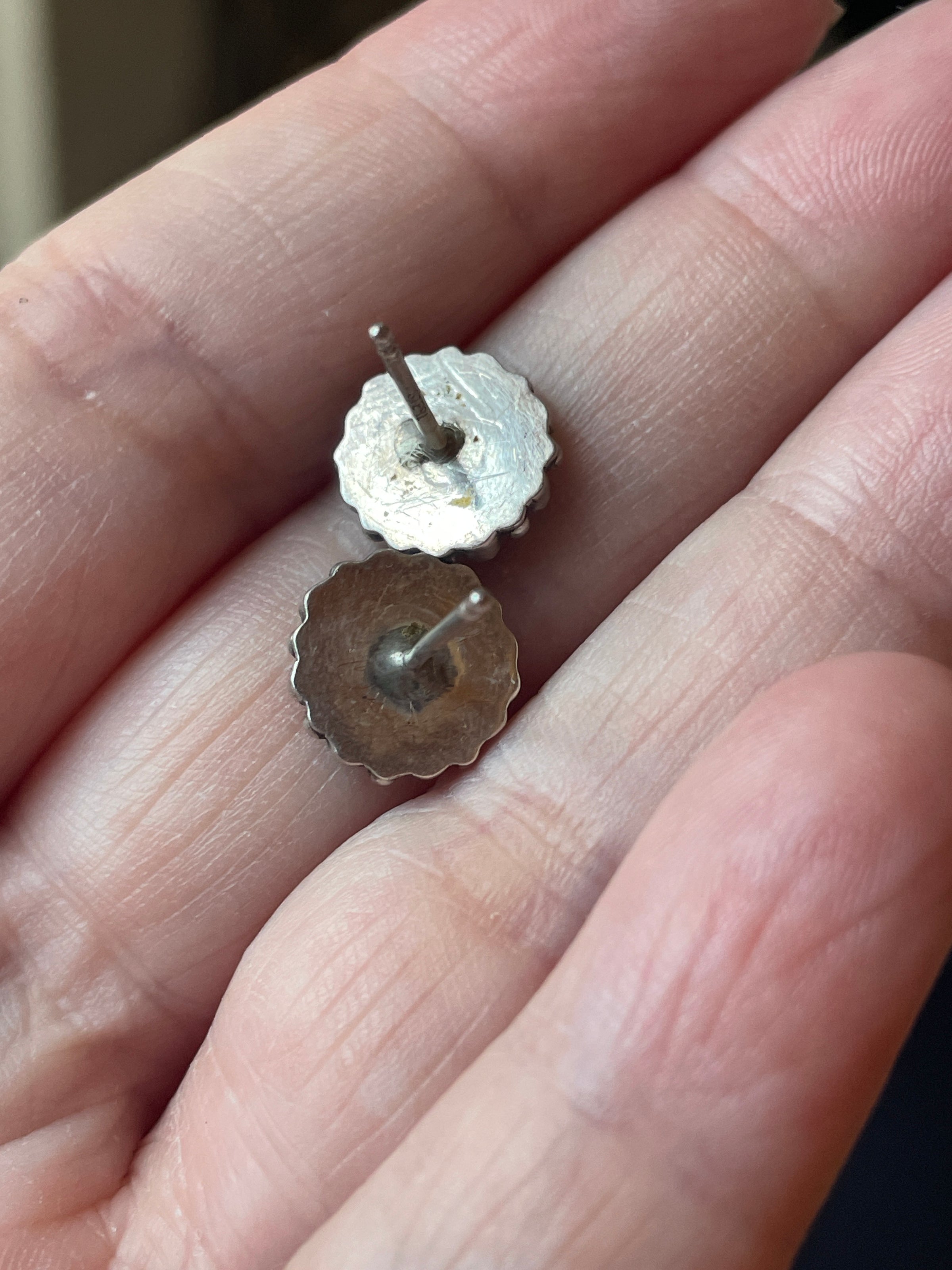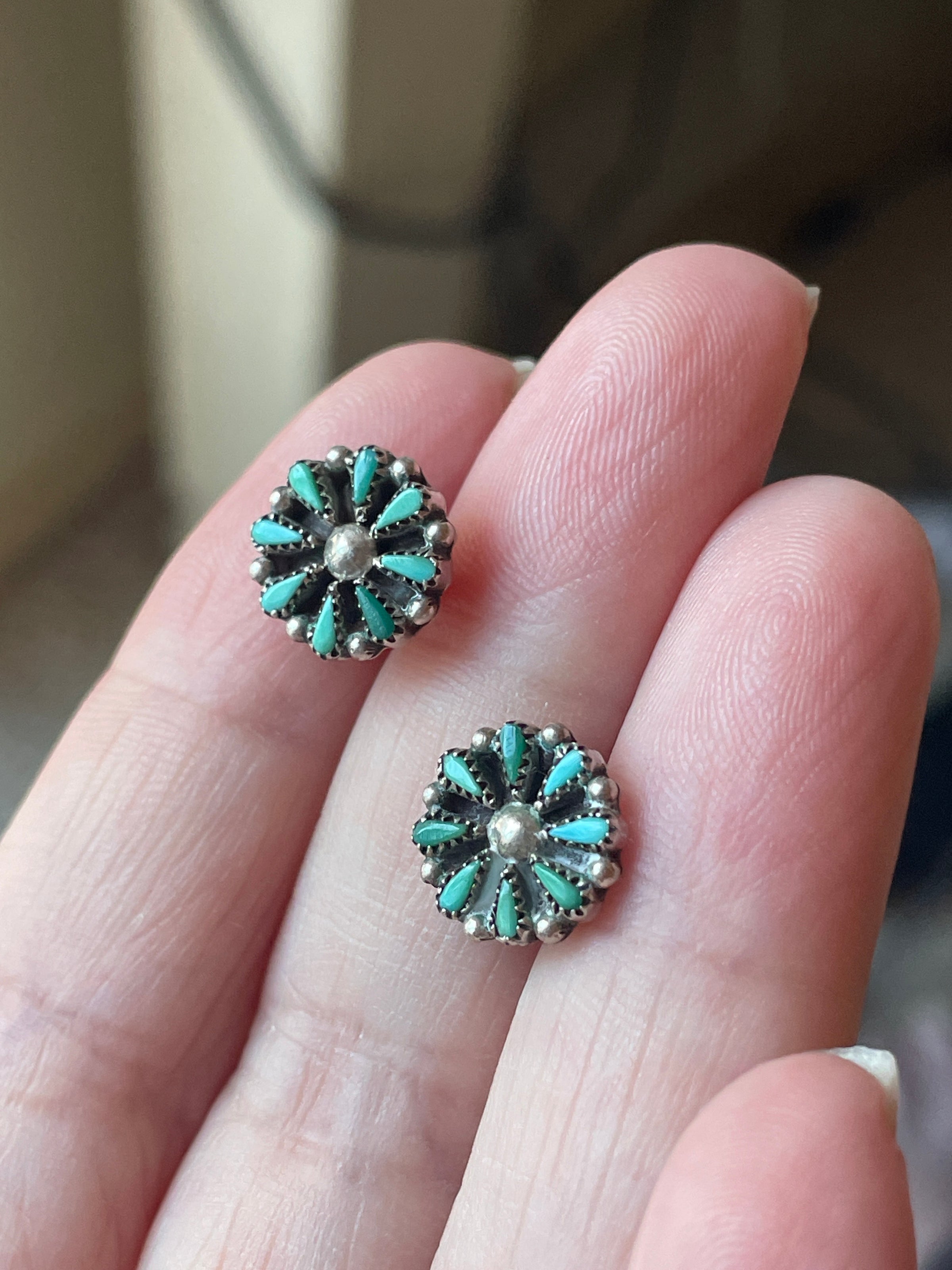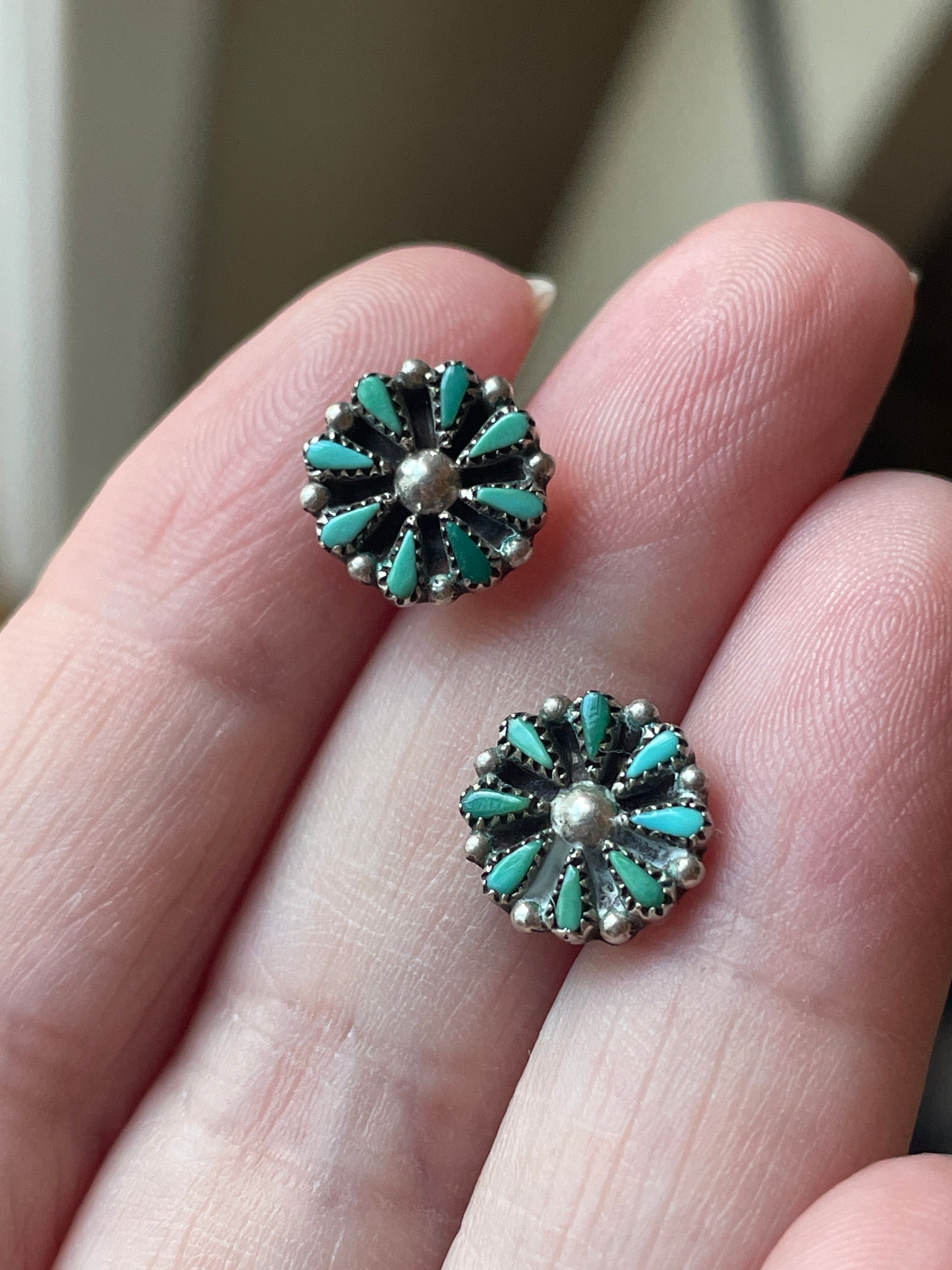 Fabulous dainty vintage Turquoise petit point stud earrings in sterling silver. These measure approx 9mm across. Post back. Posts have faded 925 markings. Backs stamped 925.