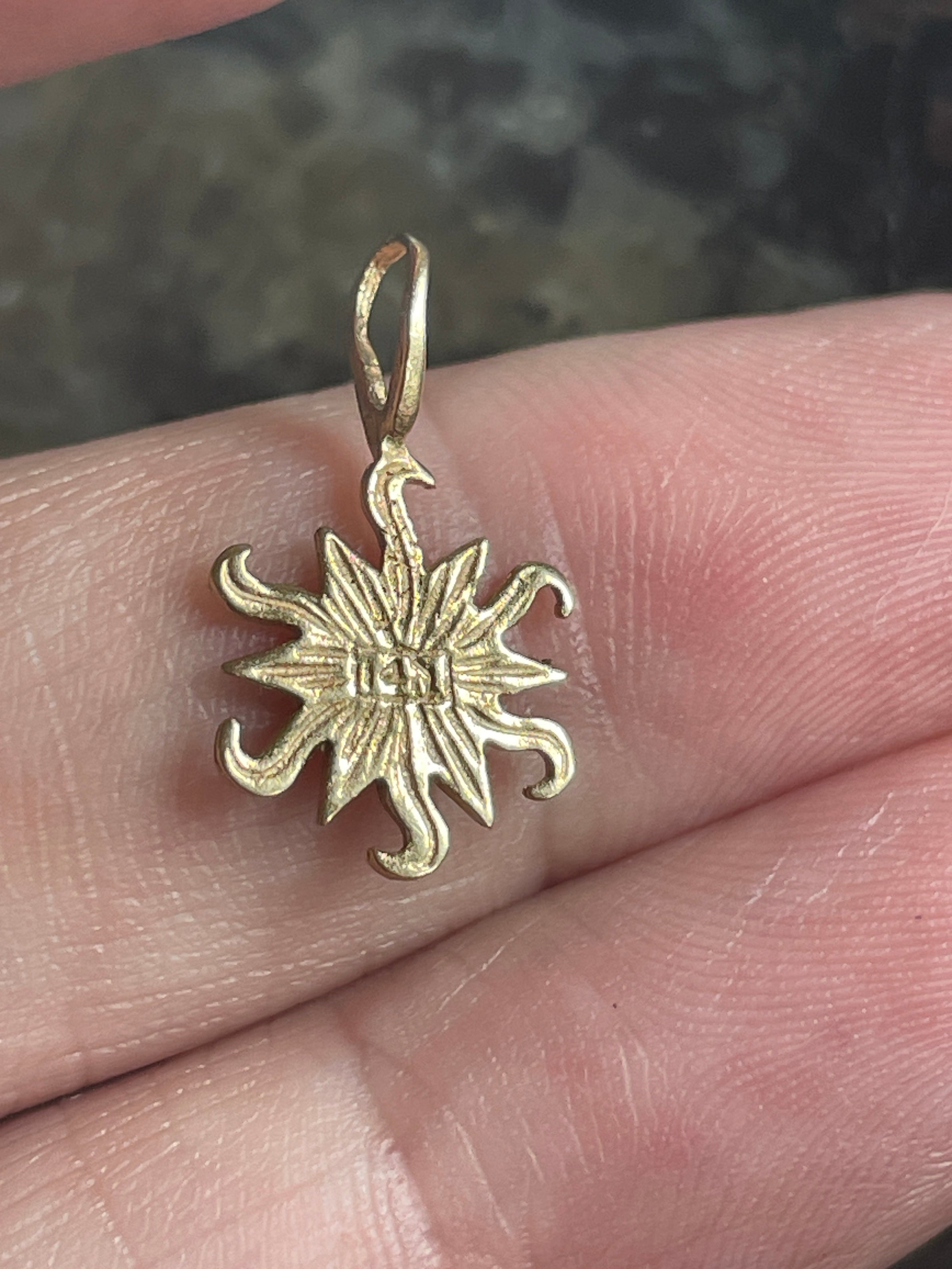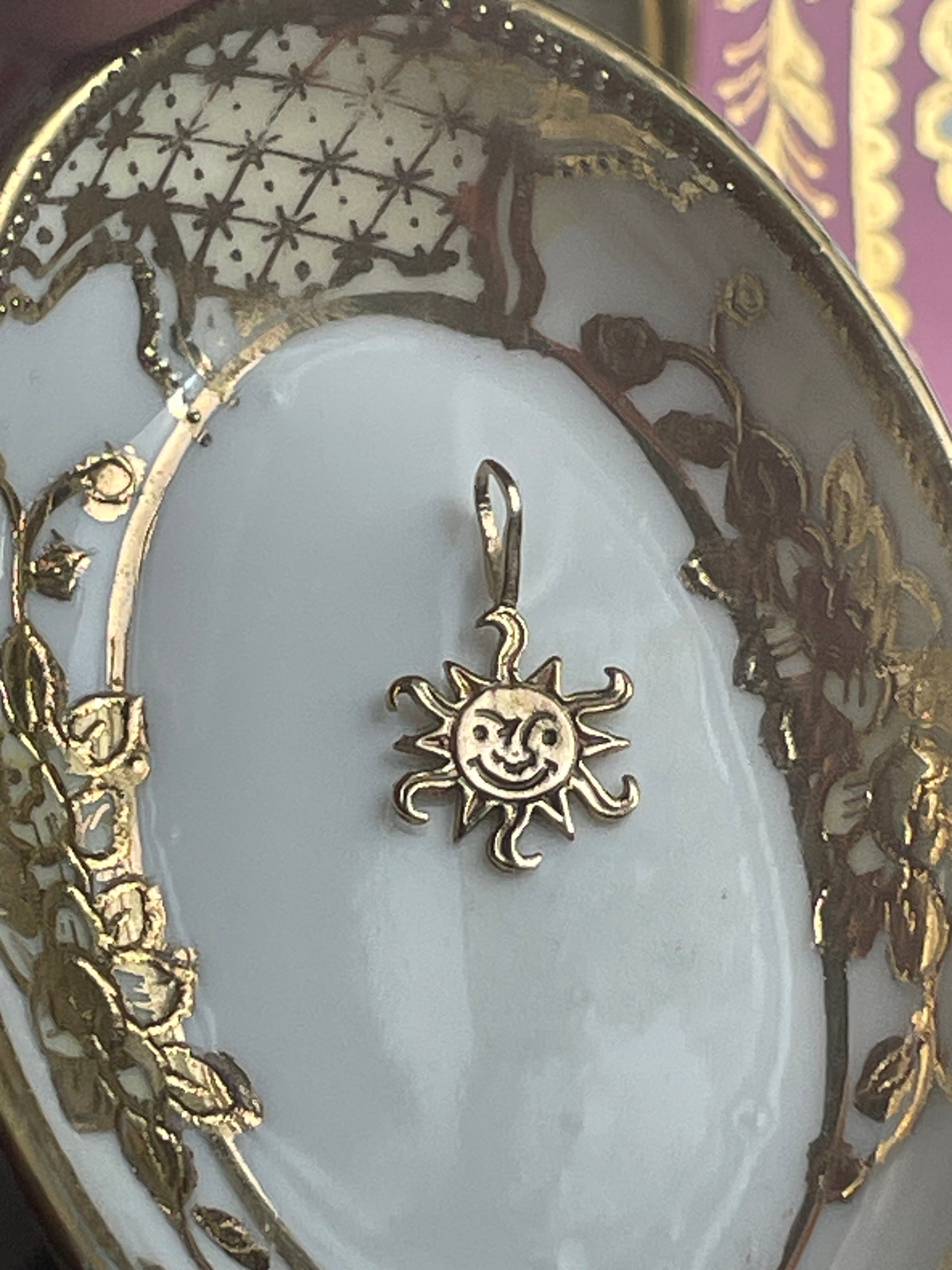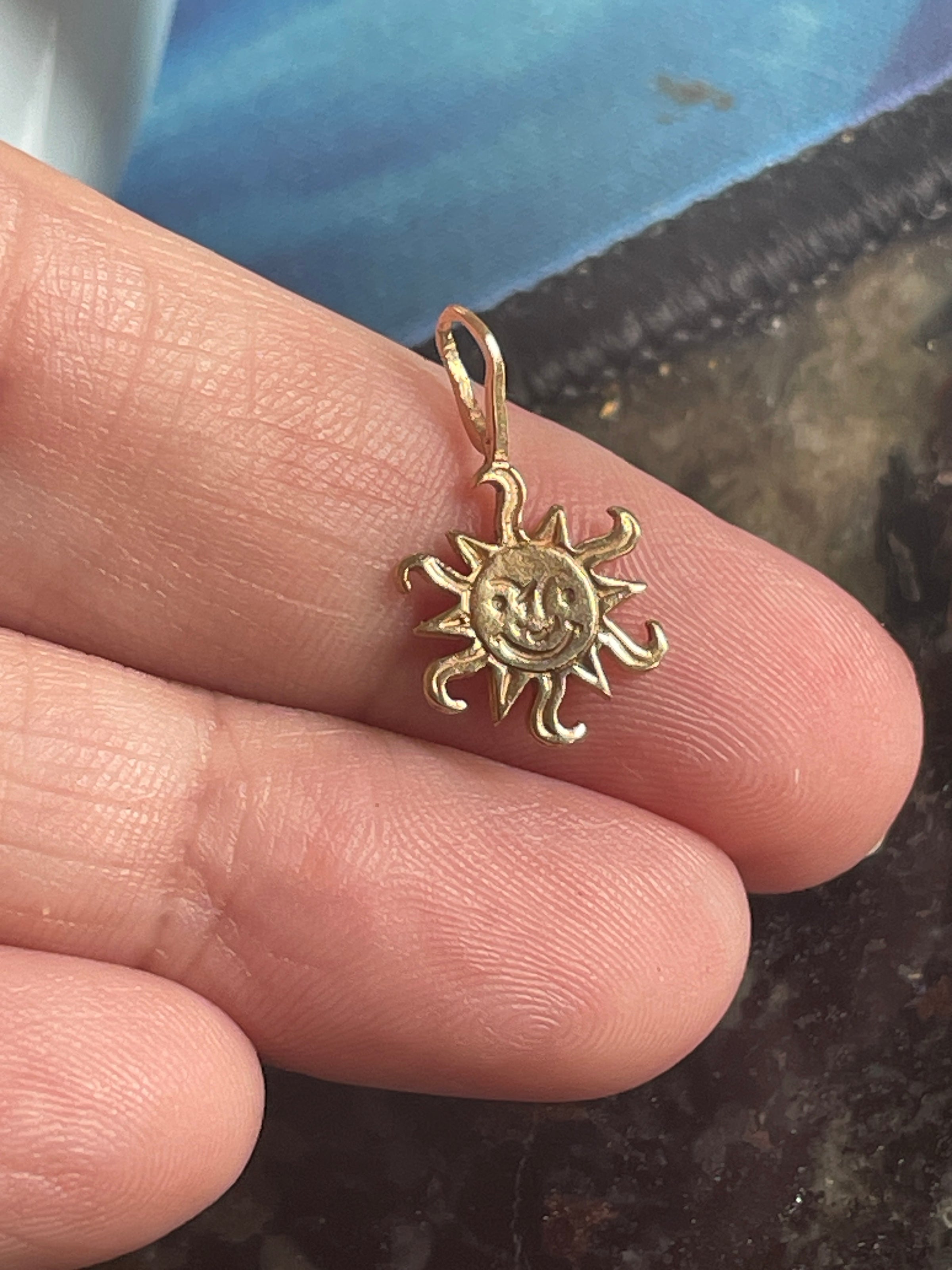 Adorable vintage Sun pendant with sweet face in 14k gold. Measures just under 0.75 inches. Has larger loop for chains. Stamped 14k on back.