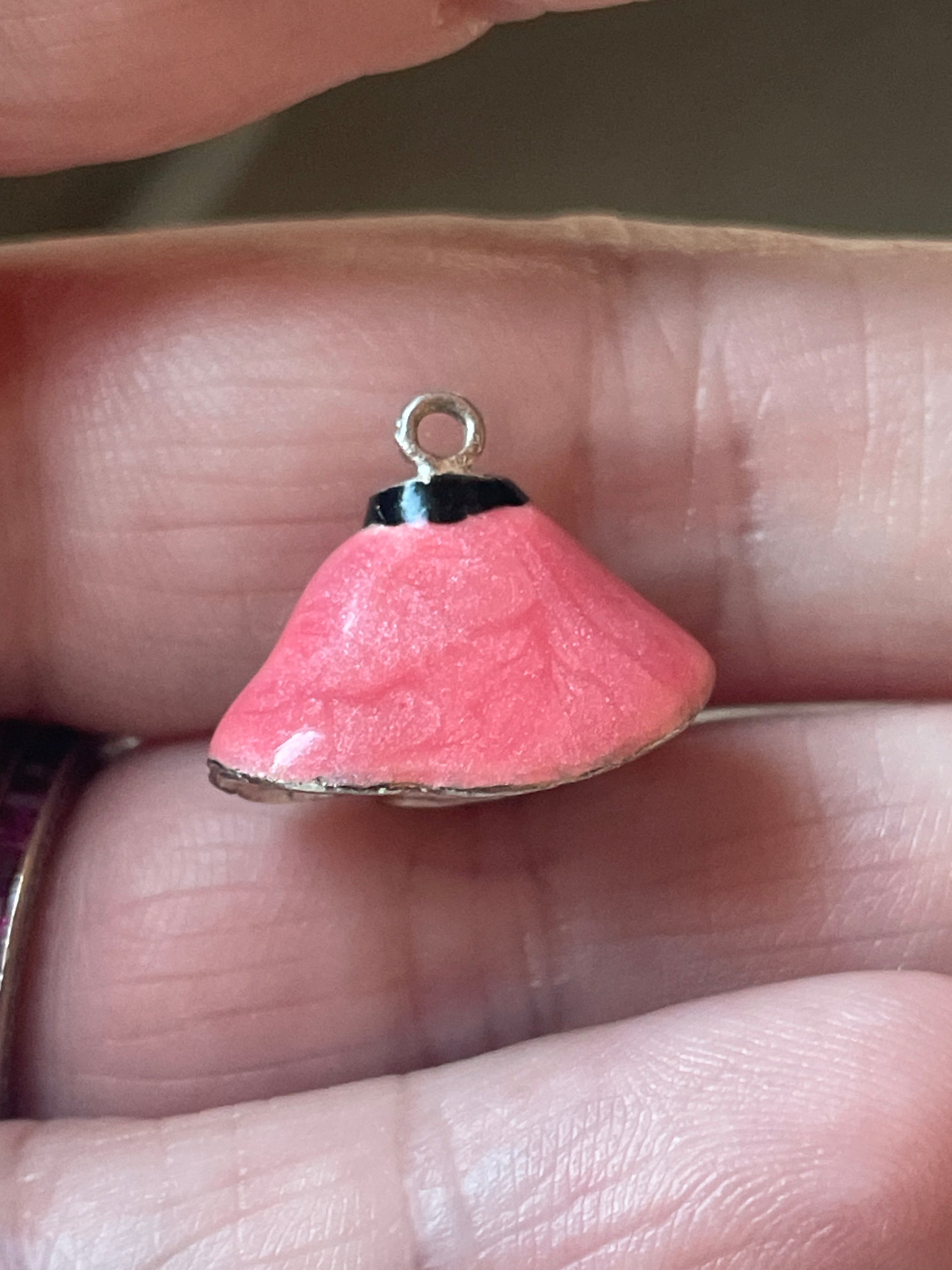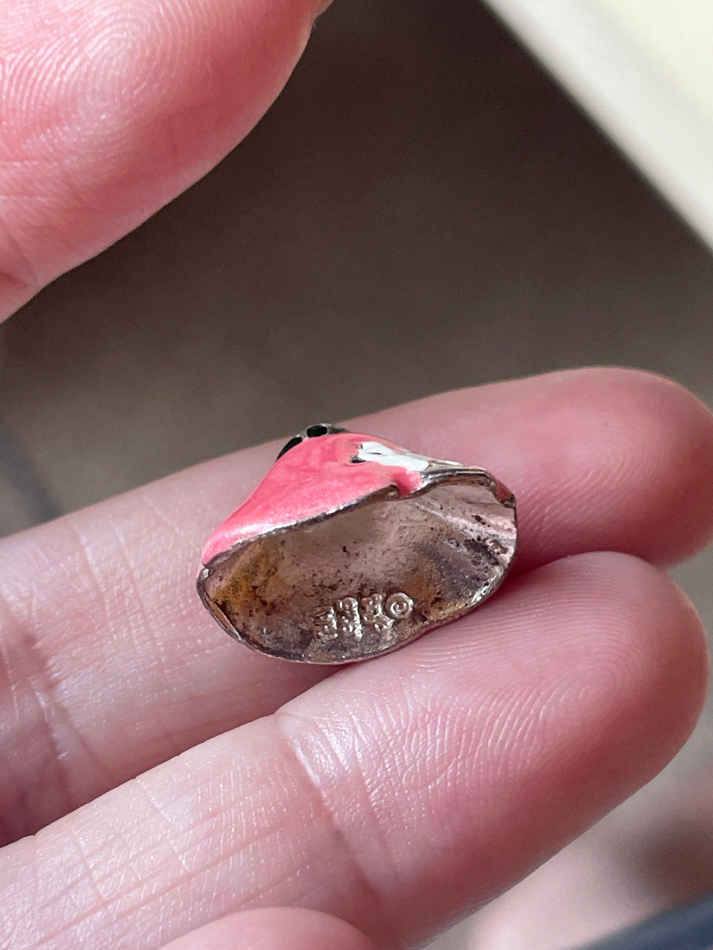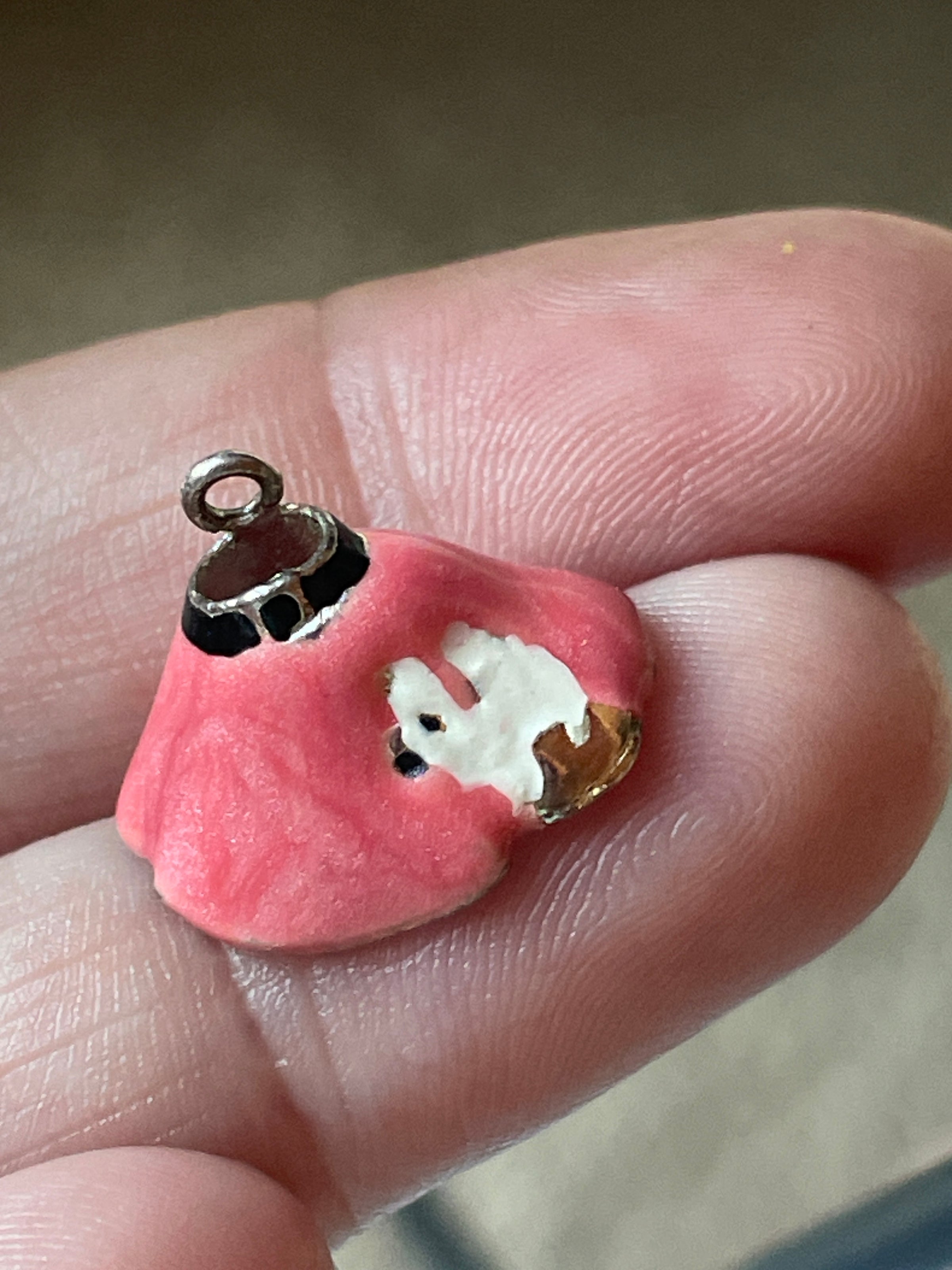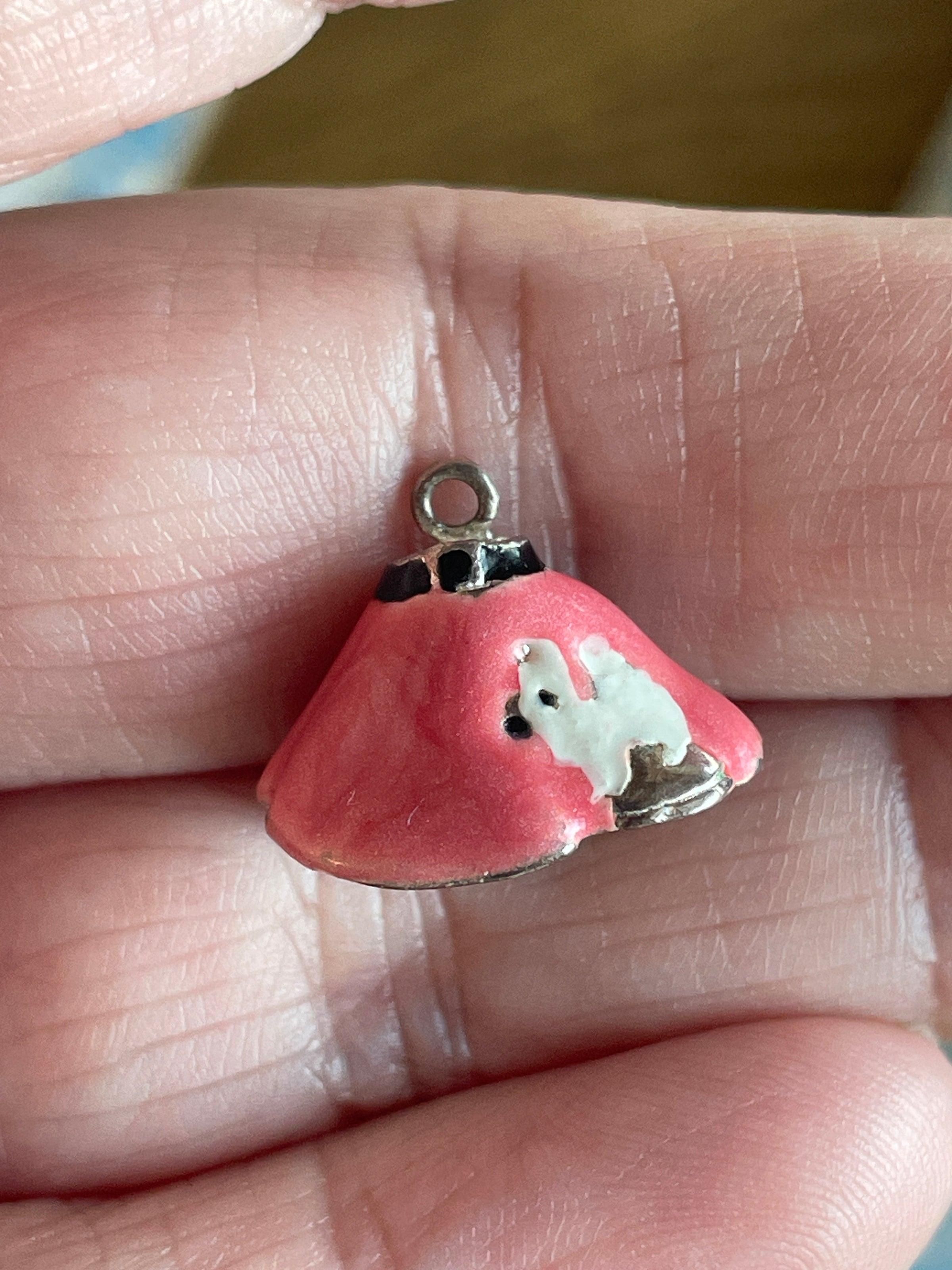 Adorable vintage Poodle skirt charm with little dog at base. Small amount of enamel loss below dog. Measures just under 0.5 inches x approx 18 inches. Stamped 925 for sterling. Needs jumpring to hang right direction on a chain.
