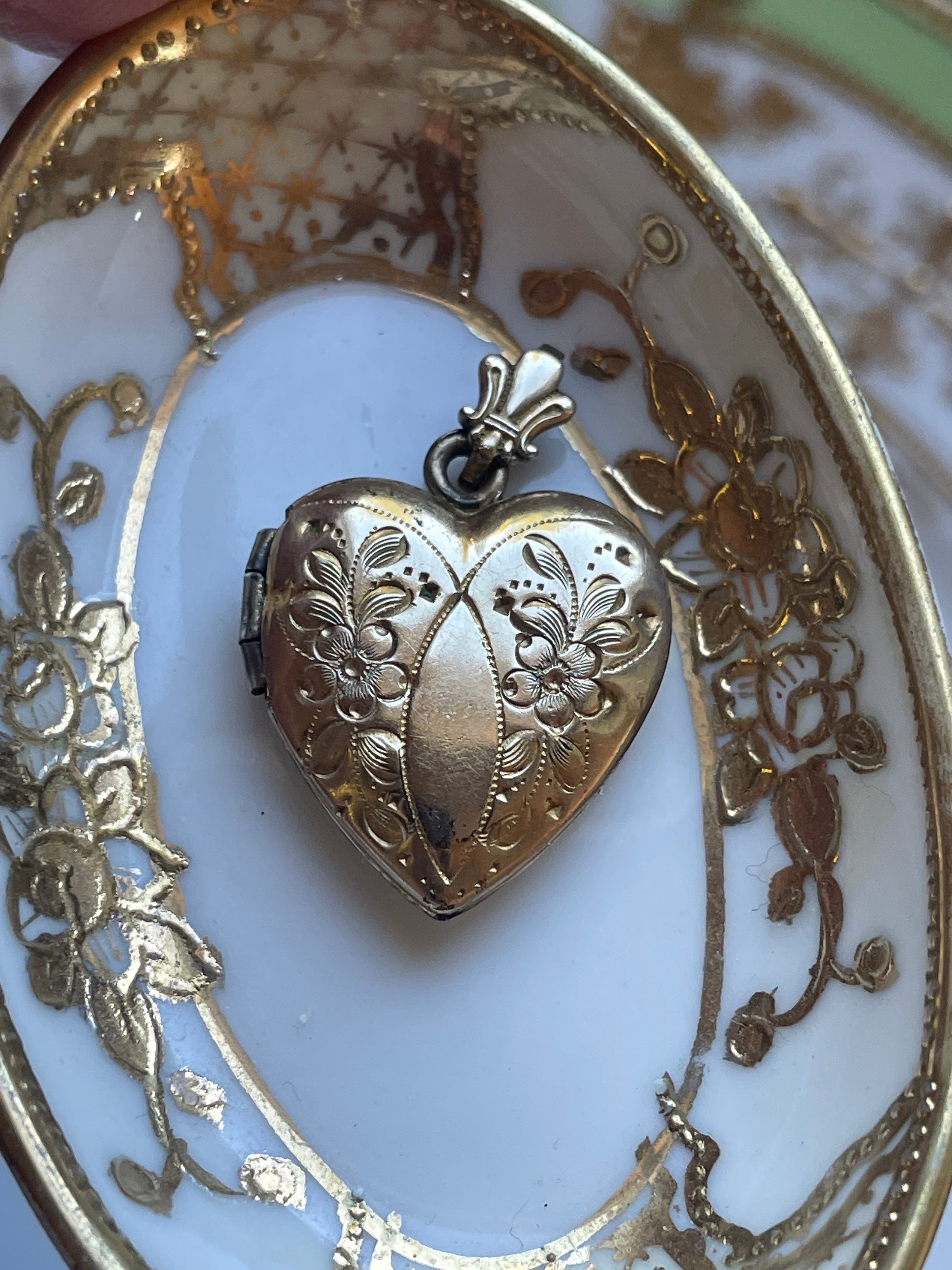 Beautiful vintage heart locket with engraved flower design. Locket measures just over 1 inch with bail x 0.75 inches. Two frames present inside no acetate. Frames are darkened with age (see photos). Striped pattern on back. Closes with a snap. Hinge darkened with age.