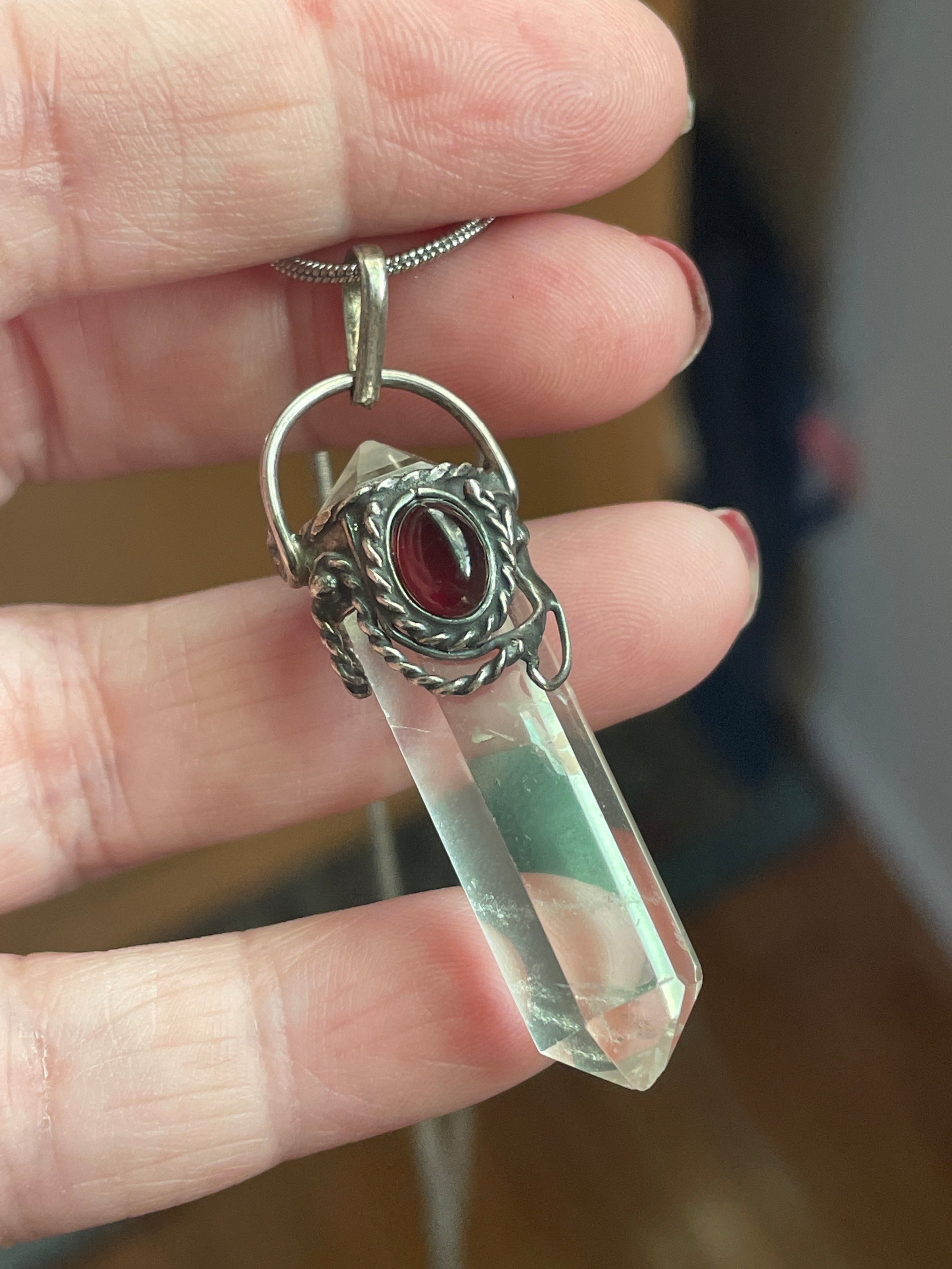 Fabulous vintage point Crystal with a Garnet accent in sterling silver. Point crystal has natural inclusions. Pendant measures just under 2 inches with top loop. Comes on a sterling 17 inch snake chain.