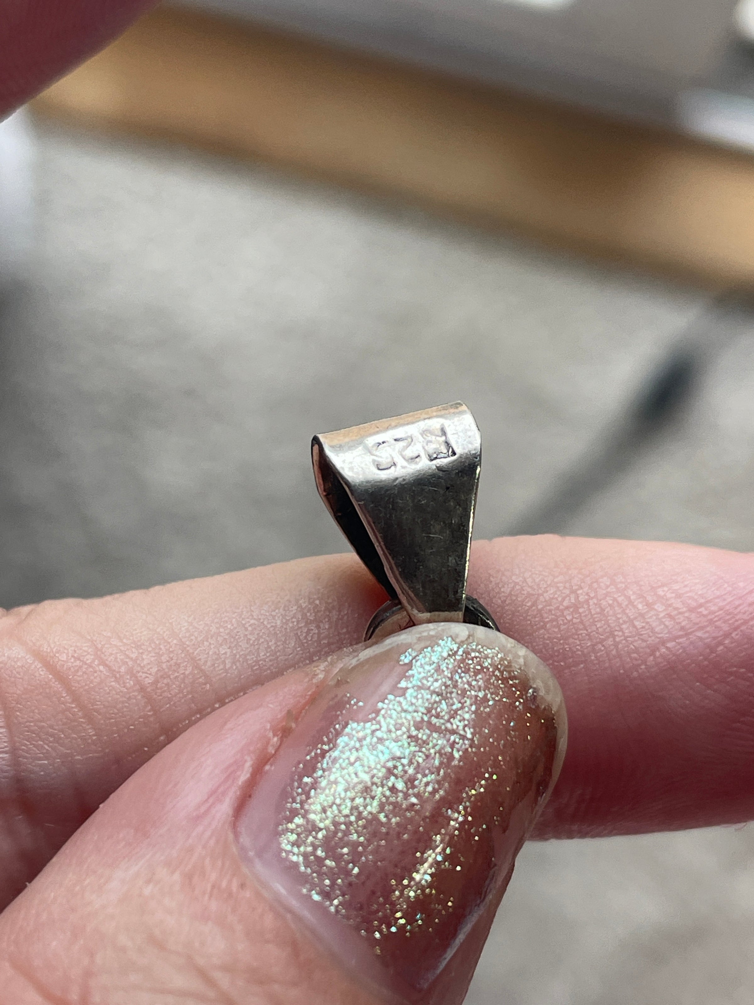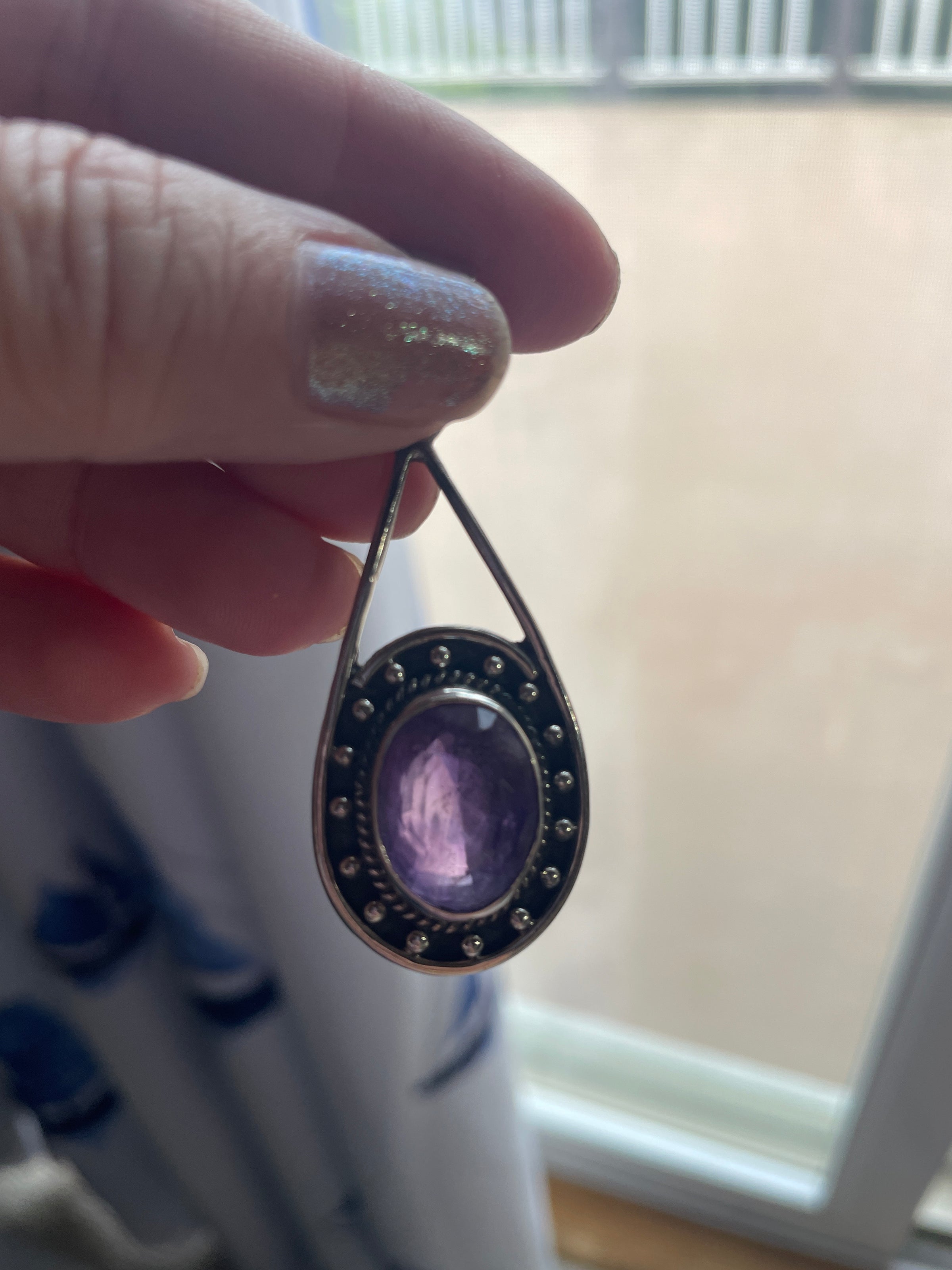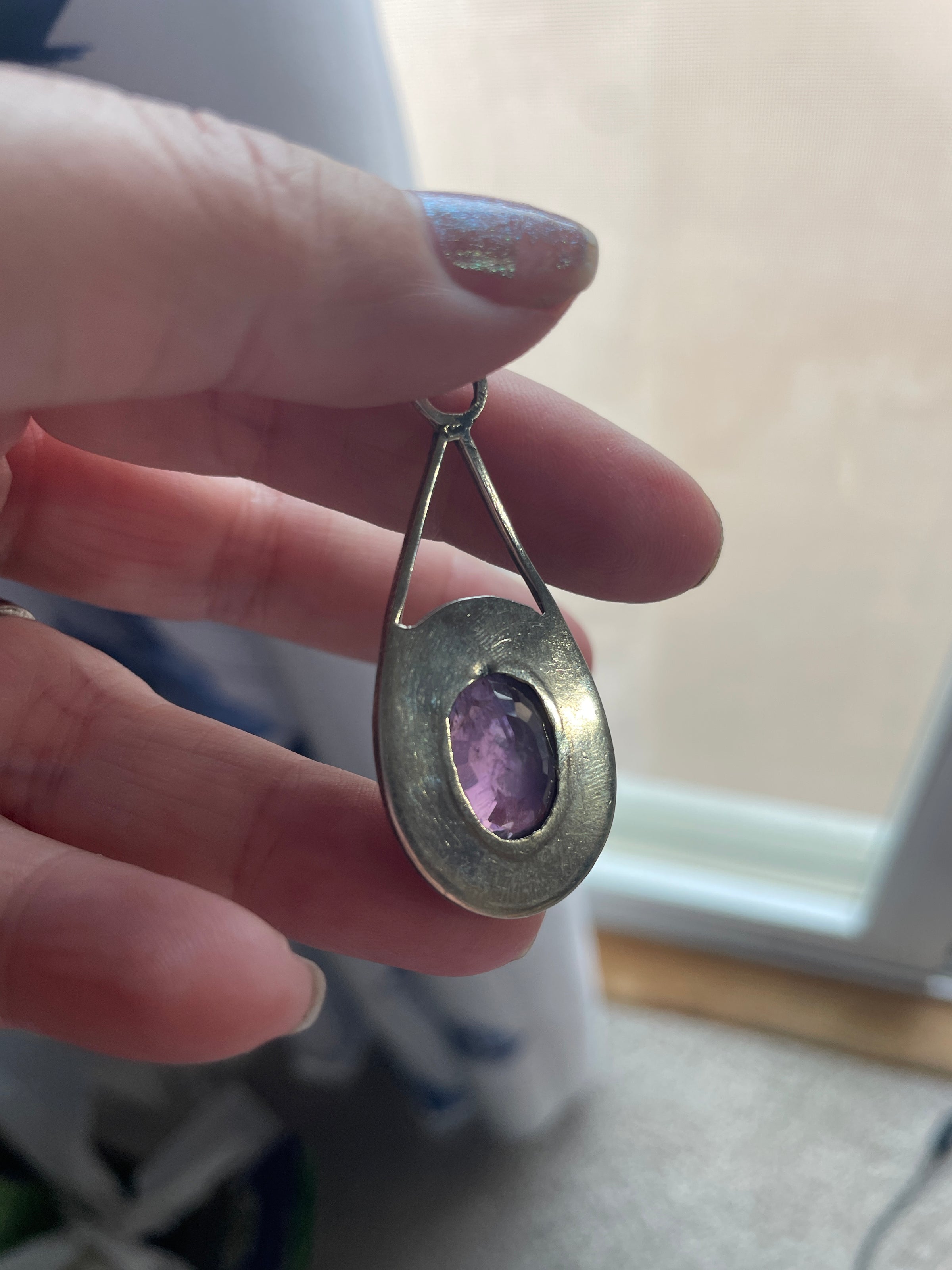 Fabulous large vintage Amethyst pendant with ornate design. Large size. Measures just over 2 inches x just over 0.75 inches. Amethyst is open back and measures 15mm x 11mm. Pendant stamped 925 on bail.
