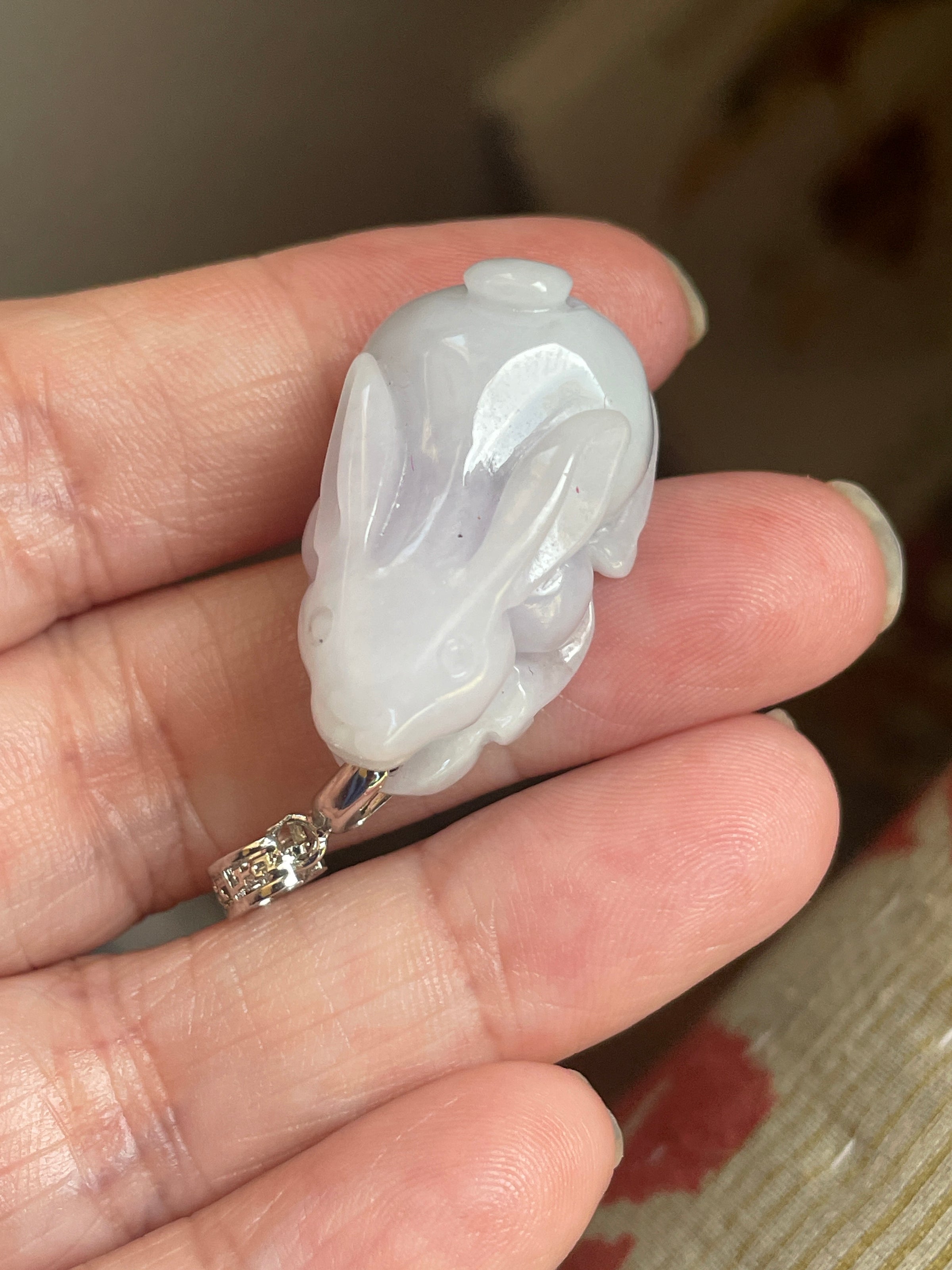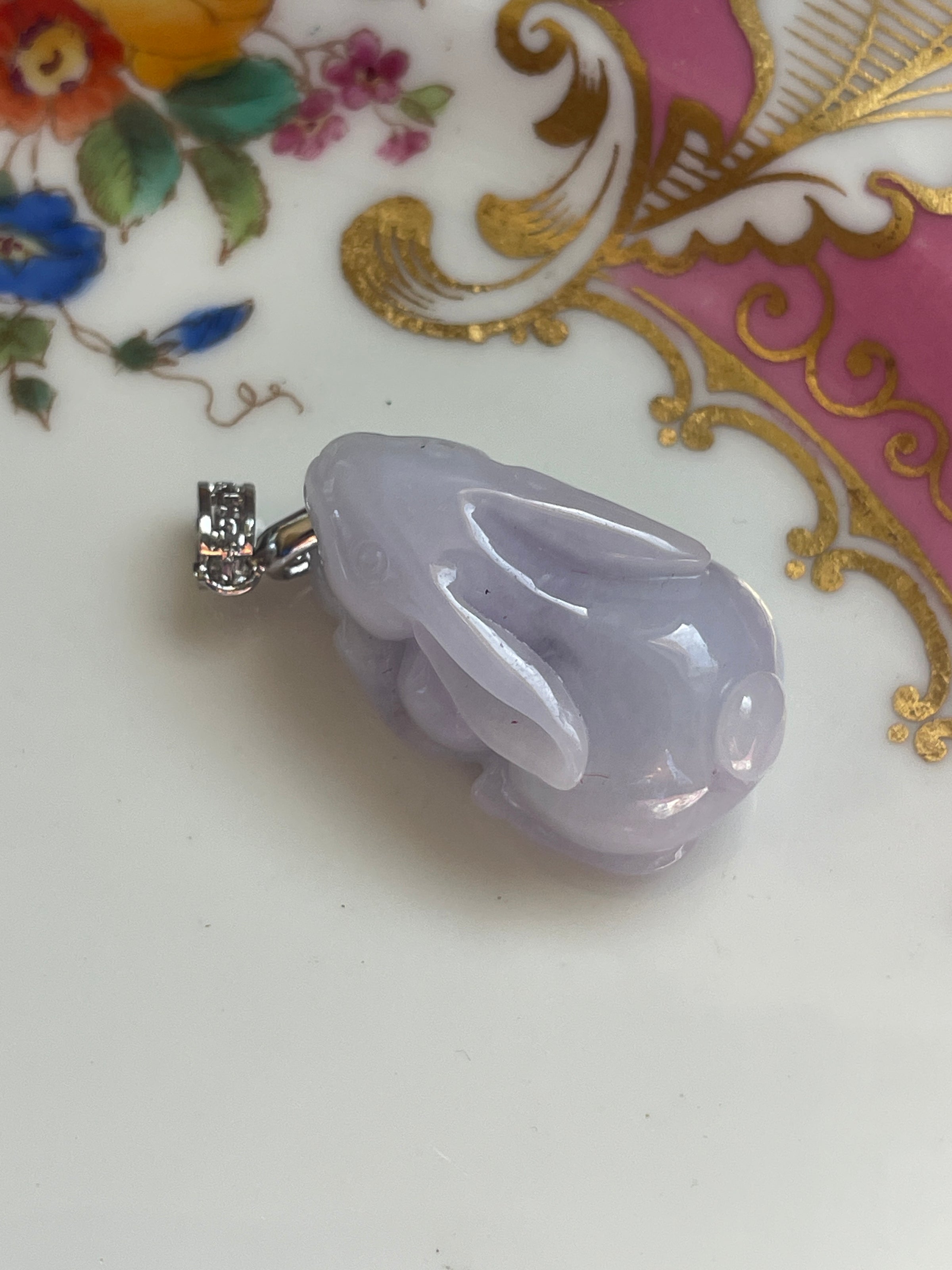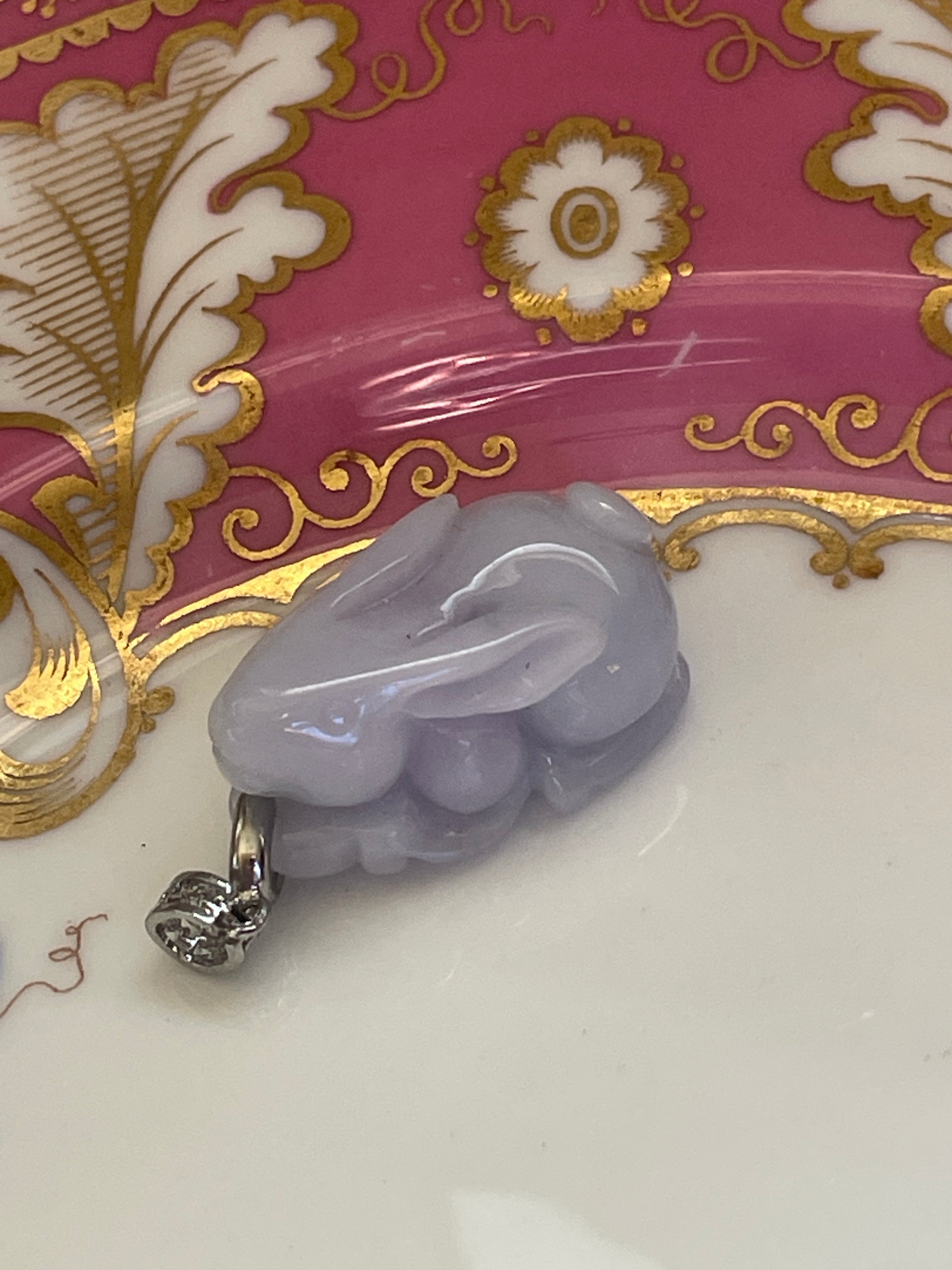 Fabulous vintage carved Lavender Jade rabbit pendant with modern sterling bail. Pendant measures 1.5 inches (with bail) x 0.75 inches. Detailed even includes cute feet underneath.