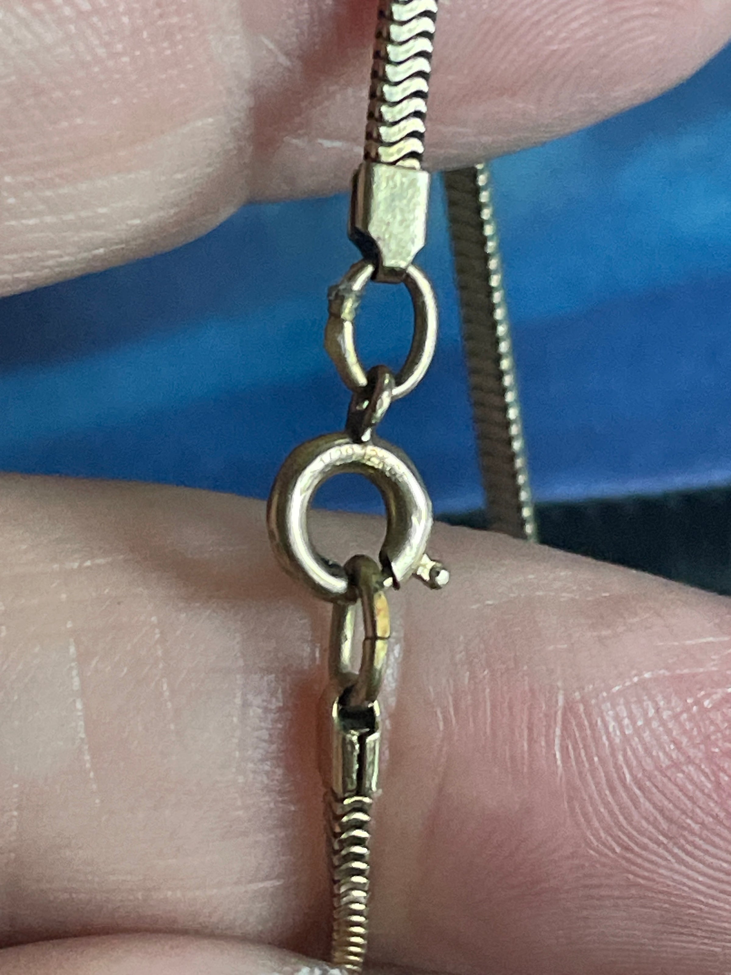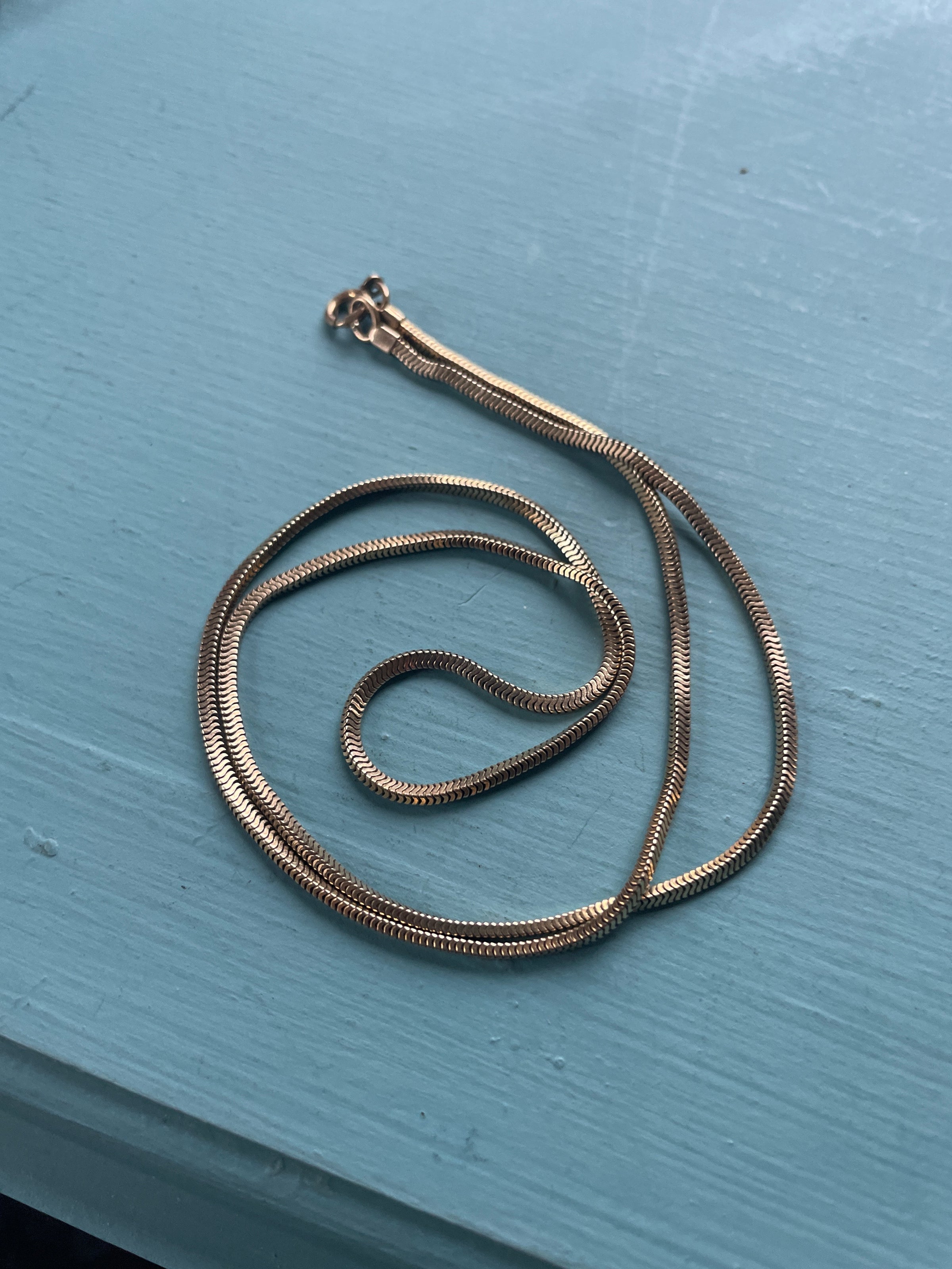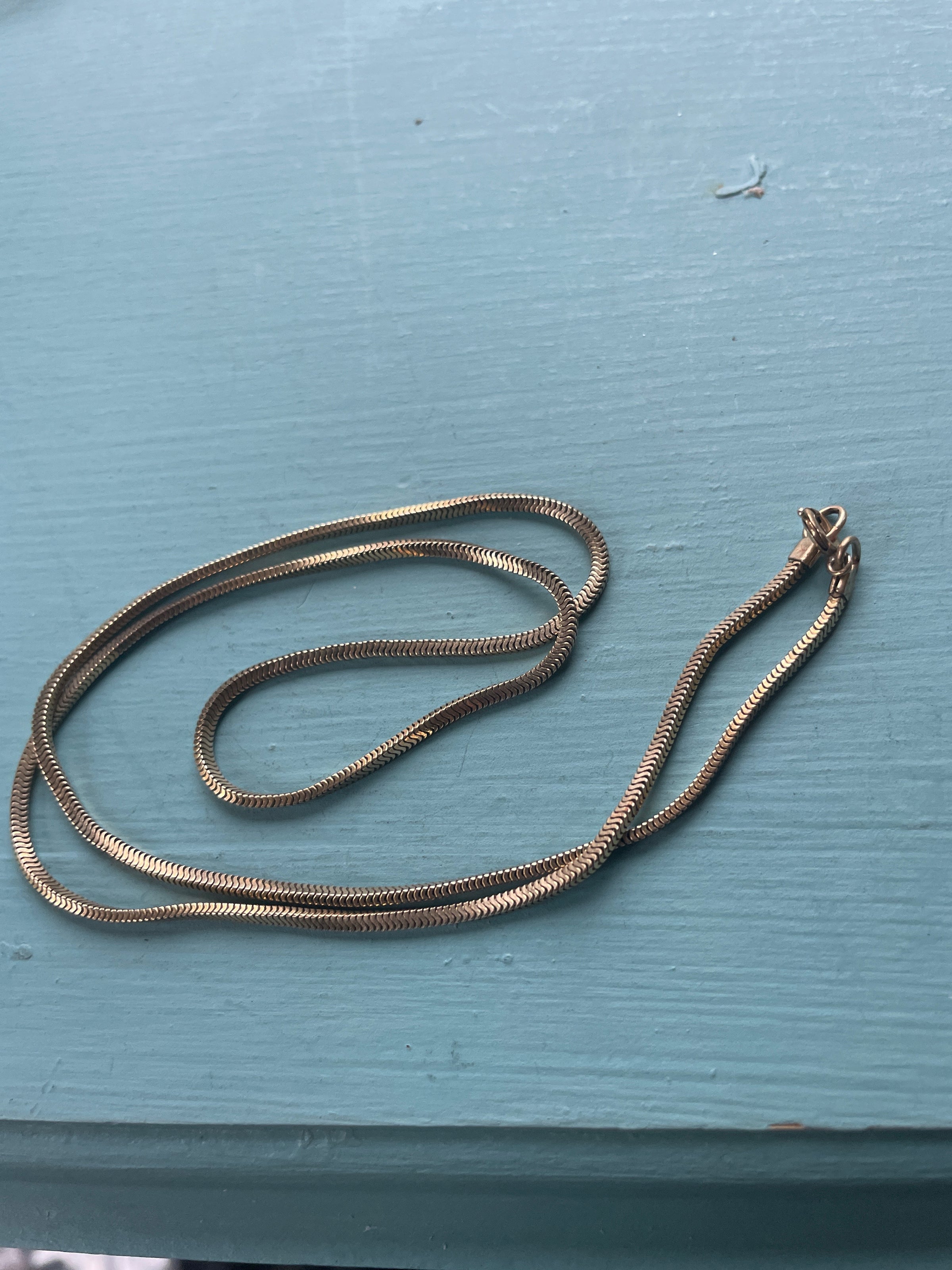 Fabulous silky vintage snake chain in gold filled metal. Measures approximately 18 inches. Marked for gold filled near clasp.