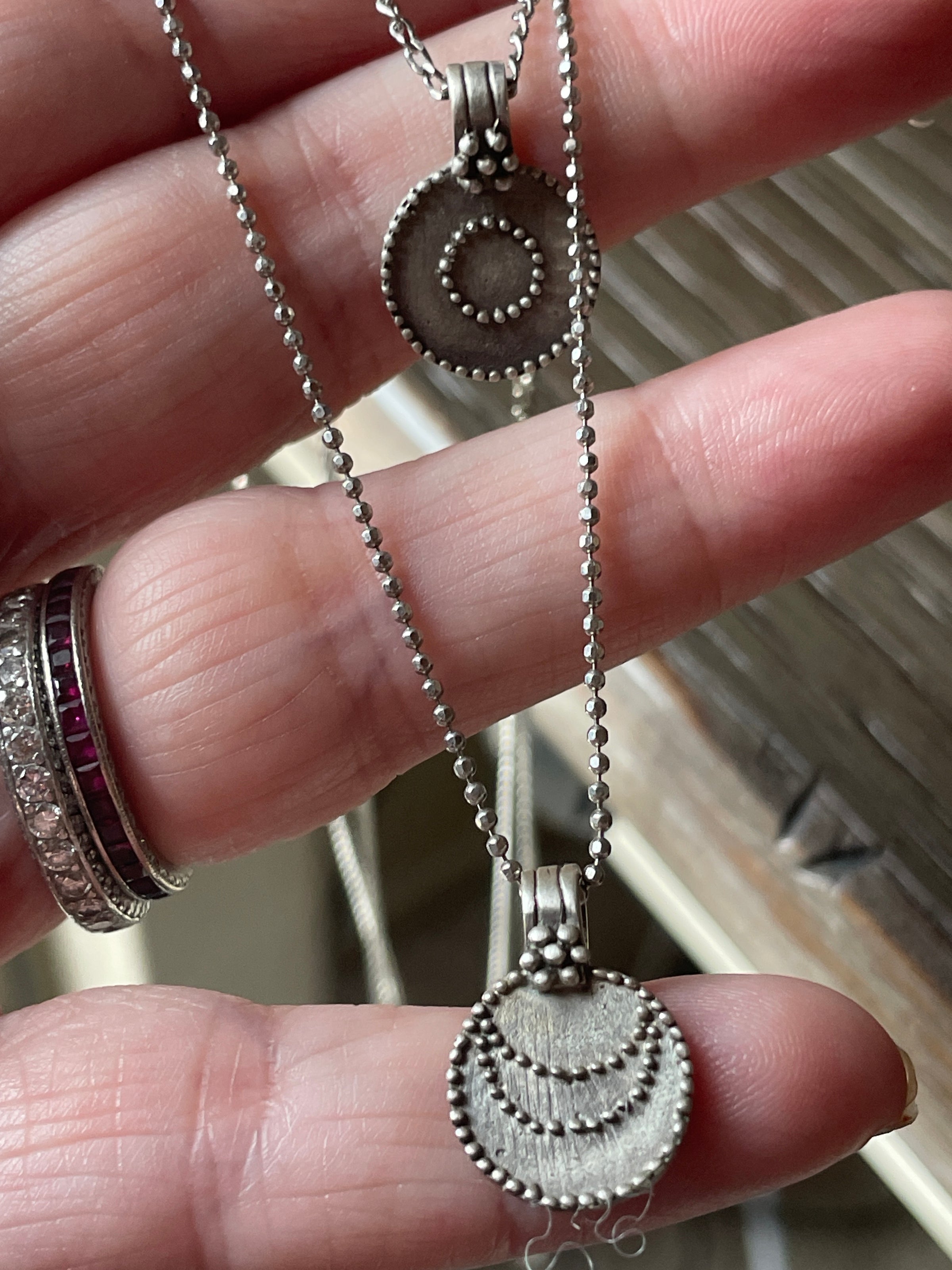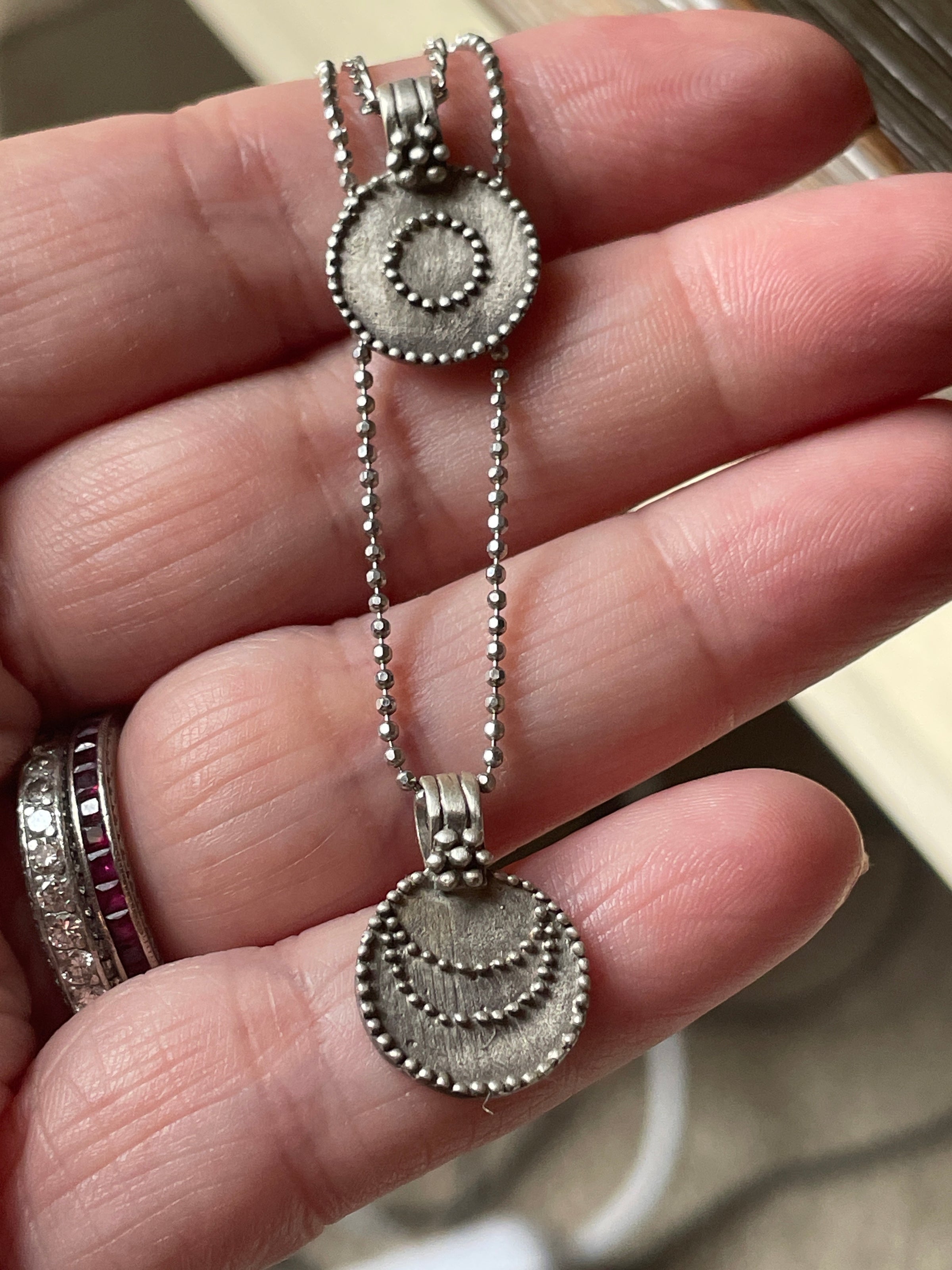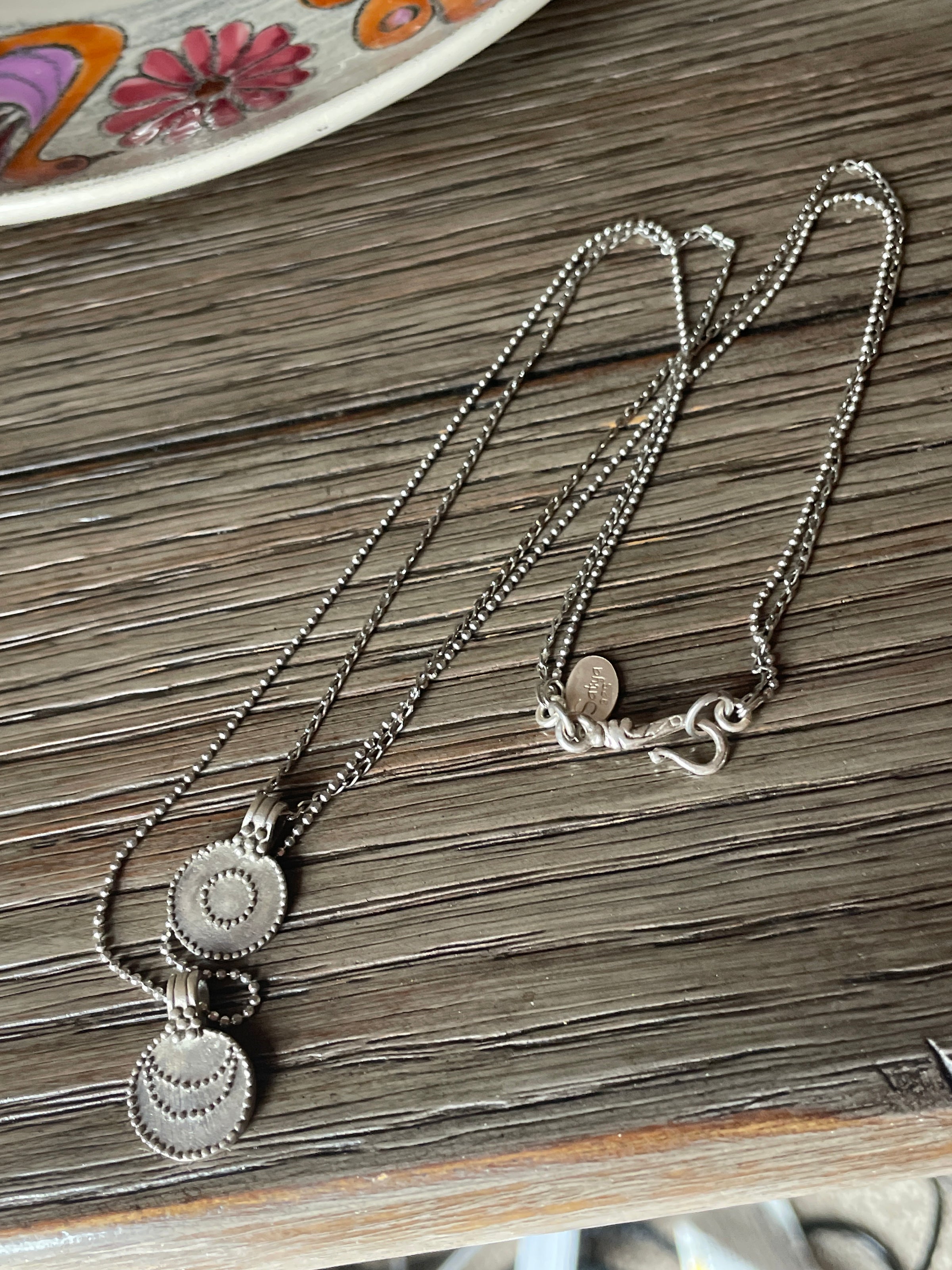 Rare double drop pendant in sterling silver with Sun and Moon.  Has a beautiful ball chain and an ornate clasp.  Measures approx 18 inches with one of the drops worn slightly higher.  Stamped “Satya” on a separate tag and “925.”  Each of the drops also stamped 925.