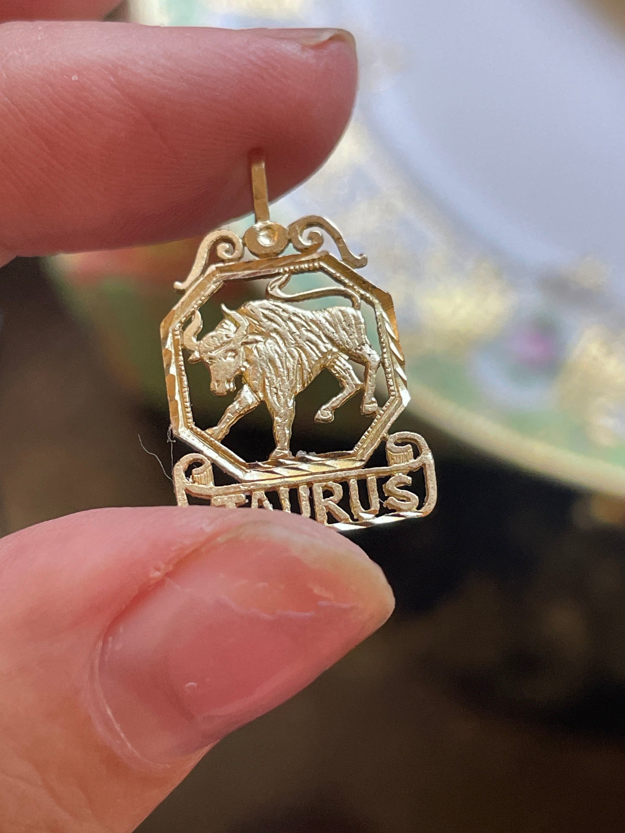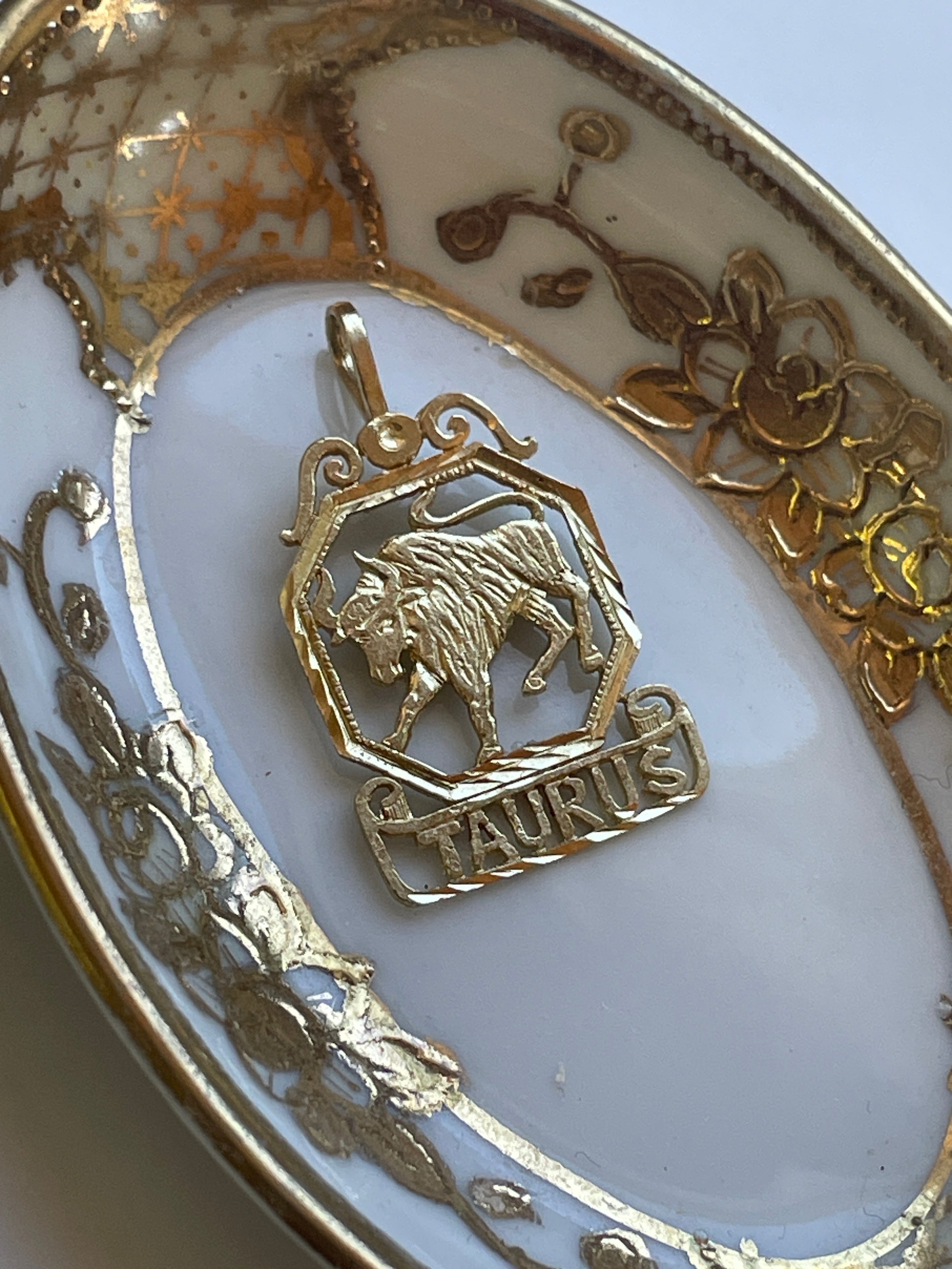Stunning ornate Taurus pendant in 14k gold with ornate details. Measures approx 1 inch (with stationary bail) x just over 0.5 inches. Stamped 14k on back.