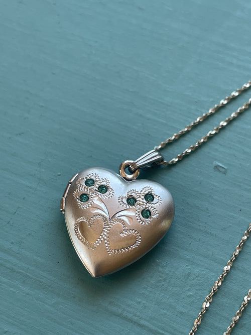 Dainty Heart Rose and Green Gold Flower Locket - Gold Filled - Vintage