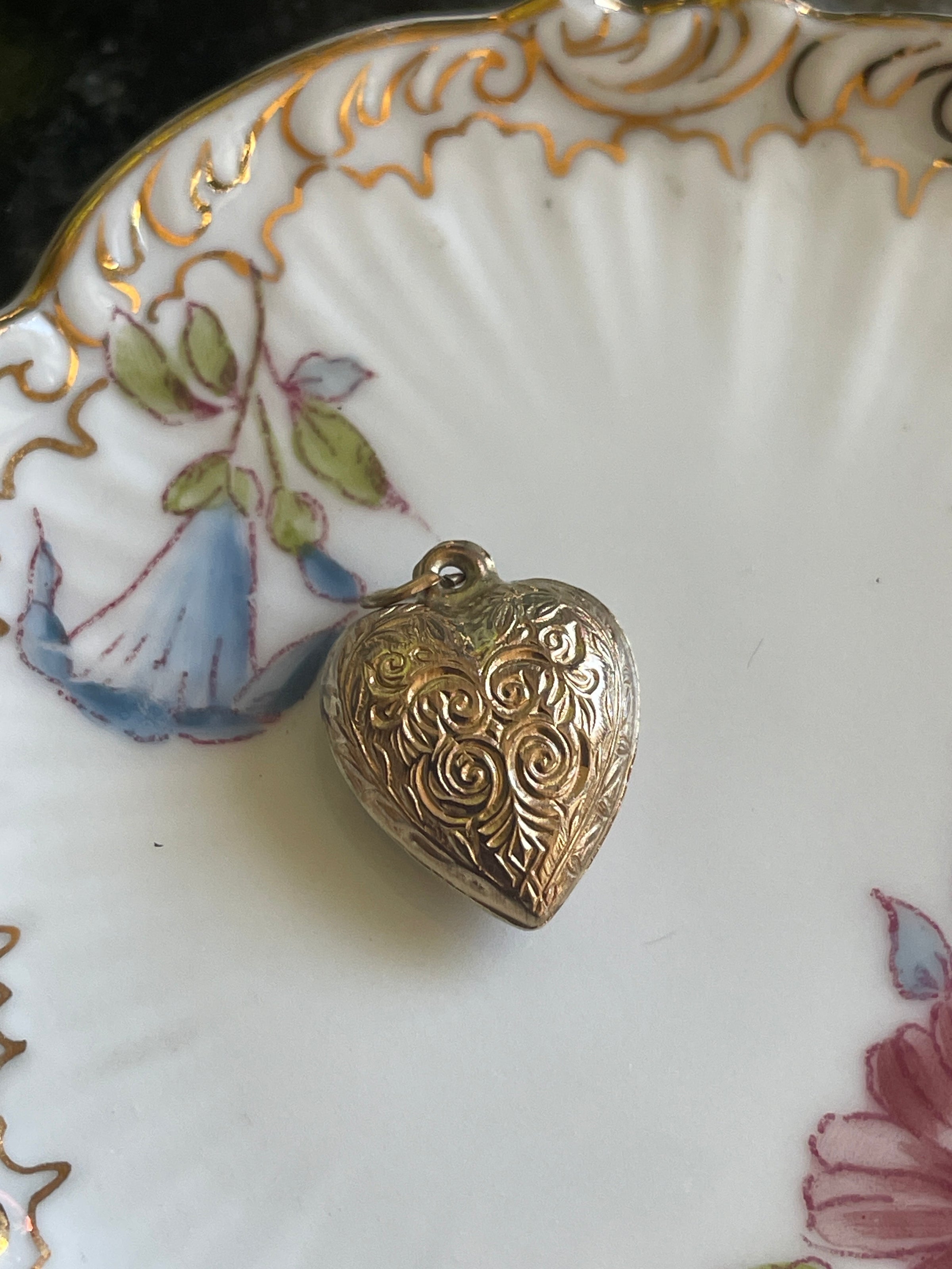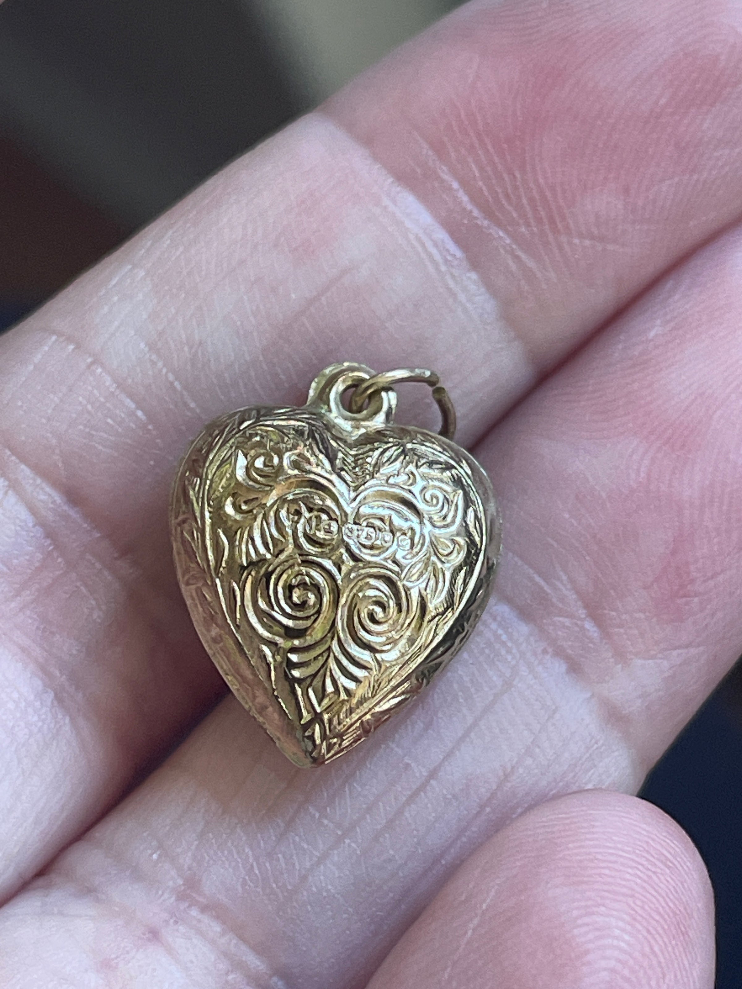 Gorgeous vintage puffy heart pendant with stunning engravings on both sides. Lightweight but beautifully made. Measures approx 13mm and approx 16mm with top loop. Has British hallmarks on the back including 375 for 9k. Note top loop is not soldiered shut.
