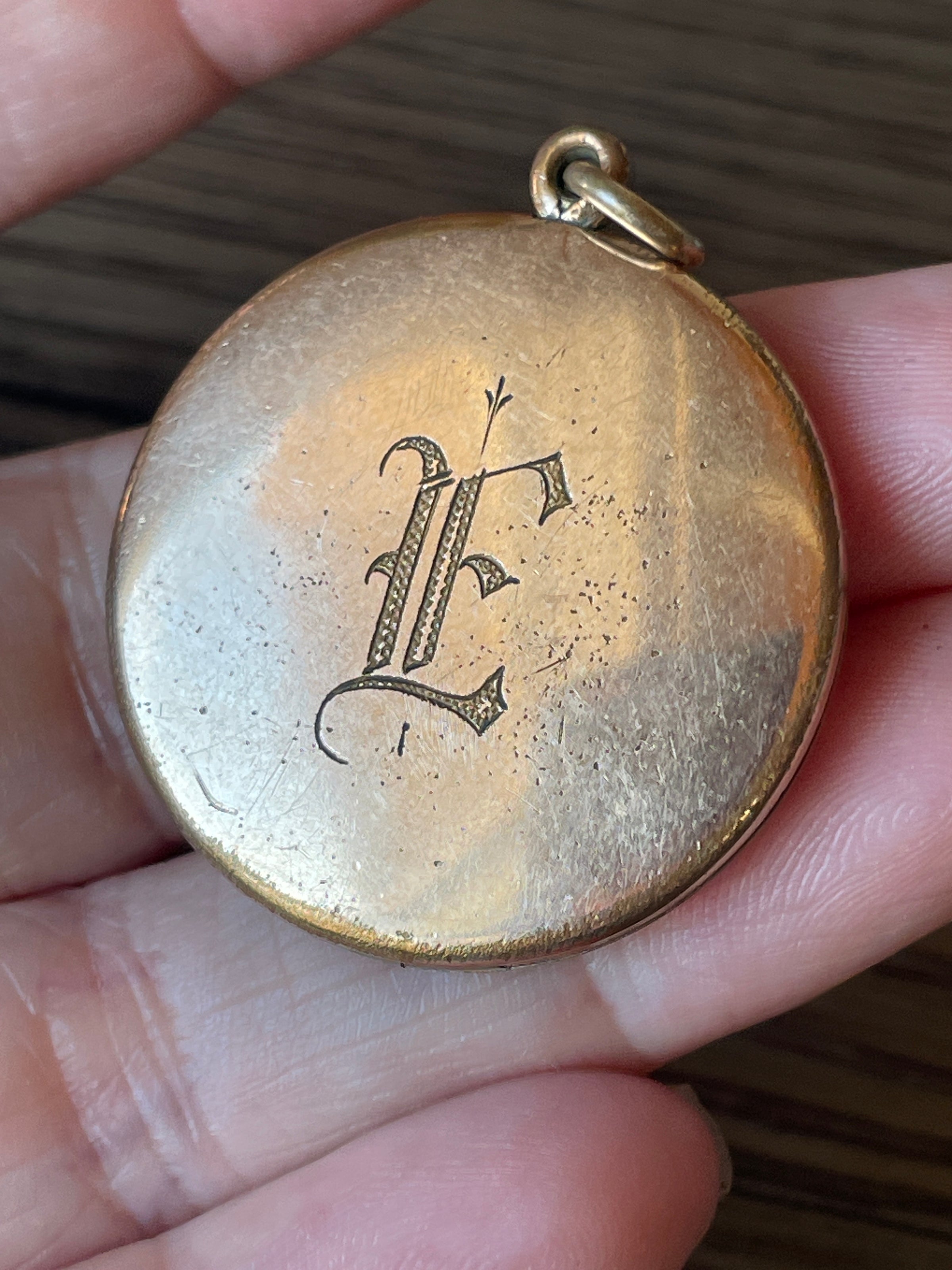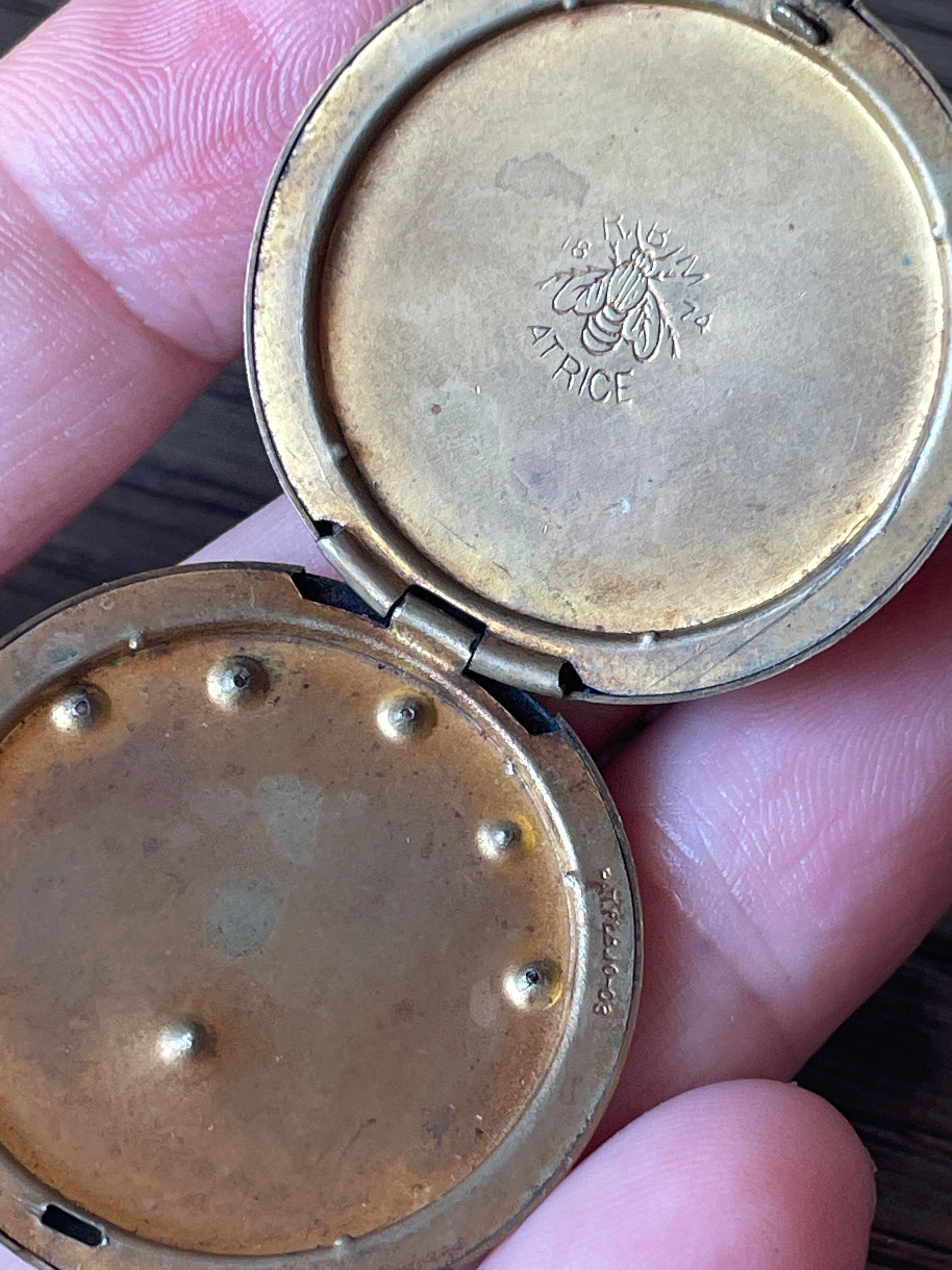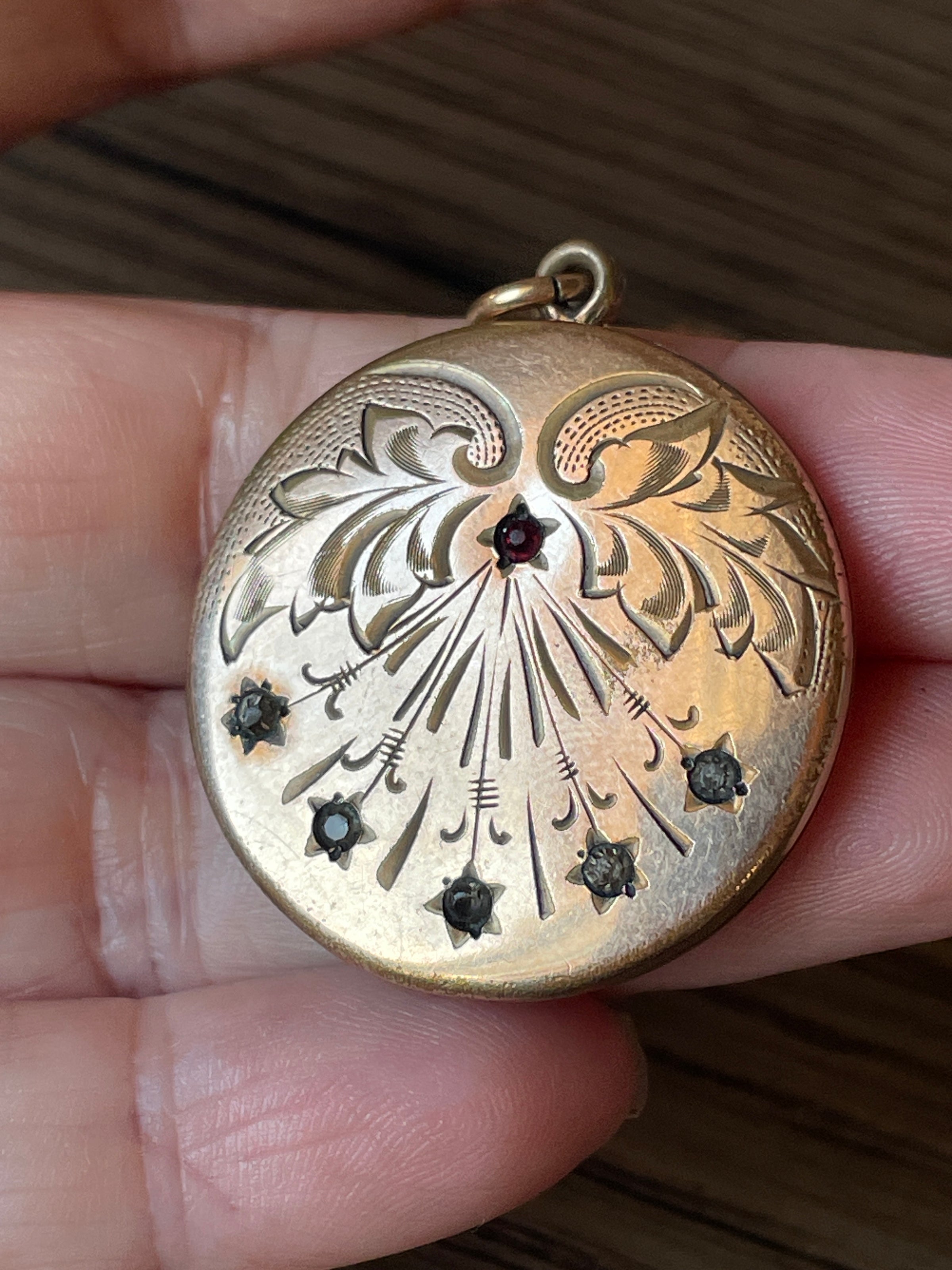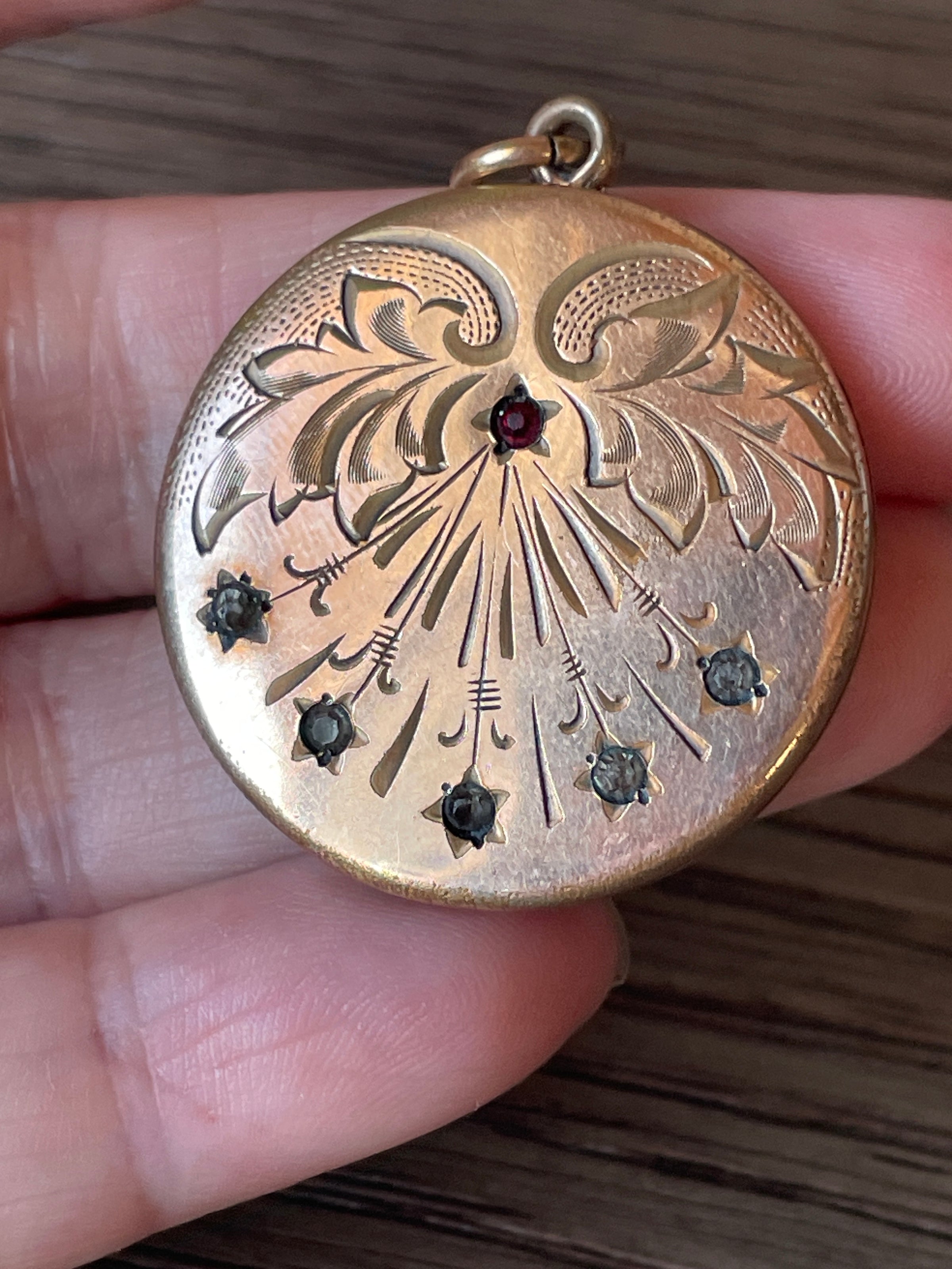 Gorgeous rare antique shooting star locket with red paste star at the top and darkened clear pastes as the bottom stars. Locket measures 1.5 inches with loop x just over 1 inch. Stamped “Bee atrice” with Bee logo. Likely circa early 1900s. No frames present. Engraved “E” on back. Light scratches and pitting on back.