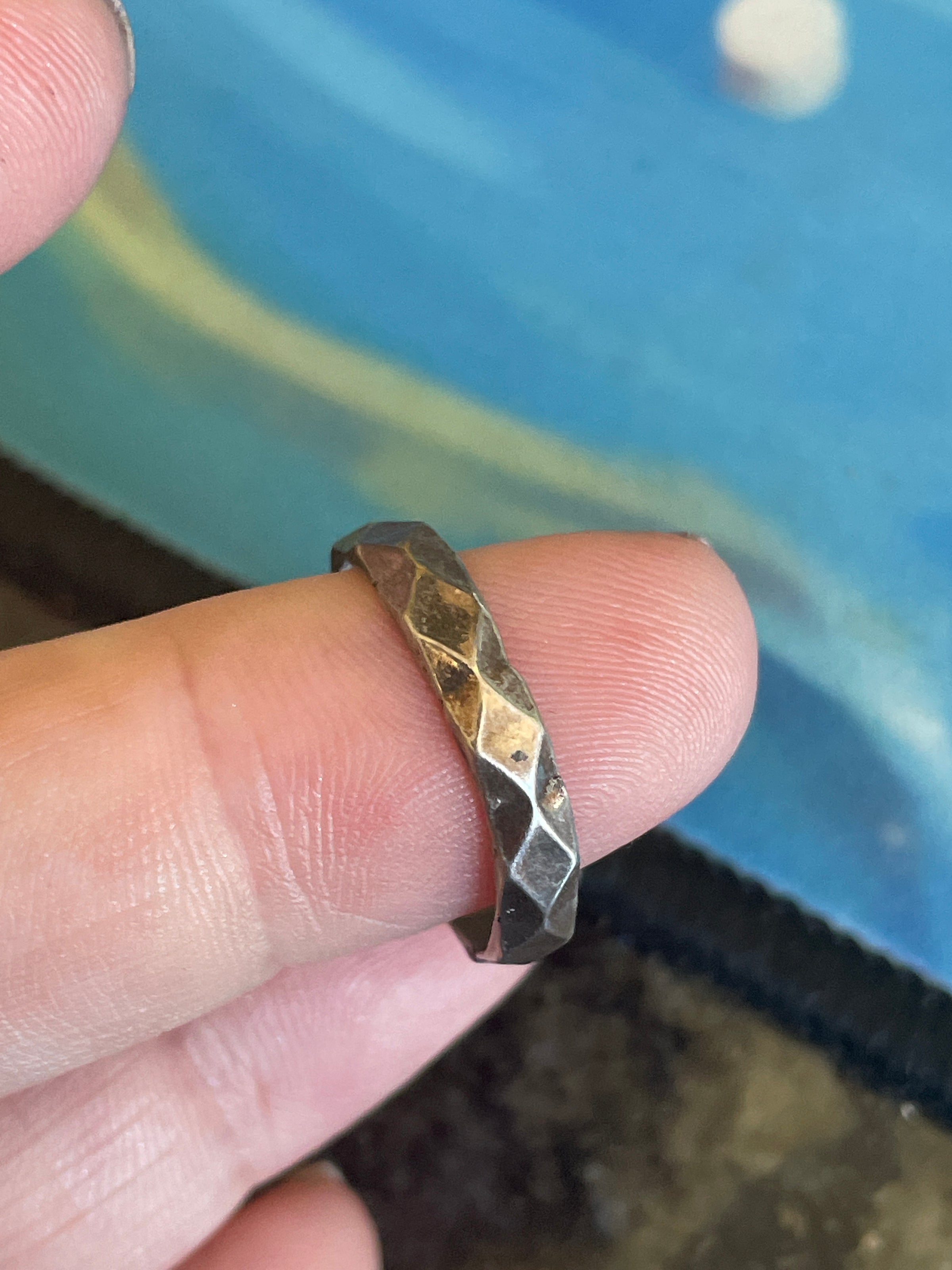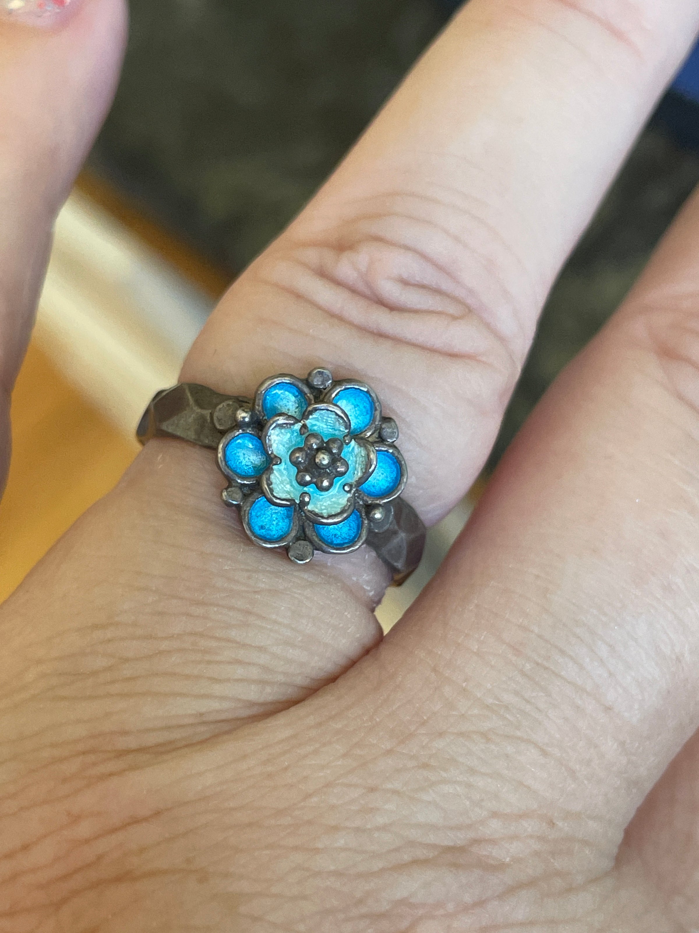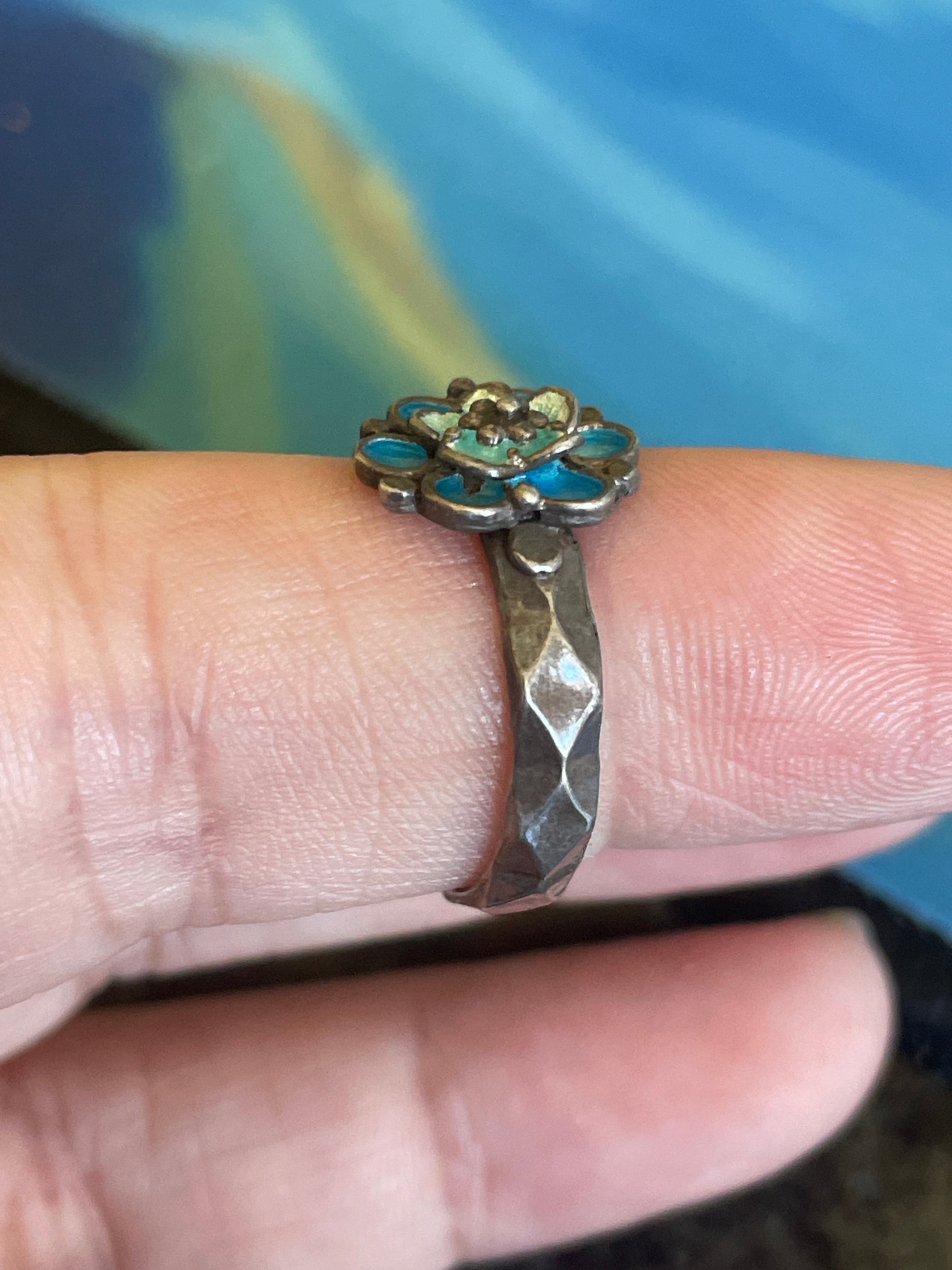 Beautiful handmade Artisan enamel flower ring with ornate band. Flower has two shades of enamel. Ring size = 6.5. Tested sterling.