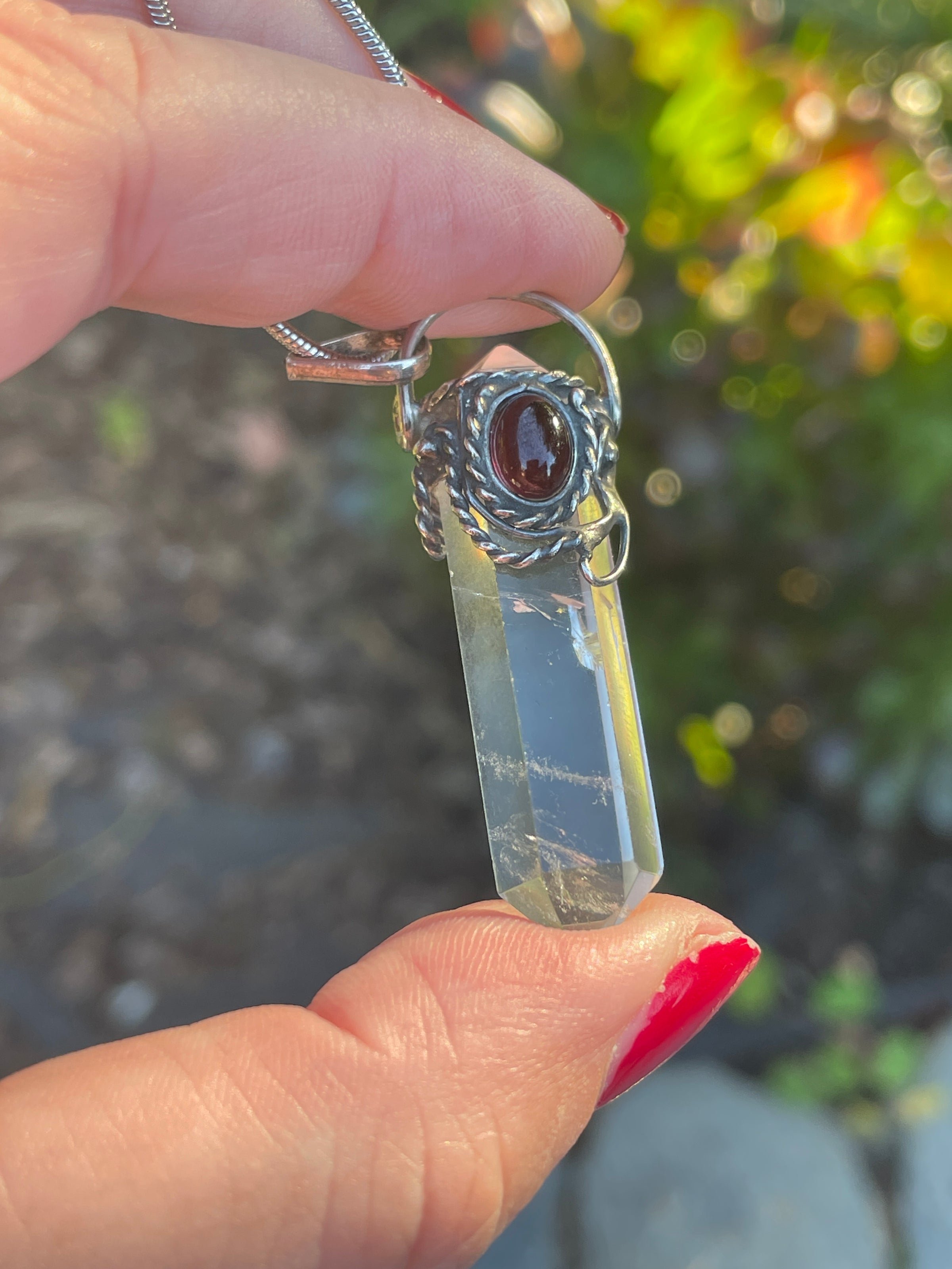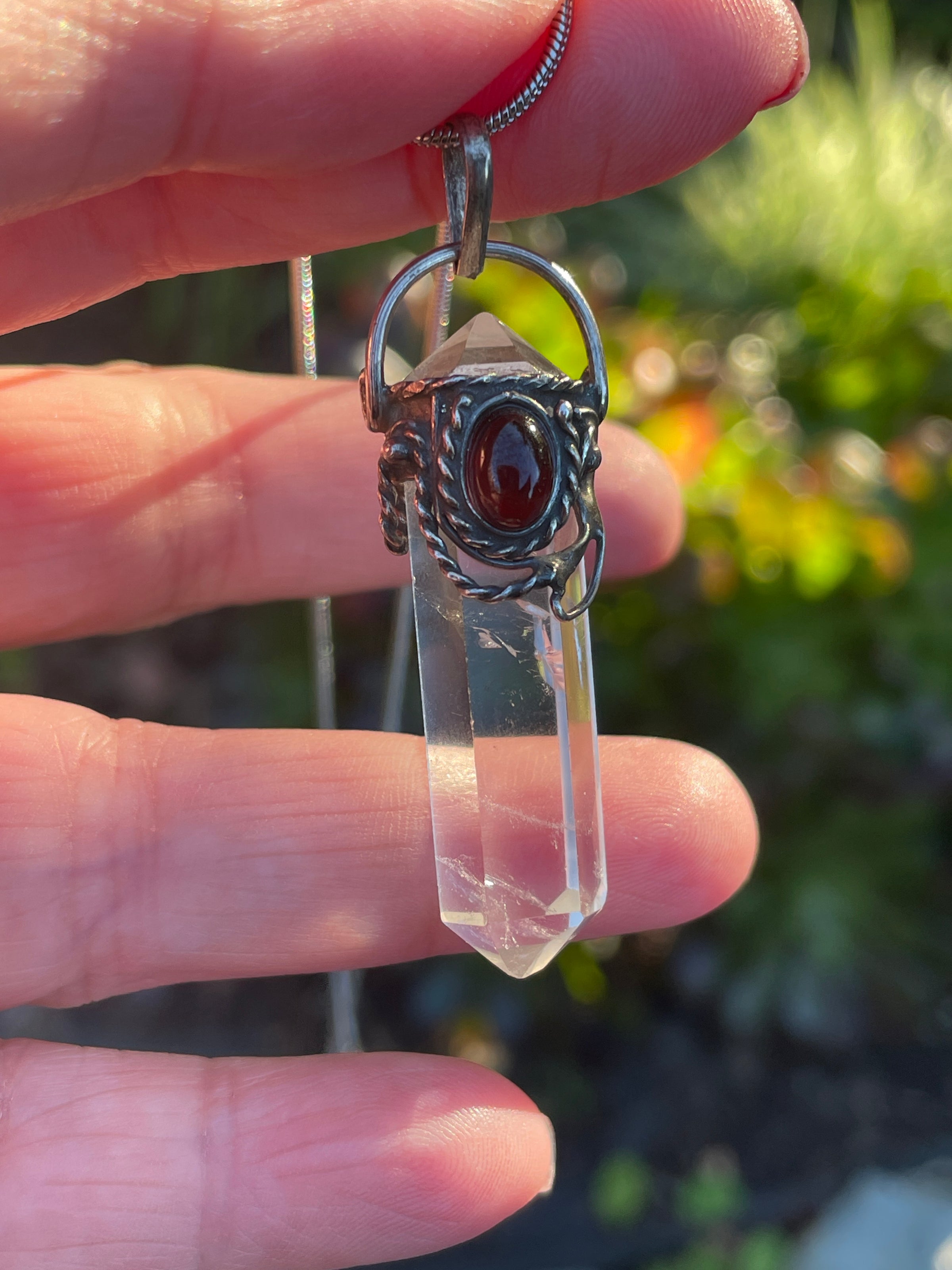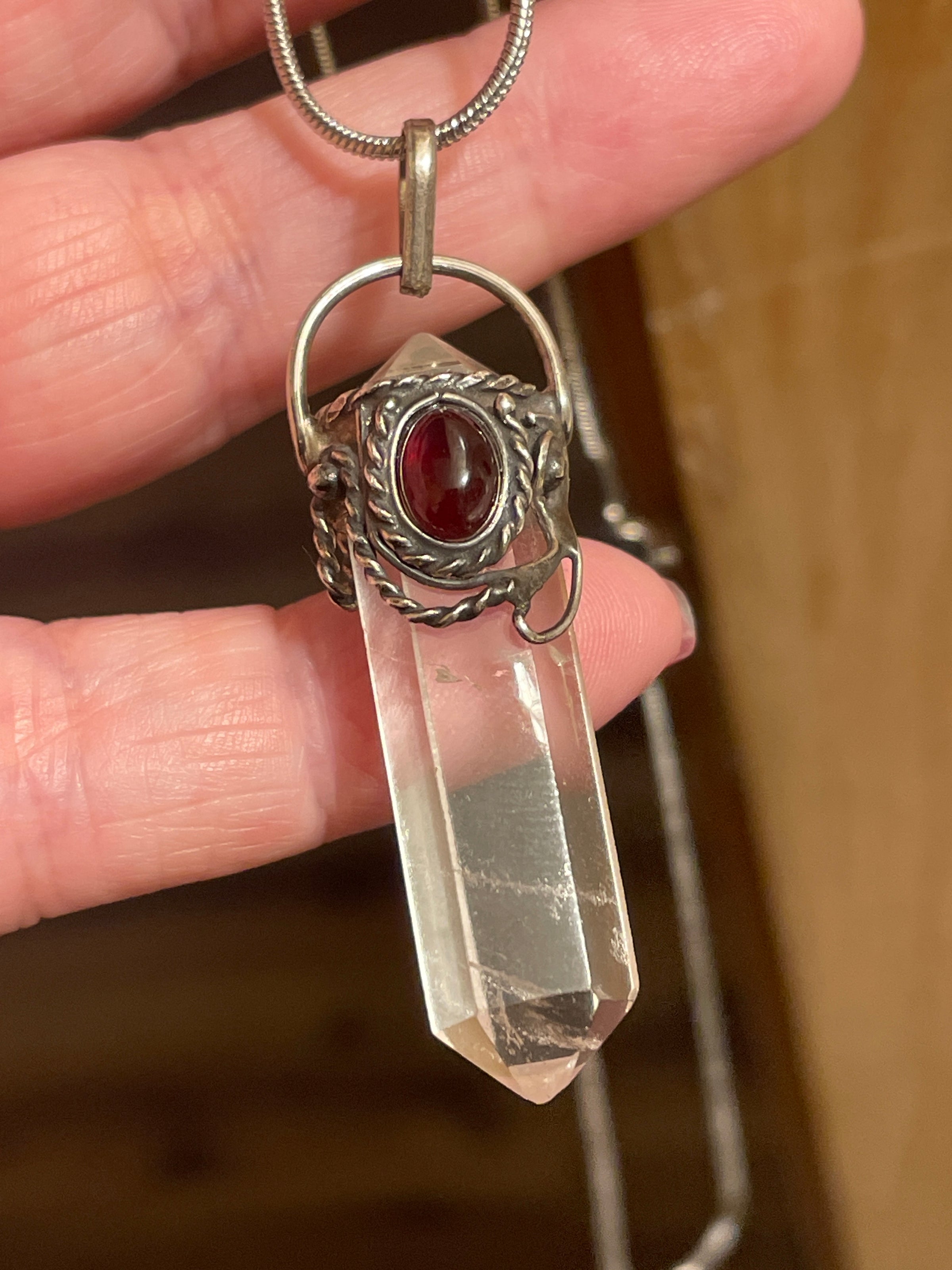Fabulous vintage point Crystal with a Garnet accent in sterling silver. Point crystal has natural inclusions. Pendant measures just under 2 inches with top loop. Comes on a sterling 17 inch snake chain.