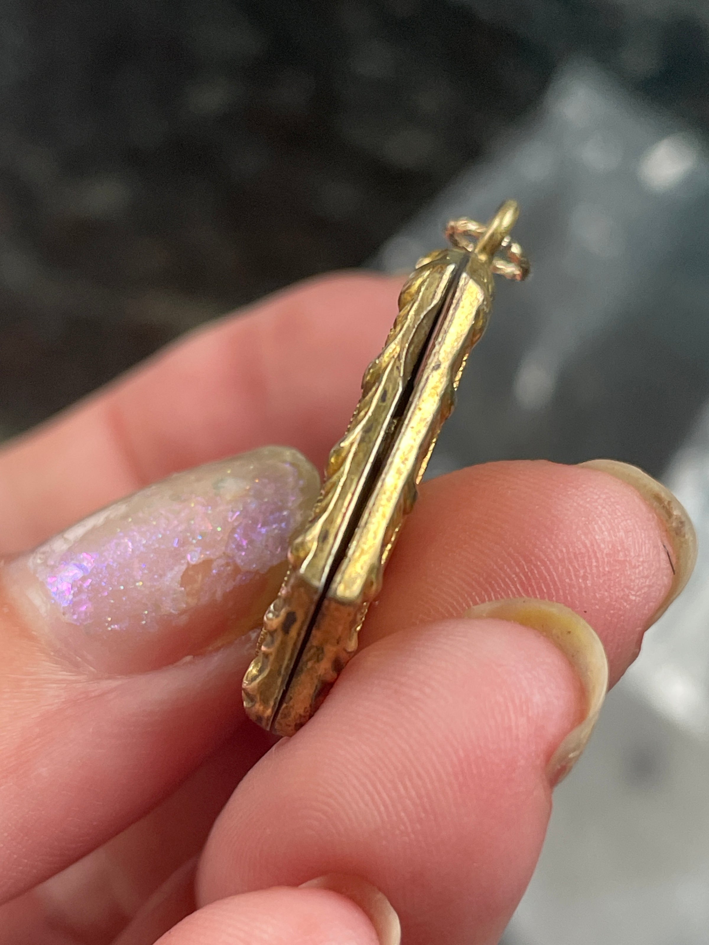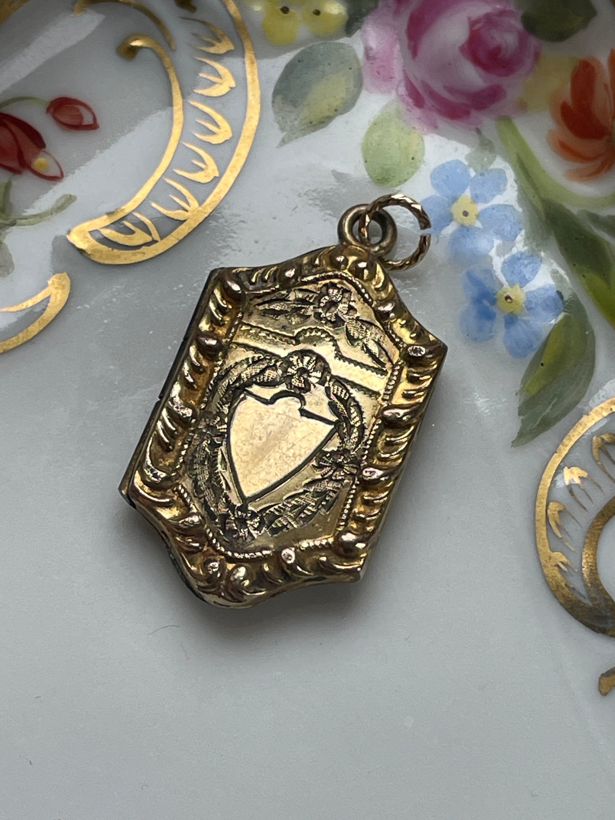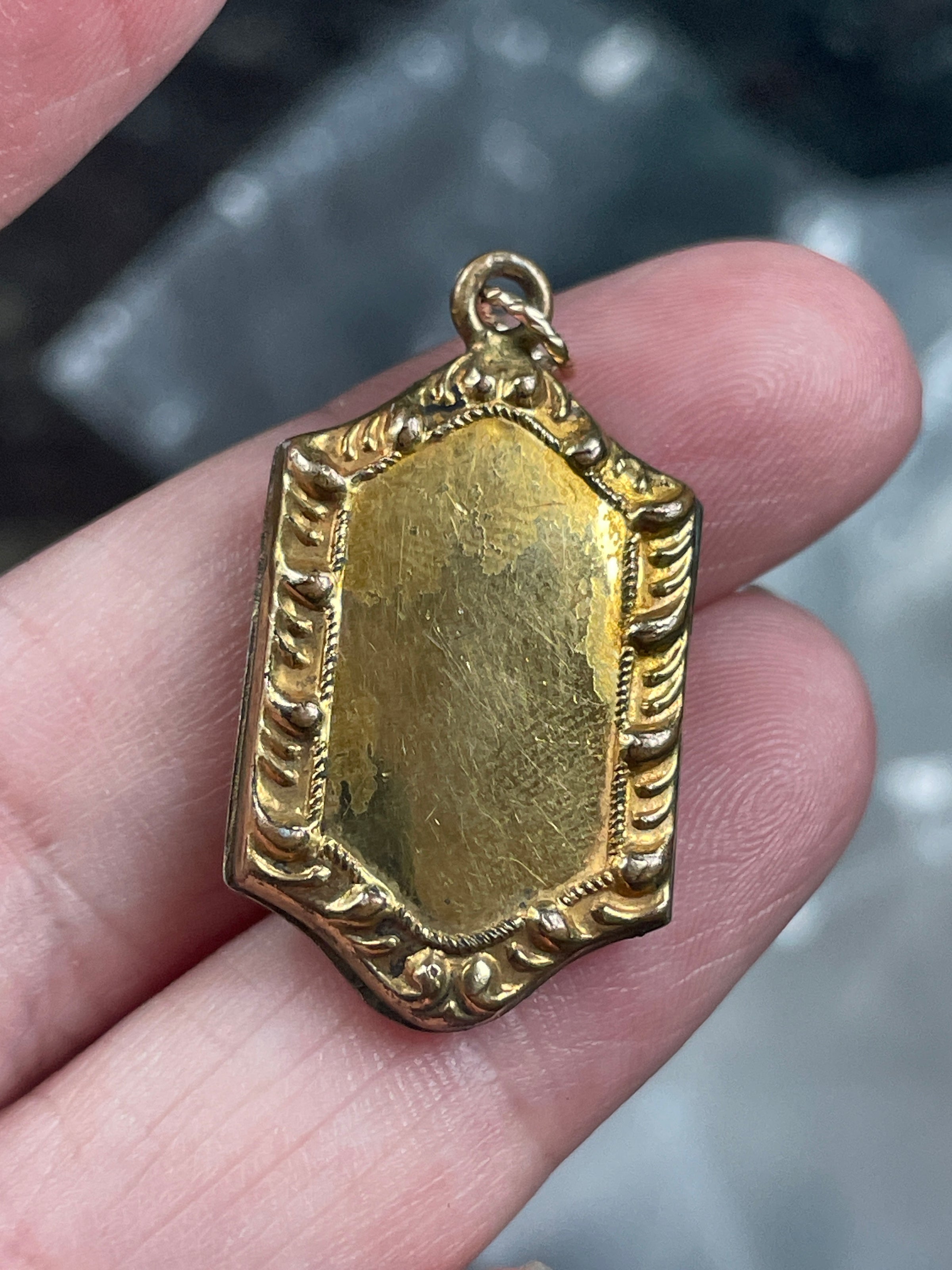 Gorgeous super detailed Shield cartouche locket with blank center cartouche that could be engraved by a jeweler. Has lovely details including two small flowers. Measures just over 1 inch with top loop x 0.75 inches. Top loop not soldiered closed. Two frames and acetate present. Closes because hinge is stiff but does not snap and has a bit of a gap when closed see photos.