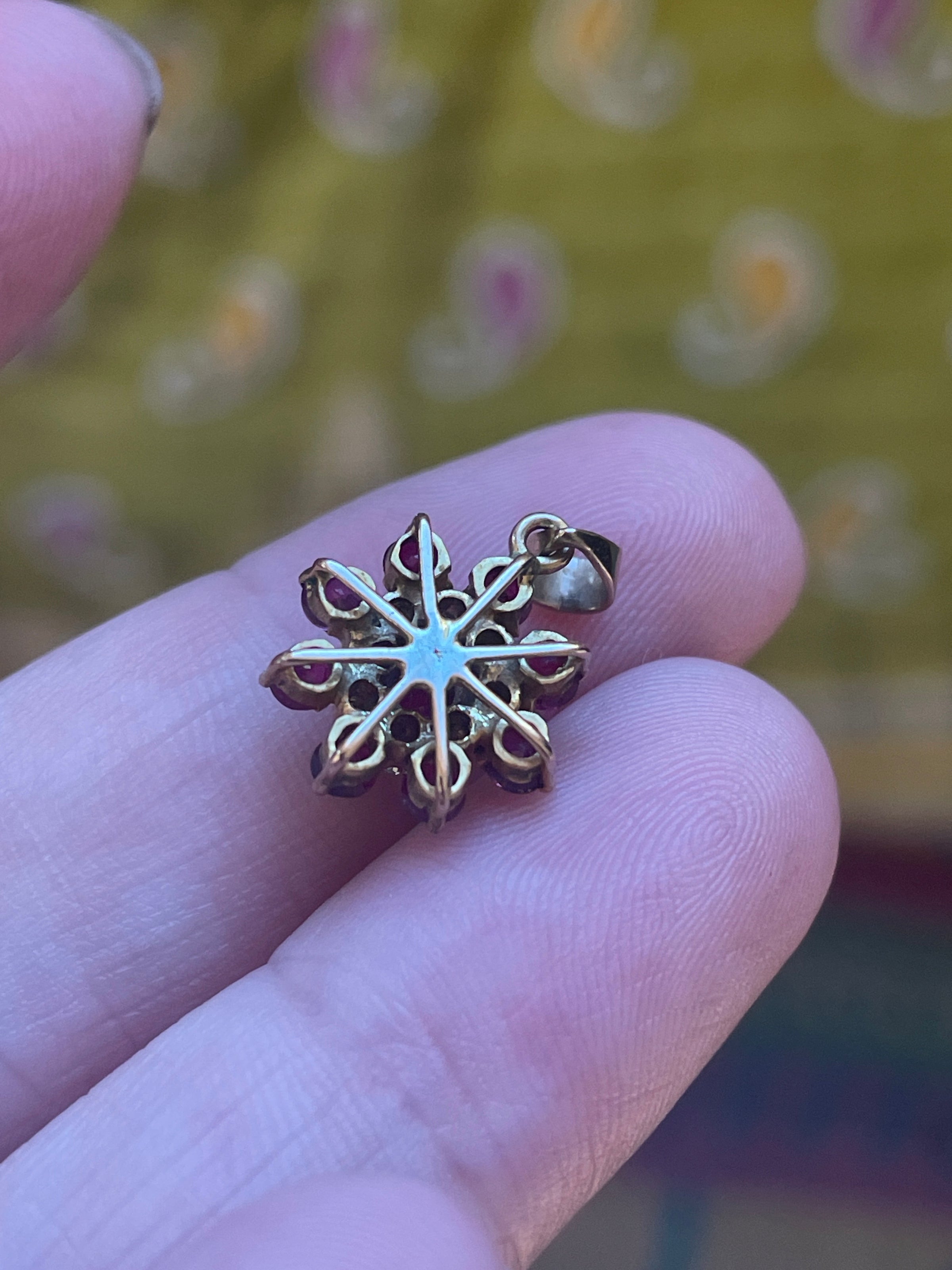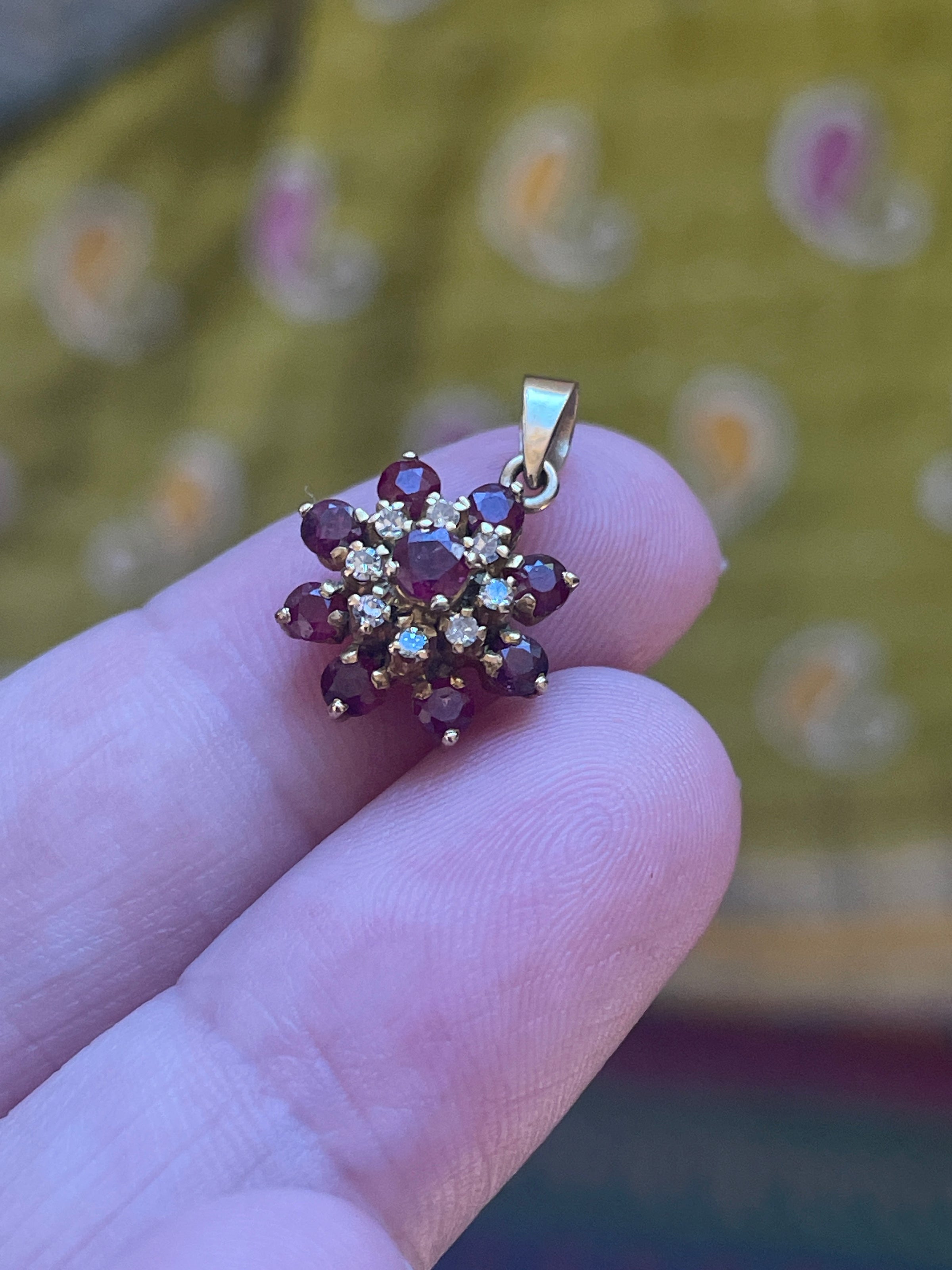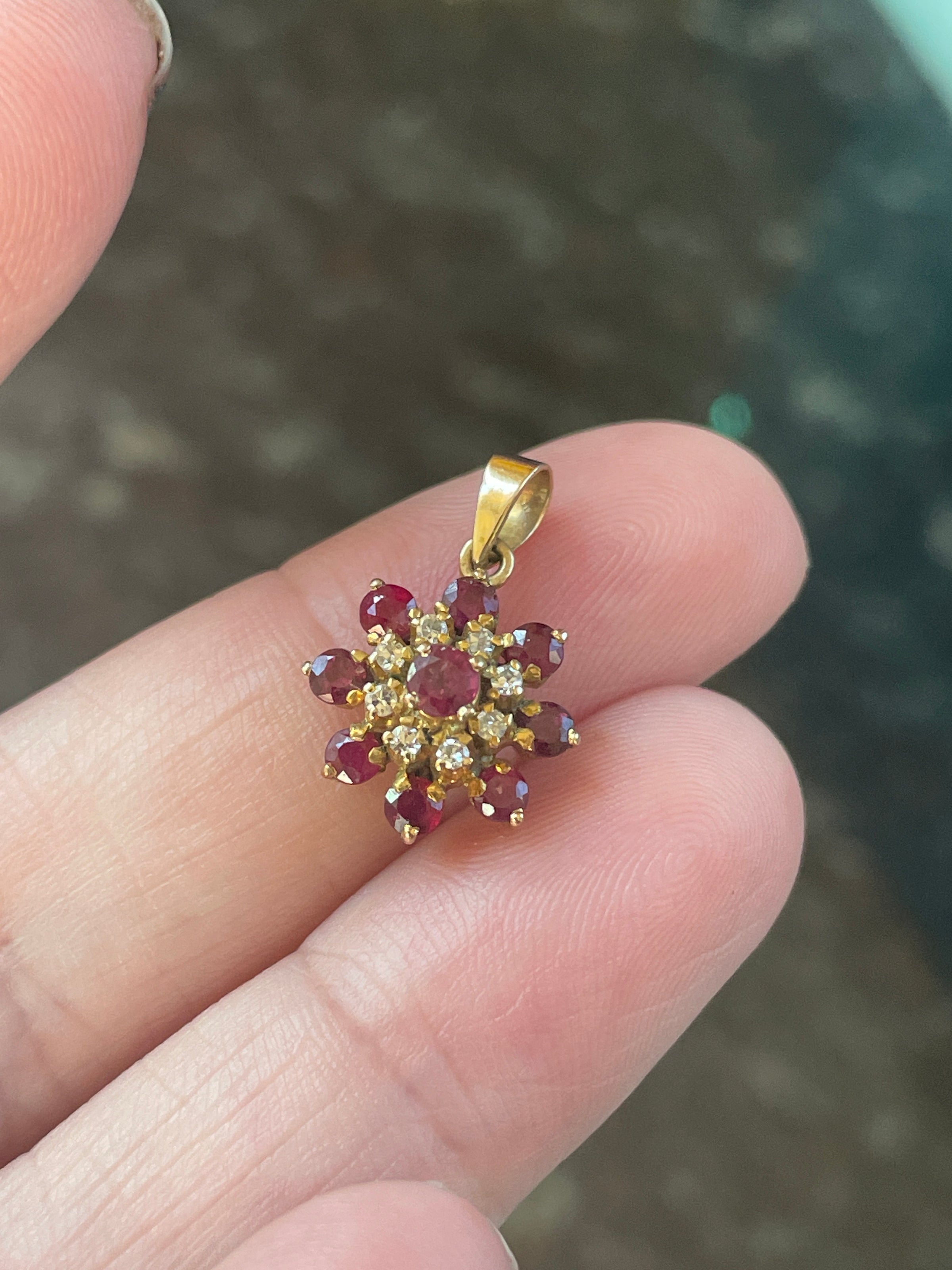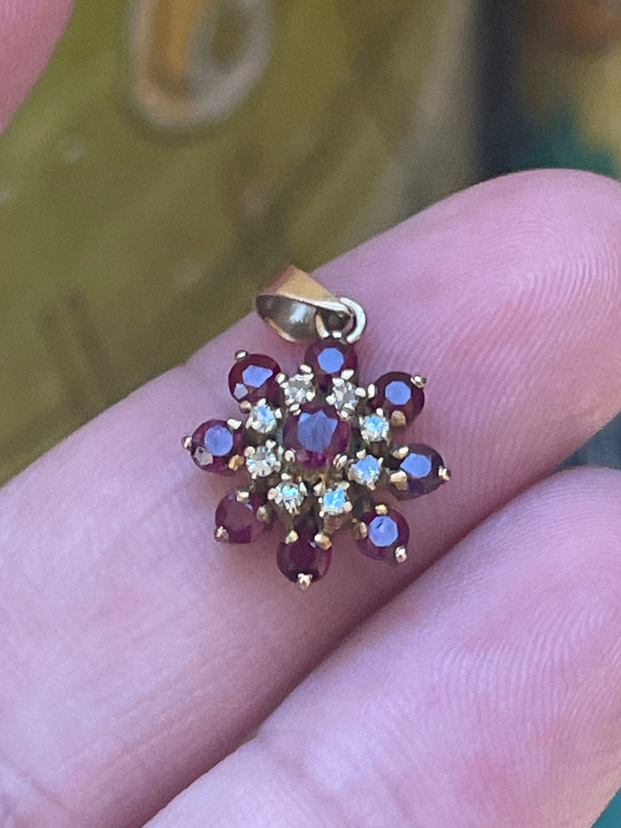 Gorgeous Ruby Diamond Flower pendant in 14k gold. Pendant measures just under 0.75 inches with bail x 0.5 inches. No markings but tested 14k.