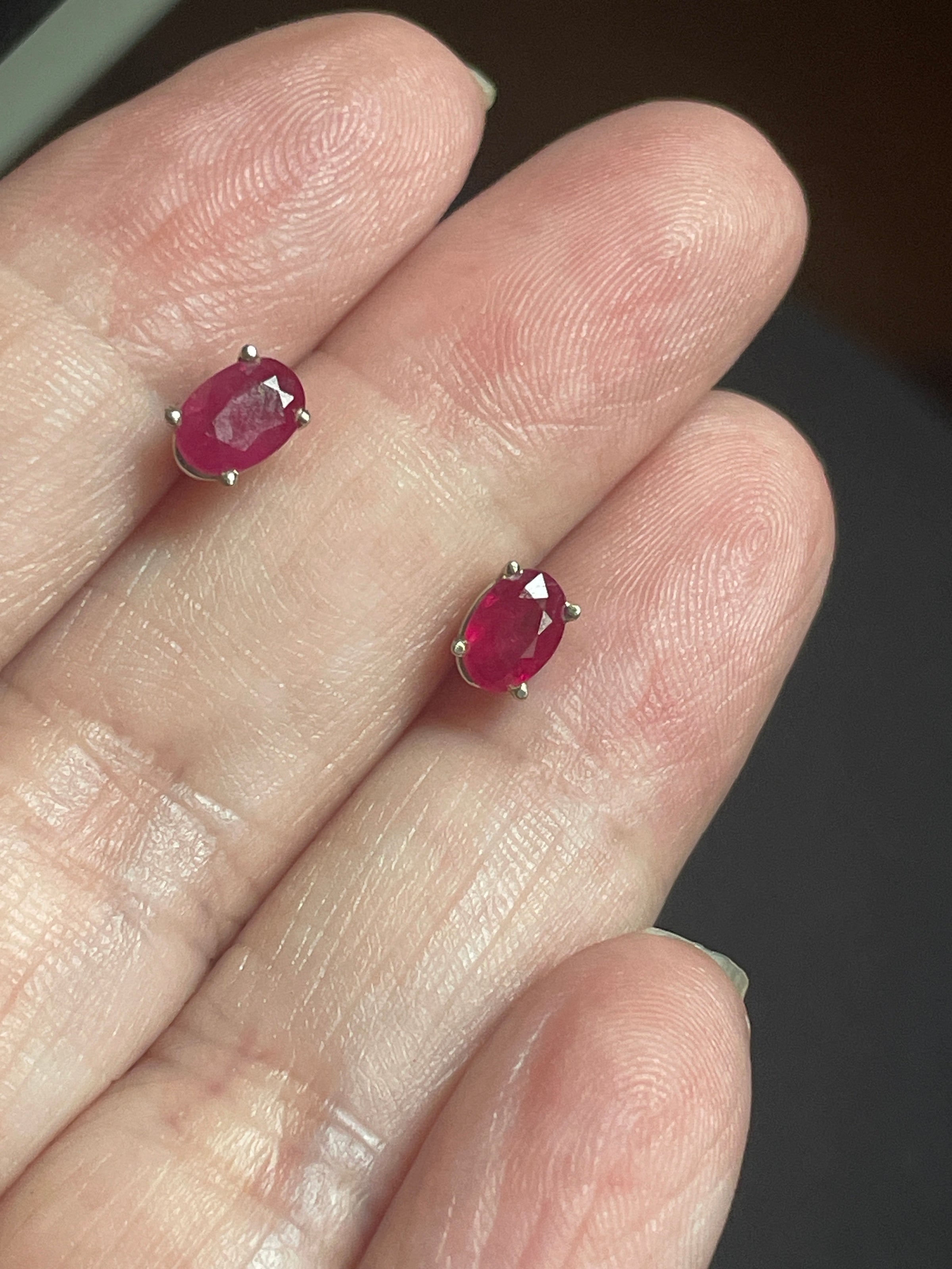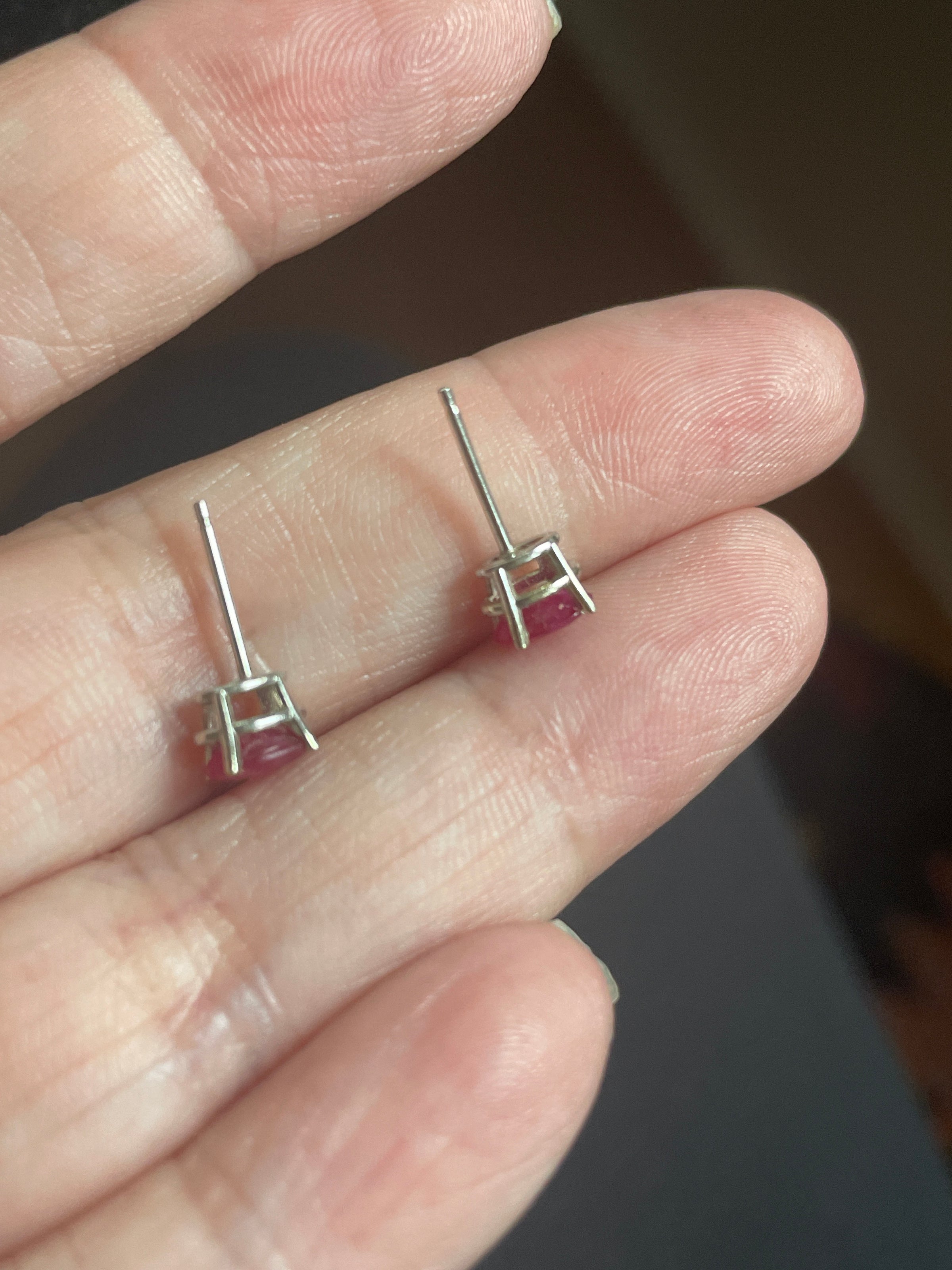 Gorgeous Ruby earrings set in 14k white gold. Stones are 5mm x 3mm. Stamped 14k on posts and backs. Beautiful stones in dramatic shade of pink/red.