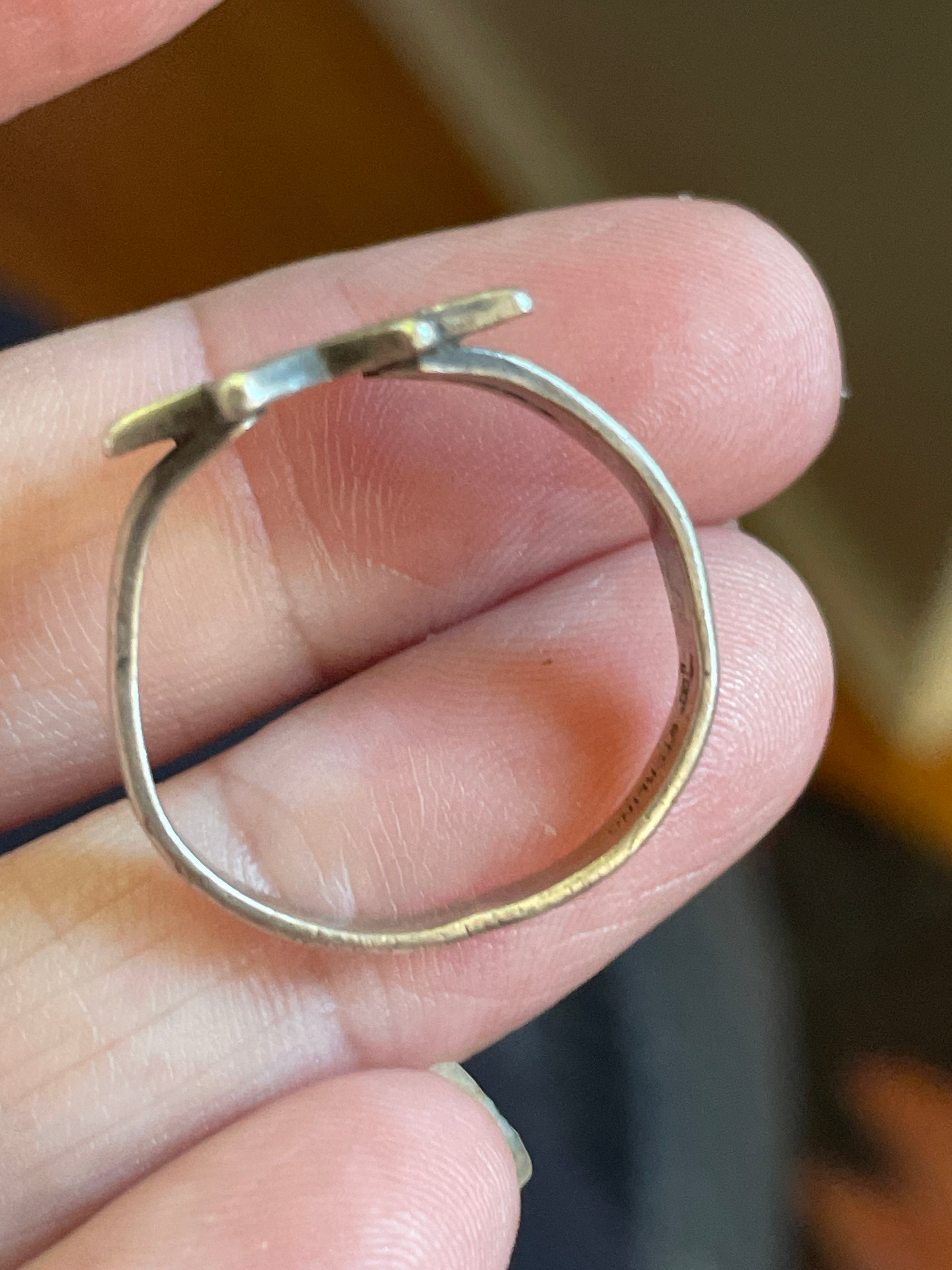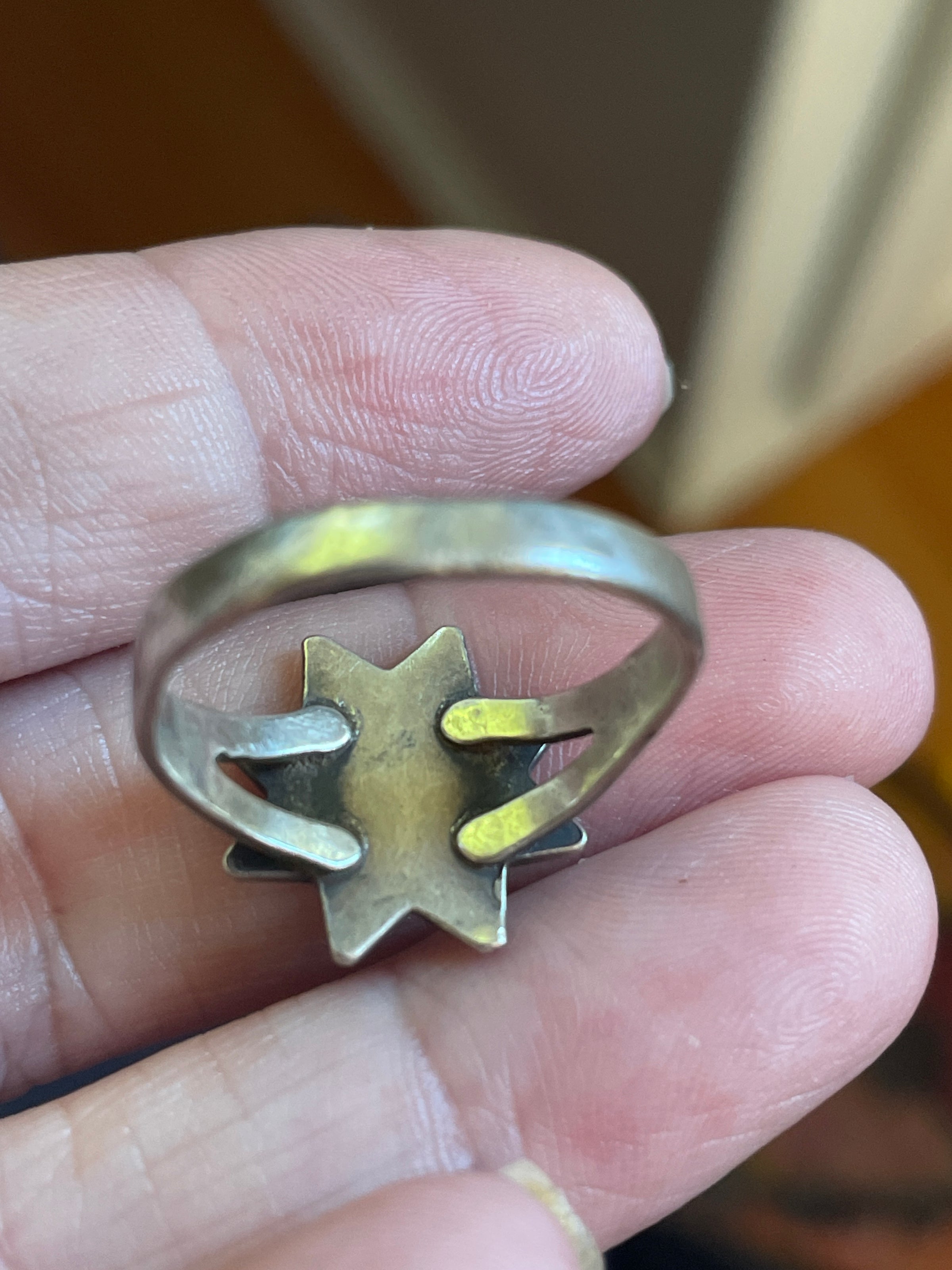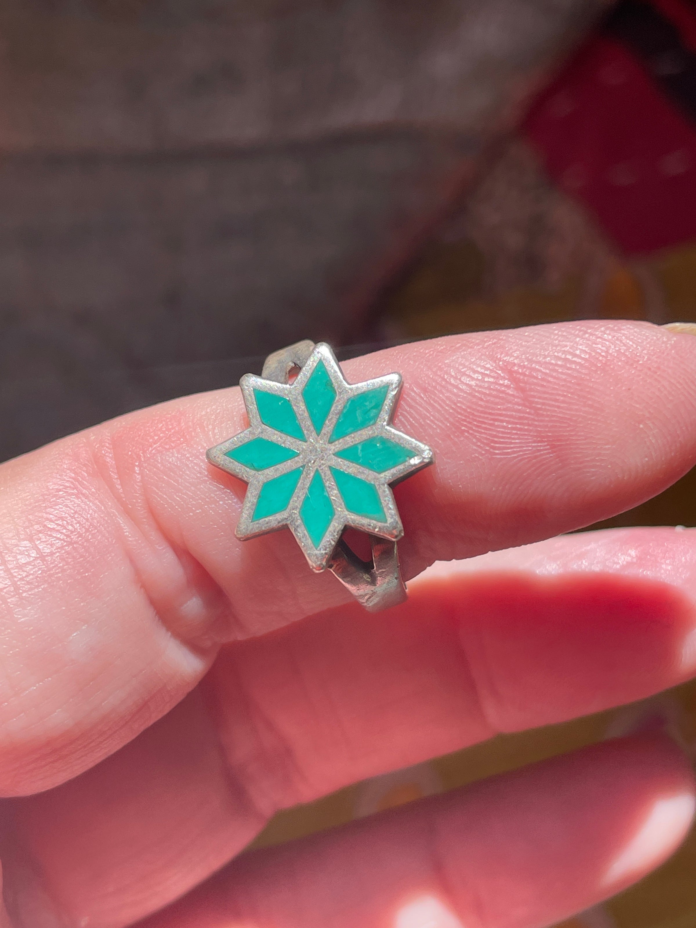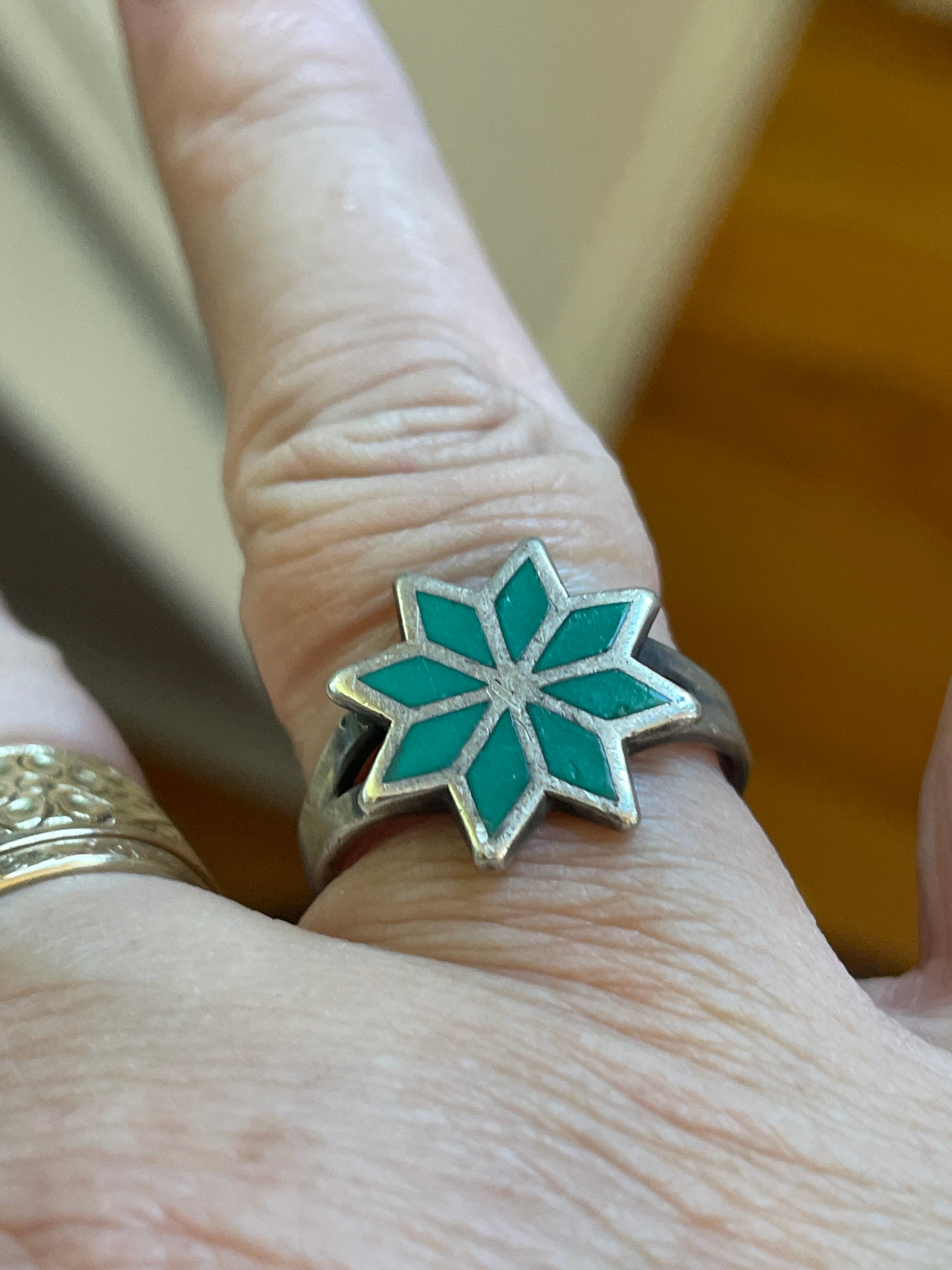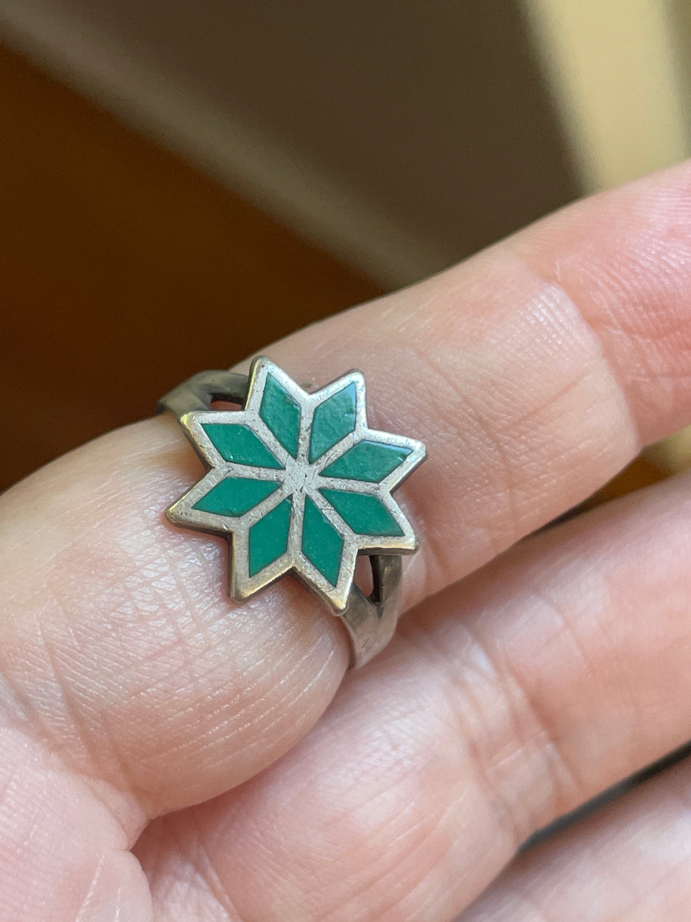 Fabulous vintage Turquoise inlay star ring in sterling silver. Ring is slightly out of round but is approx = 8. Unmarked but tested sterling. An unusual but beautiful ring.
