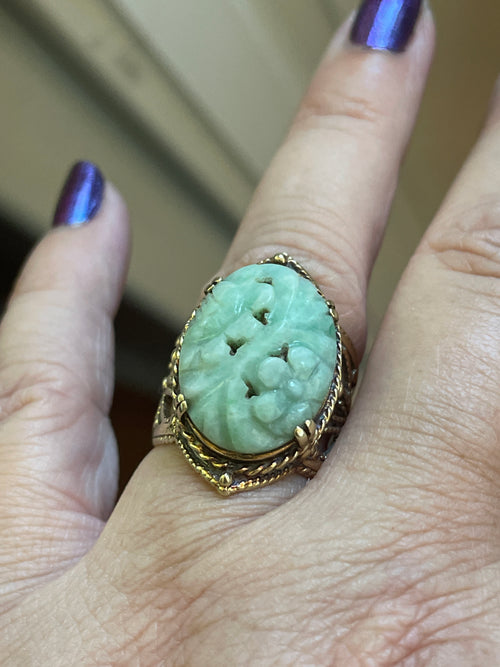 Carved Jade Filigree Ring - 14k Gold - Vintage