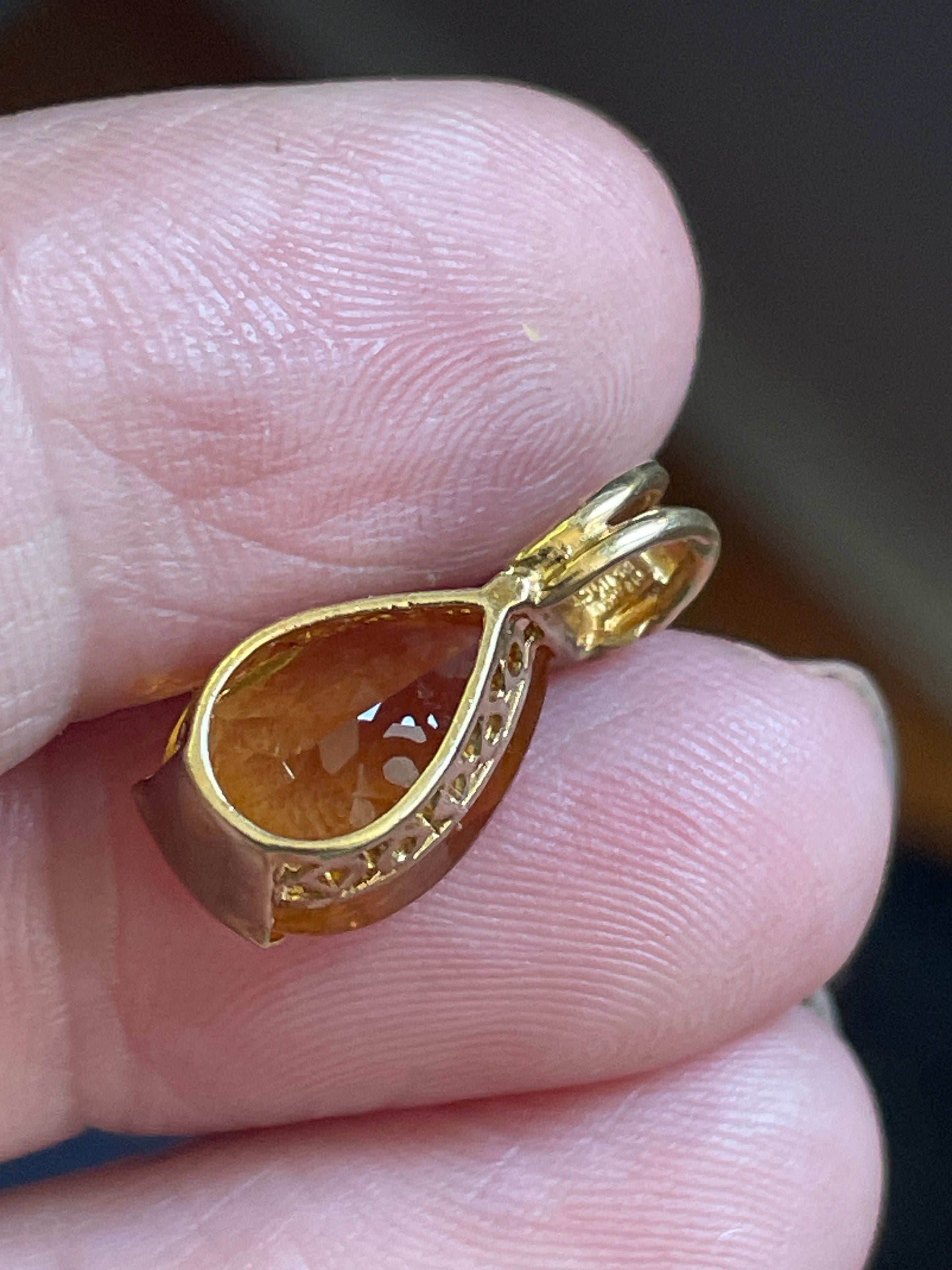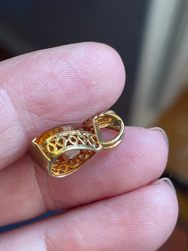 Gorgeous teardrop Citrine pendant in 14k gold with ornate bail. Measures 17mm with stationary bail.  Tested 14k.